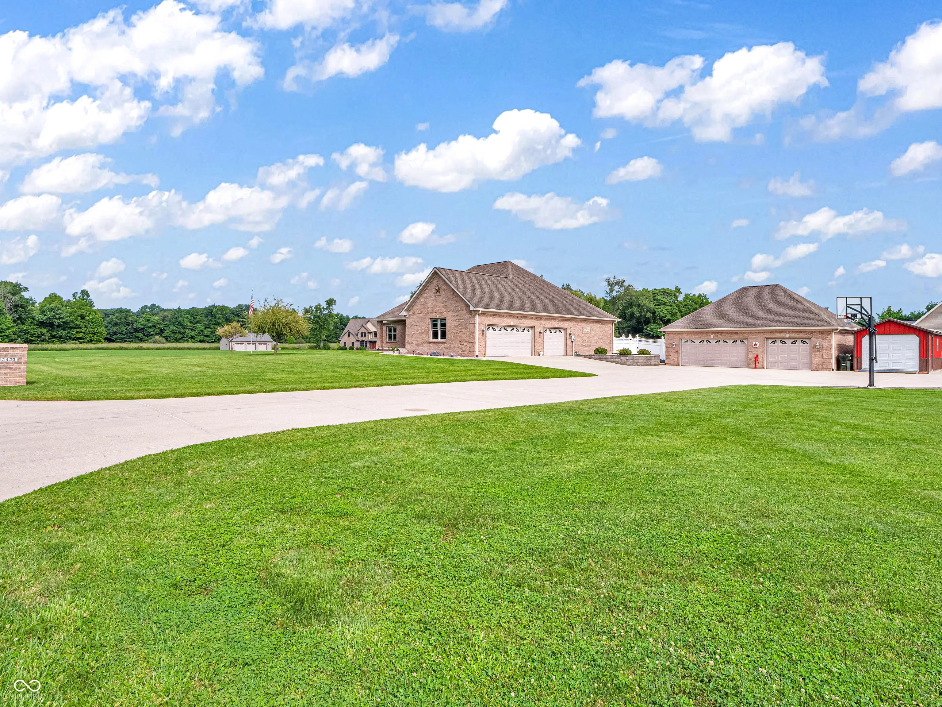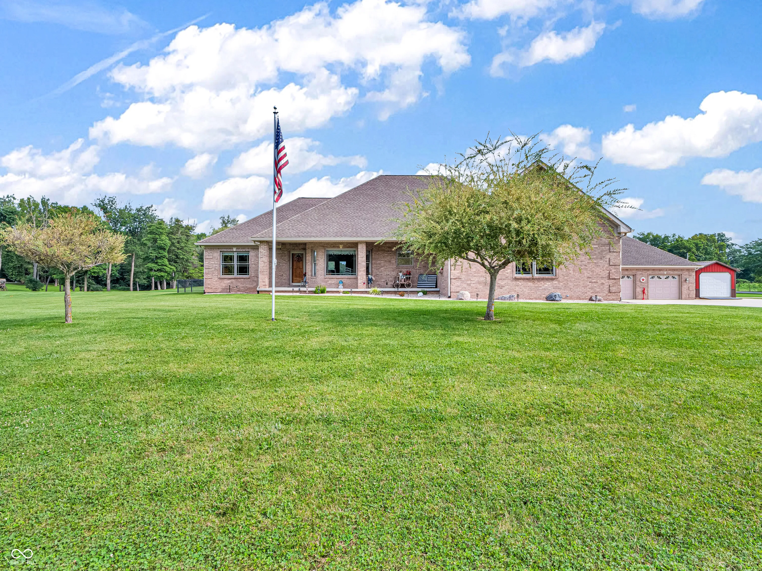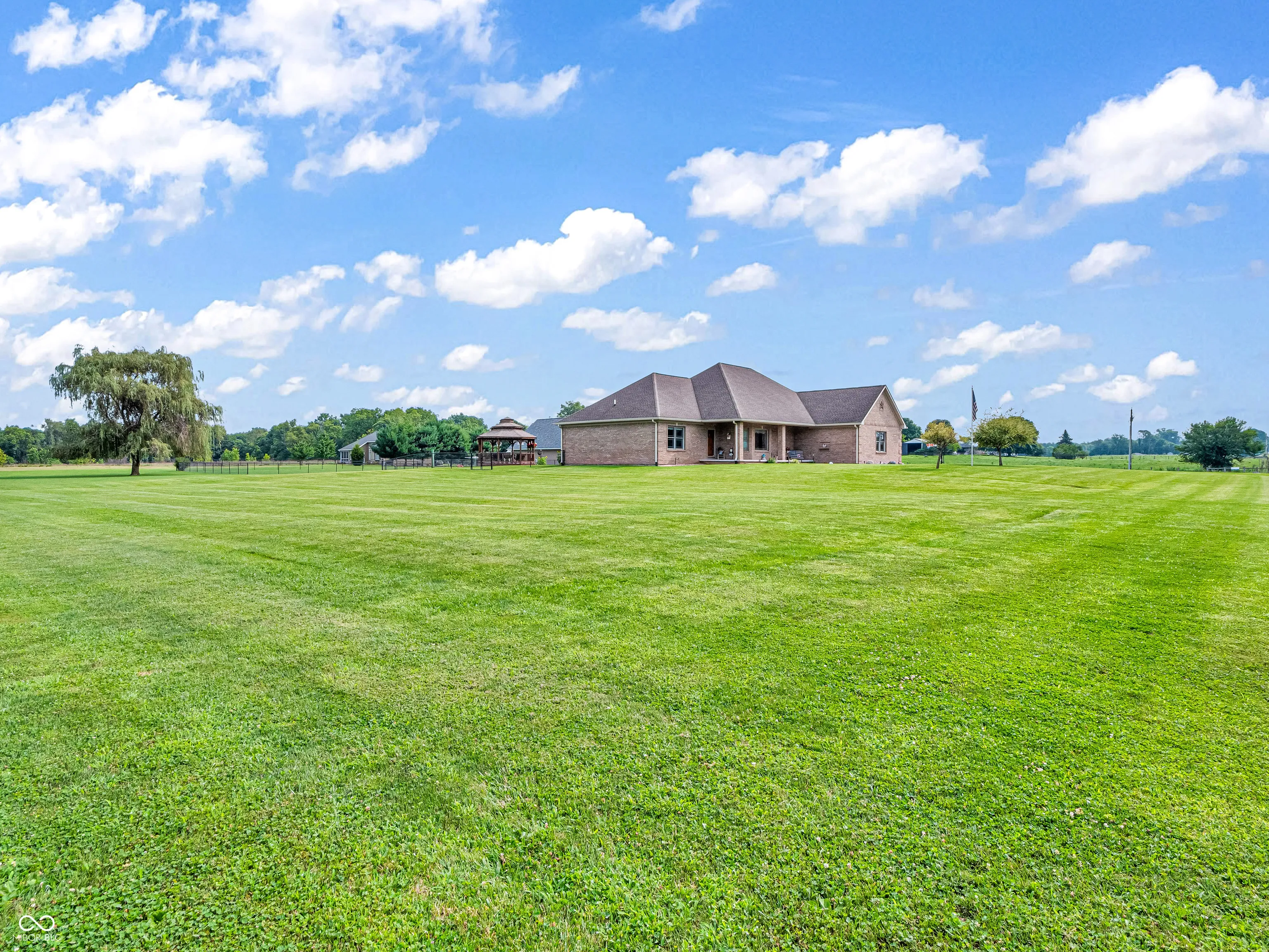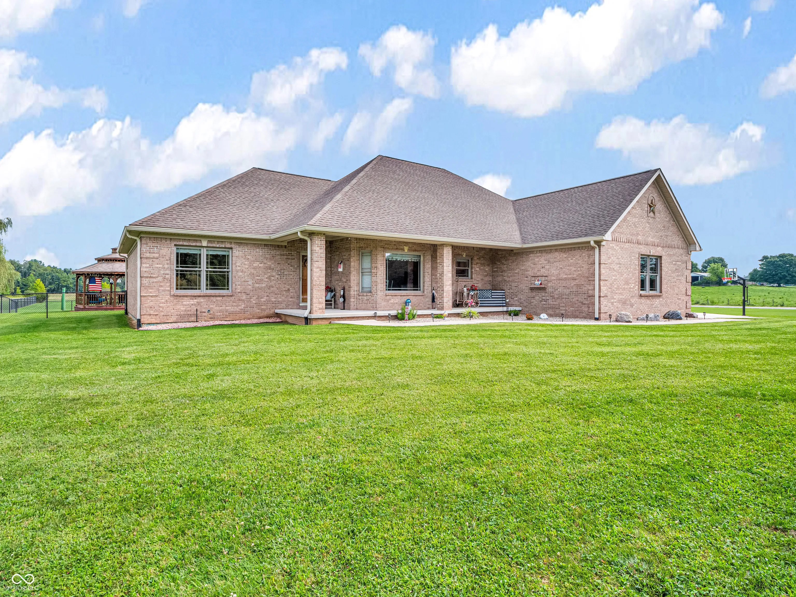 Amazing custom-built home on 2 acres that doesn’t come along often. This brick ranch with a full basement, 3-car attached garage and 3-car detached garage is a short walk to the DePauw Nature Park and surrounded by other high-end custom homes. The first floor features open-concept living with tall ceilings, 3 bedrooms, 2 1/2 baths, a dedicated office, walk-in pantry, laundry room, dining room with bay window, and white kitchen with custom cabinetry and upgrades. The primary suite has tray ceilings, a large walk-in closet and full bathroom with double sinks, jetted tub and shower stall. The kitchen includes all appliances, double oven, center island with bar seating, double sinks, range hood, and so much more. The full basement features three large rooms for gaming, movies and gatherings; as well as a large storage room with built-in shelving. A large finished attic above the garage gives you even more storage. Enjoy the fenced backyard with large gazebo and fire pit from the covered back patio. The brick 3-car detached garage is a dream for anyone wanting a workshop, studio or hobby space. The full concrete driveway includes a basketball court. High-speed internet available. This meticulously-maintained home is conveniently located close to town on paved roads, but has the quiet and nature of the countryside.