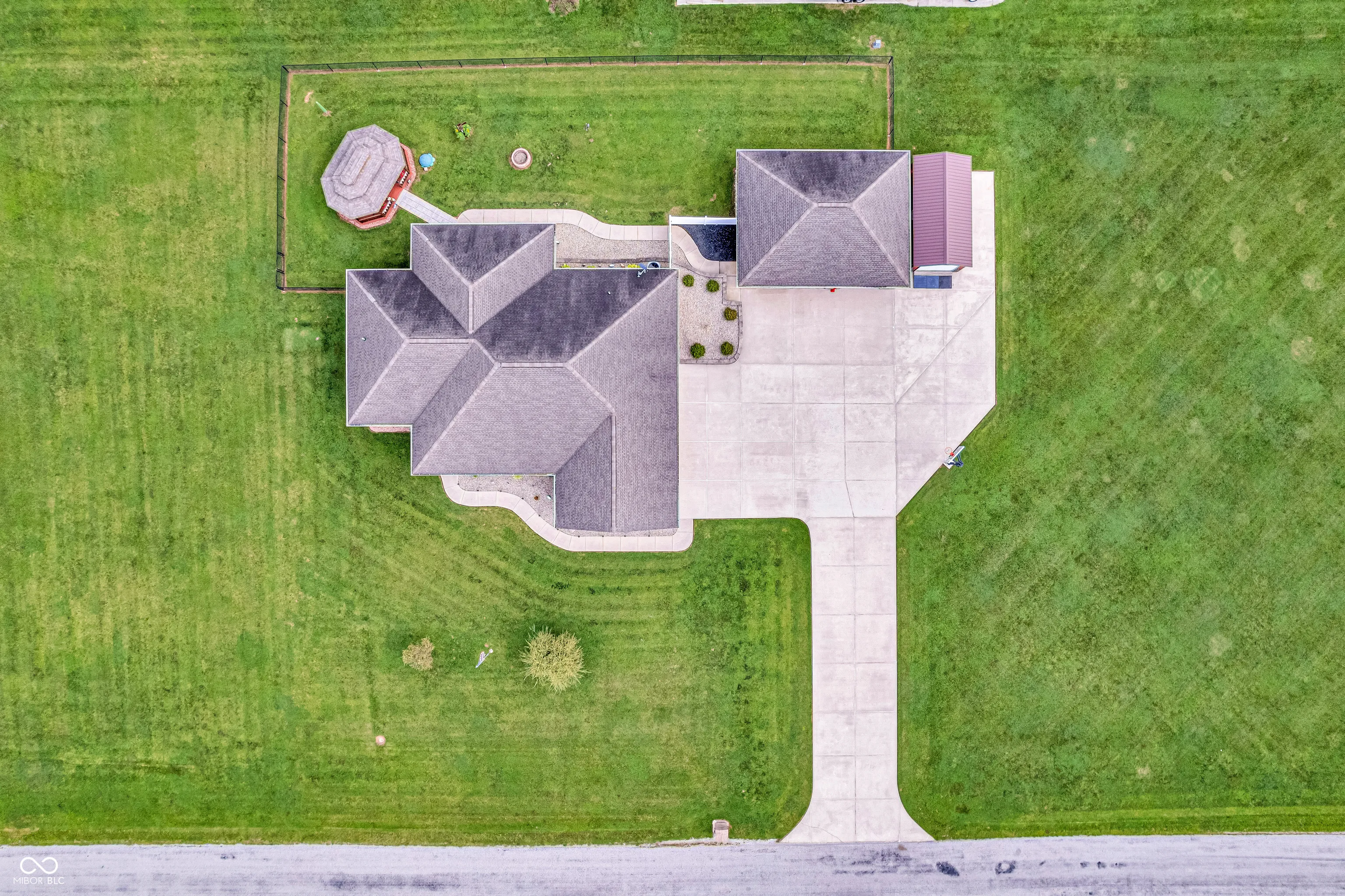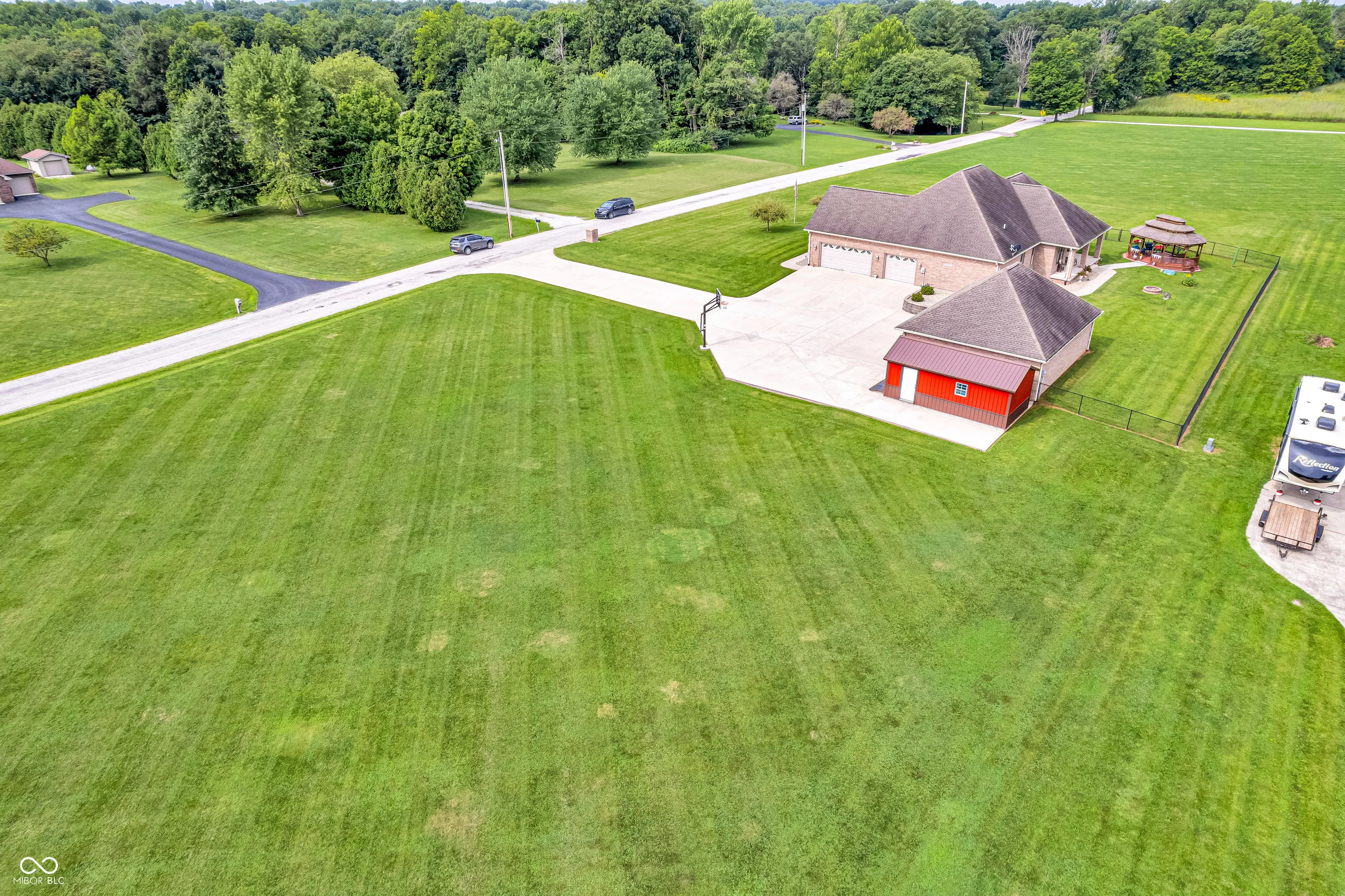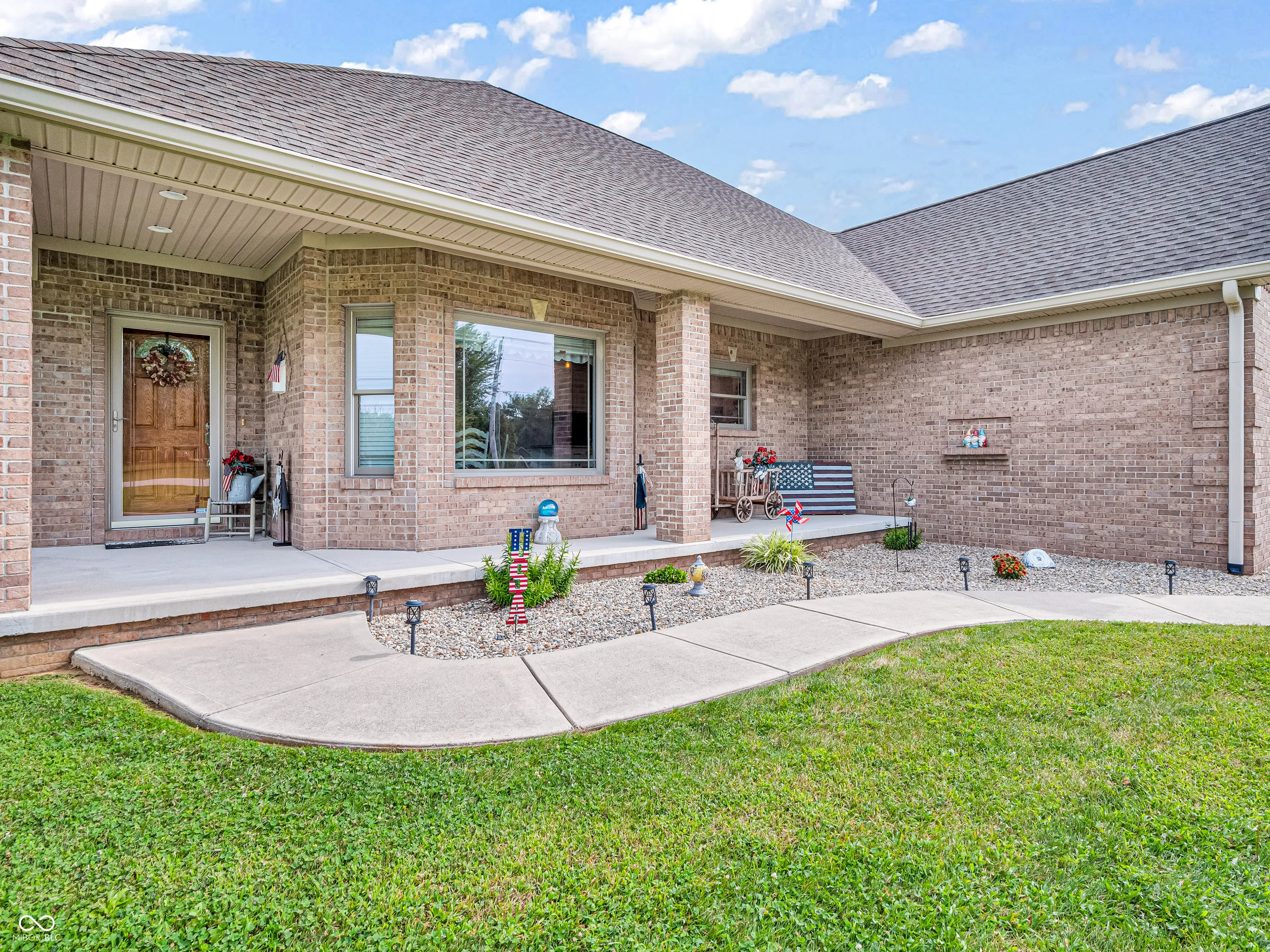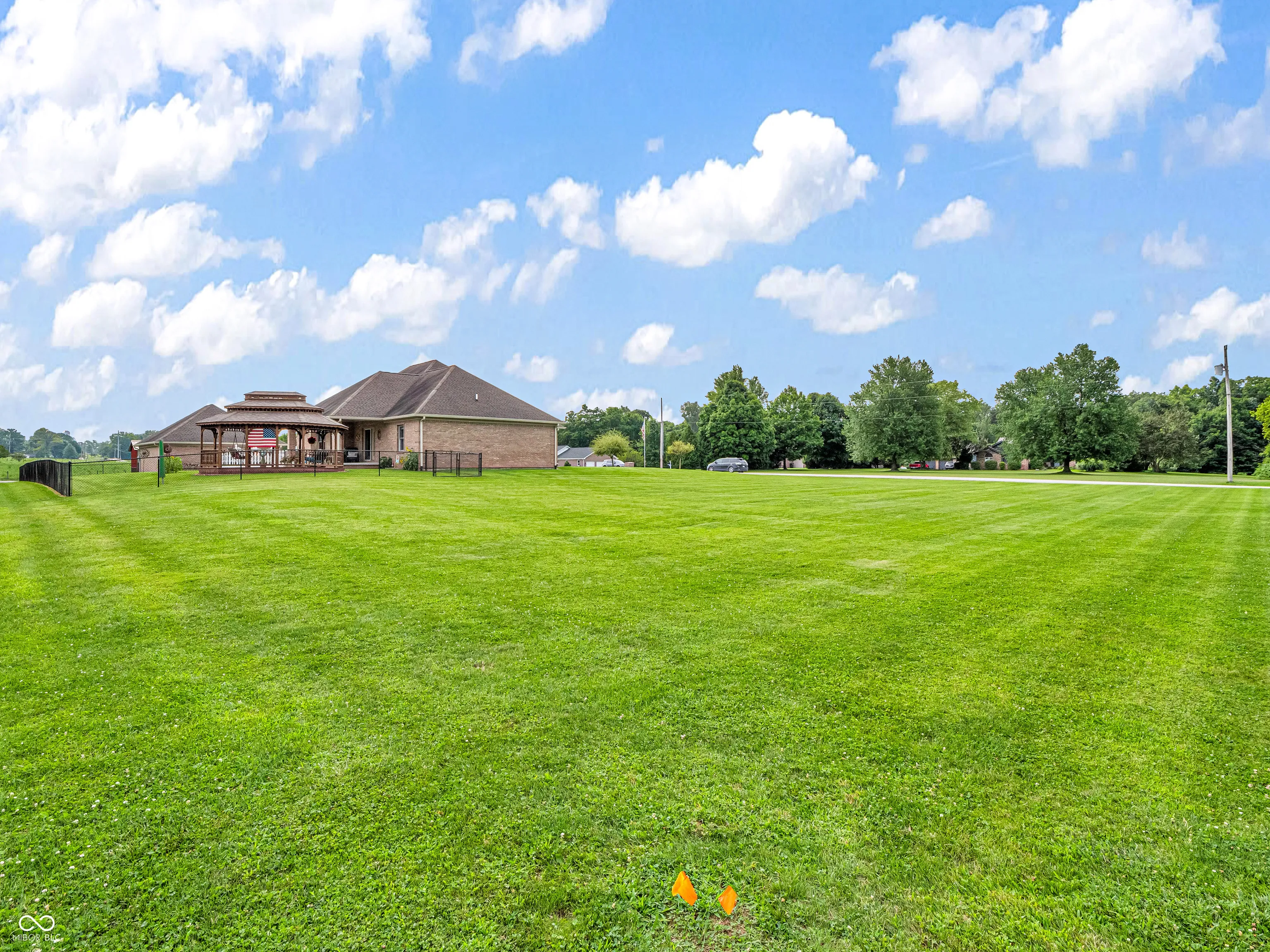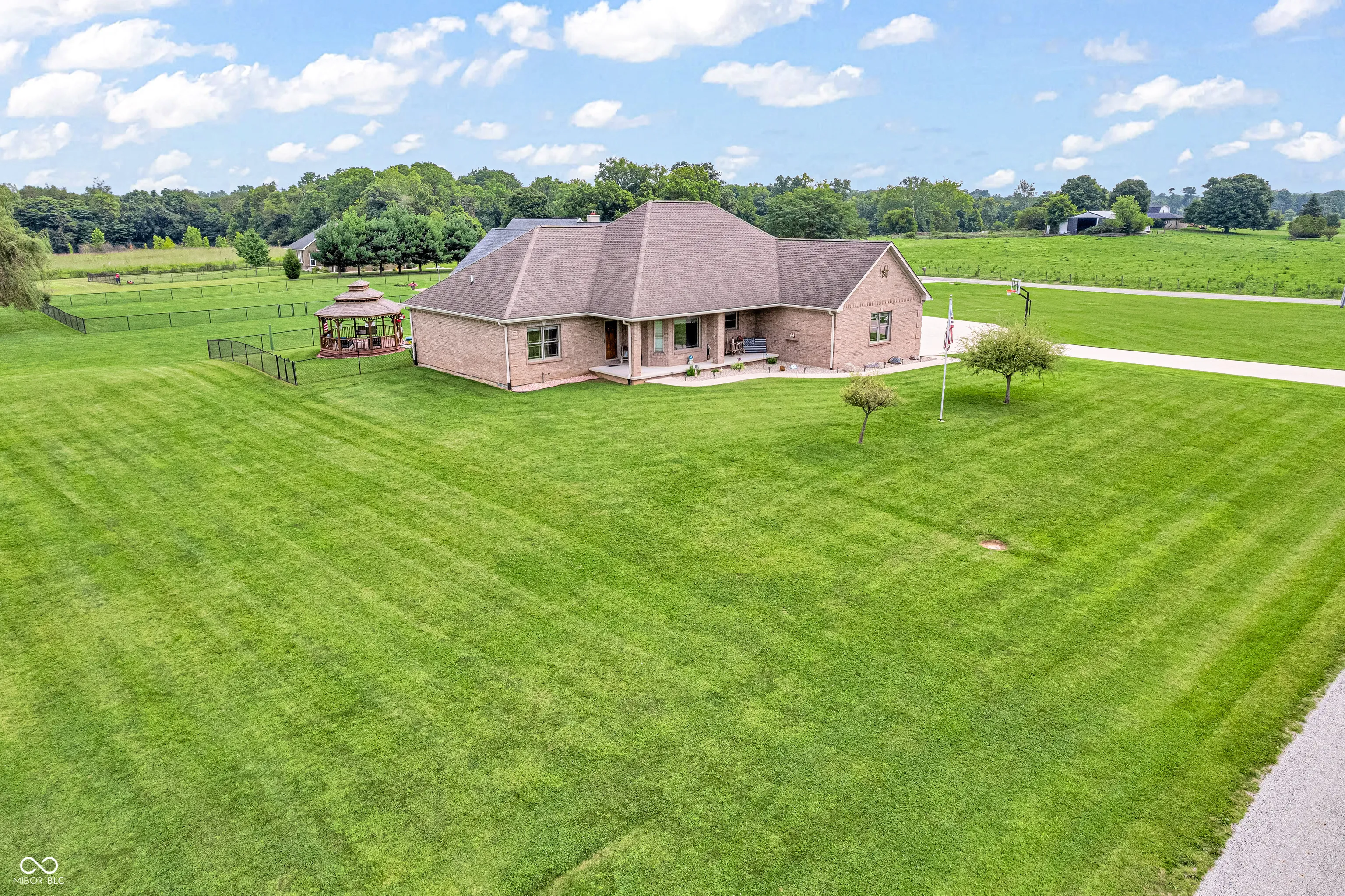 Amazing custom-built home on 2 acres that doesn’t come along often. This brick ranch with a full basement, 3-car attached garage and 3-car detached garage is a short walk to the DePauw Nature Park and surrounded by other high-end custom homes. The first floor features open-concept living with tall ceilings, 3 bedrooms, 2 1/2 baths, a dedicated office, walk-in pantry, laundry room, dining room with bay window, and white kitchen with custom cabinetry and upgrades. The primary suite has tray ceilings, a large walk-in closet and full bathroom with double sinks, jetted tub and shower stall. The kitchen includes all appliances, double oven, center island with bar seating, double sinks, range hood, and so much more. The full basement features three large rooms for gaming, movies and gatherings; as well as a large storage room with built-in shelving. A large finished attic above the garage gives you even more storage. Enjoy the fenced backyard with large gazebo and fire pit from the covered back patio. The brick 3-car detached garage is a dream for anyone wanting a workshop, studio or hobby space. The full concrete driveway includes a basketball court. High-speed internet available. This meticulously-maintained home is conveniently located close to town on paved roads, but has the quiet and nature of the countryside.