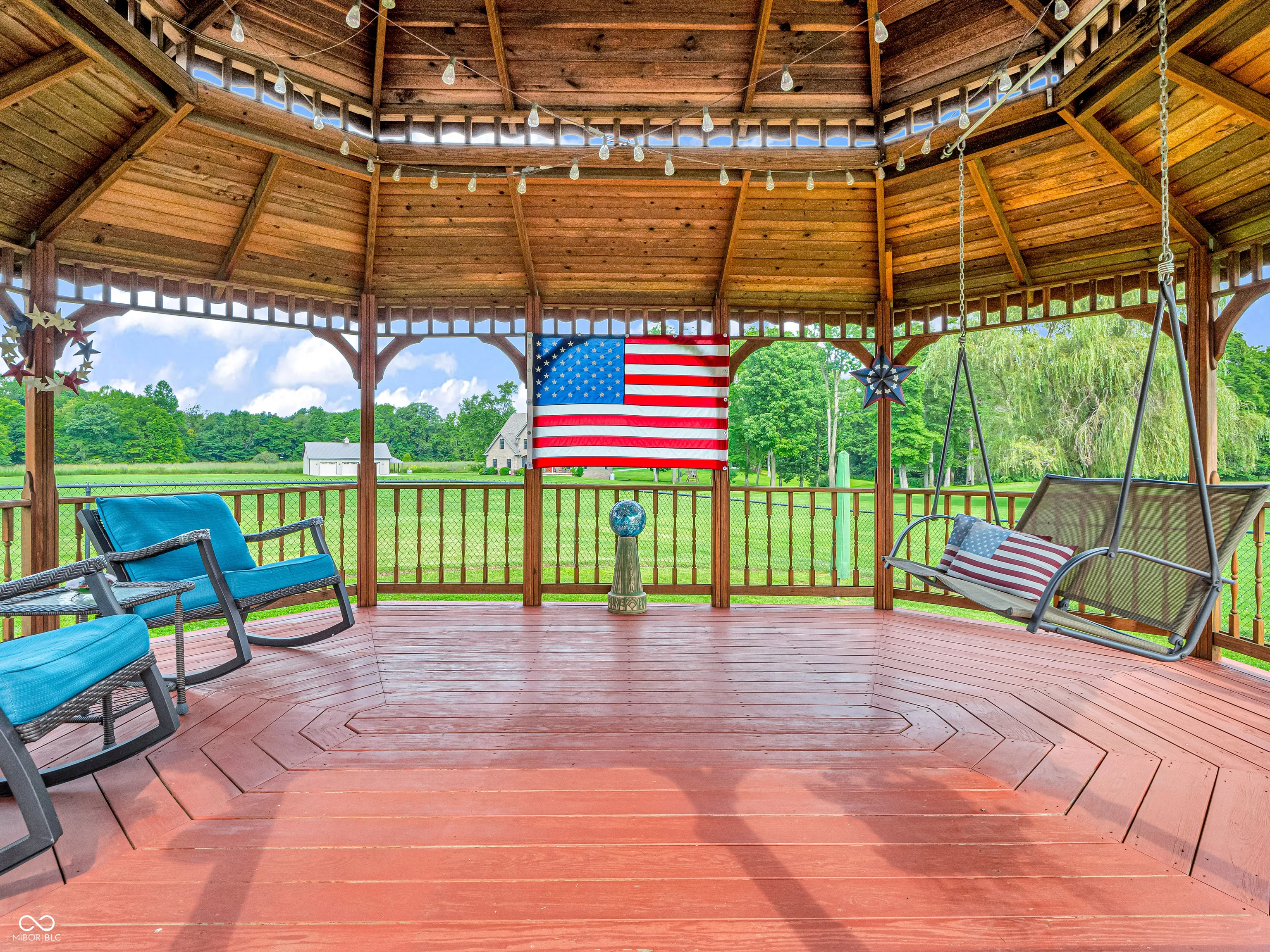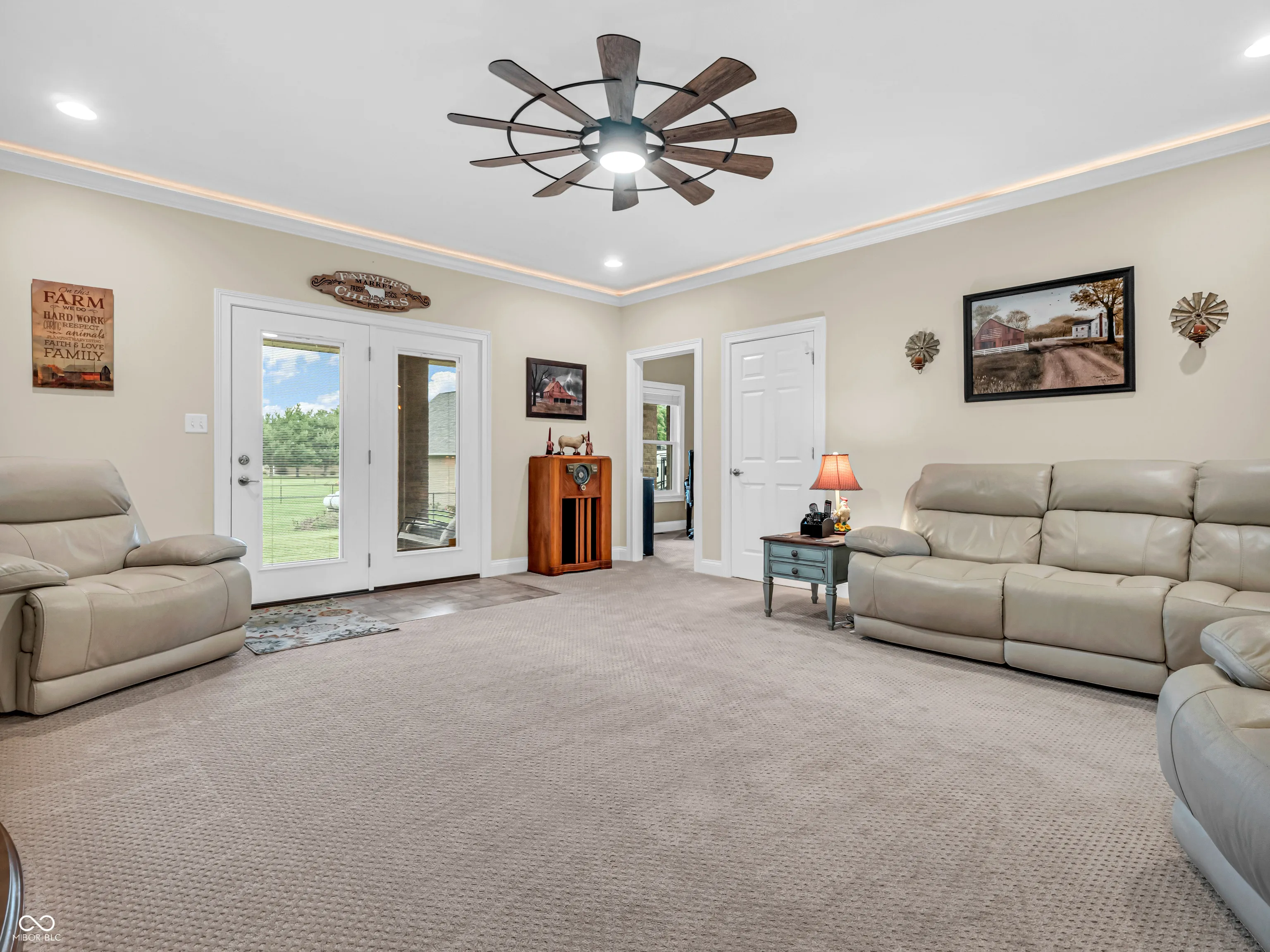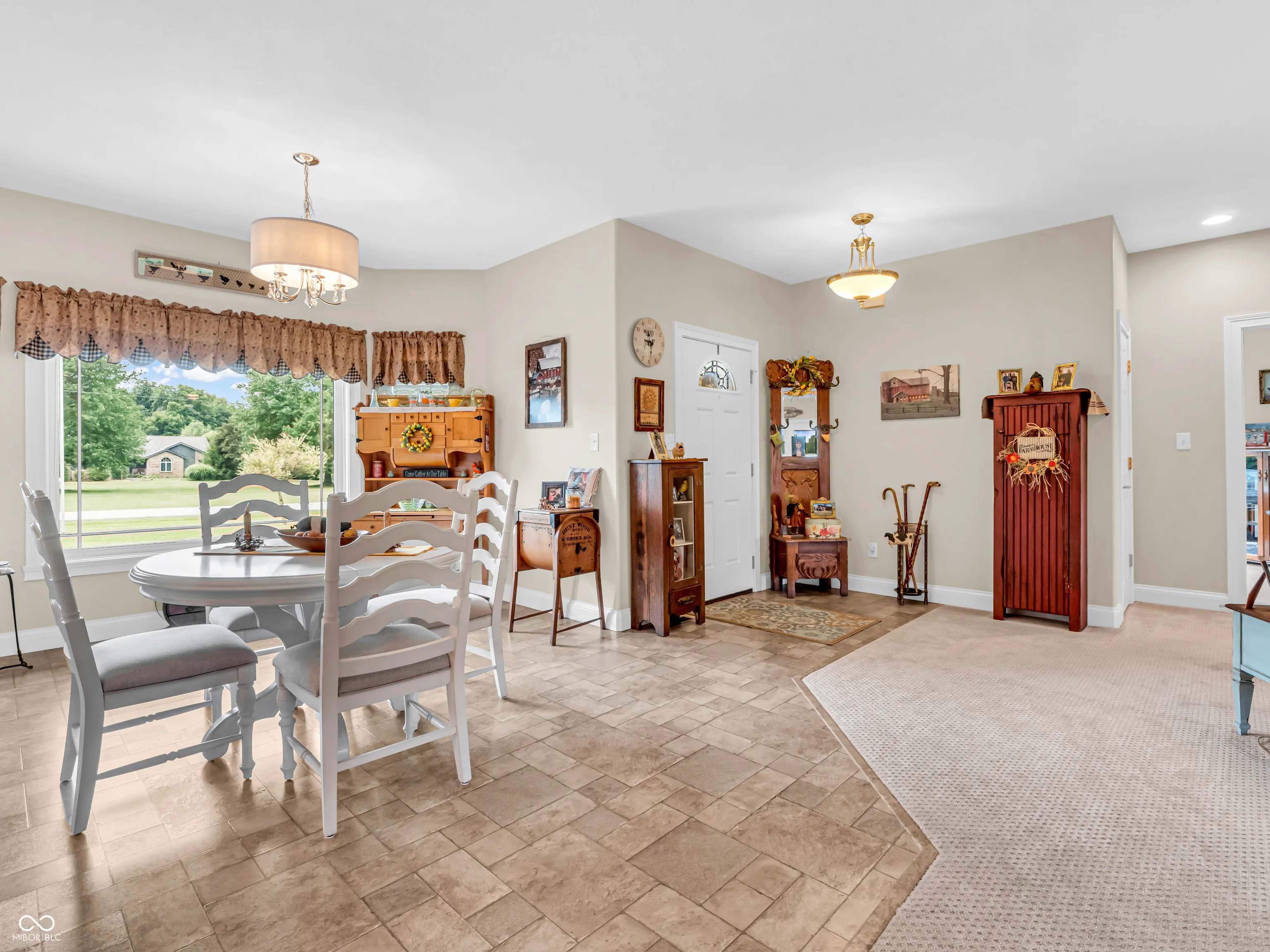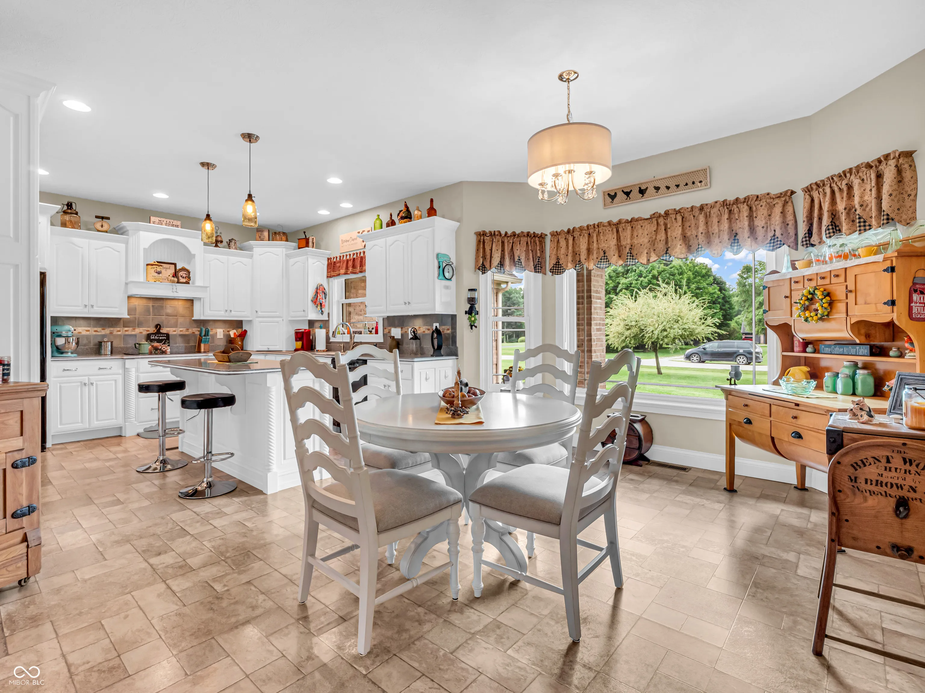 Amazing custom-built home on 2 acres that doesn’t come along often. This brick ranch with a full basement, 3-car attached garage and 3-car detached garage is a short walk to the DePauw Nature Park and surrounded by other high-end custom homes. The first floor features open-concept living with tall ceilings, 3 bedrooms, 2 1/2 baths, a dedicated office, walk-in pantry, laundry room, dining room with bay window, and white kitchen with custom cabinetry and upgrades. The primary suite has tray ceilings, a large walk-in closet and full bathroom with double sinks, jetted tub and shower stall. The kitchen includes all appliances, double oven, center island with bar seating, double sinks, range hood, and so much more. The full basement features three large rooms for gaming, movies and gatherings; as well as a large storage room with built-in shelving. A large finished attic above the garage gives you even more storage. Enjoy the fenced backyard with large gazebo and fire pit from the covered back patio. The brick 3-car detached garage is a dream for anyone wanting a workshop, studio or hobby space. The full concrete driveway includes a basketball court. High-speed internet available. This meticulously-maintained home is conveniently located close to town on paved roads, but has the quiet and nature of the countryside.