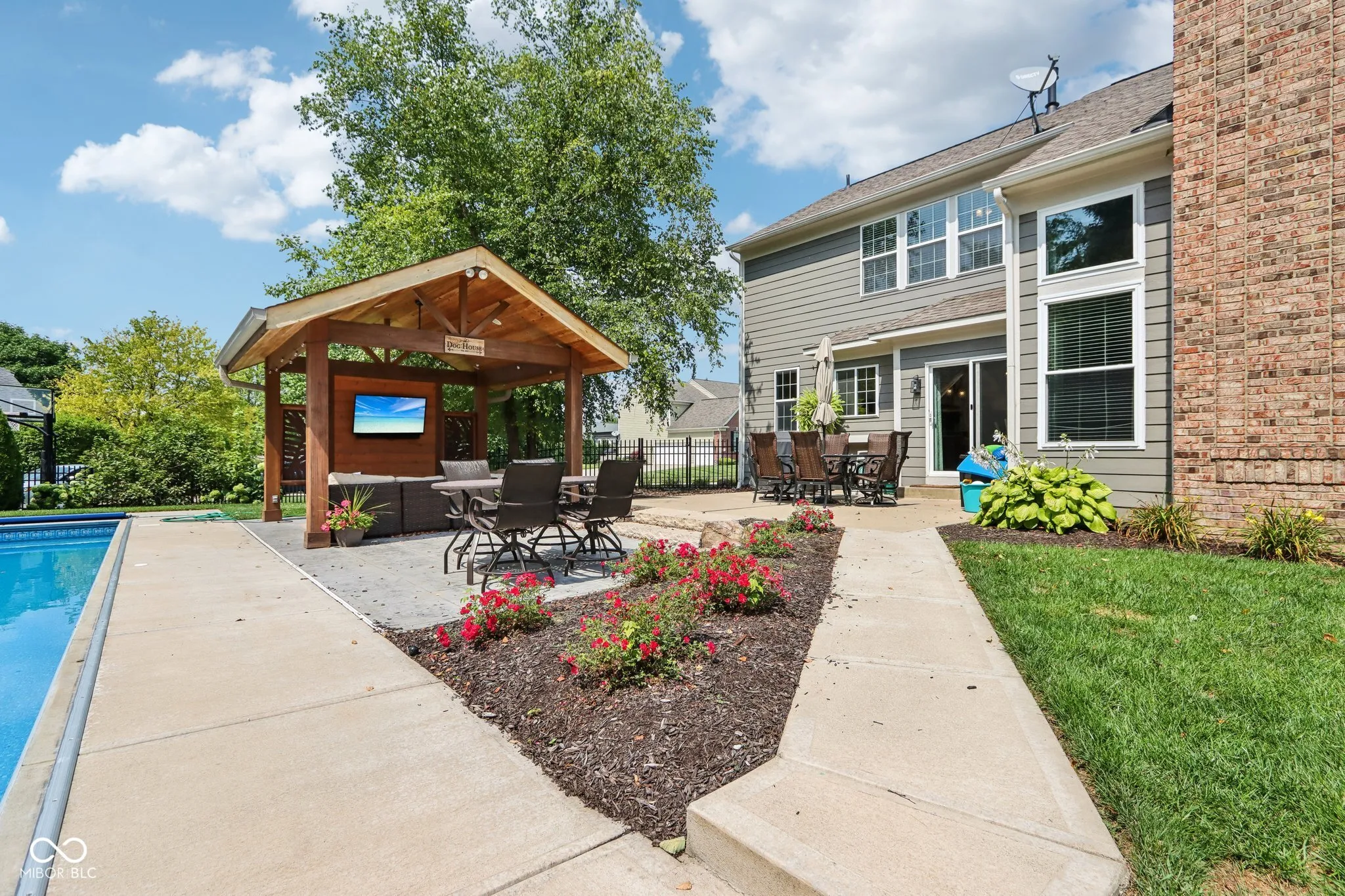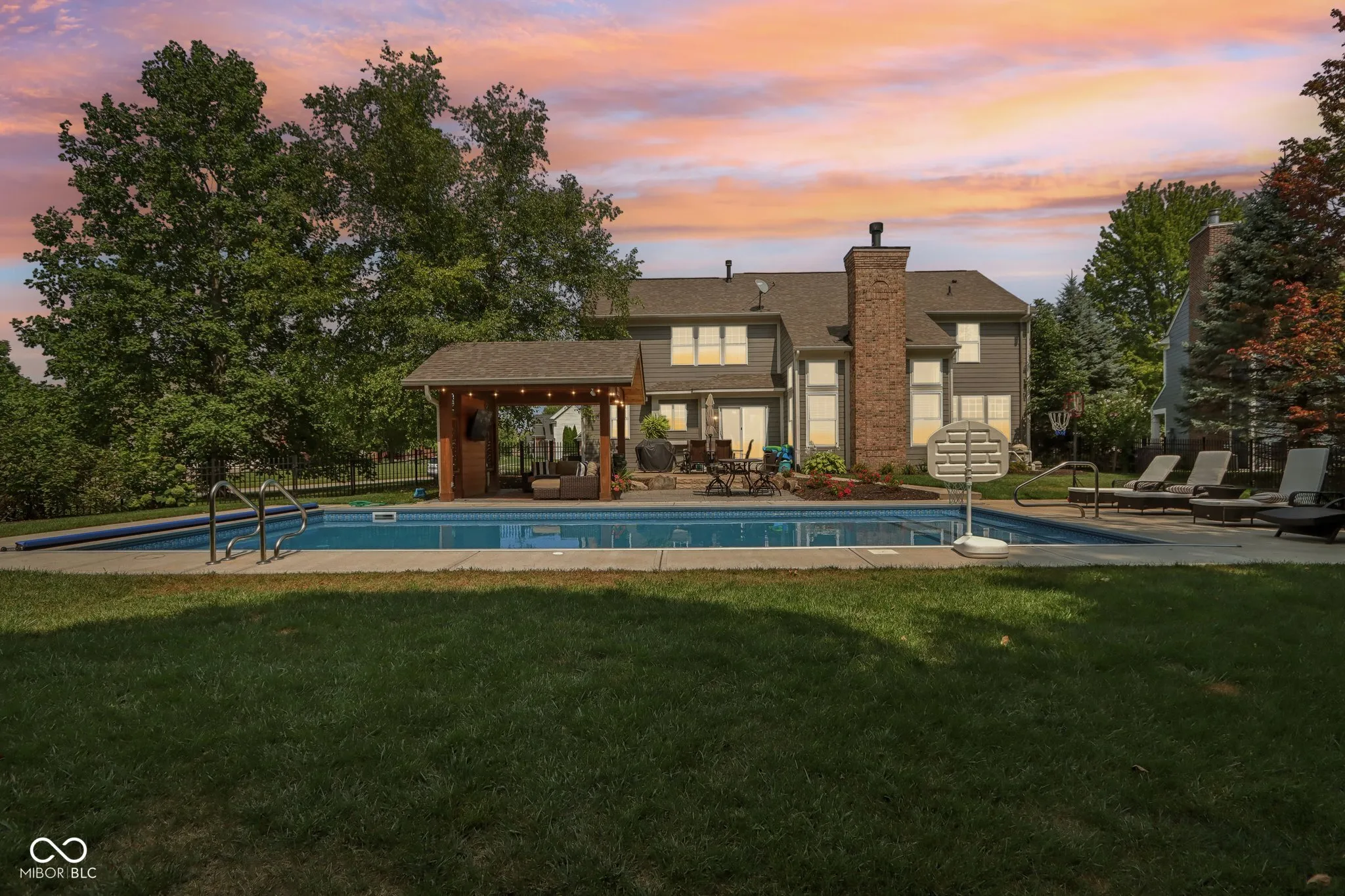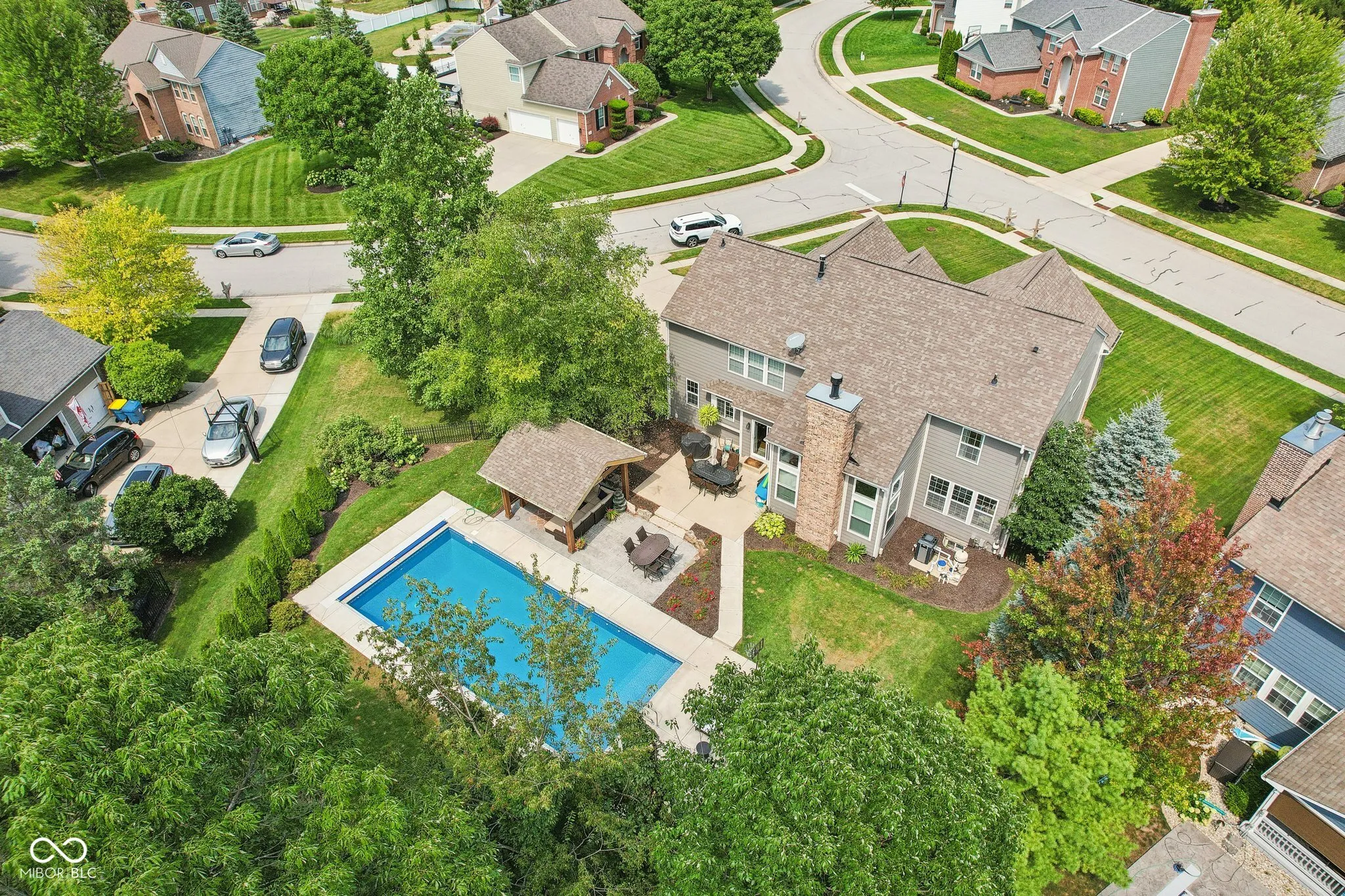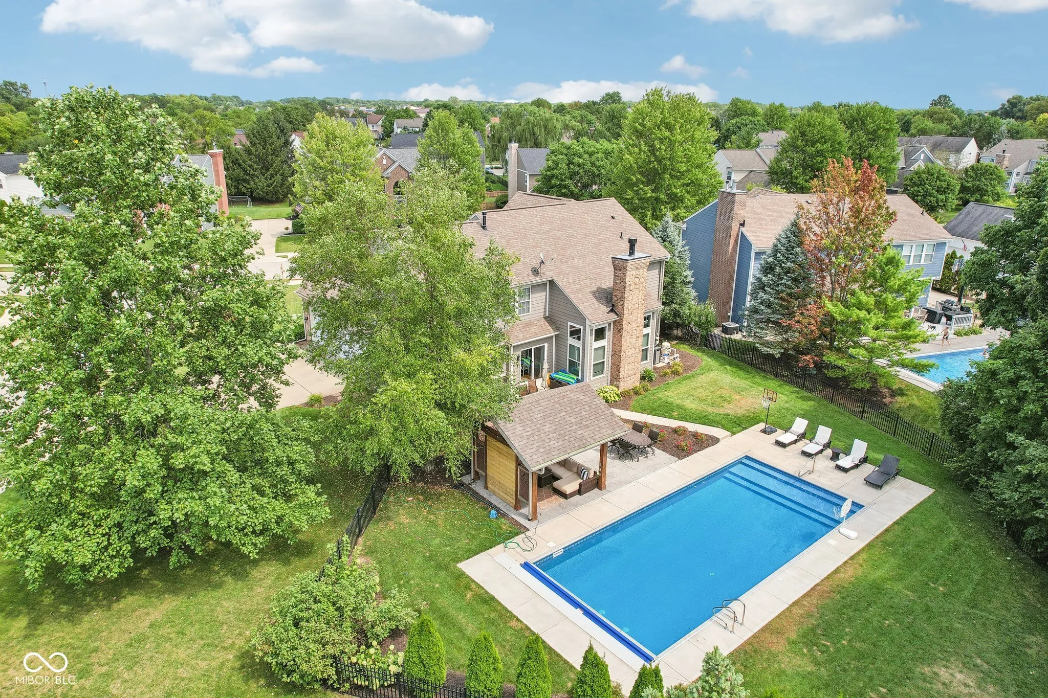 Welcome to this meticulously maintained 4-bedroom, 2.5-bathroom residence nestled in the Gray Eagle. As you enter, a stunning brick archway leads you to a grand 2-story foyer, showcasing elegant hardwood floors and classic wainscoting. The main level continues to impress with rich hardwoods extending through the hallway and into the bright, updated kitchen. Featuring a center island, SS appliances, quartz countertops and tile backsplash, this kitchen is perfect for both everyday living and entertaining. The vaulted great room, complete with a cozy fireplace, offers perfect views of the wooded backyard. Retreat to the expansive master suite, where vaulted ceilings and two walk-in closets provide ample space. The luxurious en-suite bathroom features tiled floors, a relaxing soaking tub, and stylish finishes. The finished basement adds versatile living space with a spacious family room, a bar area, and a large finished workshop. Step outside to discover your private oasis-a fenced backyard with a sparkling in-ground pool, perfect for summer fun. The pergola, equipped with electricity, offers a shaded retreat where you can unwind and enjoy the outdoors. Located in the perfect convenient Fishers location, this one won’t last long. Don’t miss your chance to experience this exceptional property!