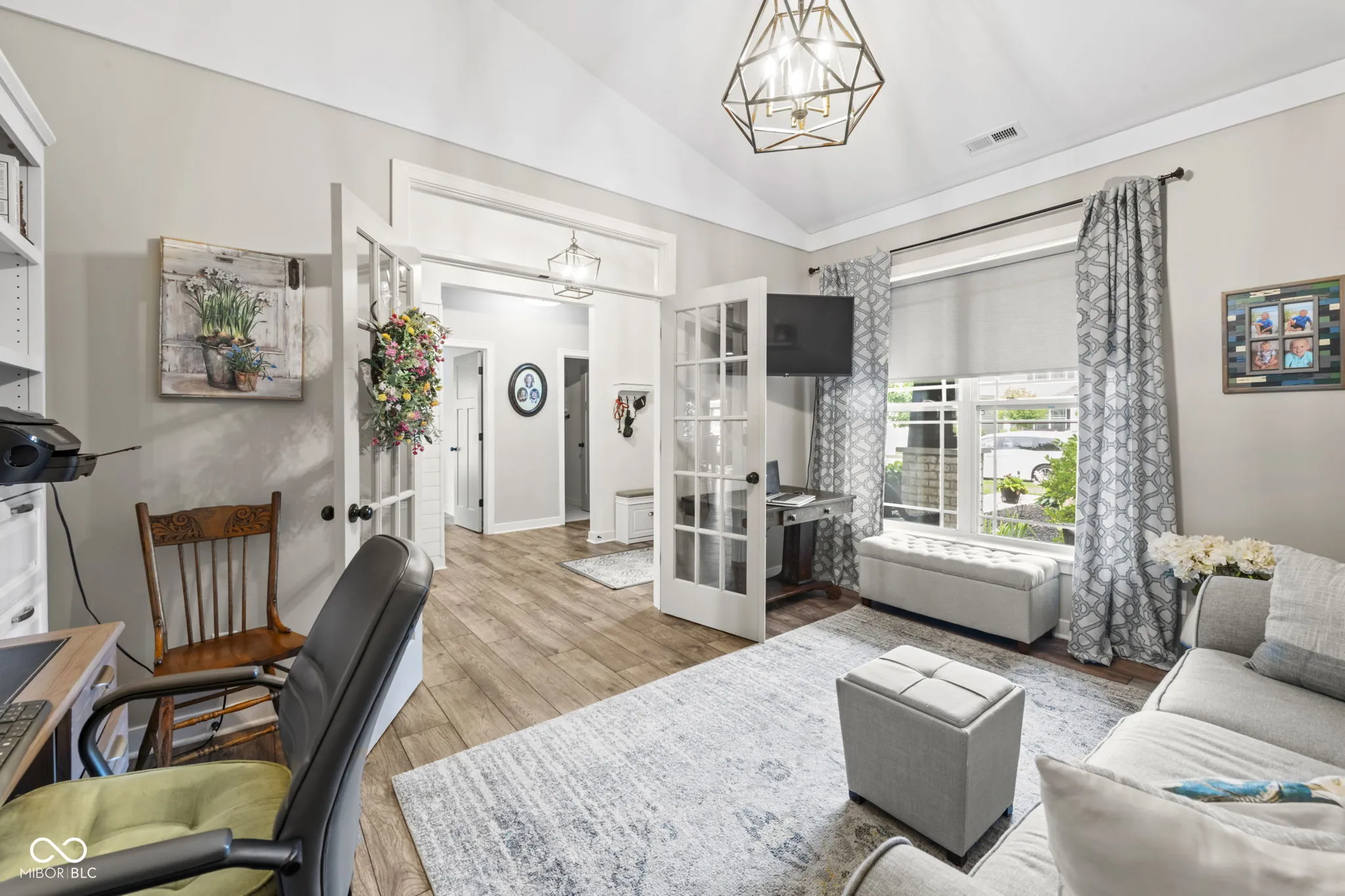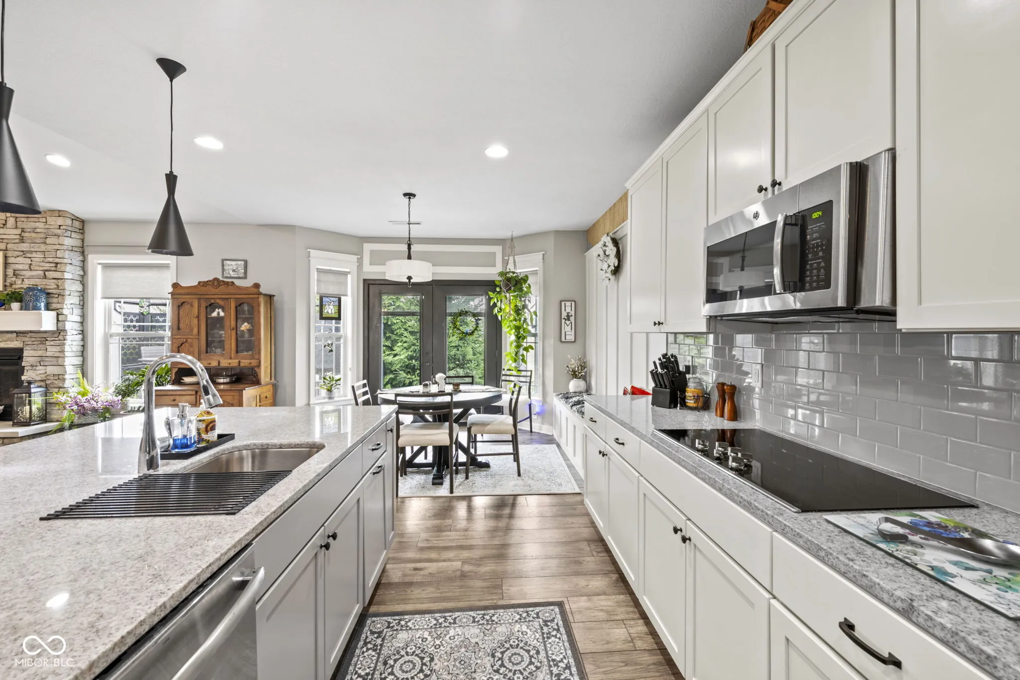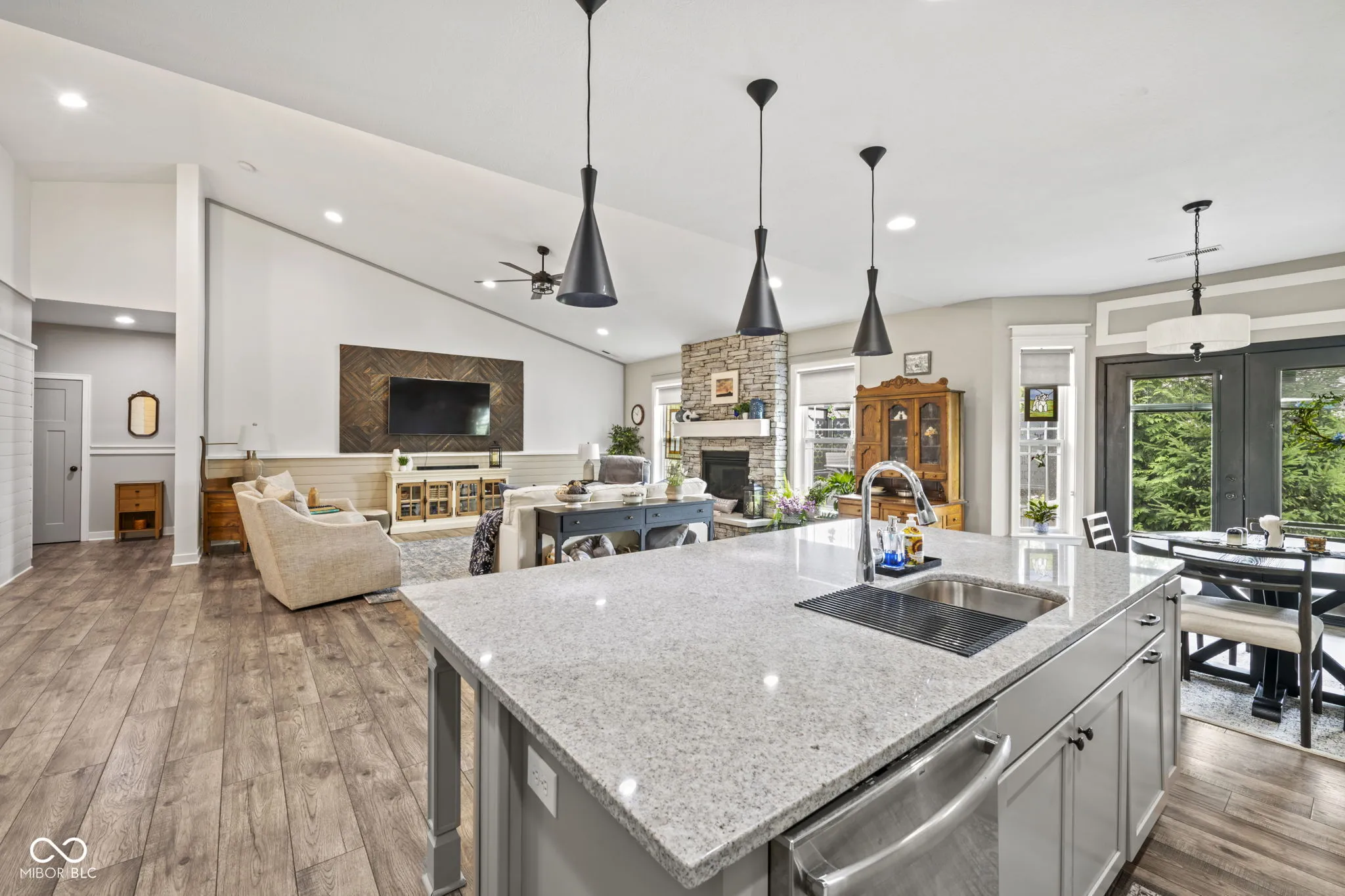 Welcome to this stunning ranch-style home in Zionsville! Prepare to be captivated by the exquisite hardwood floors and custom trim work throughout. The floor plan flows seamlessly from the entrance into each area. The great room features cathedral ceilings and a gas fireplace with a stone hearth and surround. The chef’s kitchen boasts an oversized quartz island/breakfast bar, a nook with a built-in bench, and all baths have been updated with ceramic tiles, cabinets, and countertops. The home includes three bedrooms plus a flex room with cathedral ceilings, glass French doors, and built-in cabinets. Welcome guests on the covered front porch, and enjoy the back paver porch and extended paver patio with decorative panels, perfect for both quiet time and entertaining. Professionally designed mature landscaping and hardscape create a picturesque setting year-round.