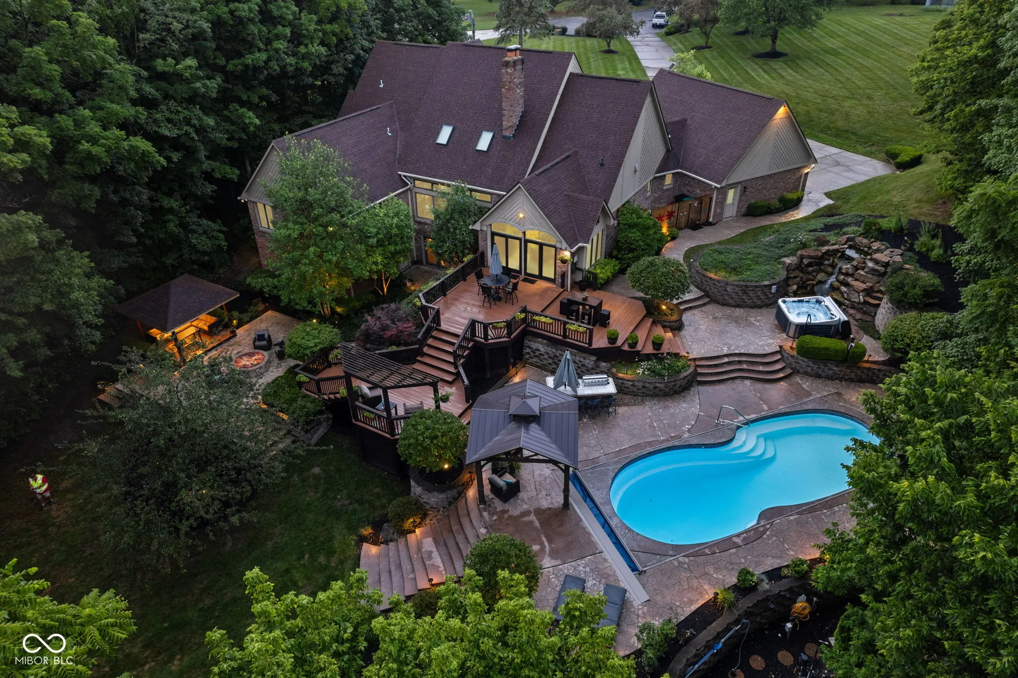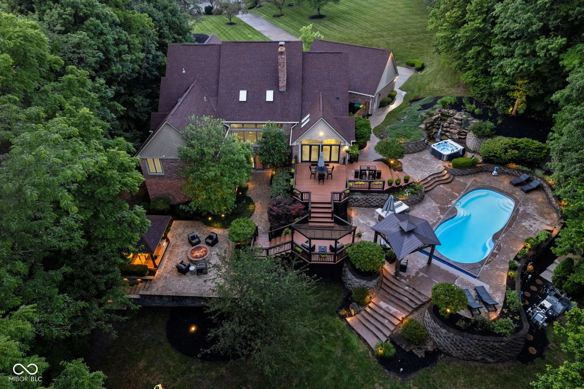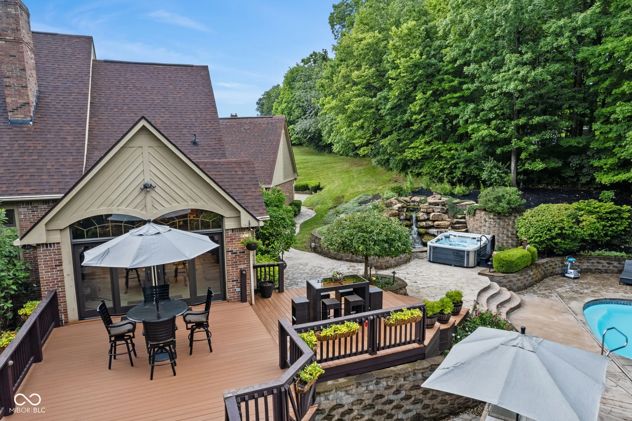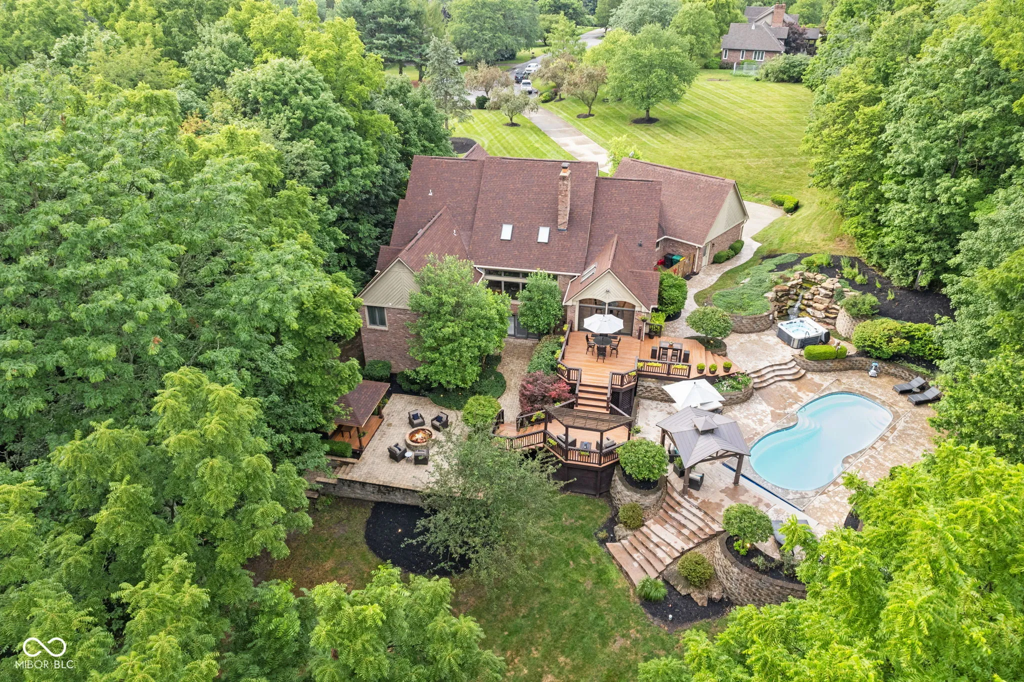 Live, entertain, work, play, relax and enjoy! This unique home offers it all with incredible indoor and outdoor living space! Offering many features, including multiple gas fireplaces, an in-ground pool, waterfall, outdoor spa, multi-level deck and quiet vignettes. Your property is nestled on a 2+ acre lot! The lot is wooded with a beautiful bubbling brook through the backyard. The primary suite on the main level offers a spa garden bath, walk-in closet, spacious walk-in tiled shower and double vanities. The guest quarters on the garden level include a private kitchen with a full bath, family room, full bar, bedroom, a 500 gallon saltwater fish tank and entertainment space. Also included is a laundry room and private entrance and exit for the guest suite. Loft overlooking the 2-story great room with 2 bedrooms, full bath and access to walk-in 900 sq ft attic. Spacious 3 car attached garage with new epoxy flooring. Whole home Generac generator for peace of mind. Home is conveniently located near Traders Point, Eagle Creek, Zionsville, shopping, restaurants and more! Within 1 mile of I-465 and 20 minutes to downtown Indianapolis. No HOA. This property has too many features to mention – don’t miss the attached photos and home features for more information! Don’t miss this rare opportunity to embrace this impressive and comfortable home!