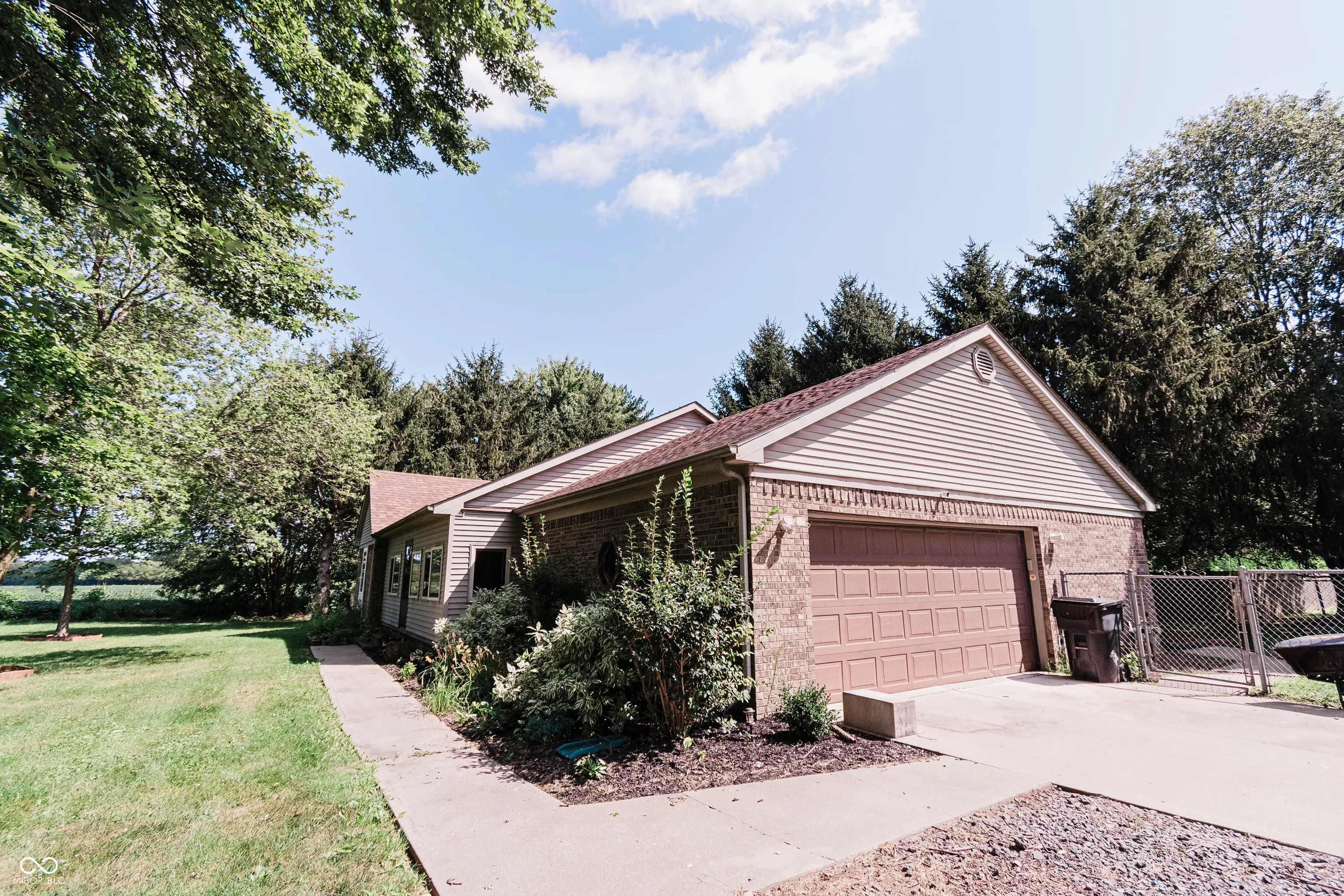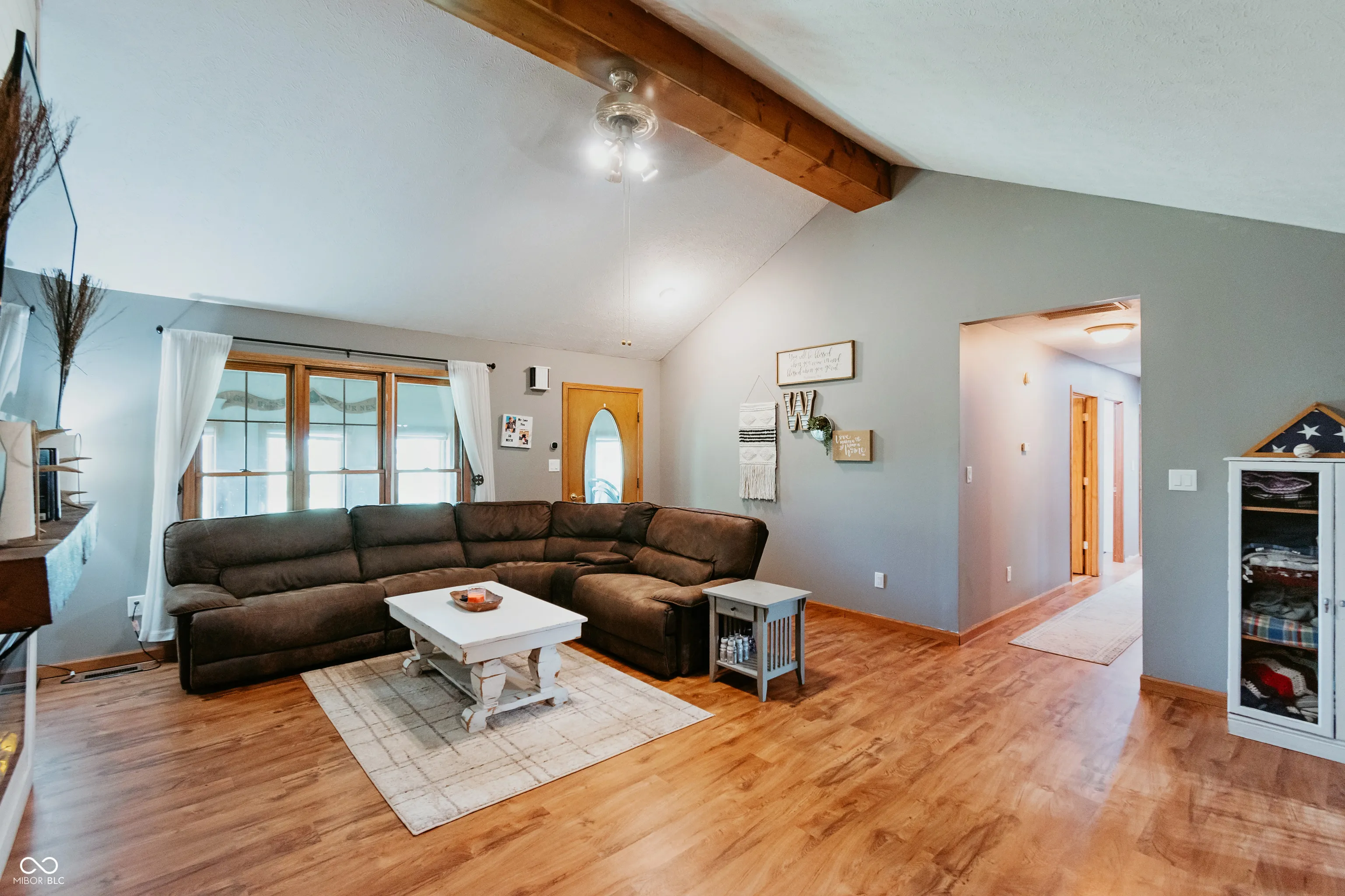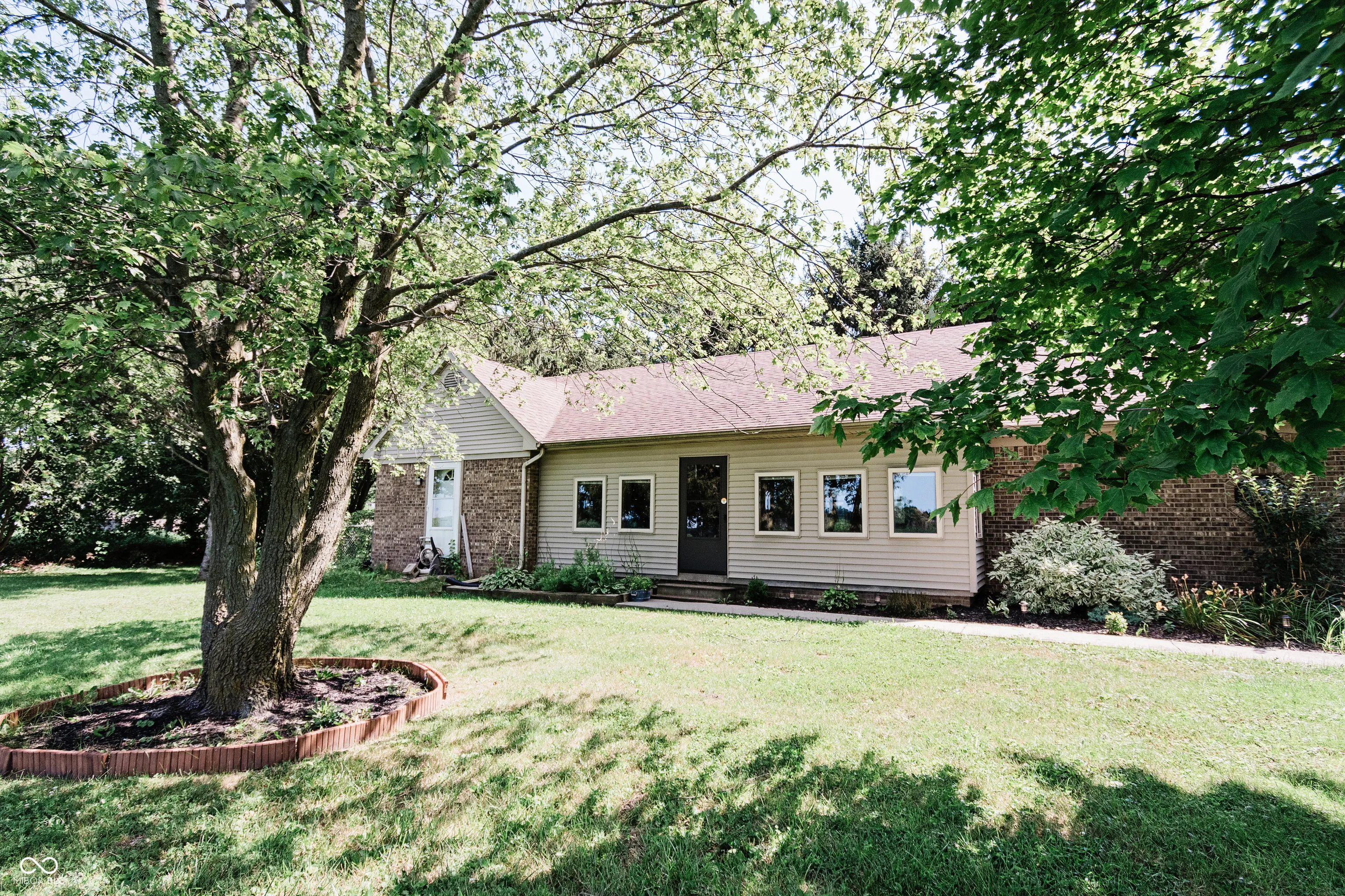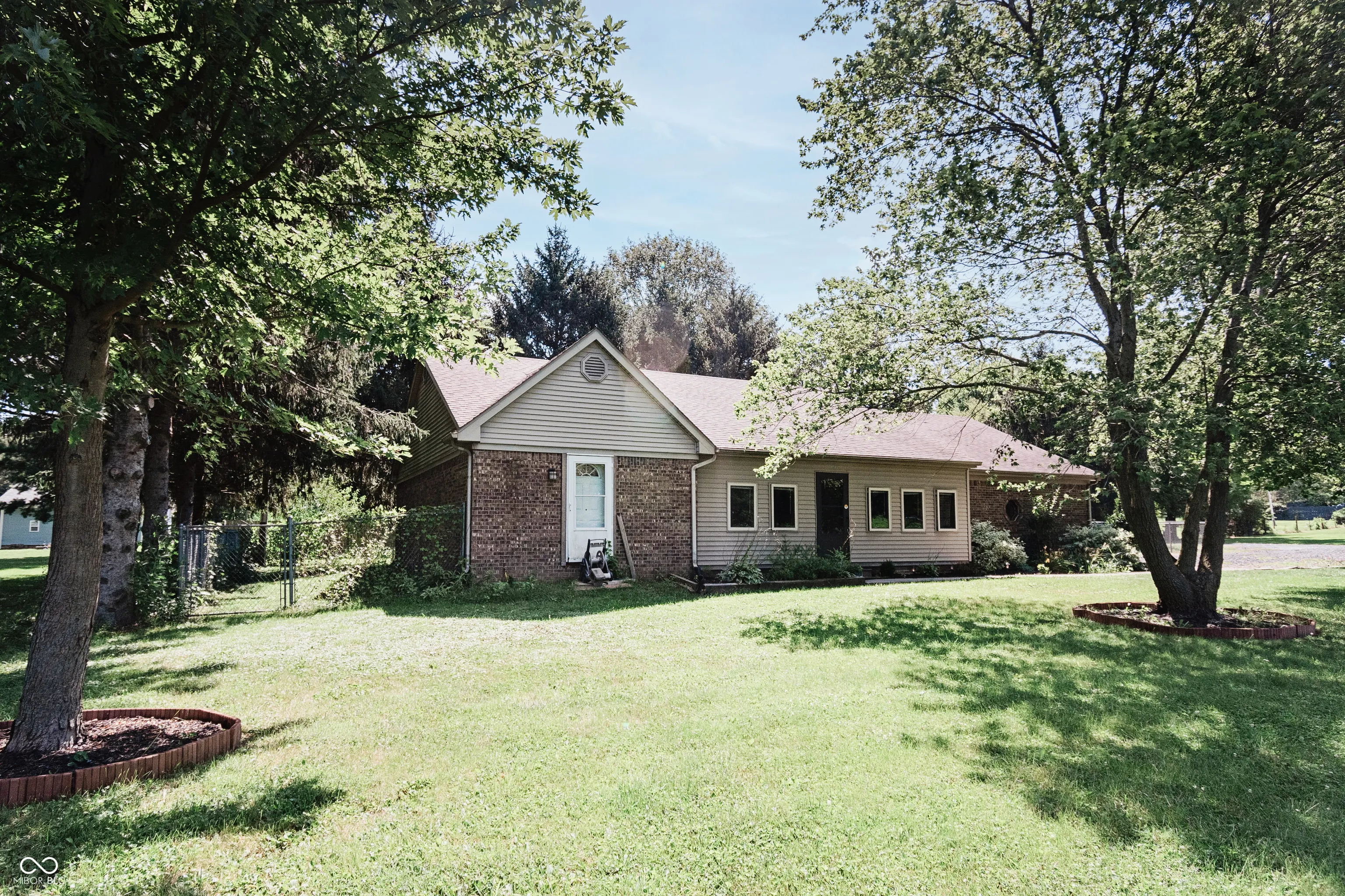 Welcome to your private brick ranch oasis tucked back off the road in downtown Thorntown! Once inside you will be wowed by the vaulted ceilings, wrapped beam, custom mantle fireplace, and rich plank flooring throughout. Your two bathrooms have been recently updated with solid surface and granite vanity tops. The spacious bedrooms are all centrally located with the primary ensuite boasting a walk in closet and attached en-suite bath. This large lot includes an enclosed front porch, a covered back porch, a fully fenced in backyard and a mini barn for storage! You get all the amenities of rural living, cornfields surrounding, a long drive and a private yard, with the walkability to the Big 4 Trail, park, elementary school, library, restaurants and everything downtown Thorntown has to offer! Come see it today!
