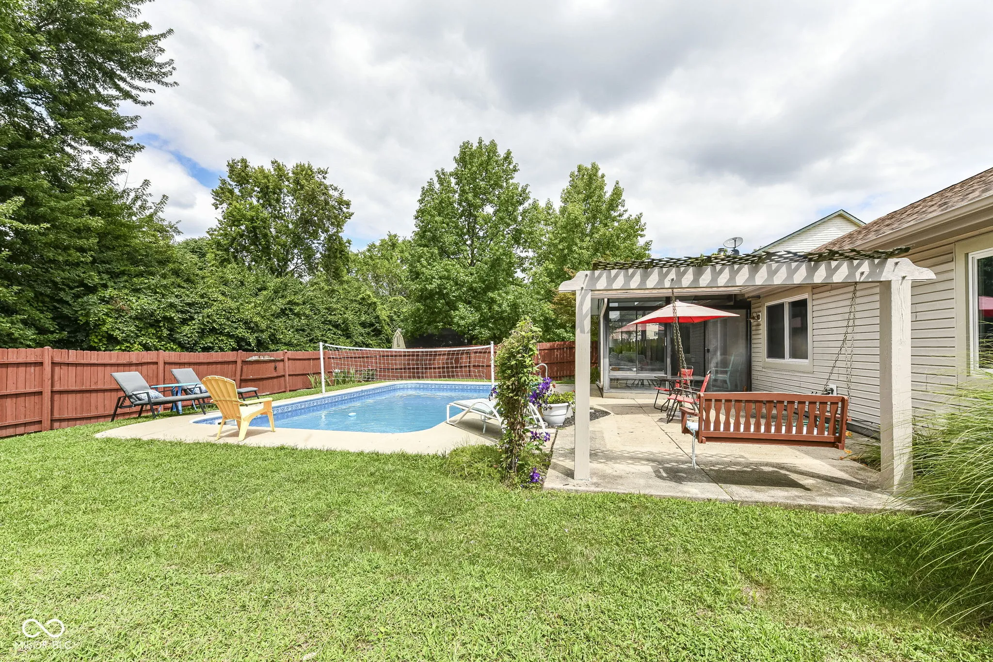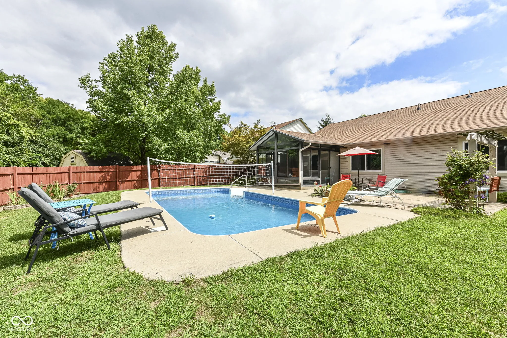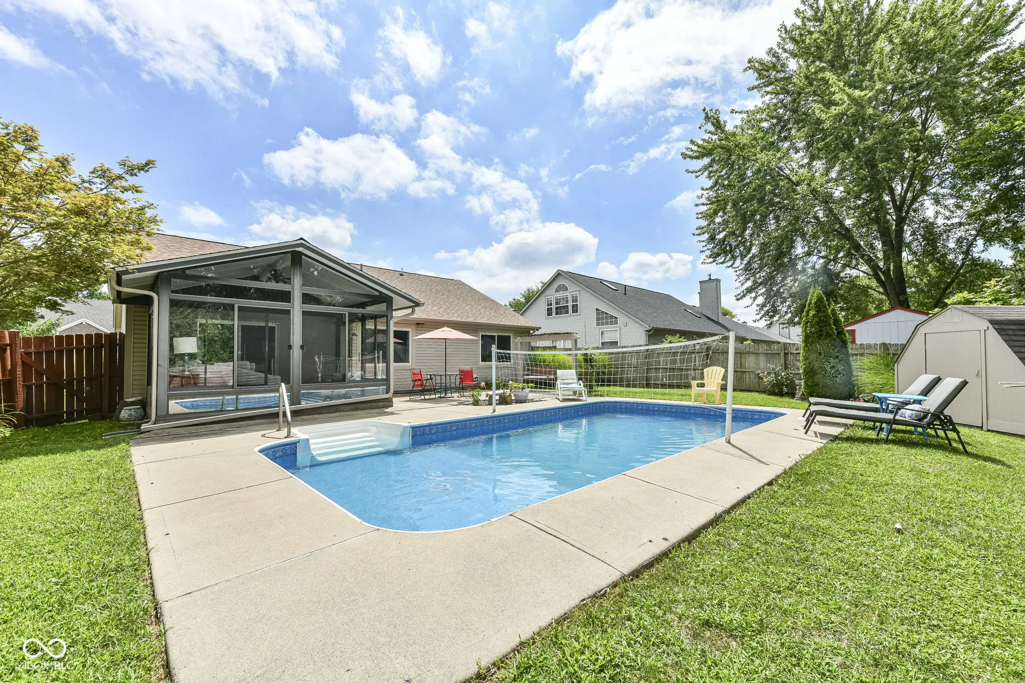 HEATED POOL? say what?! Charming Greenwood home conveniently located on Main Street between 31 & 135 near shopping, dining, and schools. Extend your summer in the lovely heated swimming pool, complete with sports package volleyball net. Watch beautiful sunsets from your sunroom with floor to ceiling windows ~ the perfect spot to relax or entertain. Fully fenced rear yard includes mini-barn and plenty of space for gardening/recreation/relaxation with extra property behind the fence. Inside you’ll love the open, spacious dining & family room with built in shelving and a corner gas fireplace to keep you cozy in winter months. Open, spacious kitchen with vaulted ceiling, white cabinets, pass thru to dining room, center island, pantry & breakfast bay. Spacious primary suite with garden tub/shower, two closets, linen closet, wide vanity space & enclosed water closet. Guest rooms have w-i-c, huge windows, new carpet. Hall linen closet, recently updated bathroom w/full shower, pedestal sink, transom windows. Laundry room has built in cabinets. Newer windows, new carpet in beds 2 and 3. Roof was replaced in 2023. DON’T MISS!
