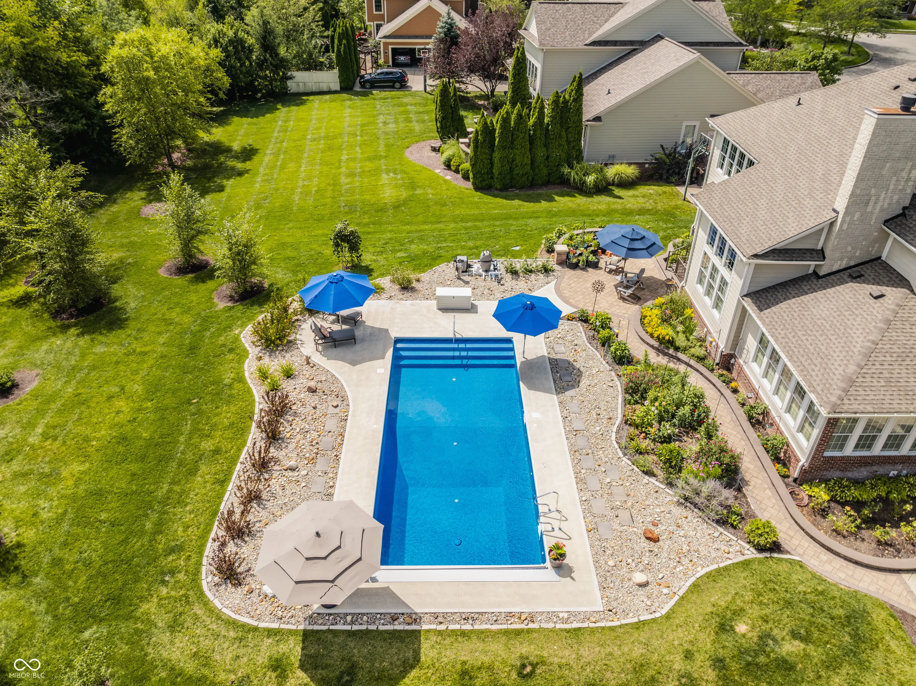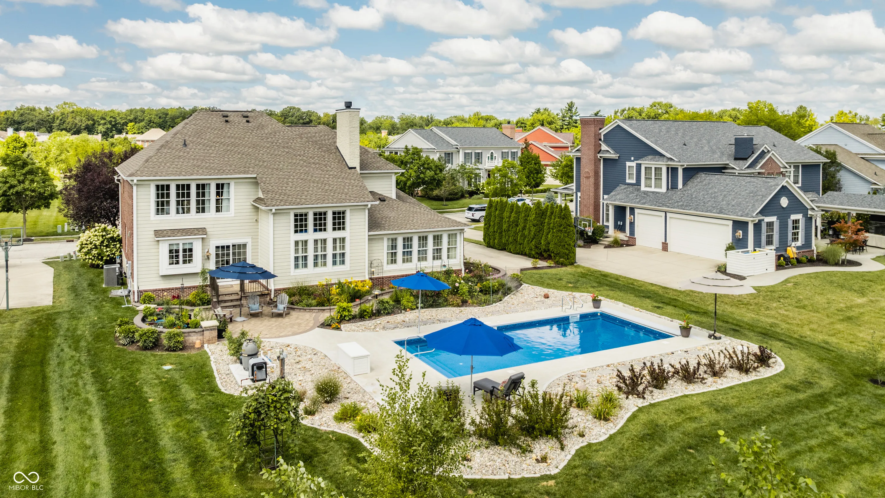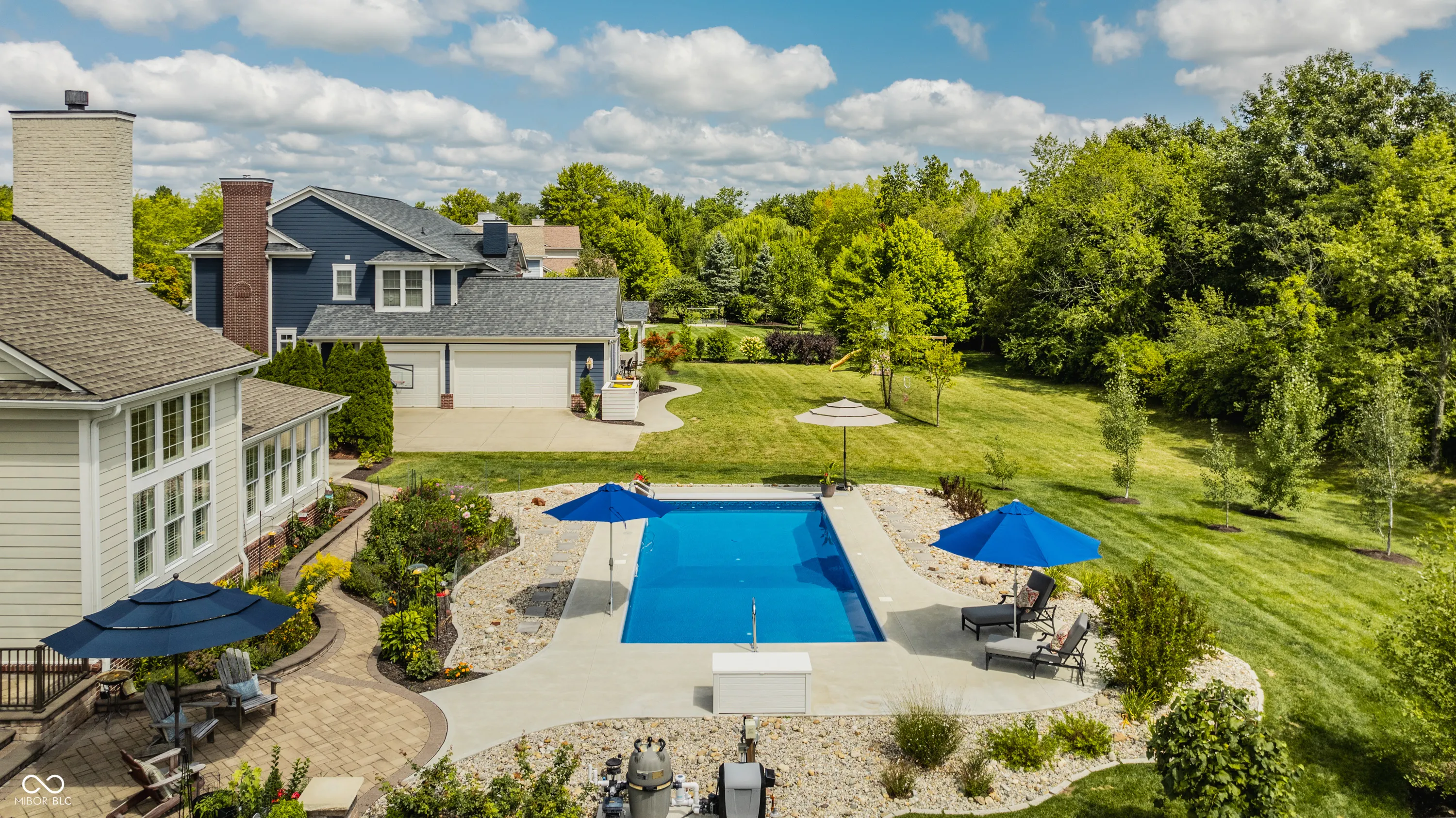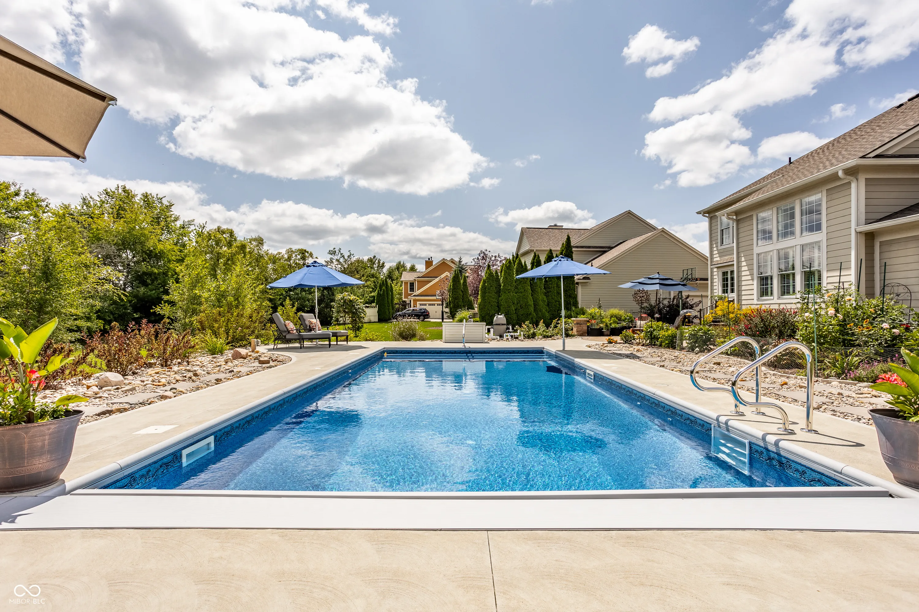 Resting on almost a half-acre in one of Carmel’s most sought-after neighborhoods, the Village of WestClay, this updated move in ready 4-bedroom, 2.5-bath home is a blend of luxury, comfort, and modern living. The newly renovated kitchen and heated pool with automatic pool cover are the stars of the show. The welcoming floor plan features a grand 2-story great room with a cozy two sided fireplace, perfect for gatherings, and an oversized 4-season room walled in ship lap and bathed in natural light year-round. The open kitchen is a chef’s dream, equipped with stainless steel Thermador and GE Profile appliances, including a double oven and gas range, and a spacious custom center island. This space has been fully renovated to include stunning granite countertops, oversized subway tile backsplash, a center island with cabinetry storage, an undercounter wine cellar, and a pull out trash bin. The kitchen also boasts a separate coffee/entertaining bar, adding convenience and style. Step outside to the breathtaking stone patio and pool area, a perfect setting for entertaining family and friends. The new heated 36×16 pool, featuring an automatic cover and self-cleaning system, is surrounded by a meticulously designed stone patio. This serene outdoor oasis is framed by stunning perennial gardens, showcasing 24 varieties of exotic peonies, and set against the picturesque backdrop of a beautiful, tree-lined backyard. The upper level boasts new carpeting throughout, a serene master suite, complete with a double vanity, a garden tub, a separate shower, and a walk-in closet. Three additional bedrooms and a full bath complete the upstairs living space, offering comfort and privacy for family or guests. The lower level is a full unfinished basement that provides ample opportunity for storage or future customization, for an additional recreation area, theater room, playroom, 5th bedroom, home gym, flex space, and is plumbed for an additional bath.
