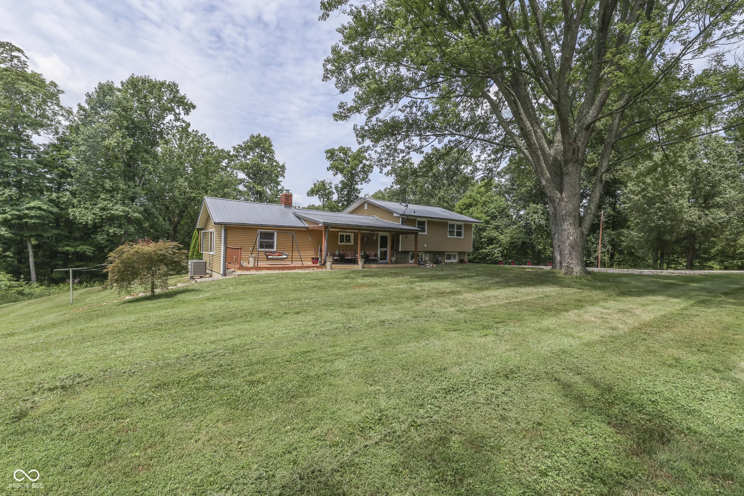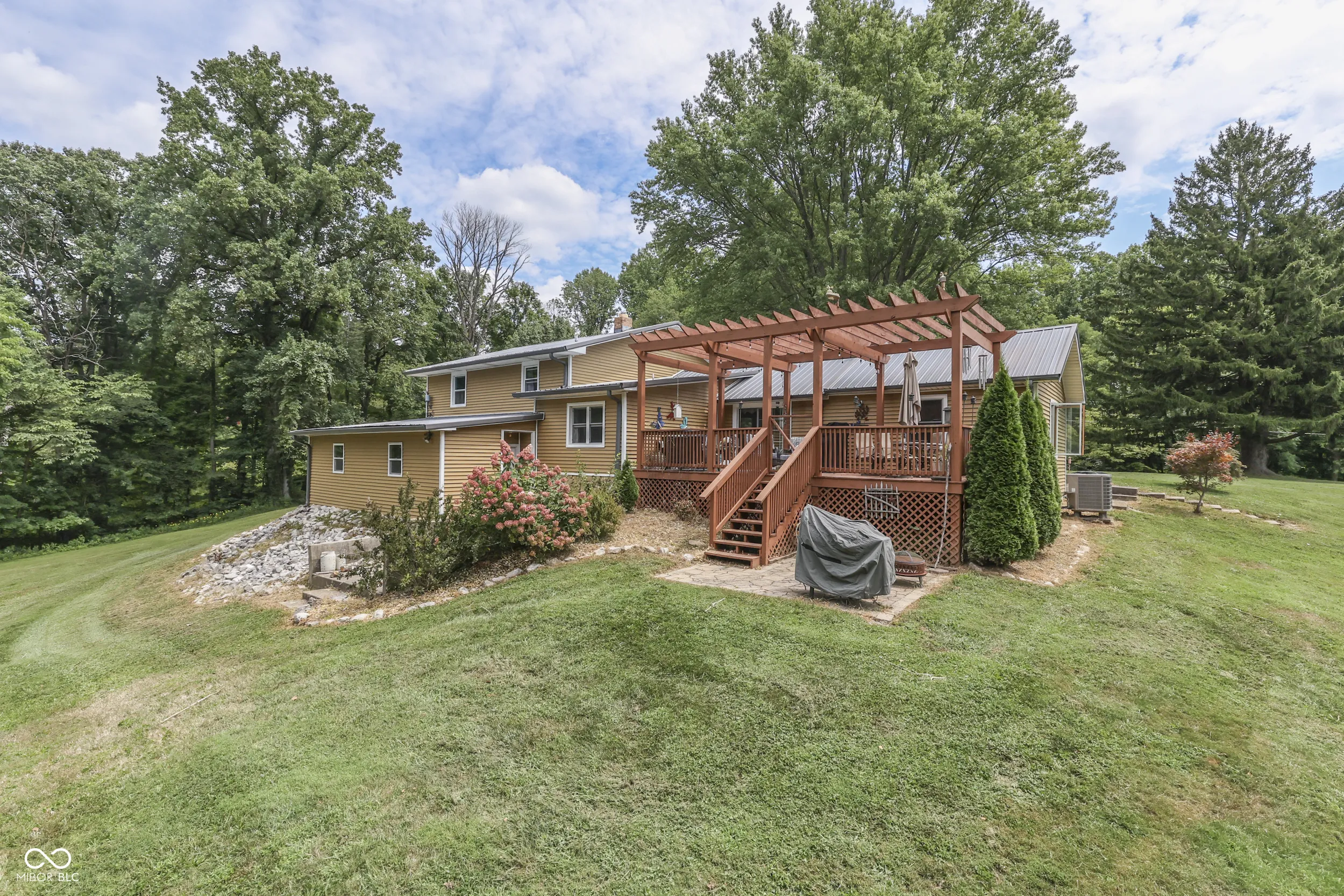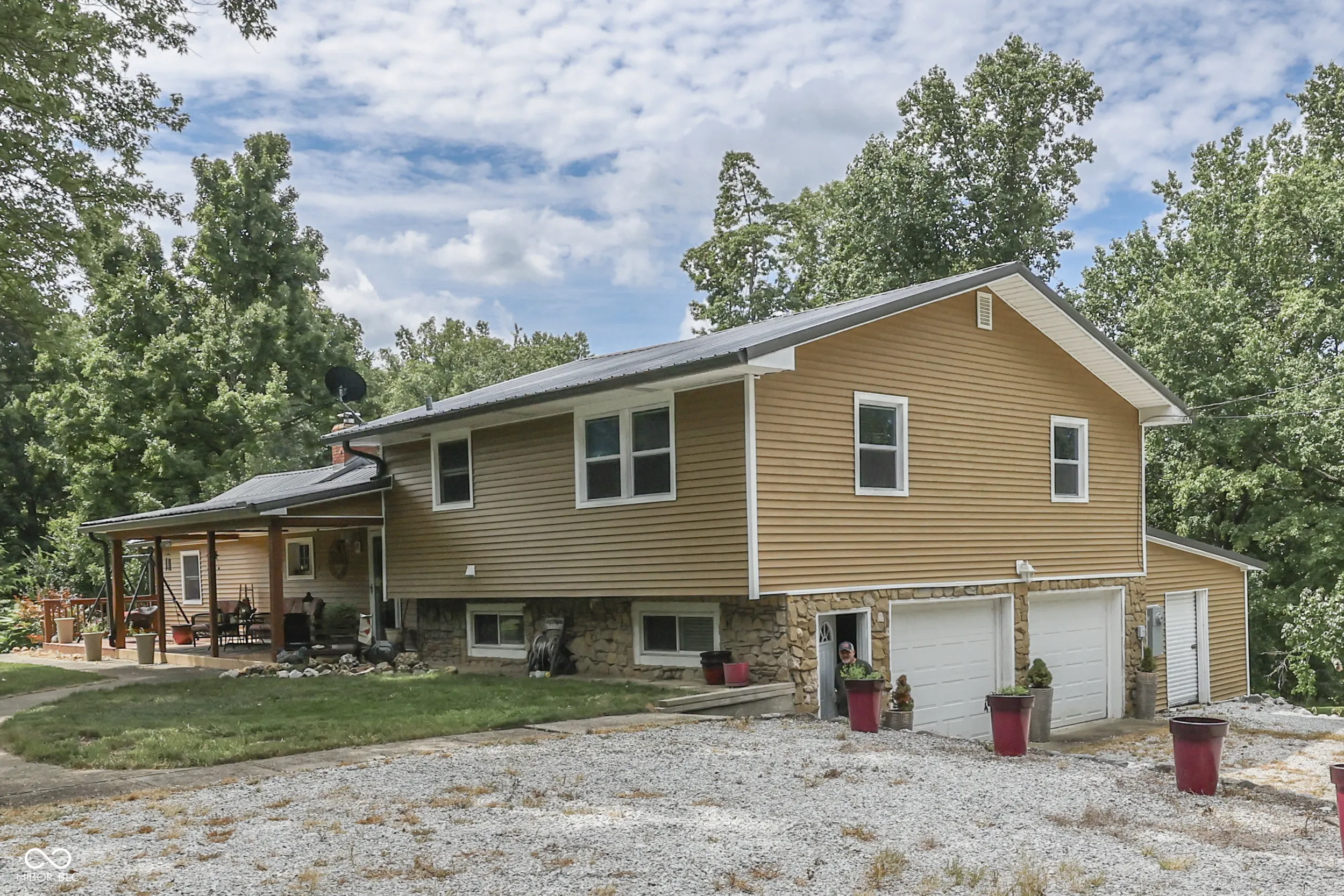 A stone and vinyl exterior easily combines with the front covered porch on this 3 bedroom 2 level traditional home. Inside, a massive beamed vaulted ceiling kitchen welcomes you in. This space impresses with beautiful soft-close custom cabinetry, granite countertops, copper farm sink, stainless appliances while opening up to a comfortable outdoor deck with huge pergola overlooking 6 beautiful Morgan county acres. The main level also offers a comfortable living room with wood insert fireplace and a nice bonus room for office or den space. This leads out to an oversize 2+ car garage with a mower garage attached. Home is over a small basement for storage. The family bedrooms and laundry are located just a few steps up. Since 2017 this home has enjoyed new windows, roof, HVAC, septic, water lines, vinyl, remodeled kitchen and bath and so much more. This location is ideal for commuters or those wanting to get away!