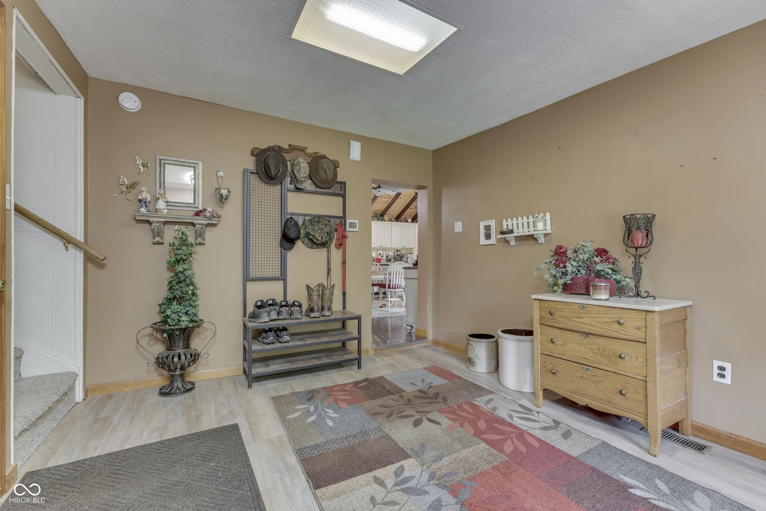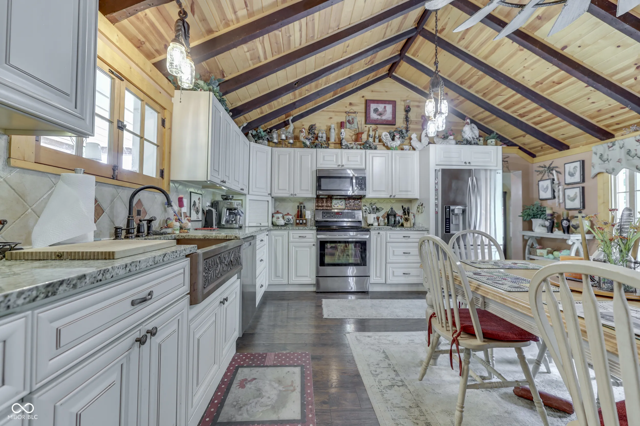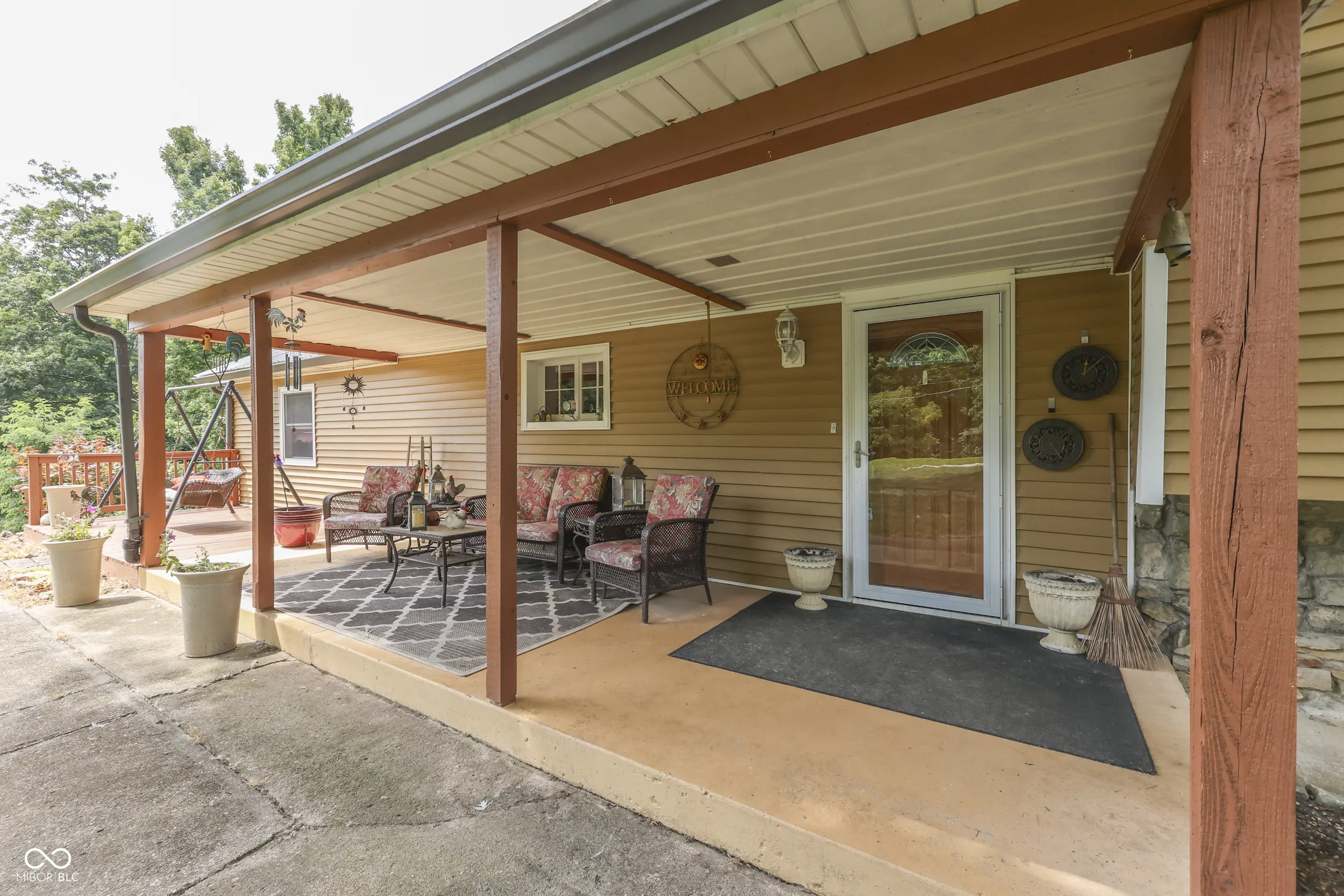 A stone and vinyl exterior easily combines with the front covered porch on this 3 bedroom 2 level traditional home. Inside, a massive beamed vaulted ceiling kitchen welcomes you in. This space impresses with beautiful soft-close custom cabinetry, granite countertops, copper farm sink, stainless appliances while opening up to a comfortable outdoor deck with huge pergola overlooking 6 beautiful Morgan county acres. The main level also offers a comfortable living room with wood insert fireplace and a nice bonus room for office or den space. This leads out to an oversize 2+ car garage with a mower garage attached. Home is over a small basement for storage. The family bedrooms and laundry are located just a few steps up. Since 2017 this home has enjoyed new windows, roof, HVAC, septic, water lines, vinyl, remodeled kitchen and bath and so much more. This location is ideal for commuters or those wanting to get away!