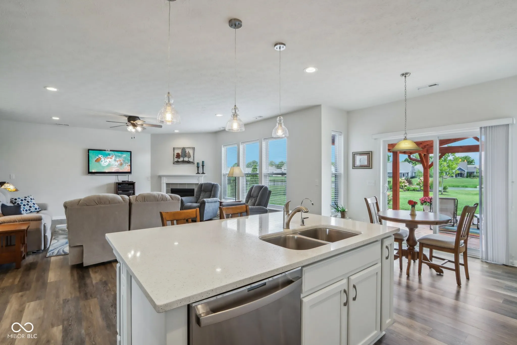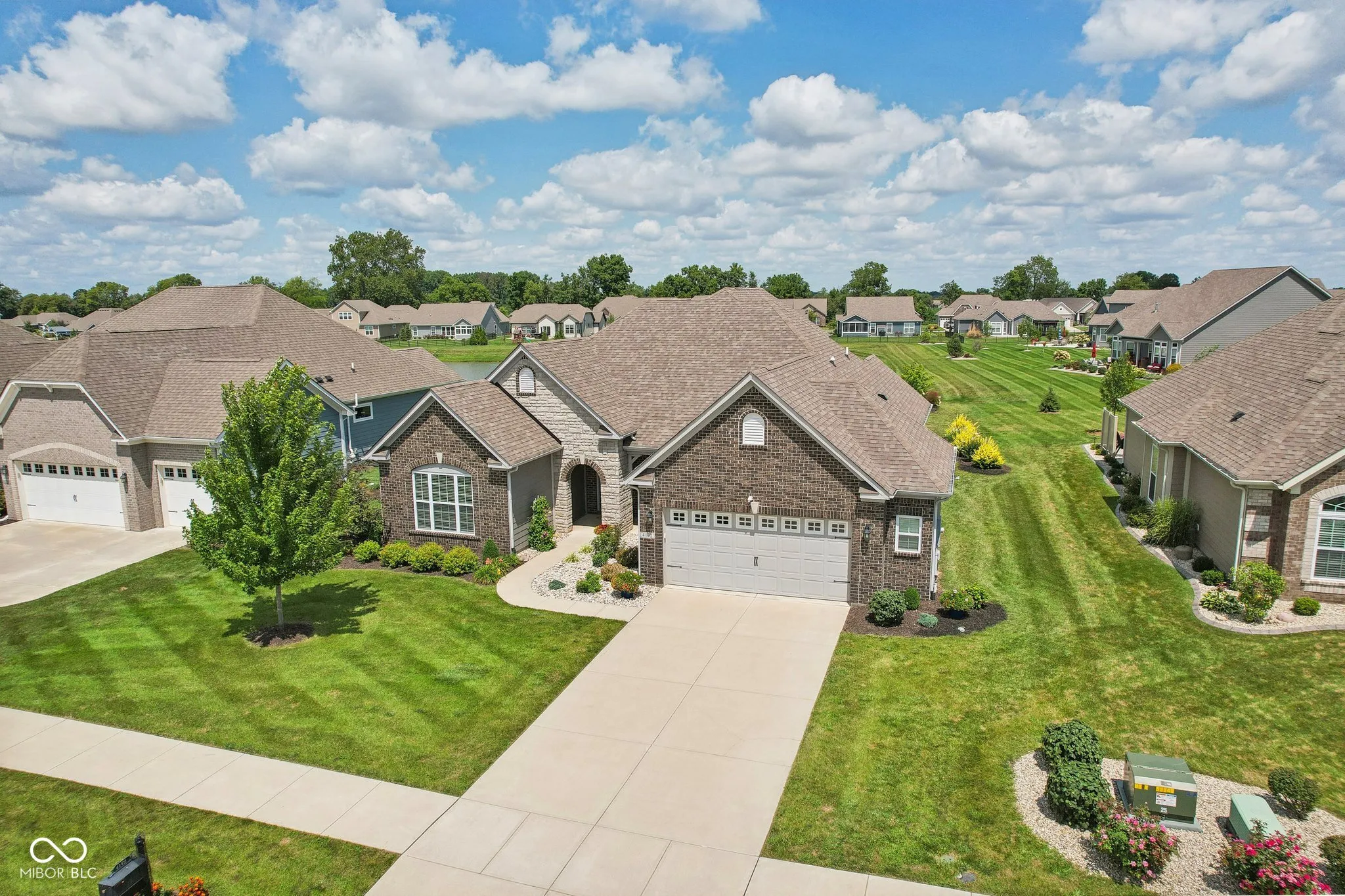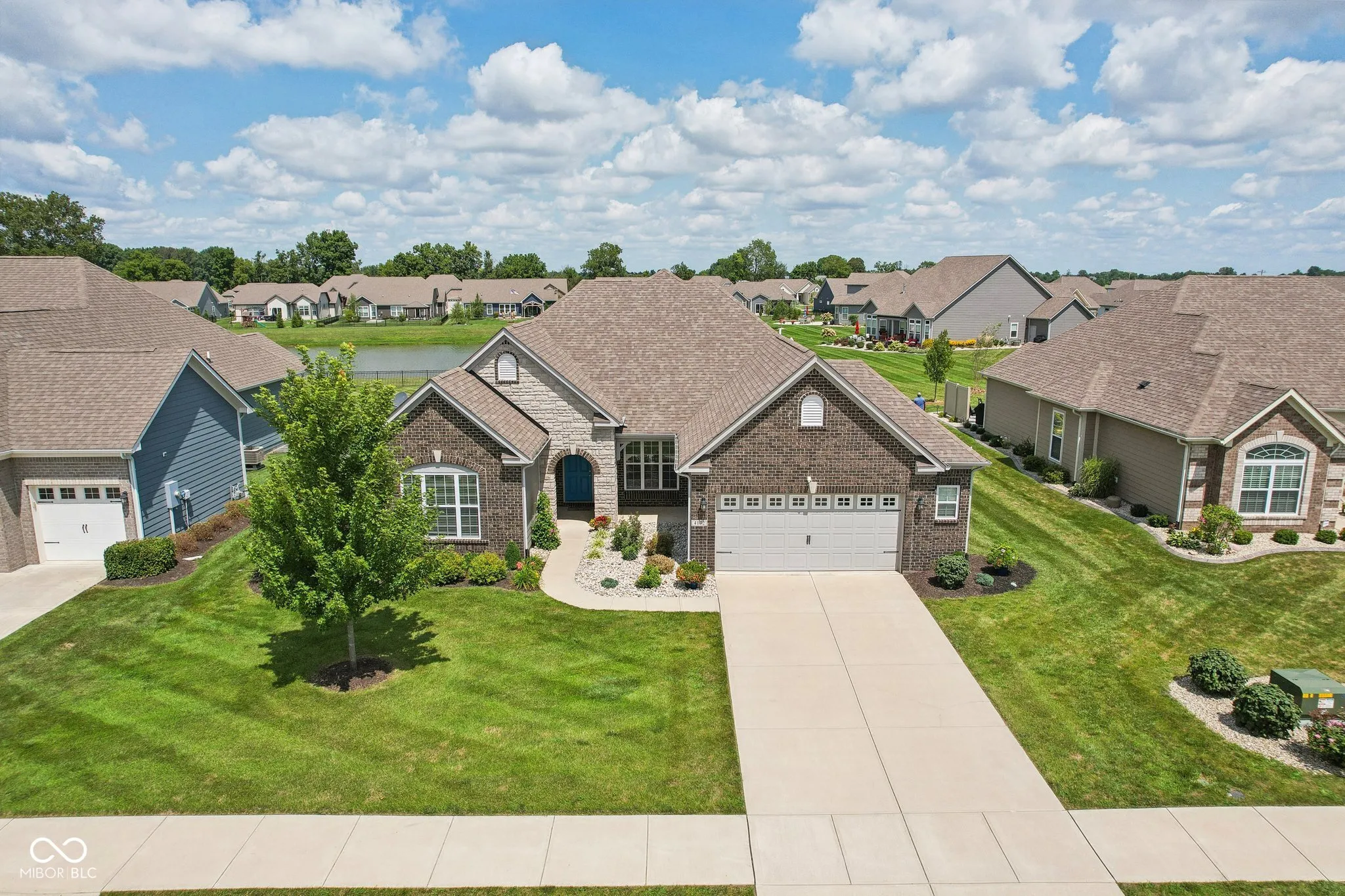 Welcome home! Beautiful 3BR/2 BA Ranch home featuring 9′ ceilings w/ luxury vinyl plank flooring and a generous loft in popular Saddle Club. Tastefully landscaped yard, brick/stone elevation, and covered front porch provide excellent curb appeal. Spacious Split bedroom floor plan including a roomy office or formal dining room w/ tray ceiling. Open concept Gourmet Kitchen displays quartz Countertops, multiple cabinets w/ pull out drawers, marble tile backsplash, Stainless Steel appliances, Double ovens, huge breakfast bar/island, walk in pantry & a bump out breakfast nook. Sun soaked Living room w/ large windows showing gorgeous views of the Lake and flower gardens offers a gas fireplace for cooler nights. Large Owners suite w/ tray ceiling & bay window includes Primary bath spotlighting a Walk in tiled shower, dbl sinks, and walk in closet. Huge Upper level loft/multi purpose room could be utilized as a 4th BR. Custom designed covered stamped patio highlights superb lake views. Finished insulated garage w/ bump out and a daylight window have space for extra toys. New irrigation system added 2023. Enjoy the community pool or playground, plus rest easier as Lawn care & snow removal are provided by the HOA. Highly rated Center Grove schools. Close to restaurants, shopping & Kephart Park(splash pad, pickleball courts & playground).