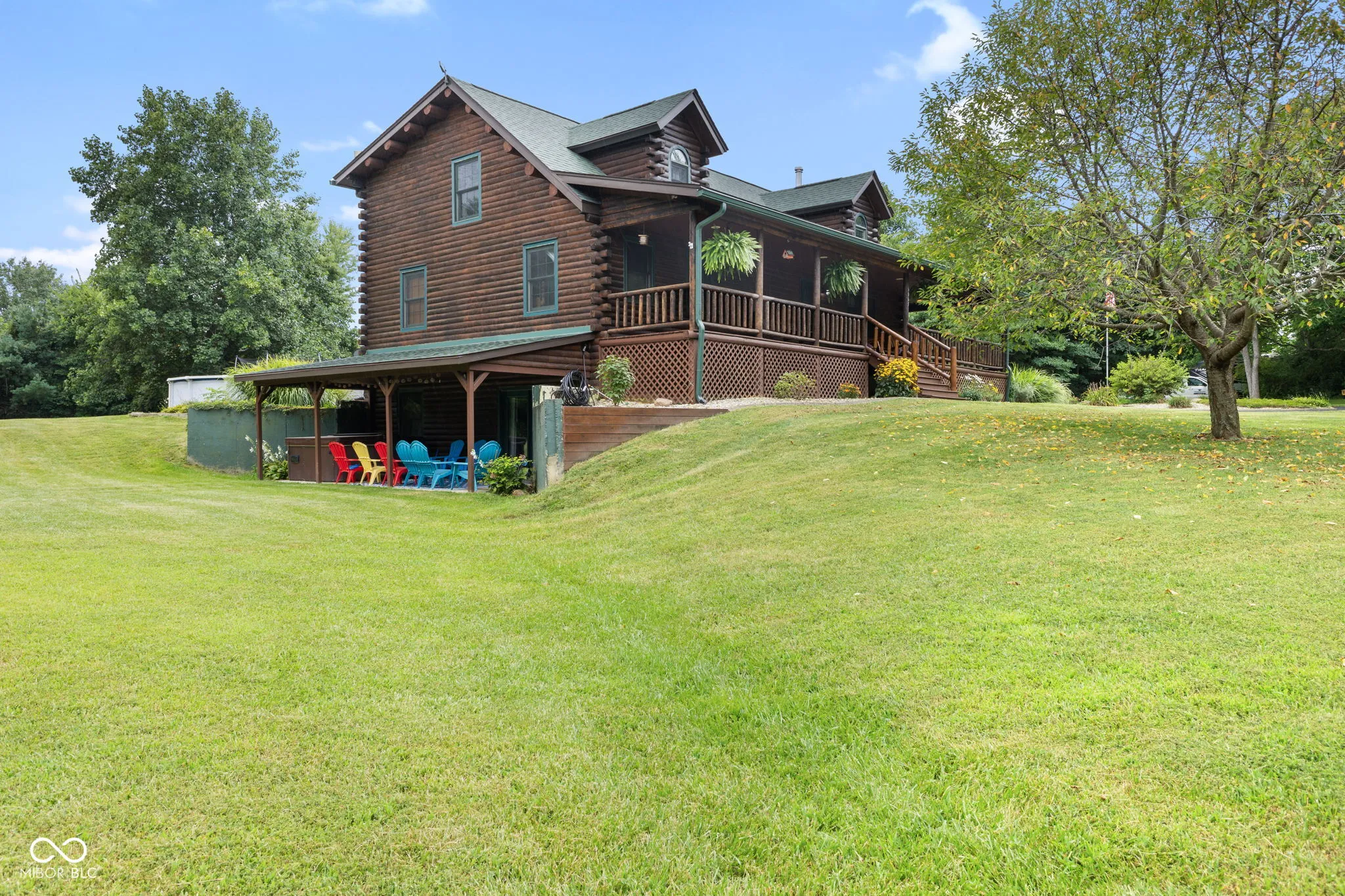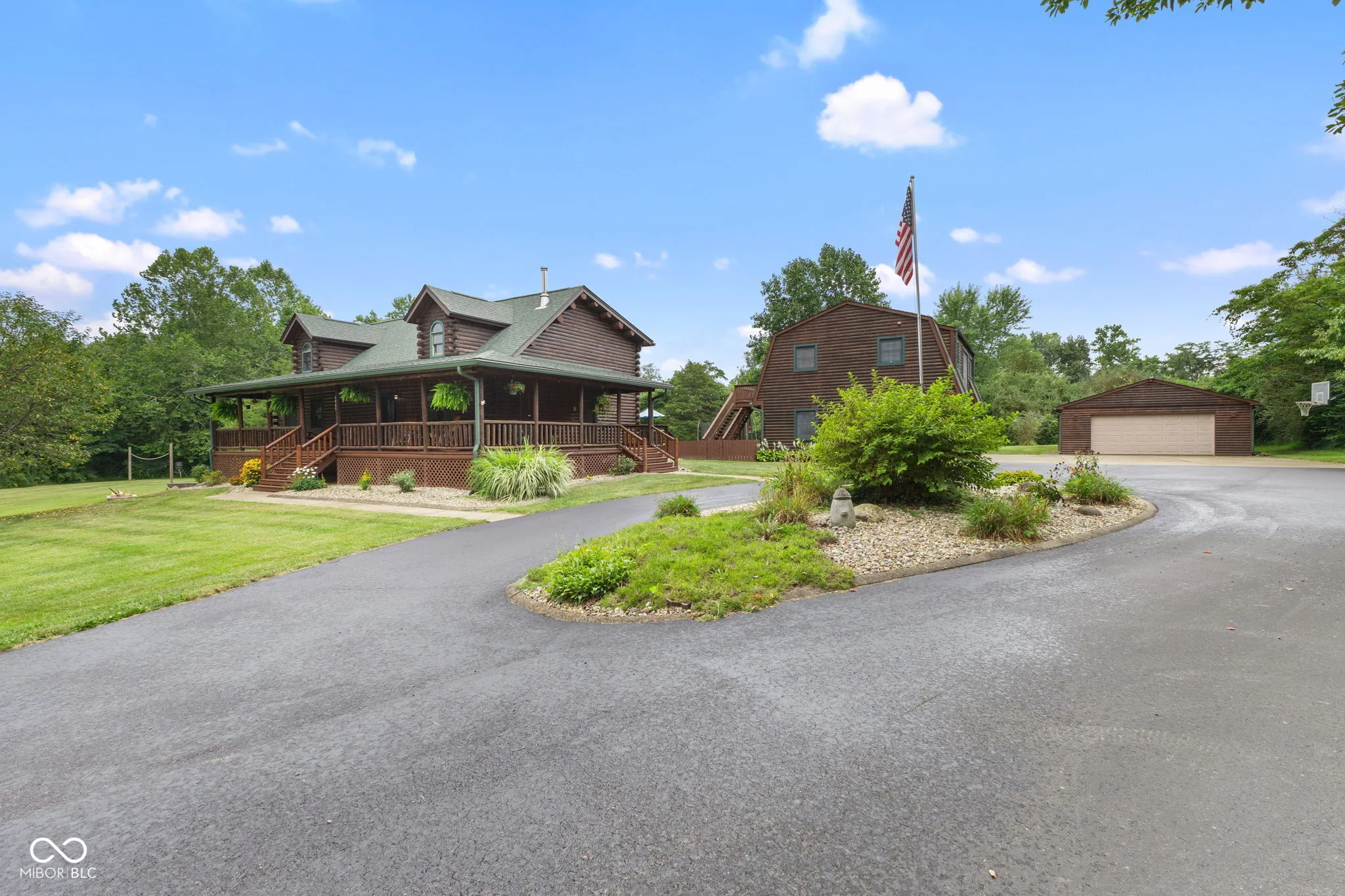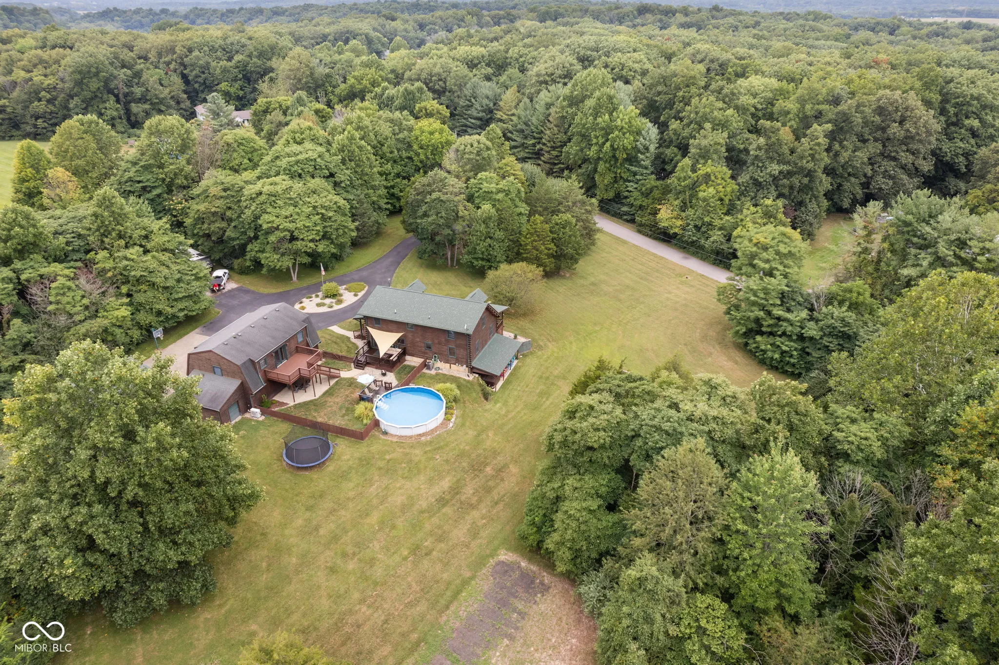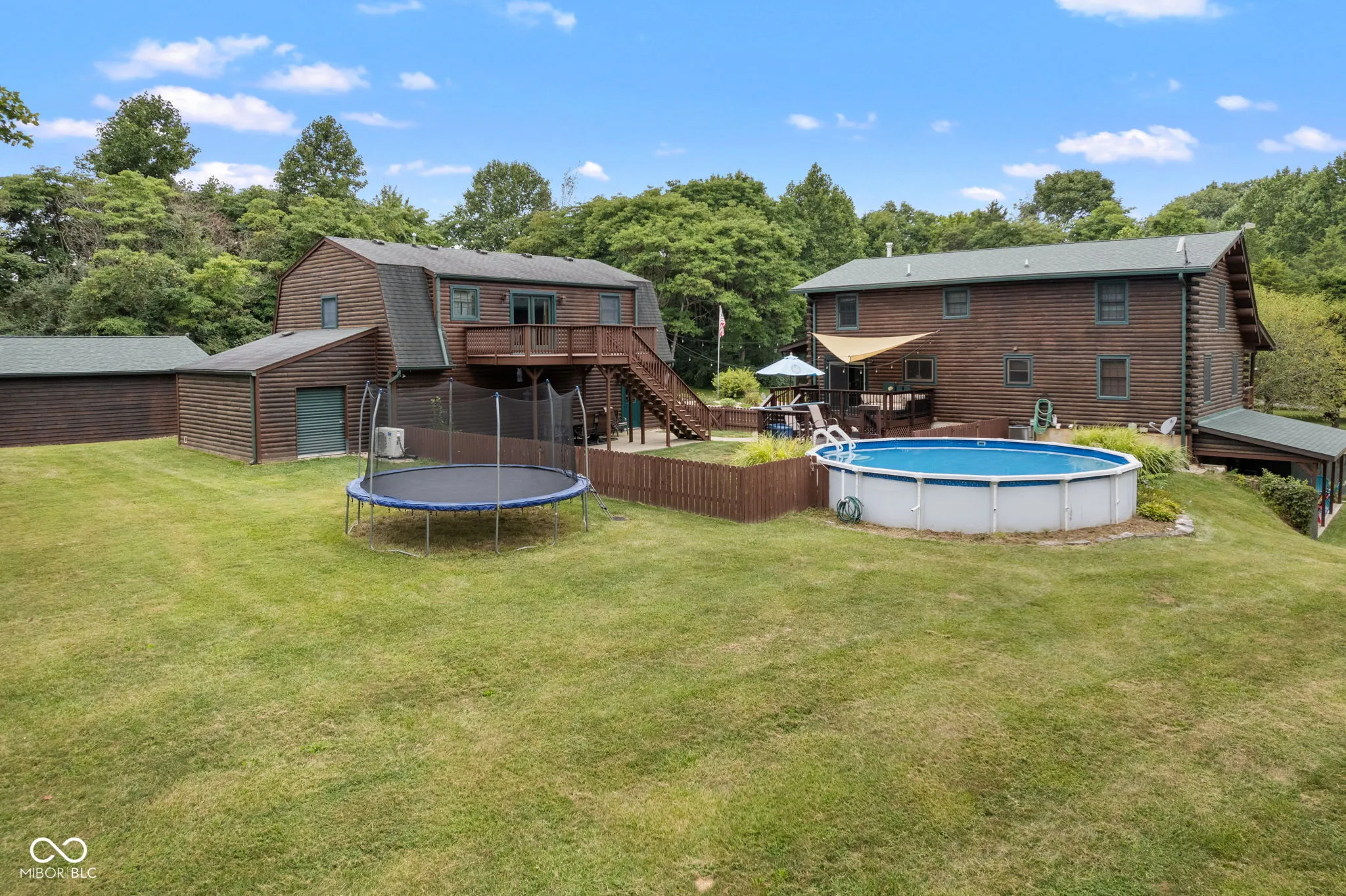 Enjoy country living in this updated modern log cabin with 5 bedrooms and 4.5 bathrooms, all spread out over 3,000 square feet. Set on 5 private acres, the home features a grand two-story living room with high ceilings and a fully finished walk-out basement with a family room, office, and rec room. Updated kitchen with granite counter tops and bamboo flooring that runs through the living room. Relax in the primary bedroom upstairs with its renovated bath, or take advantage of the two additional bedrooms on the main level. The walk-out basement offers easy access to a patio with a hot tub, where the main floor deck leads to an above-ground pool, trampoline and plenty of space, perfect for outdoor fun. There’s also a private in-law suite, over 1,000 sq. ft., above the 3-car detached garage with an open floor plan that includes 1 bedroom, 1.5 bathrooms, full kitchen, dining and living area. In-law suite also includes a deck with stairs leading to the pool and patio. With plenty of recent updates, this home combines comfort and style in a tranquil setting.