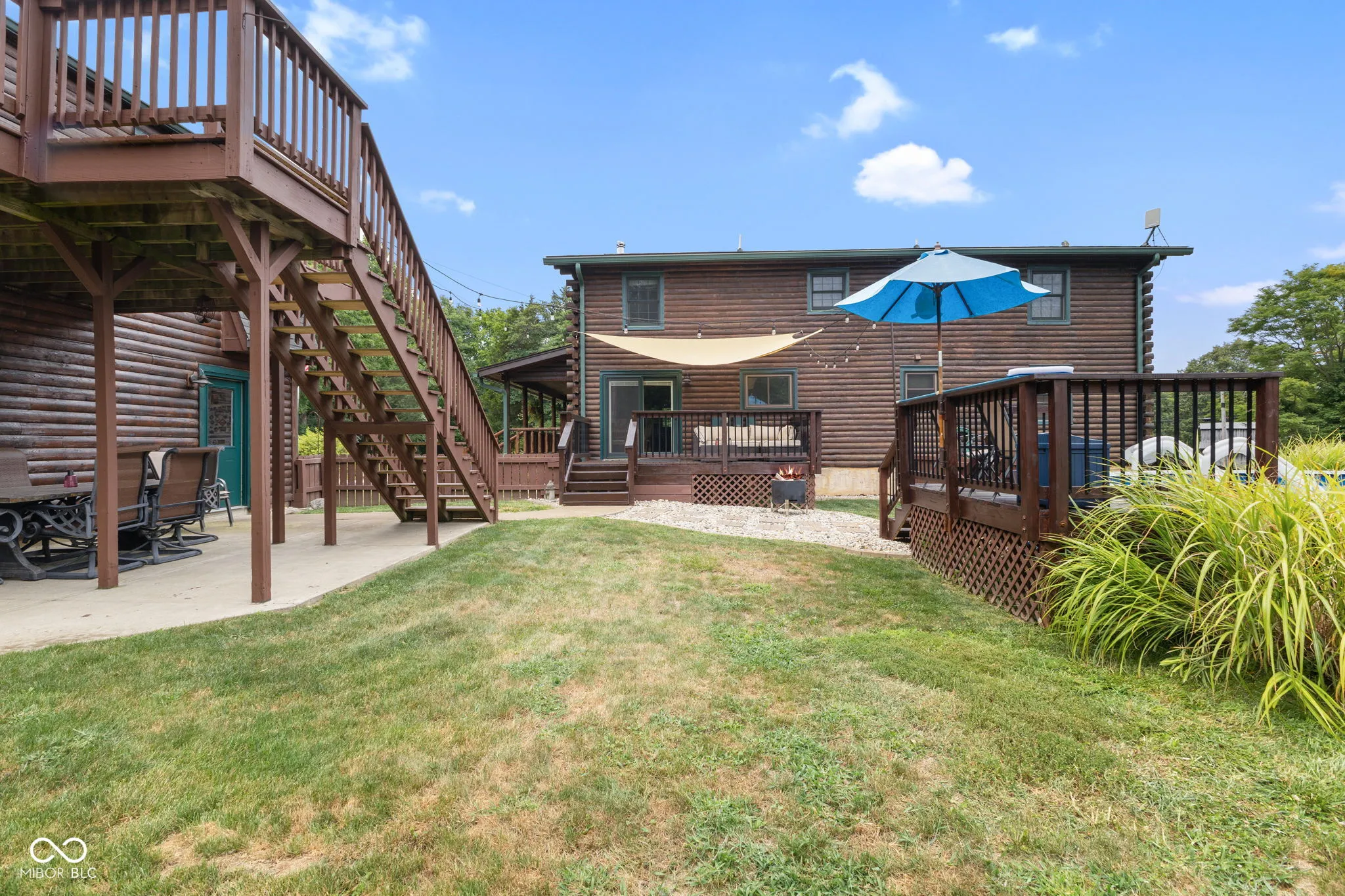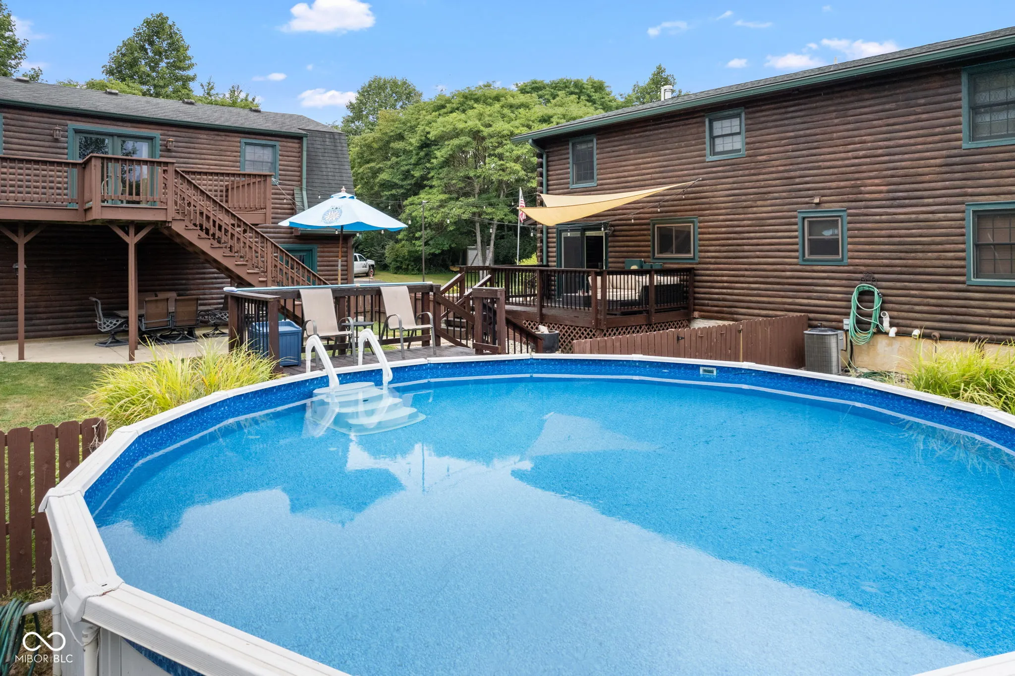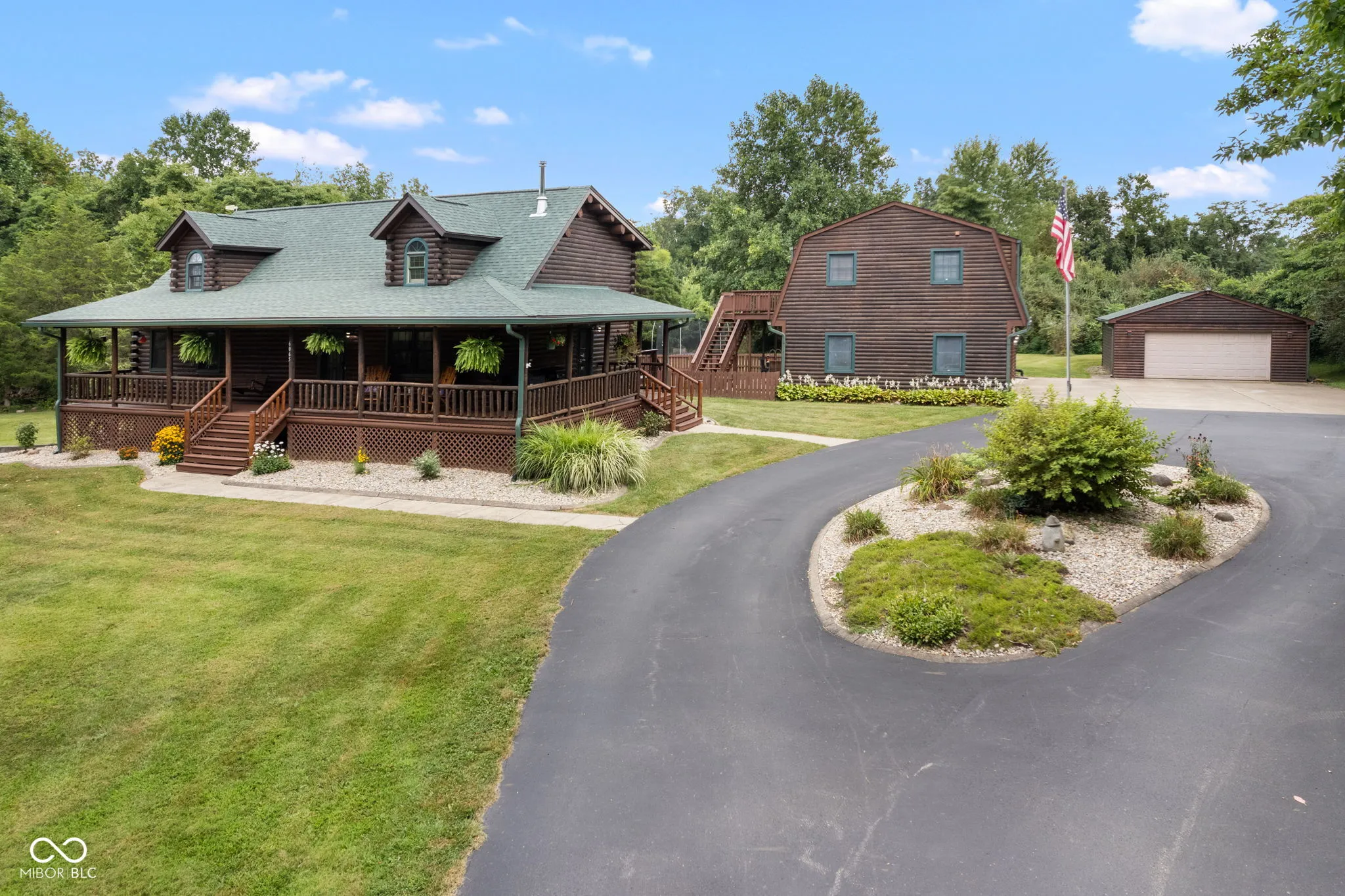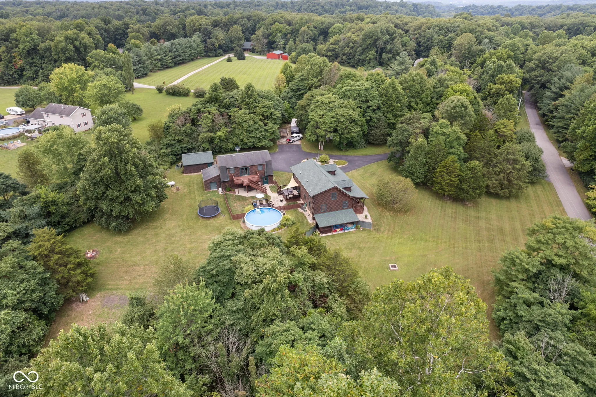 Enjoy country living in this updated modern log cabin with 5 bedrooms and 4.5 bathrooms, all spread out over 3,000 square feet. Set on 5 private acres, the home features a grand two-story living room with high ceilings and a fully finished walk-out basement with a family room, office, and rec room. Updated kitchen with granite counter tops and bamboo flooring that runs through the living room. Relax in the primary bedroom upstairs with its renovated bath, or take advantage of the two additional bedrooms on the main level. The walk-out basement offers easy access to a patio with a hot tub, where the main floor deck leads to an above-ground pool, trampoline and plenty of space, perfect for outdoor fun. There’s also a private in-law suite, over 1,000 sq. ft., above the 3-car detached garage with an open floor plan that includes 1 bedroom, 1.5 bathrooms, full kitchen, dining and living area. In-law suite also includes a deck with stairs leading to the pool and patio. With plenty of recent updates, this home combines comfort and style in a tranquil setting.