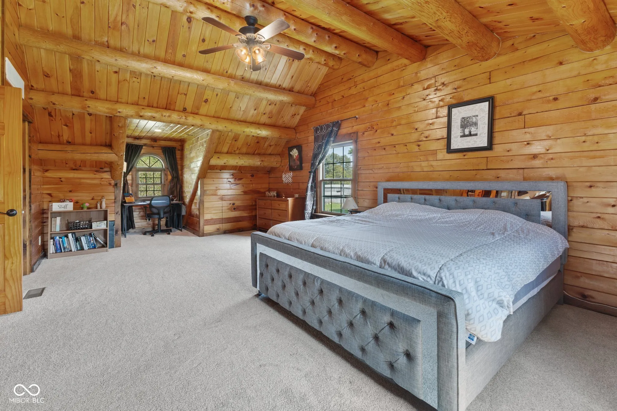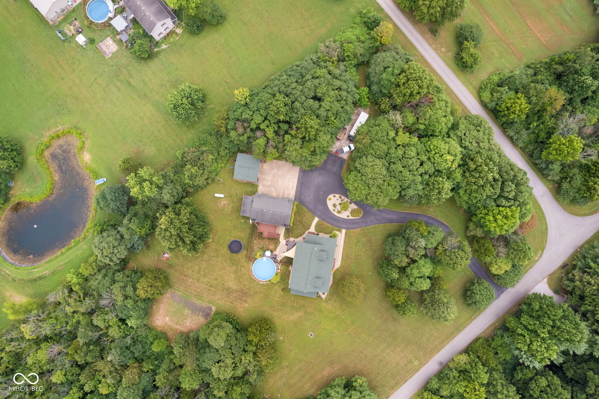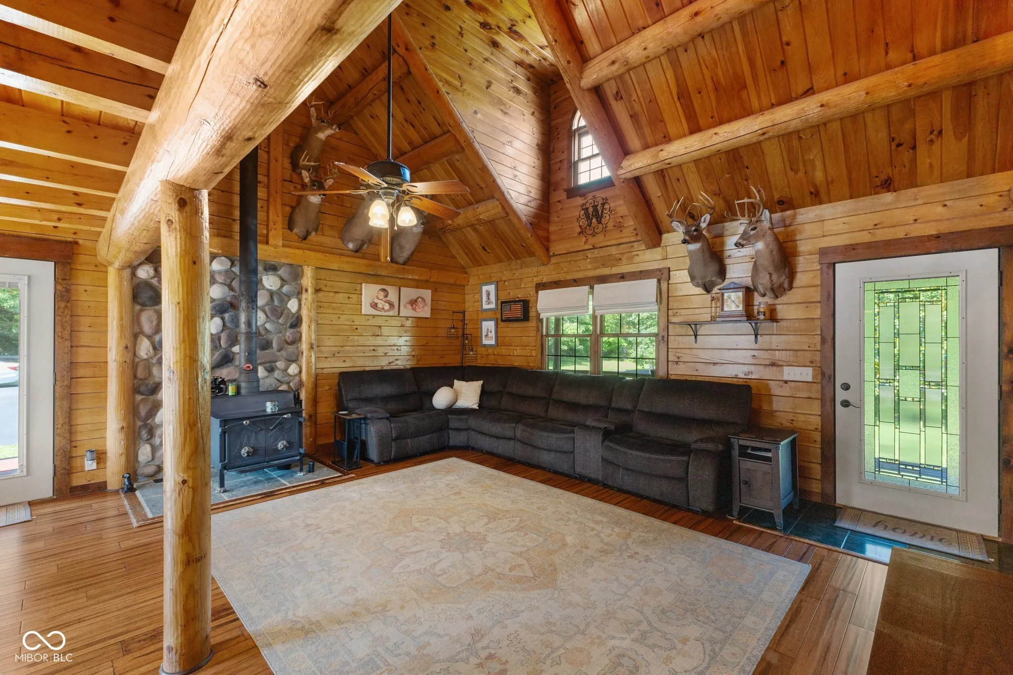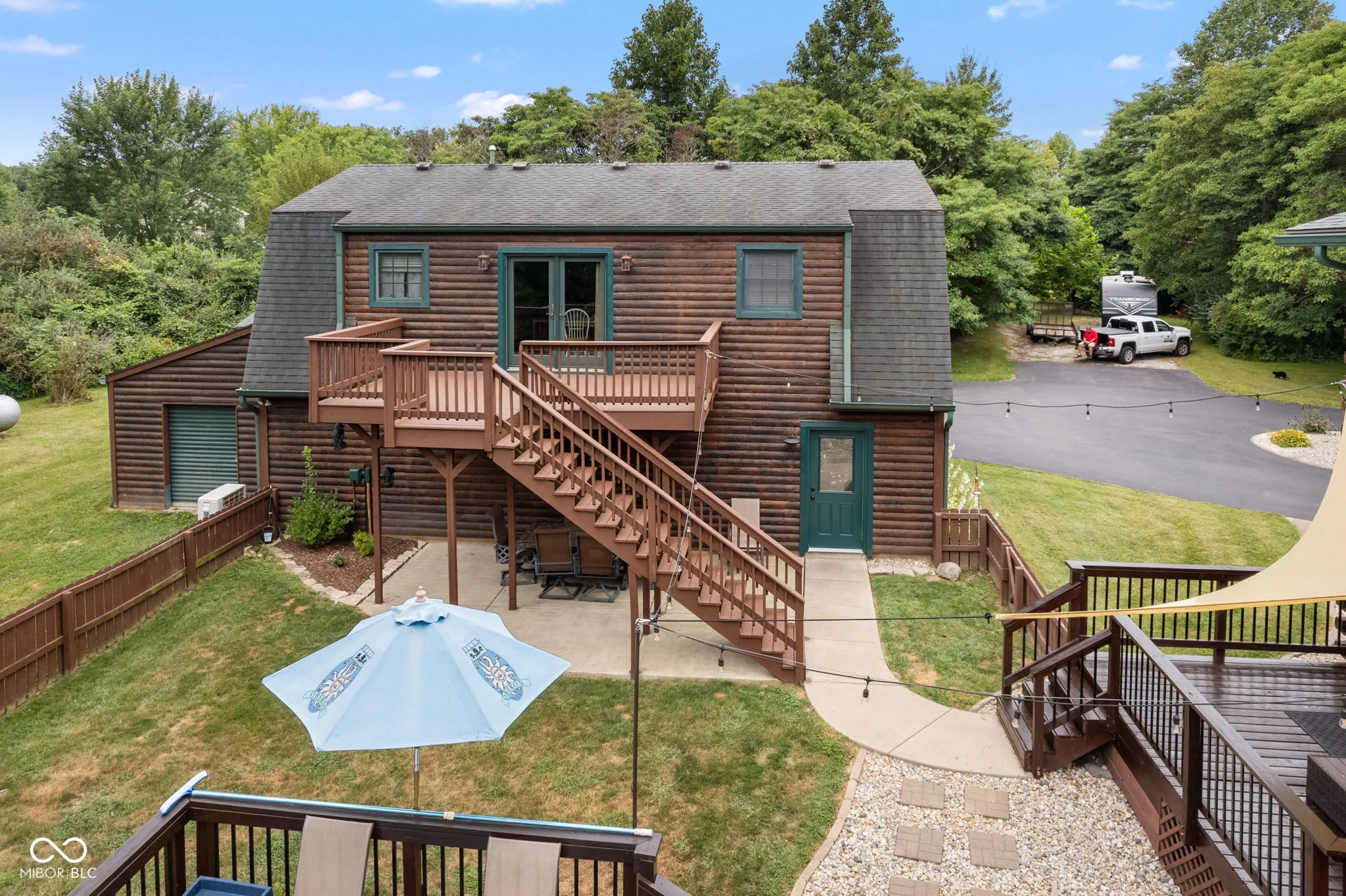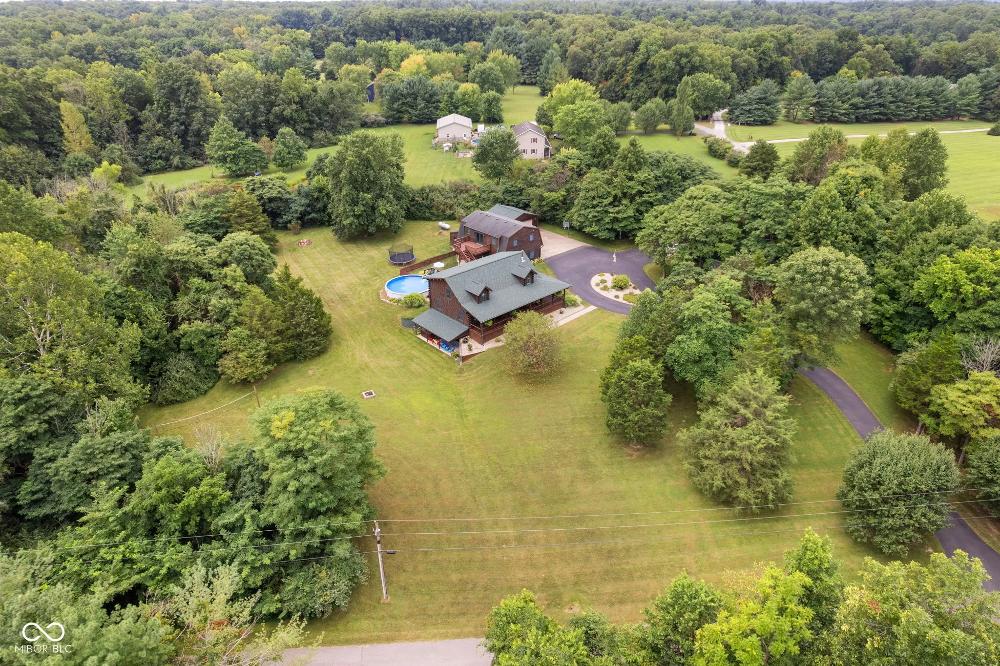 Enjoy country living in this updated modern log cabin with 5 bedrooms and 4.5 bathrooms, all spread out over 3,000 square feet. Set on 5 private acres, the home features a grand two-story living room with high ceilings and a fully finished walk-out basement with a family room, office, and rec room. Updated kitchen with granite counter tops and bamboo flooring that runs through the living room. Relax in the primary bedroom upstairs with its renovated bath, or take advantage of the two additional bedrooms on the main level. The walk-out basement offers easy access to a patio with a hot tub, where the main floor deck leads to an above-ground pool, trampoline and plenty of space, perfect for outdoor fun. There’s also a private in-law suite, over 1,000 sq. ft., above the 3-car detached garage with an open floor plan that includes 1 bedroom, 1.5 bathrooms, full kitchen, dining and living area. In-law suite also includes a deck with stairs leading to the pool and patio. With plenty of recent updates, this home combines comfort and style in a tranquil setting.
