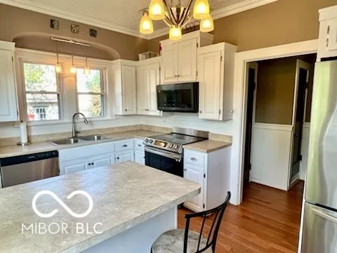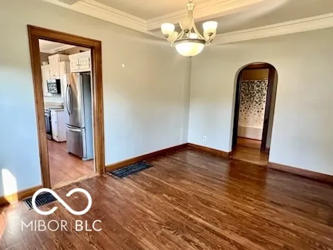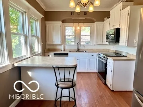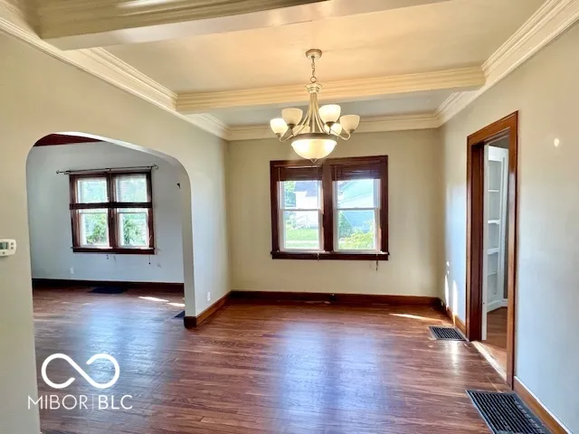 Few minutes away from Donner Park, Noblitt Park, and downtown Columbus, Franklin Street is easily accessible. Over 2000 square feet total, which includes a finished basement with a bonus room/3rd bedroom, rec room, a new full bathroom, newer vinyl windows, and plenty of room for storage. Historic features include tall ceilings, hardwood floors, archways, crown molding, and a beautiful formal dining room with a beamed ceiling. Updated 10×16 kitchen. Enjoy the outdoors with the covered front porch and open patio in the large (for downtown), privacy-fenced backyard. The modern 2-car garage (built in 2004) has electric and an overhead door opener. Newer vinyl windows throughout; convenient attic storage; all kitchen and laundry appliances remain; immediate possession.
