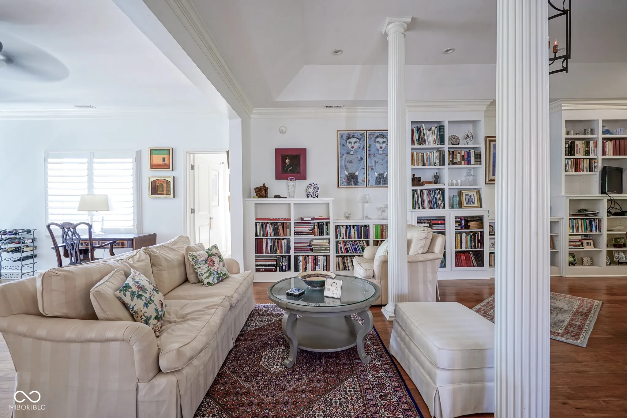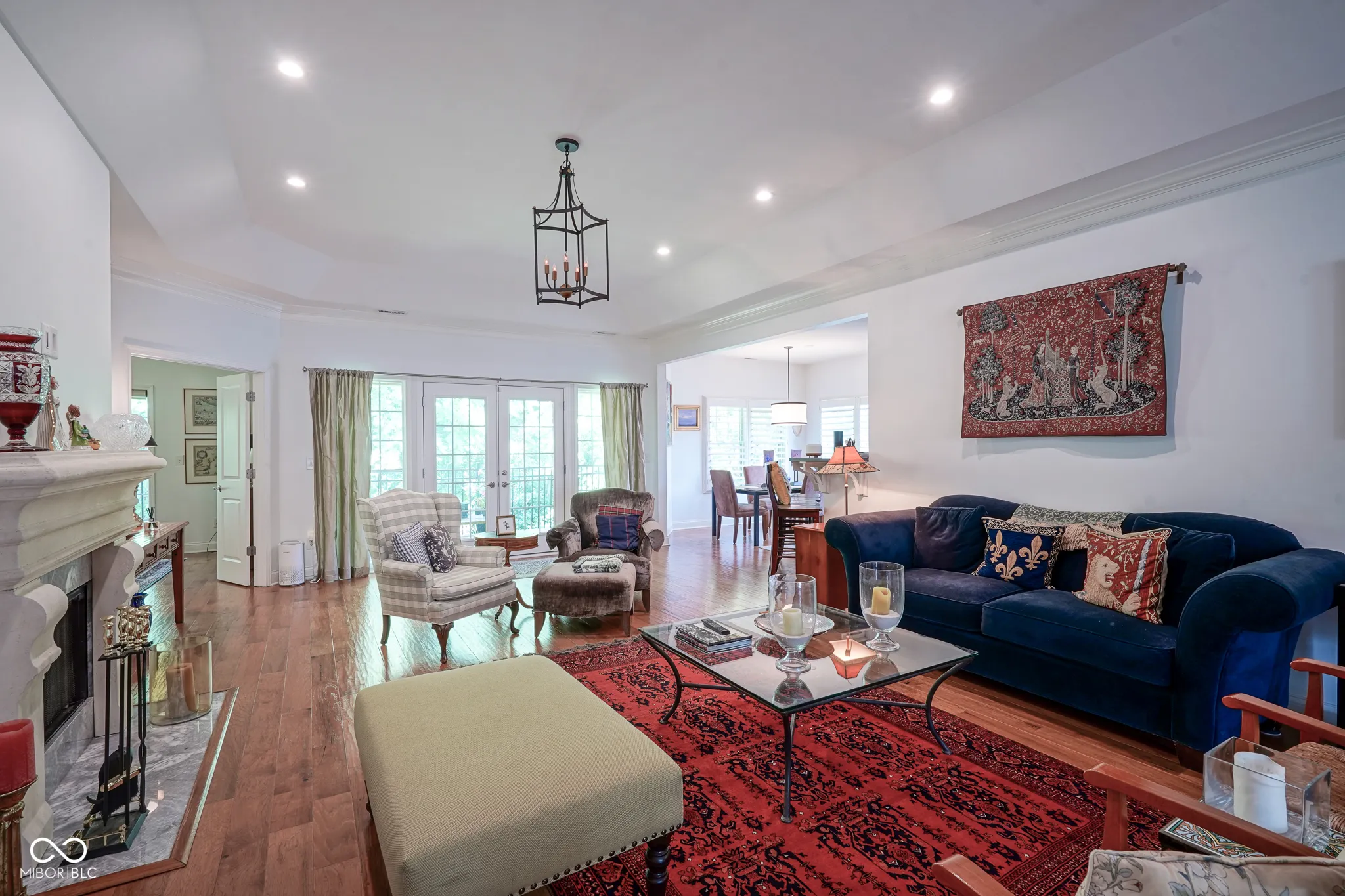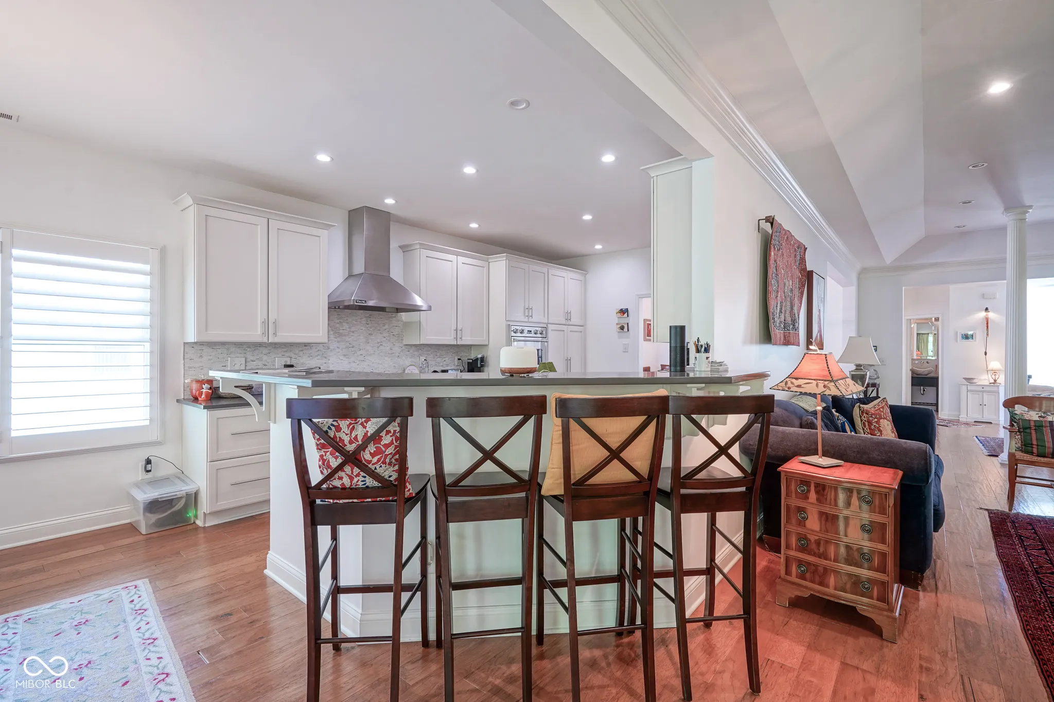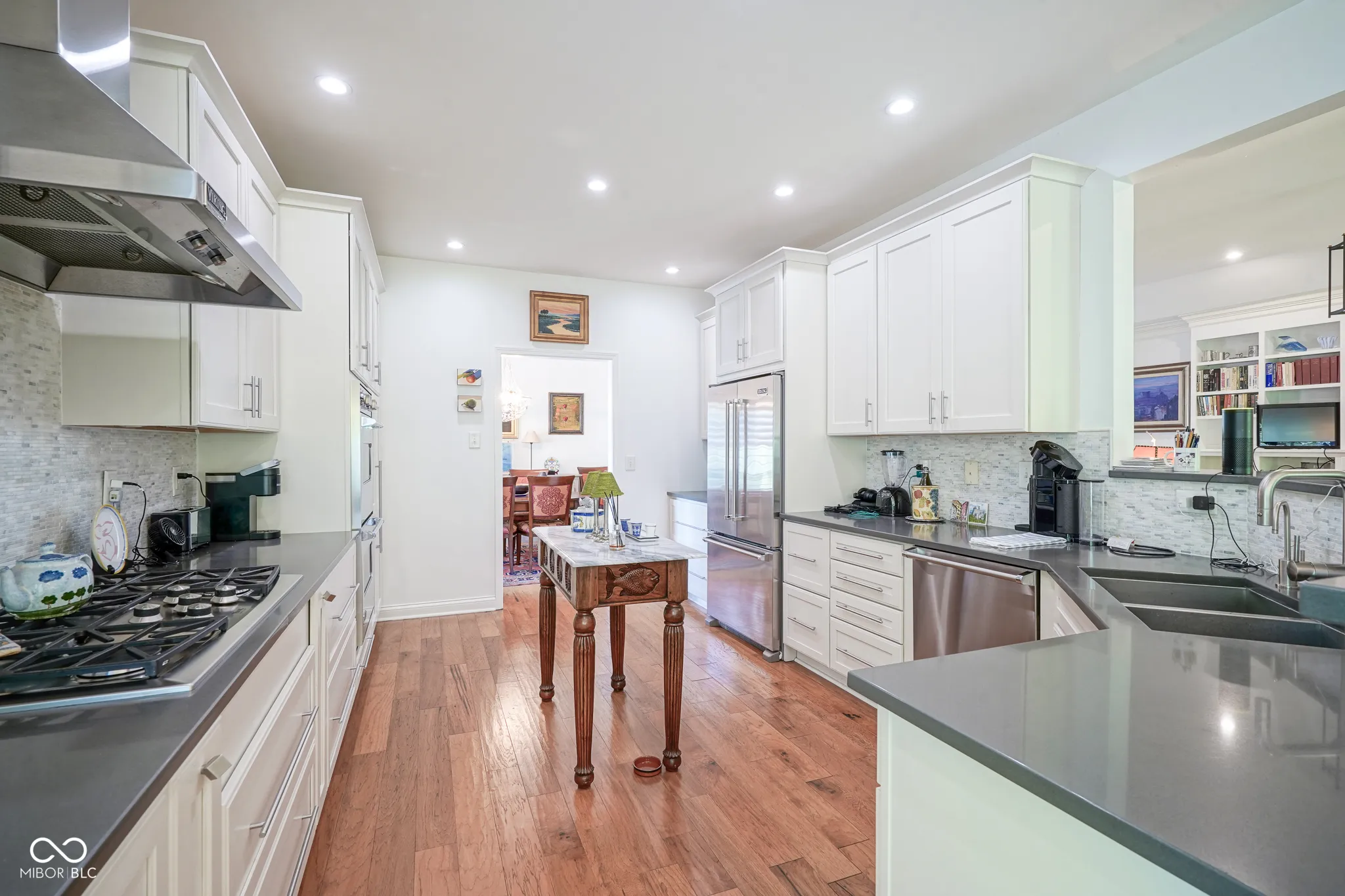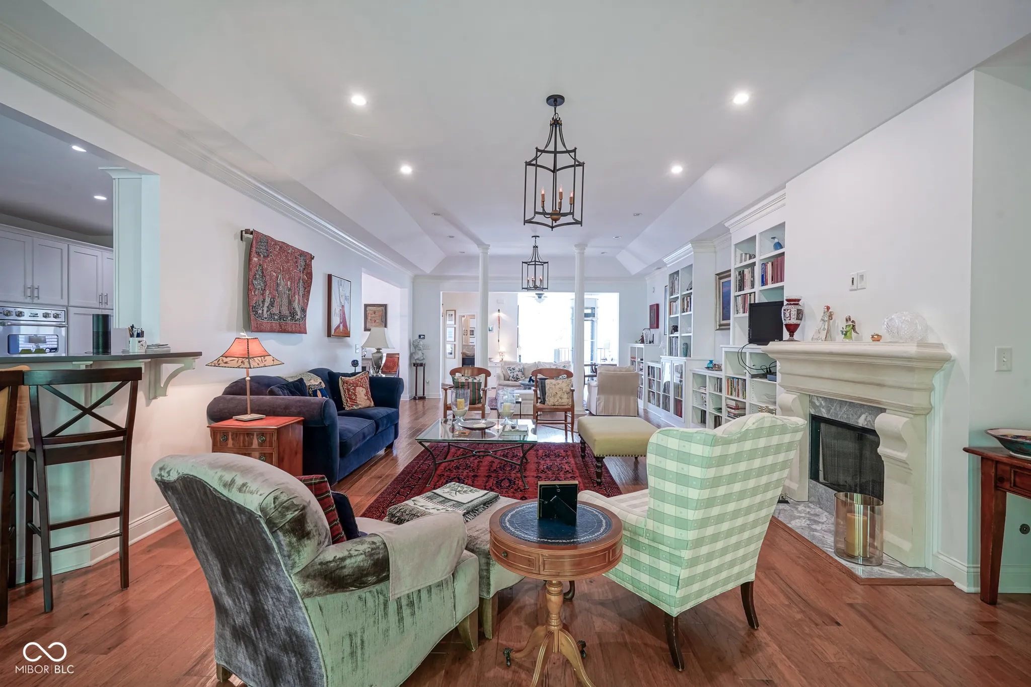 Welcome home to this beautiful condo in the desirable Woodmont neighborhood, one of Indy’s most sought-after communities on the northside! Upon entering the grand two-story foyer, either from the two-car attached garage or the front entrance, you are immediately presented with a rare, but unique, pneumatic vacuum elevator just for this unit! Enjoy this elevator, or walk up the steps, to your spacious and meticulously maintained living area. Your eyes are immediately drawn to the intricate details of the living room, such as the soaring tray ceilings, crown molding throughout, and wonderfully crafted built-ins. The custom columns allow for some room separation while still having an open feel. Notice the sprawling updated hardwood flooring, which you will find throughout the entire unit! All three bedrooms each contain their own updated ensuite bathrooms, a feature not commonly found in condos. You will love the modern-style chef’s kitchen with updated Viking appliances and plenty of counter space for cooking. On either side of the kitchen you will find a formal dining room as well as a breakfast nook/eat-in kitchen, allowing for plenty of space for guests to sit while entertaining! In warmer weather, enjoy the serene outdoors while drinking your morning coffee on the updated back patio without neighbors blocking your view of the mature trees. In the colder months, cozy up by the French chateau-style custom fireplace hearth that will warm the room. While retreating to the primary suite, notice the Juliette balcony, allowing for fresh air and more views of the large mature trees behind the condo. You will also find double sinks, a large walk-in shower, and dual closets all a part of the primary bedroom ensuite. Recent updates include: new HVAC (2024), new washer and dryer (2024), new water softener (2023). There is lots of parking available for guests, which is an added feature to living in this low-maintenance community. Come check out this condo today!