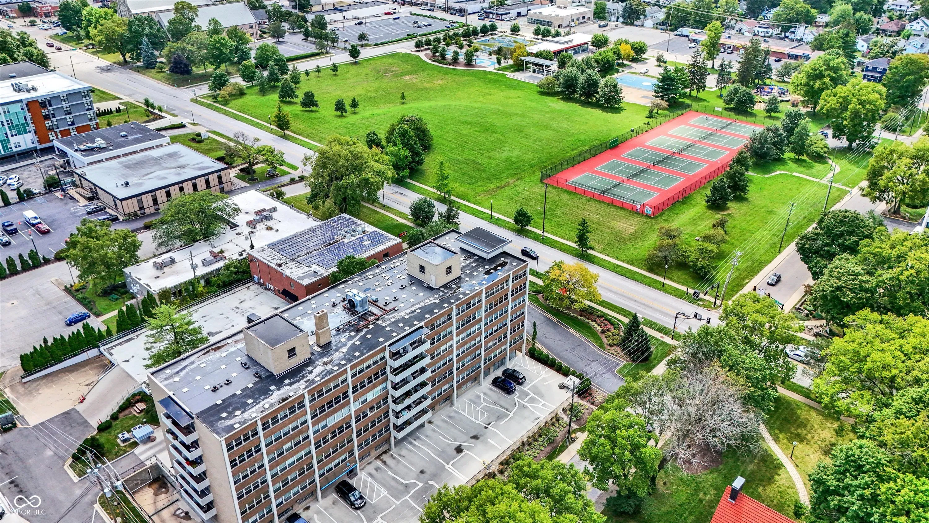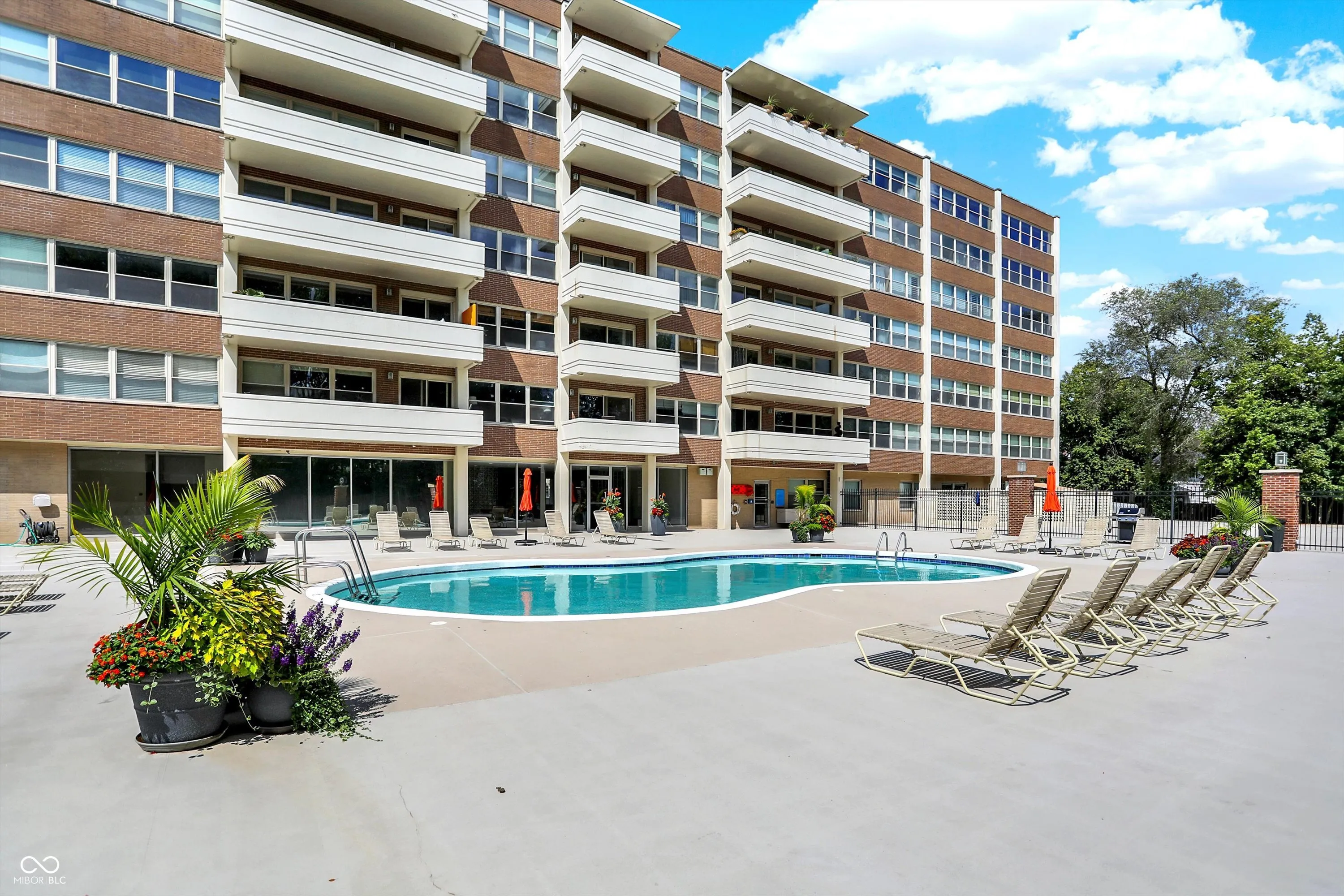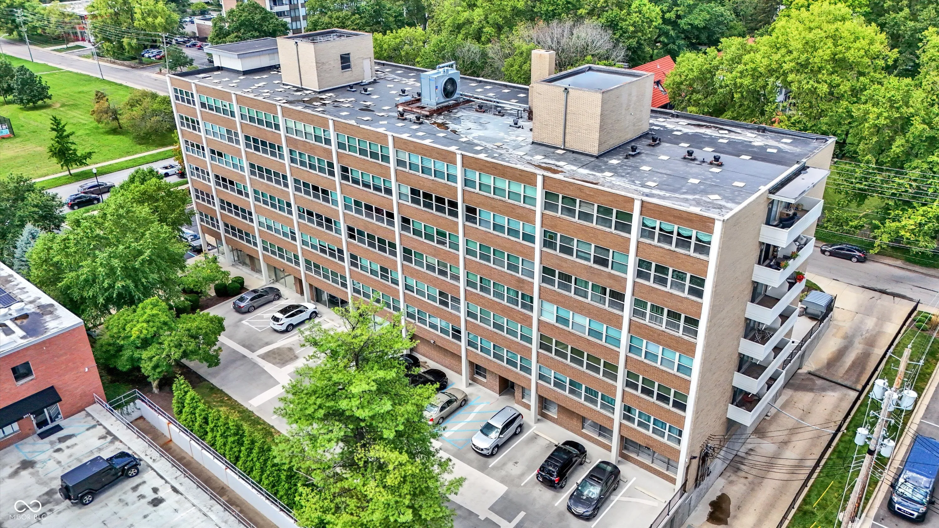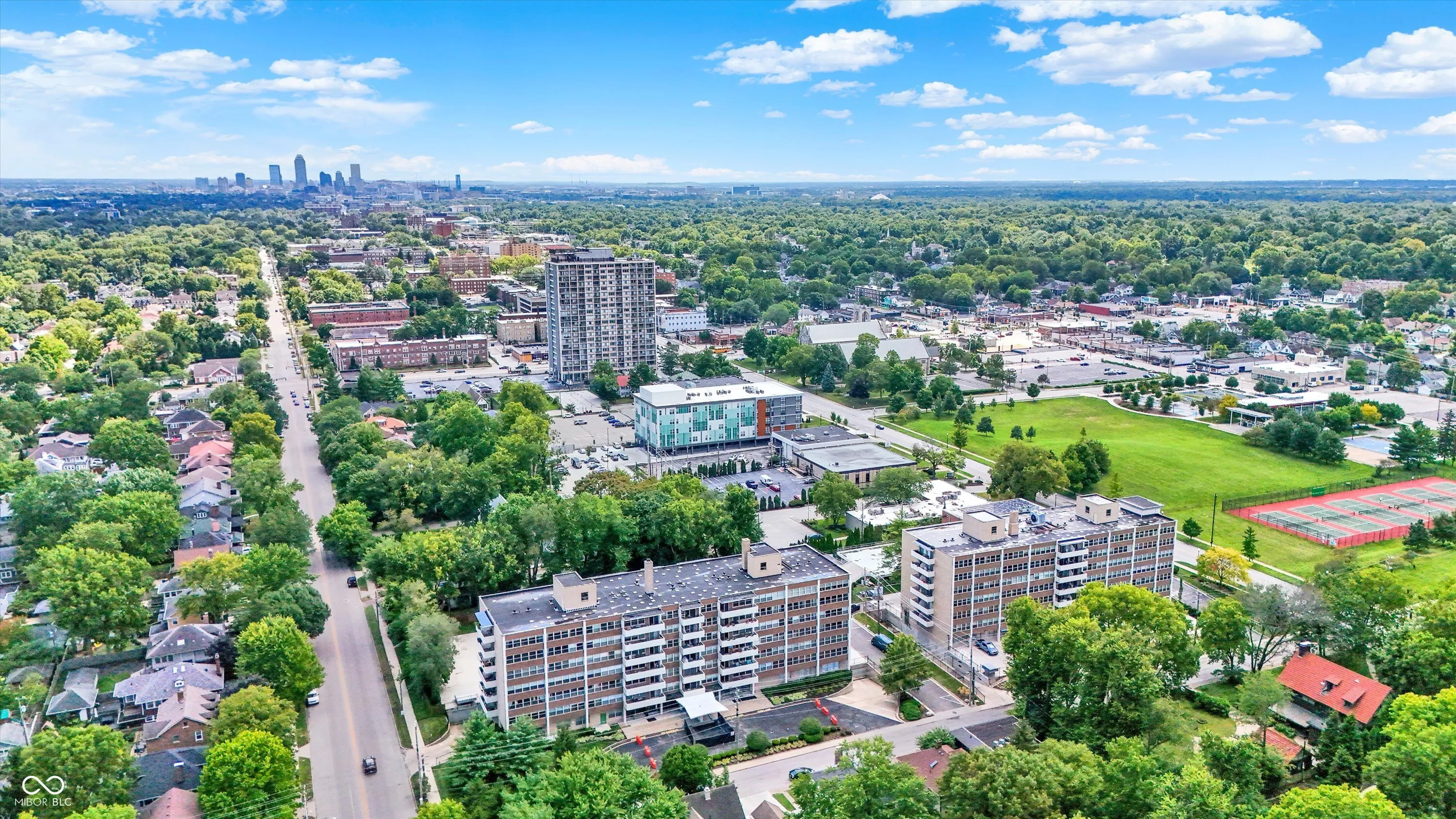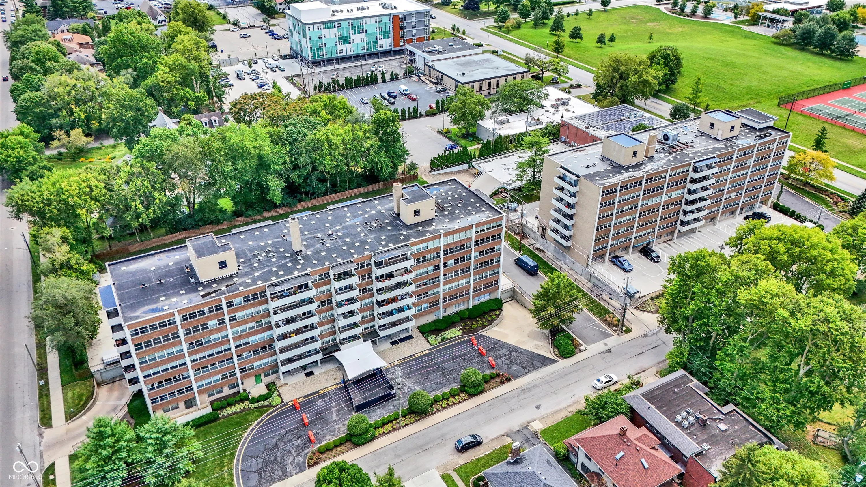Enjoy the convenience of Mid-town living at The Modern Condos in Meridian-Kessler! When you enter the building you’ll love the sleek retro lobby. This charming 2 bed 2 bath corner unit, freshly painted condo features both west and south facing views, a balcony, and large, open floor plan! The kitchen features solid wood cabinets and Corian countertops. The kitchen also receives a lot of natural light from the west facing doors that lead to the balcony. Beautiful views of the park and tennis courts across the street. Enjoy the convenience of a primary suite plus a second bedroom and full bath. One of the unique things about this particular condo is that it has TWO parking spaces in the garage! You’ll also have additional storage on the lower level. Enjoy the amenities of the fitness center and swimming pool as well! Heat, air conditioning, and water are ALL included in your monthly HOA! This central location is just a short car ride to downtown or the north side! Also close to Butler University, The IMA, and The Virginia B. Fairbanks Art & Nature Park.