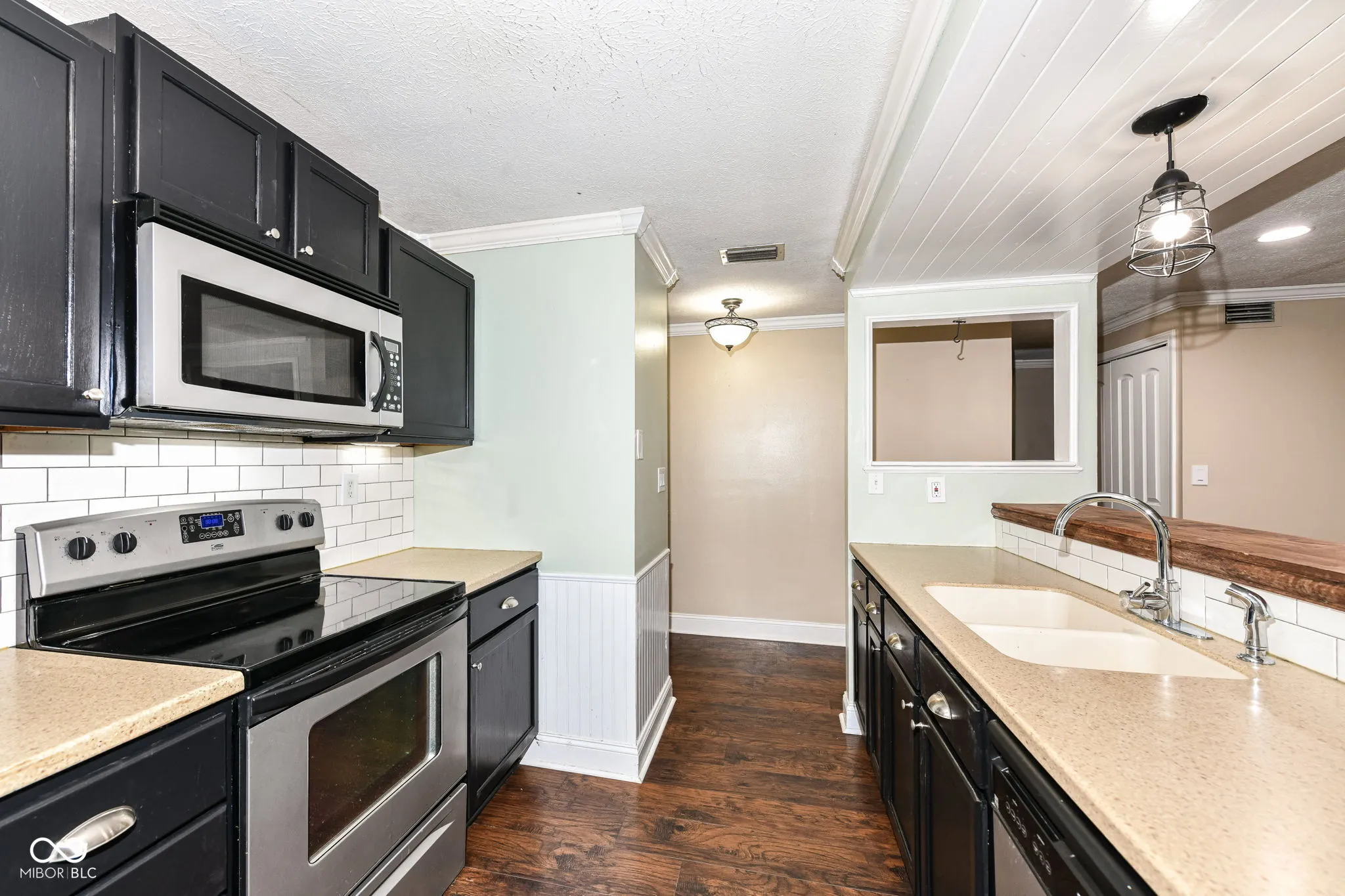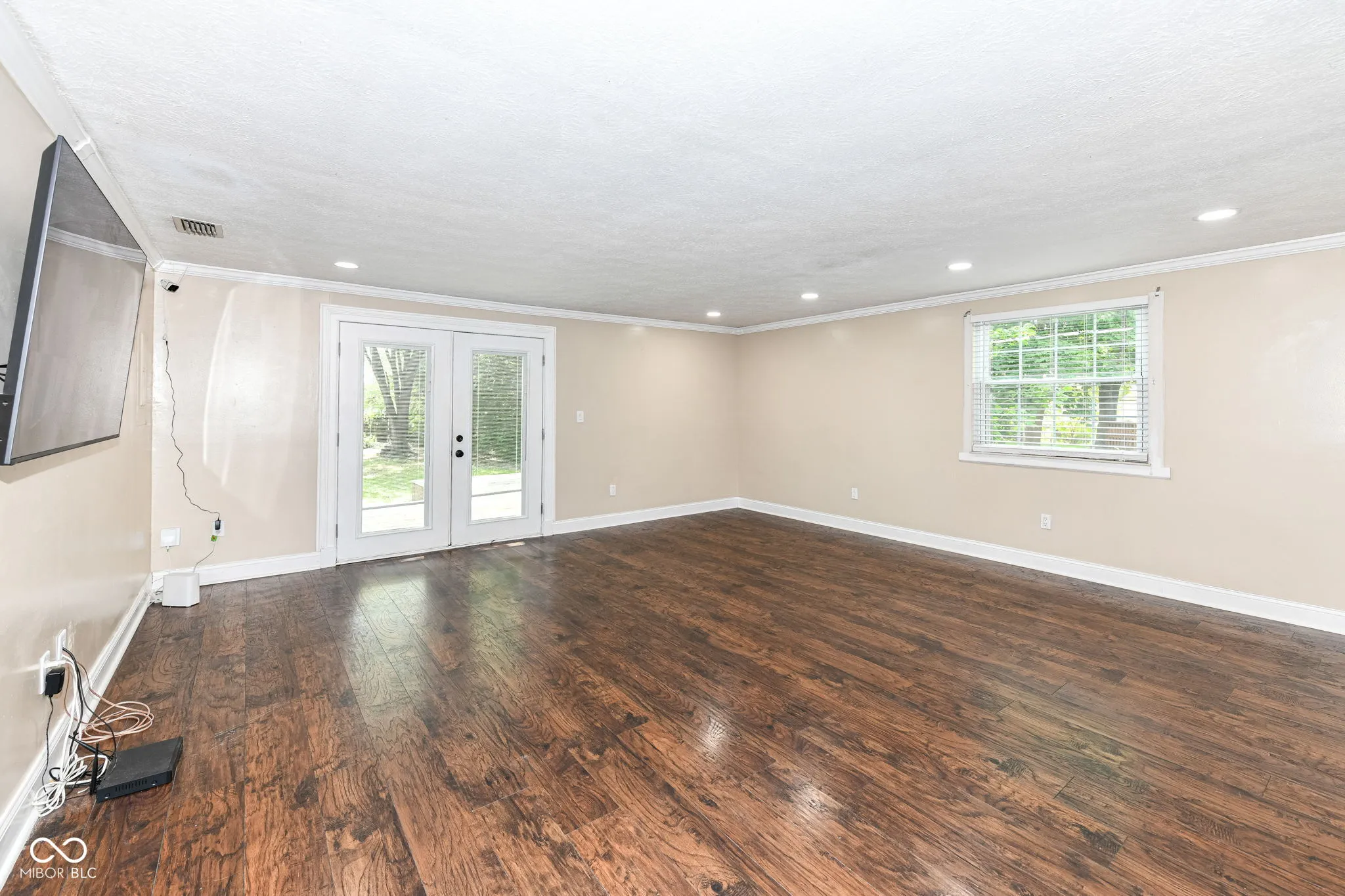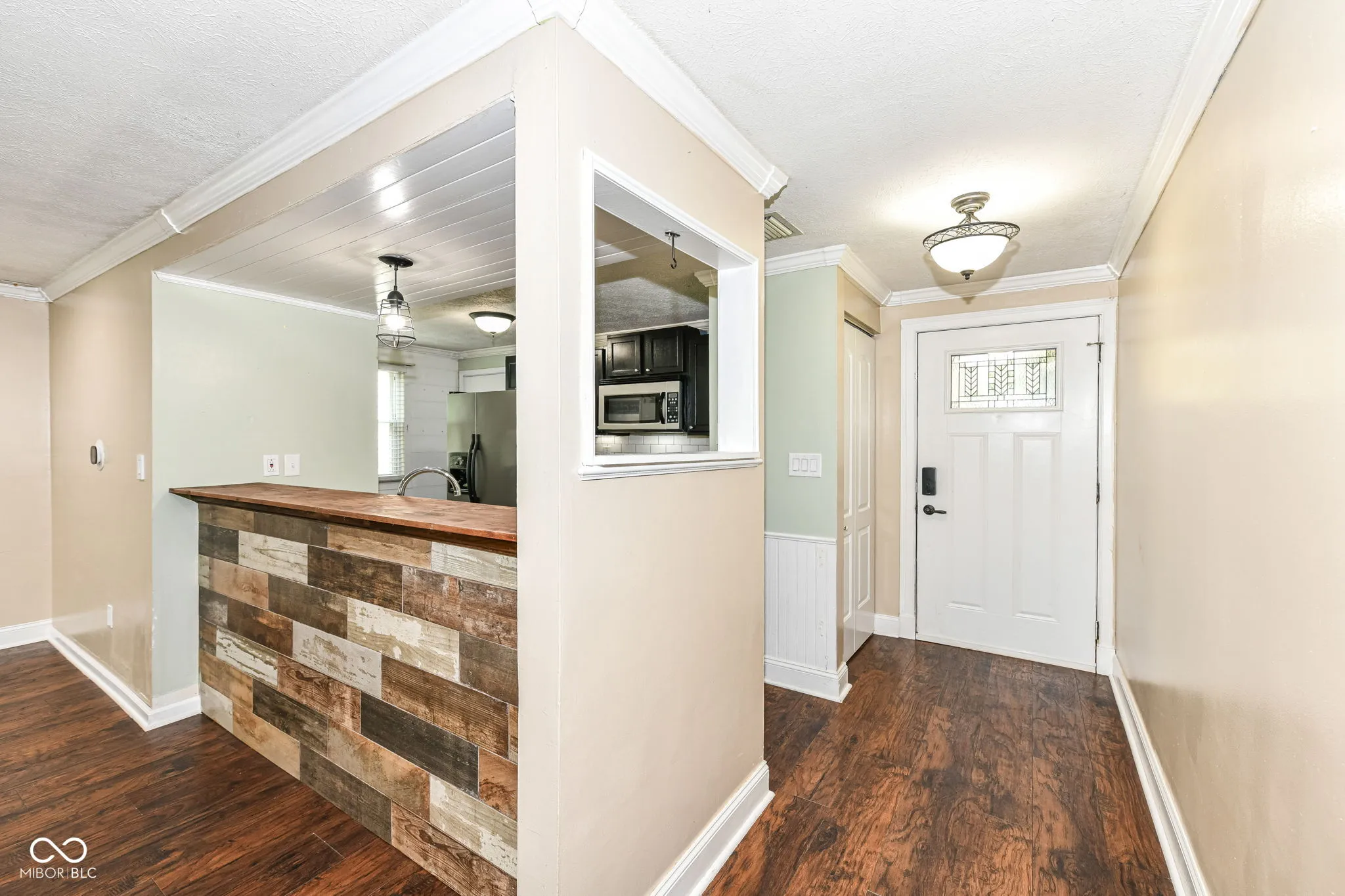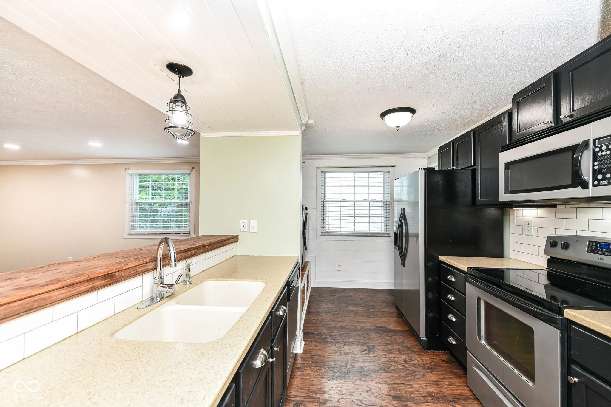Welcome home to this completely updated ranch home. An open floor plan boasts beautiful dark wood laminate flooring throughout with a convenient peek-a-boo opening from the kitchen to the great room. The expansive great room is the perfect spot for entertaining with built in surround sound, dimmable recessed theatre lighting and mounted 65″ Vizio Smart TV. The home has a huge fenced in back yard with mature trees, perfect for entertaining or relaxing on the large wood deck. This home boasts a smart thermostat, smart front door deadbolt and a home security camera system that can be viewed on the living room TV or your phone! The bathroom has been recently updated and includes new subway tile in the shower. The kitchen has also been updated with Corian counter tops and all appliances are included.