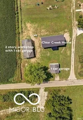 This charming 2-year-old Clear Creek home combines modern farmhouse decor with the tranquility of country living on 5.25 acres. There is a 2 story studio with a large garage on the property that would be perfect as an office, woodworking shop or painting studio. Featuring 1,600 square feet of living space over a 1,600-square-foot nearly finished basement, it offers endless possibilities for customization. The main level is upgraded with 9-foot ceilings, adding a sense of spaciousness throughout. The heart of the home is the beautifully appointed kitchen and living room, designed as the central gathering space. The home boasts new mirrors, light fixtures, and a brand-new front porch with metal-wrapped posts. Enjoy creek stomping and fireflies in the warmer months and stunning fall views in the backyard. The property includes two garden plots, a detached garage, an outbuilding with a large garage, and a two-story studio. High-speed fiber internet is available! Located just an hour from downtown Indianapolis, 45 minutes from IU Bloomington, and 30 minutes from DePauw University, this home perfectly balances rural tranquility with accessibility to city conveniences.