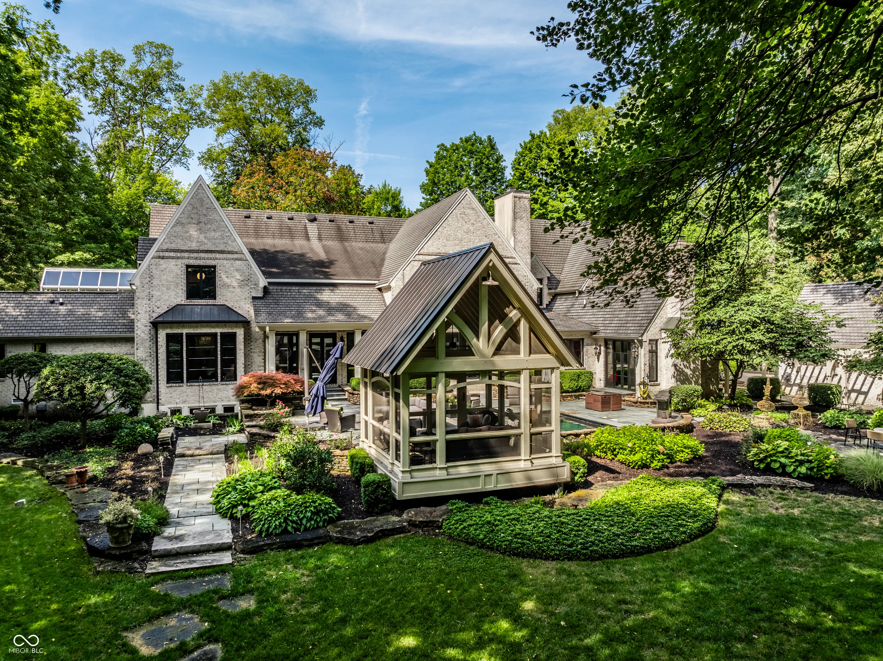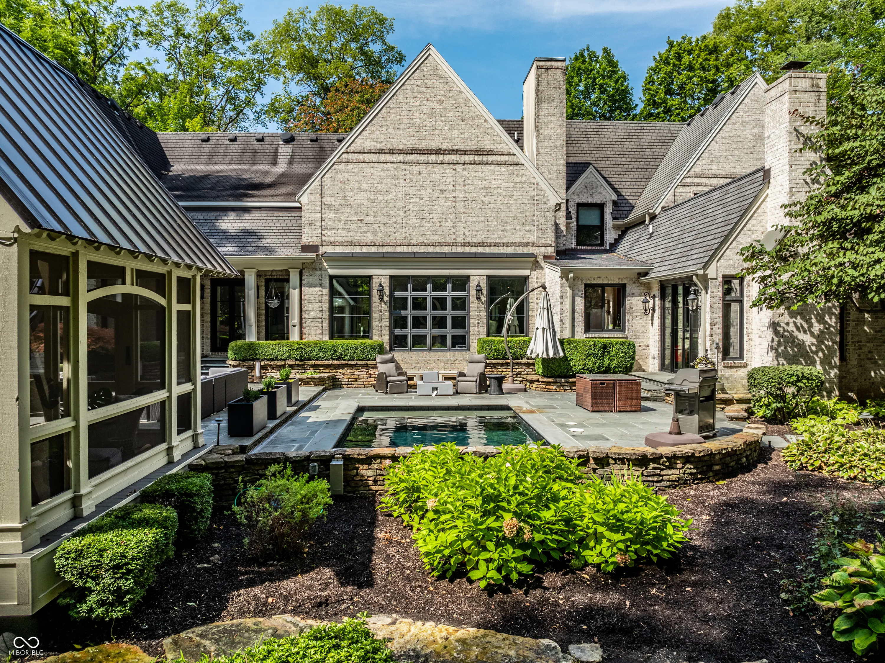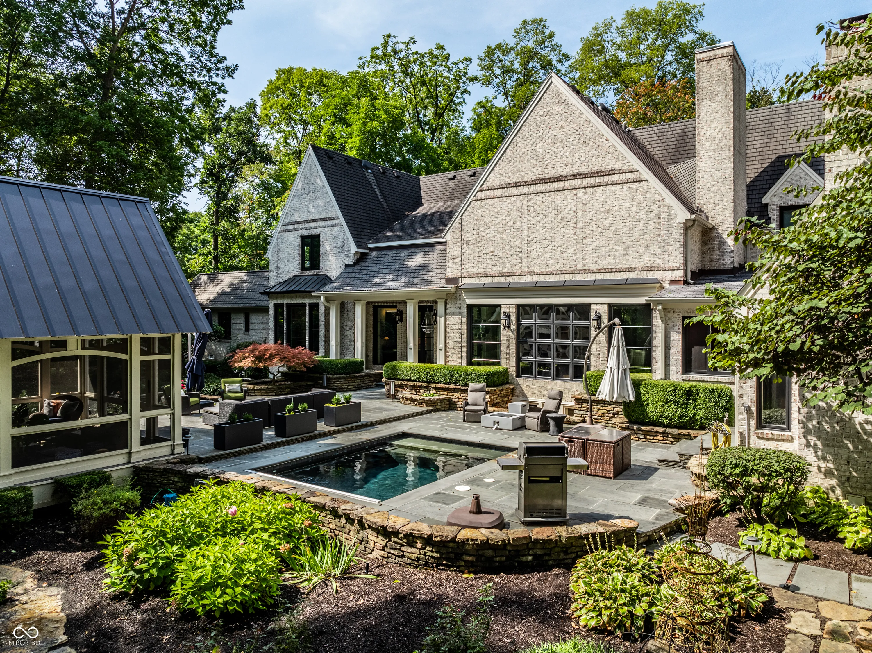 Nestled in a beautiful, 1.3 acre park-like setting, this exquisite residence is a masterpiece of style and sophistication, seamlessly integrating indoor and outdoor living. The backyard is a true entertainer’s haven, featuring a plunge pool, charming gazebo, and cozy firepit! Step into the grand 2-story entrance and be welcomed by an open floor plan that flows seamlessly into the formal dining room, bathed in natural light from a stunning barrel-vaulted ceiling, floor-to-ceiling windows with access to the outdoor living space. The sleek kitchen boasts double islands, a Wolff Oven, Sub-Zero fridge, a 6-burner gas cooktop with griddle, and a breakfast nook. The living room impresses with wall-to-wall windows and a modern copper fireplace, while the family room offers a walkout to the outdoor space, a fireplace, and vaulted ceilings. The main floor primary suite features breathtaking yard views, abundant built-ins, and separate dual bathrooms with custom walk-in closets. One side includes a skylight, soaking tub, and spacious walk-in closet with custom features, while the other side offers a rain shower and custom cabinetry. Upstairs, find 4 additional bedrooms and 3 full bathrooms. The lower level offers every amenity imaginable with a theater room, rec room, exercise space, spa room, and wet bar-perfect for leisure and entertainment! This dream home truly has it all.
