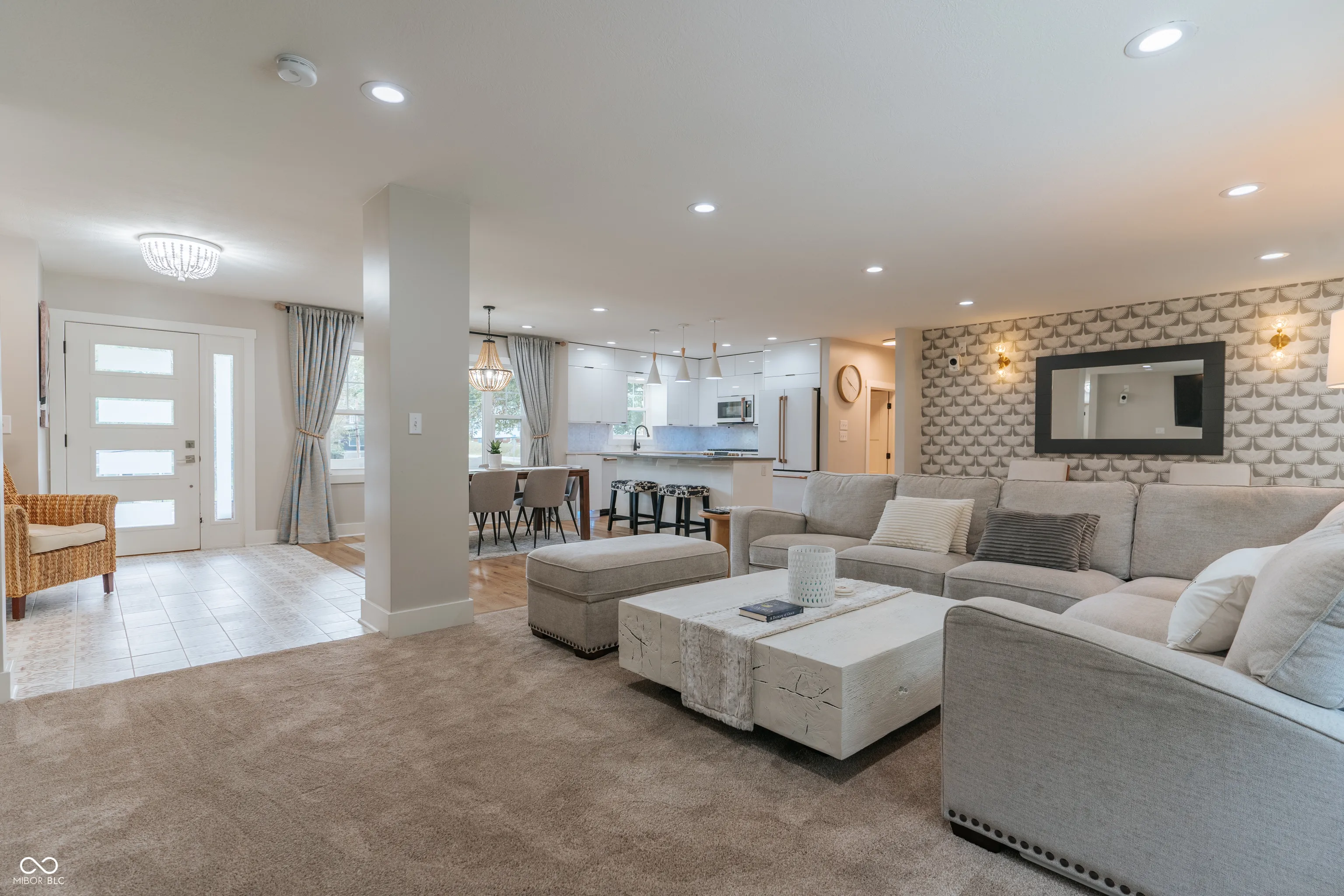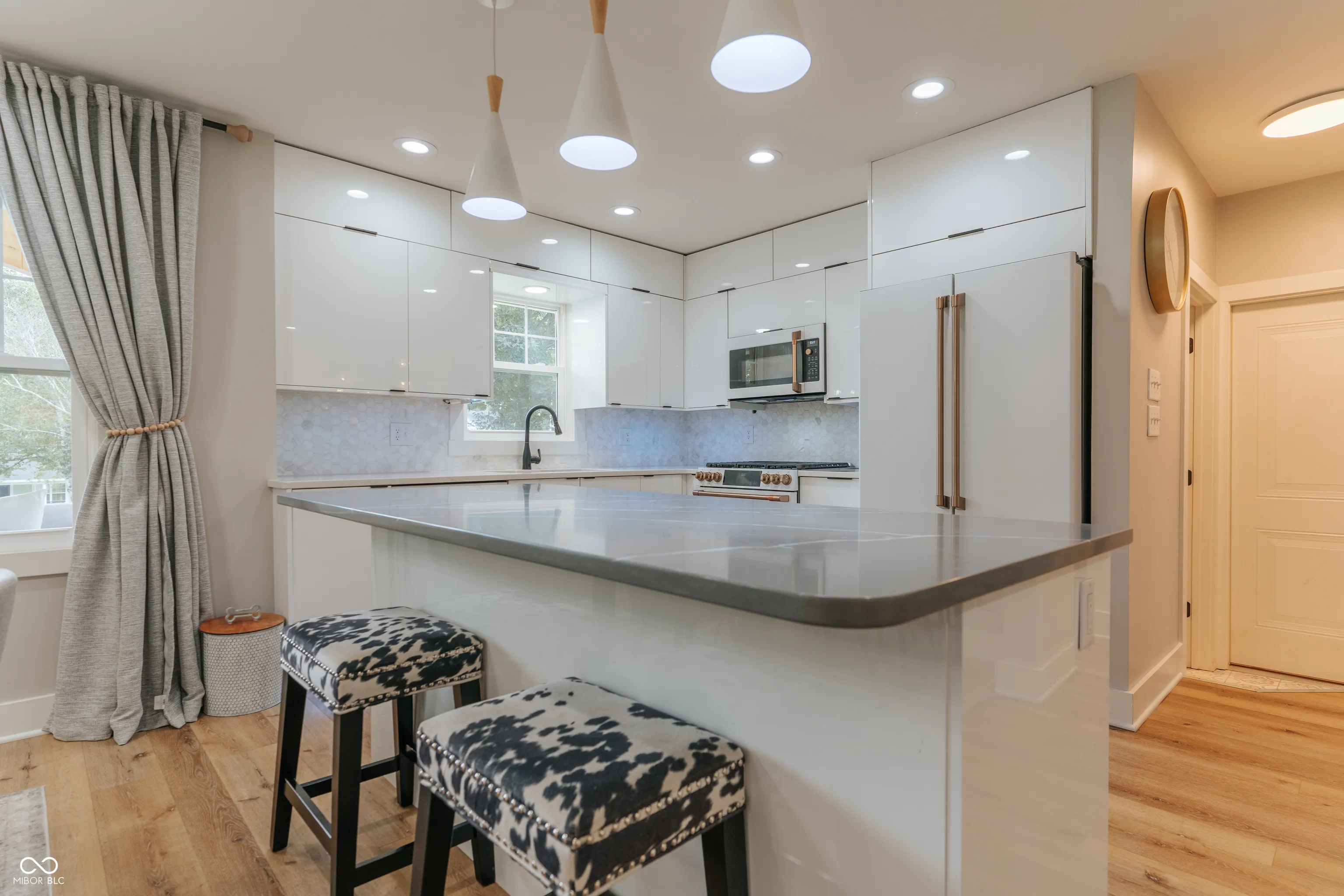 Majestic sprawling ranch home on nearly two acres in town with the perfect balance of privacy and convenience. One of a kind property completely remodeled featuring an open floor plan, two gas fireplaces and a full, partially-finished basement with huge rec room, workshop and wet bar. On the main level, you’ll find three bright bedrooms and two custom full bathrooms plus a third full bath in the basement. The primary suite is a utopia complete with a huge walk-in tile shower, tall modern soaking tub, double marble vanity and full-size laundry in the giant closet with custom shelves and built-in drawers. The kitchen is modern and open with quartz countertops, island with seating and matte white GE Cafe appliances including convection oven and microwave. The garage is an extra extra wide two car with rear load providing privacy. Pristine, mature landscaping and a panoramic lawn that is a work of art. Enjoy a fire in the fire pit and relax in your Royal Spa hot tub in the private, wooded park-like setting. It’s a perfect location that’s walking distance to all town parks, Blanton Woods Nature Preserve, Danville square restaurants and more. This home is truly move-in ready as gutters have been cleaned, trees trimmed, lawn sprayed, carpets cleaned and all concrete and sidewalks power washed. Improvements completed in the past 4 years include (all new): roof, gutters, all concrete, HVAC system, front porch, insulation in attic, driveway sealed, hot tub refurbished, electrical, 2 gas fireplaces, appliances, cabinets, exterior paint, all lighting, windows, doors, trim, under-cabinet lighting and flooring.