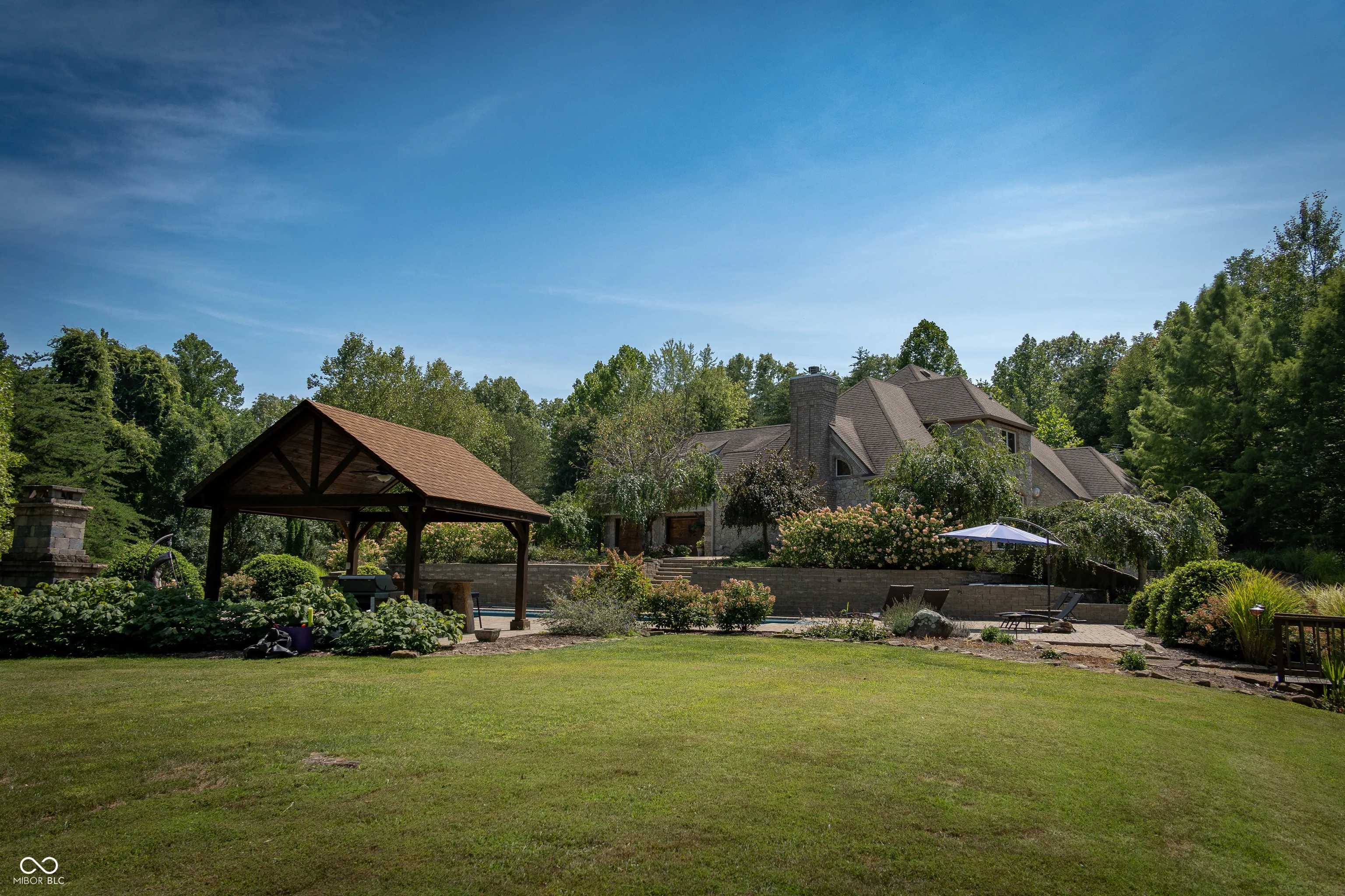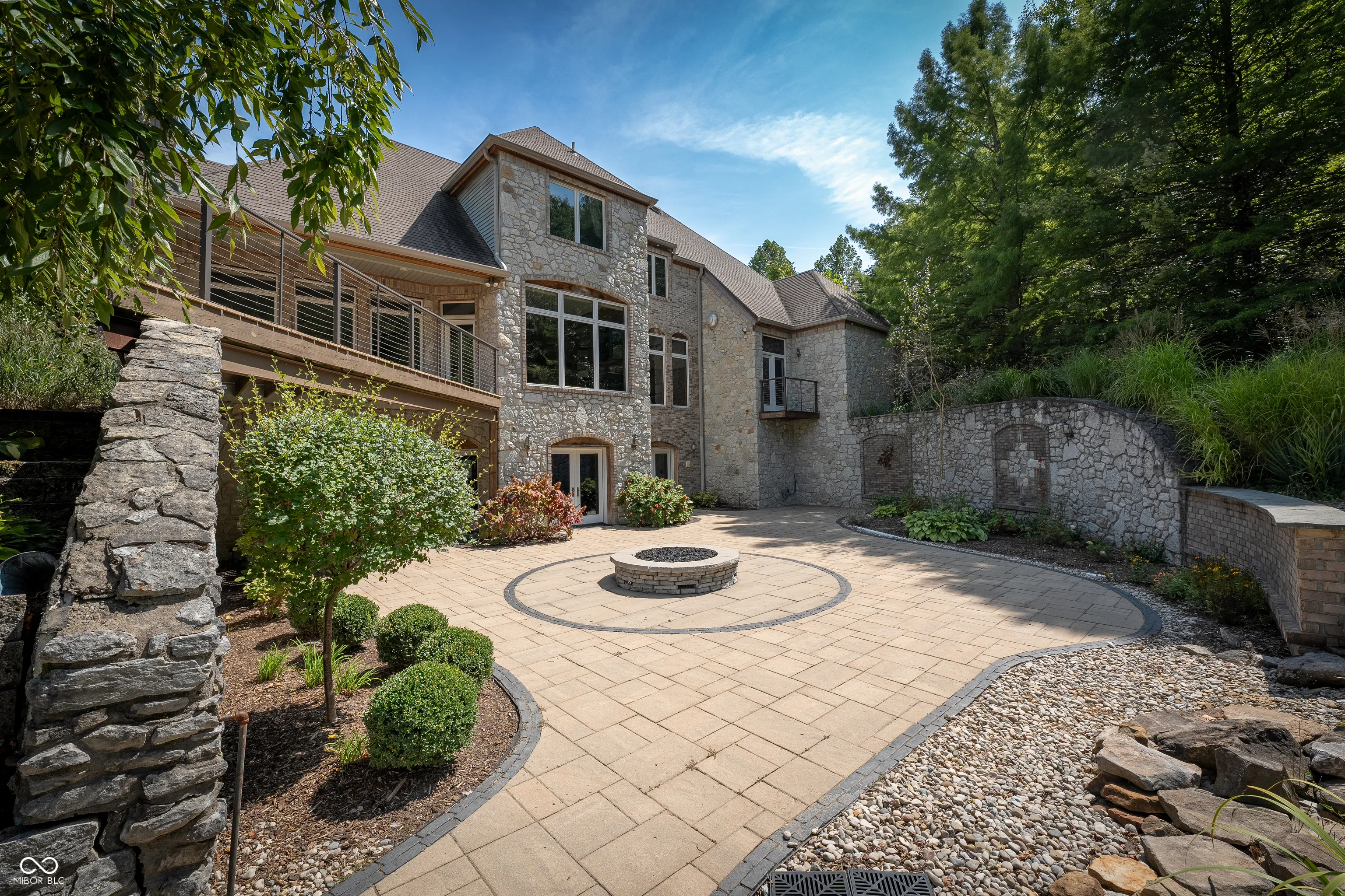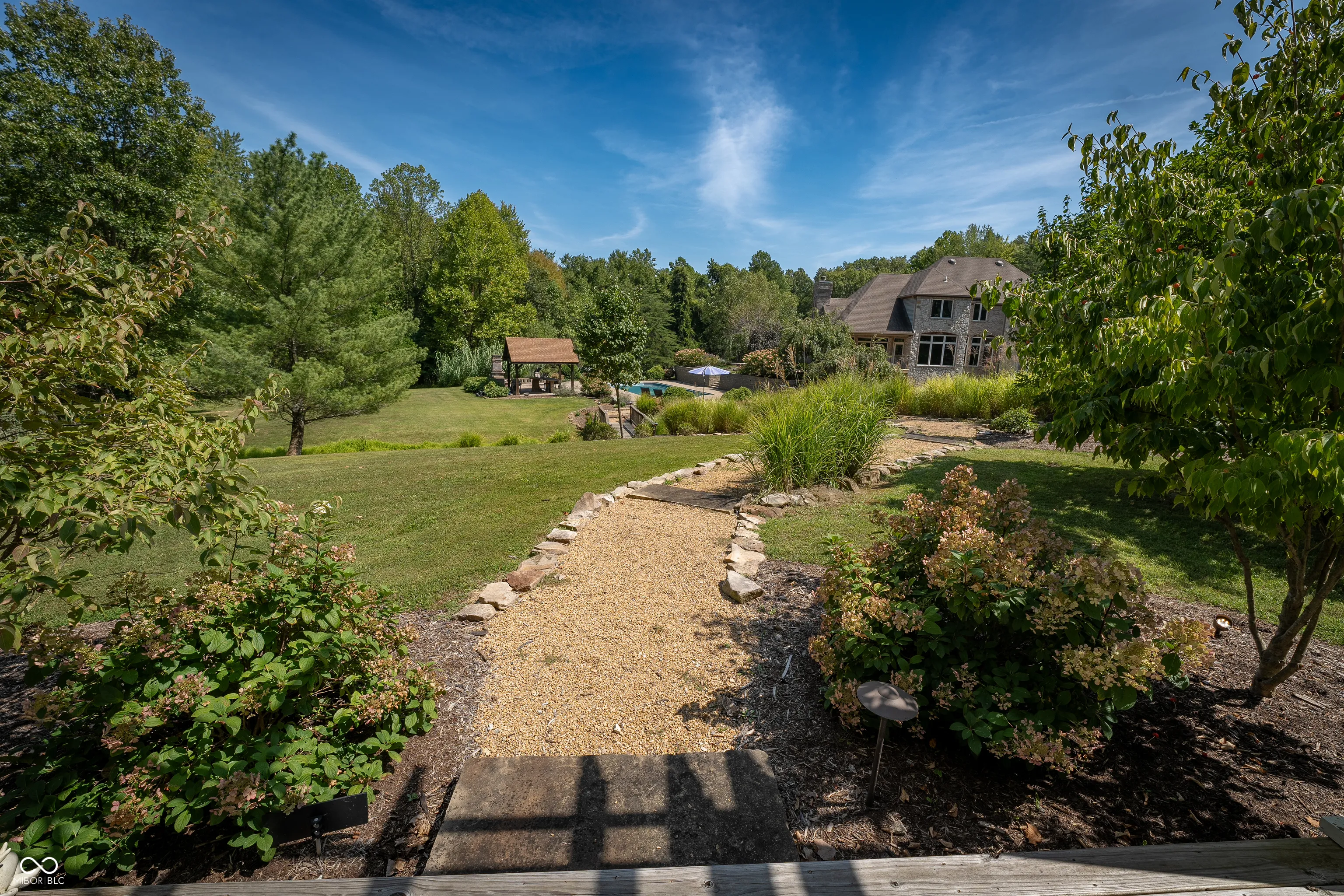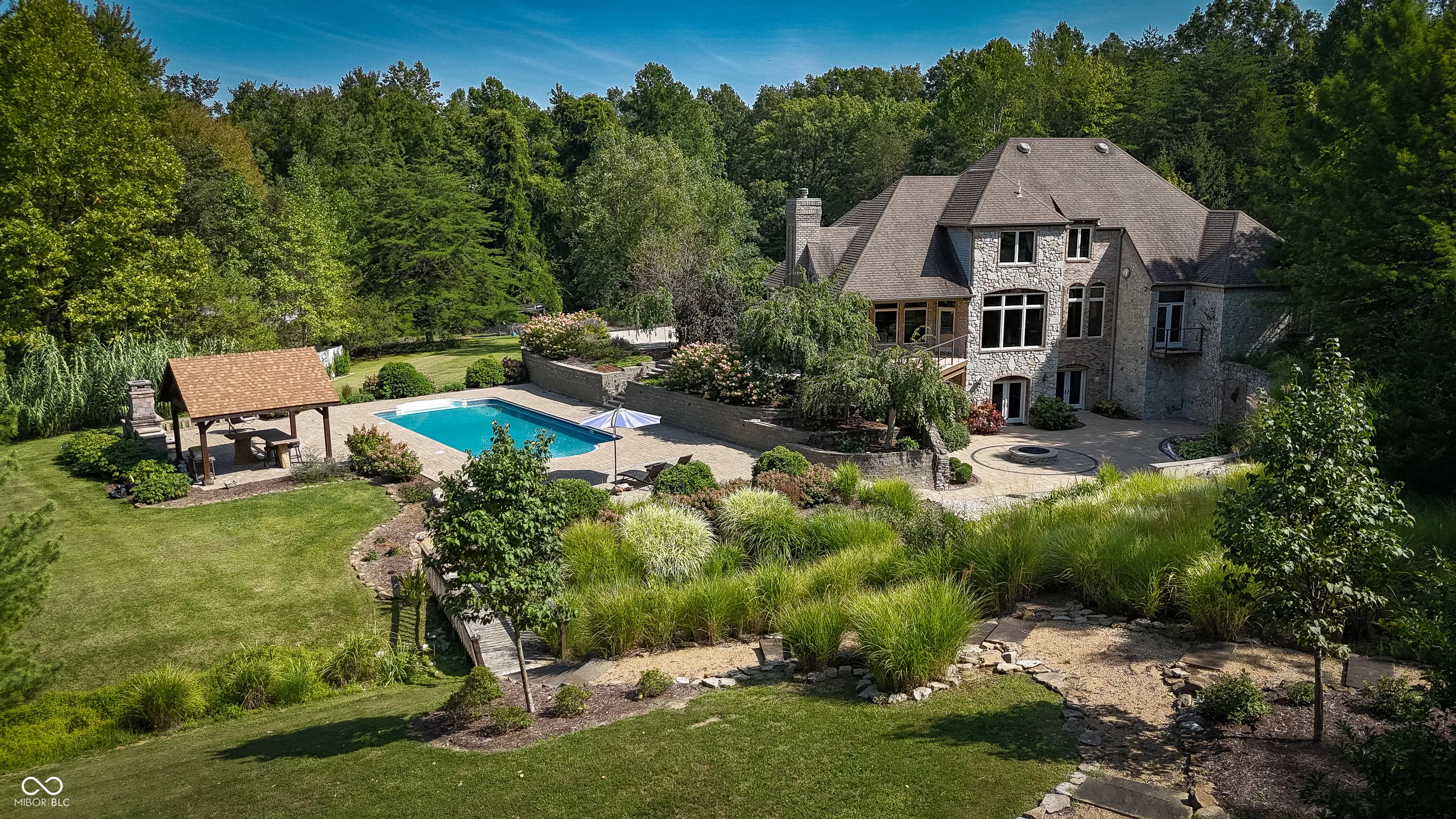 As you enter this exquisite rustic French country home, you are greeted by a grand entrance with a curved stairway. The open formal living and dining room create an expansive atmosphere, while the chef’s kitchen, complete with stainless steel appliances and granite countertops, connects to the family room through the breakfast area. The family room features a gas log fireplace and built-in shelves while opening to a deck that overlooks a lower courtyard with a gas fire pit and a charming koi pond with a waterfall. The main floor’s primary bedroom offers luxury with a walk-in shower, double vanity, and a private deck with a view of the serene lower-level courtyard. Main level also offers an office that could potentially be a 5th bedroom. Upstairs, you’ll find three bedrooms, one with a private bath and two connected by a Jack-and-Jill bathroom and a large living/recreation room. The walkout basement offers excellent entertainment space, featuring a 16-foot-long bar, sink, stove, and refrigerator, along with room for pool tables and game tables. In addition, the basement features a full bathroom and three versatile bonus rooms, offering the perfect space for an office, a home gym, or any other need you may have. Stepping outside, you can enjoy over 9 acres, an in-ground sports pool with walk-ins on both ends, a covered pergola with a bar area, an outside fireplace, and a comfortable sitting area by the pool. A path leads to an additional remote fire pit area and sitting space. Finally, the home features an attached 3-car garage, and the property also includes a pole barn with electric and wood stove heating and a gated driveway. Home has the potential to be a short term tourist rental.