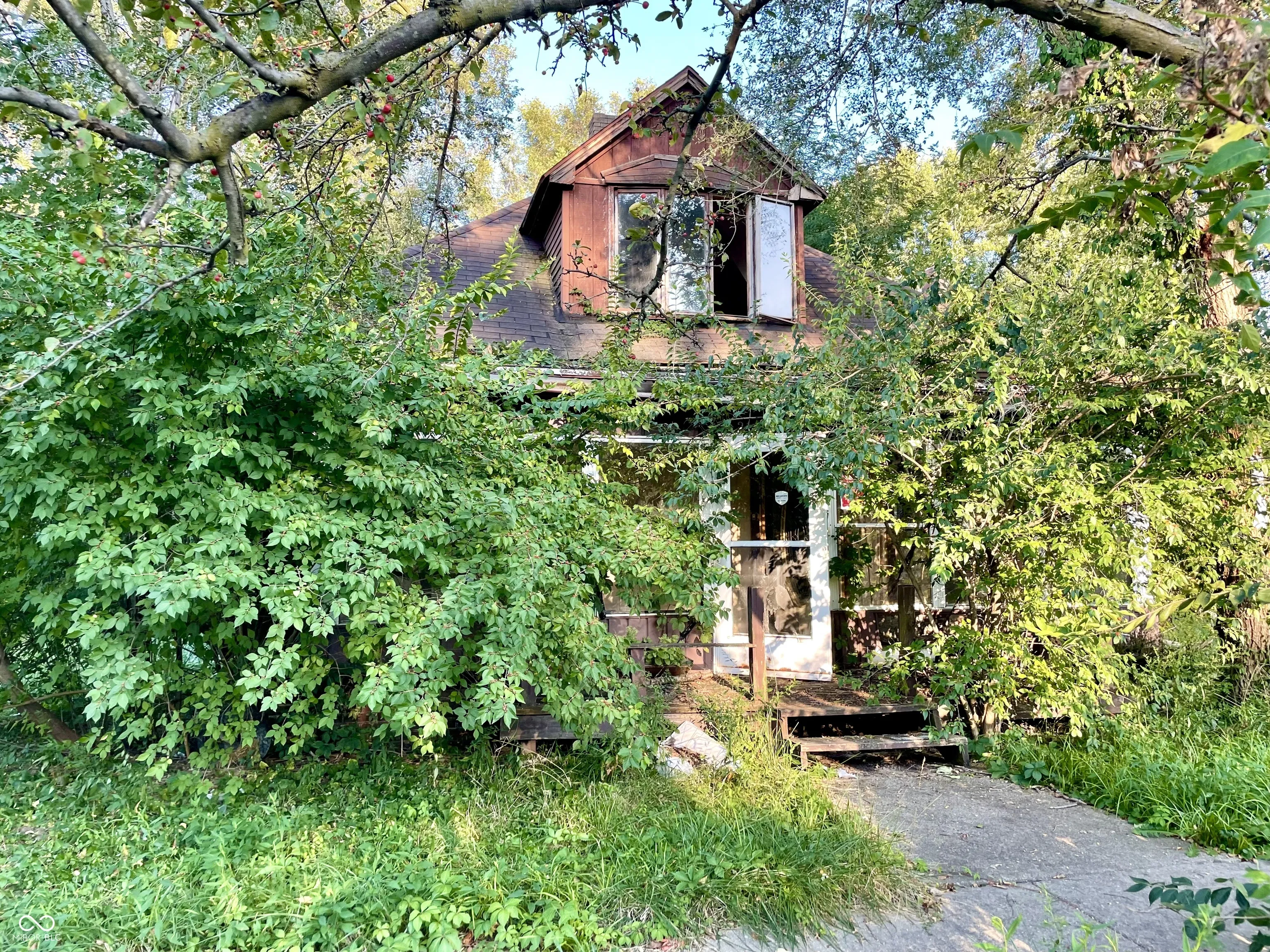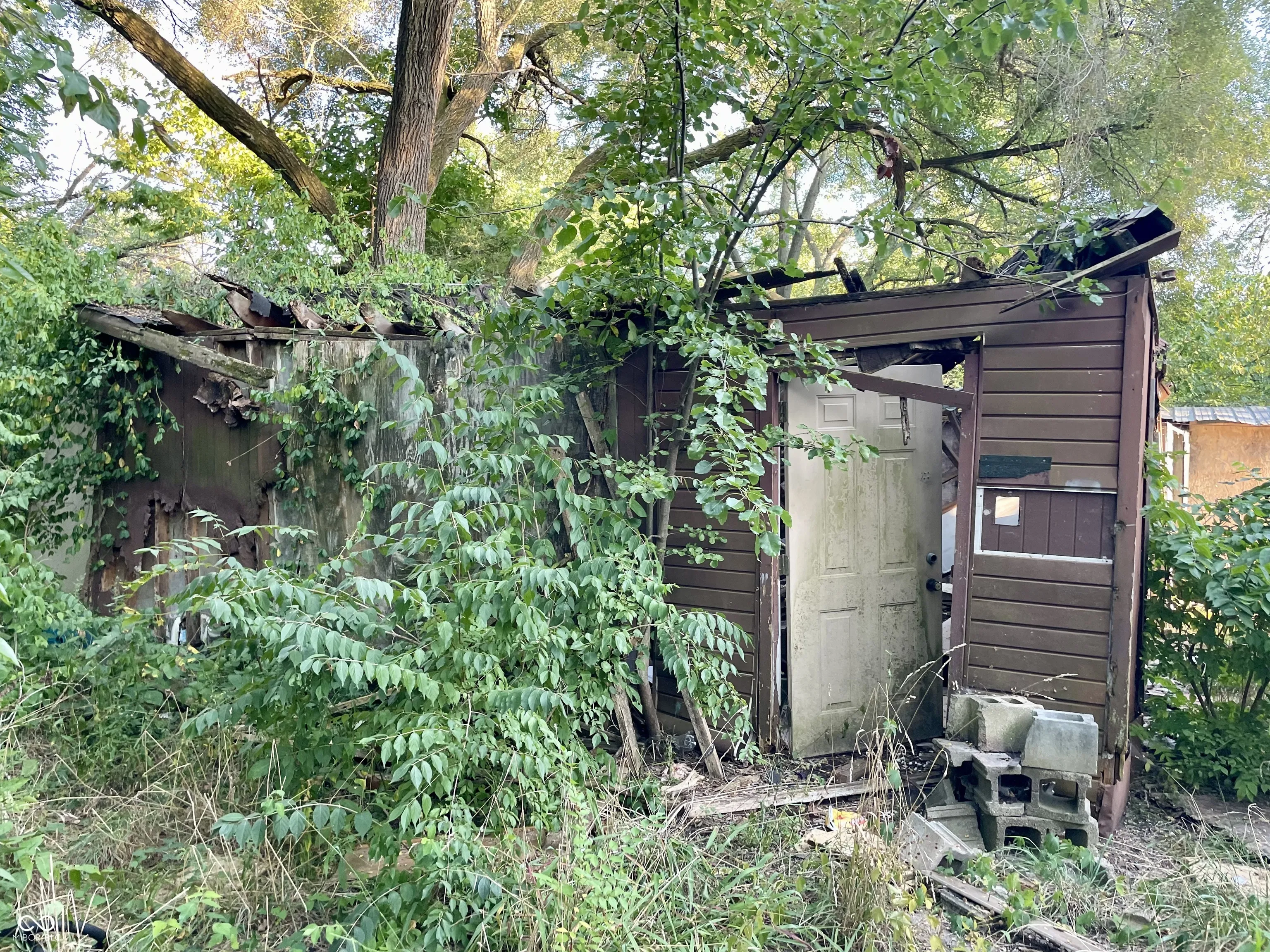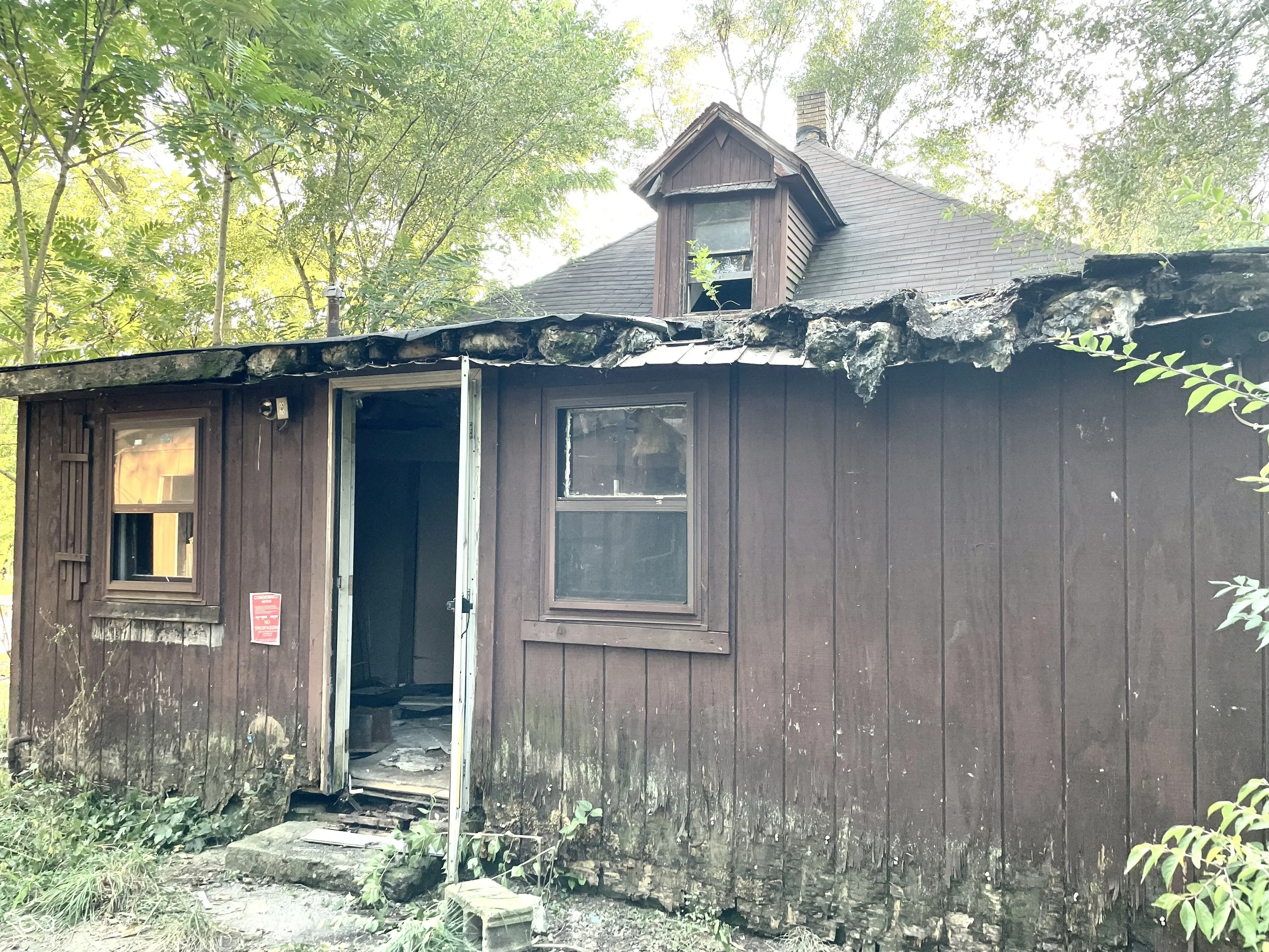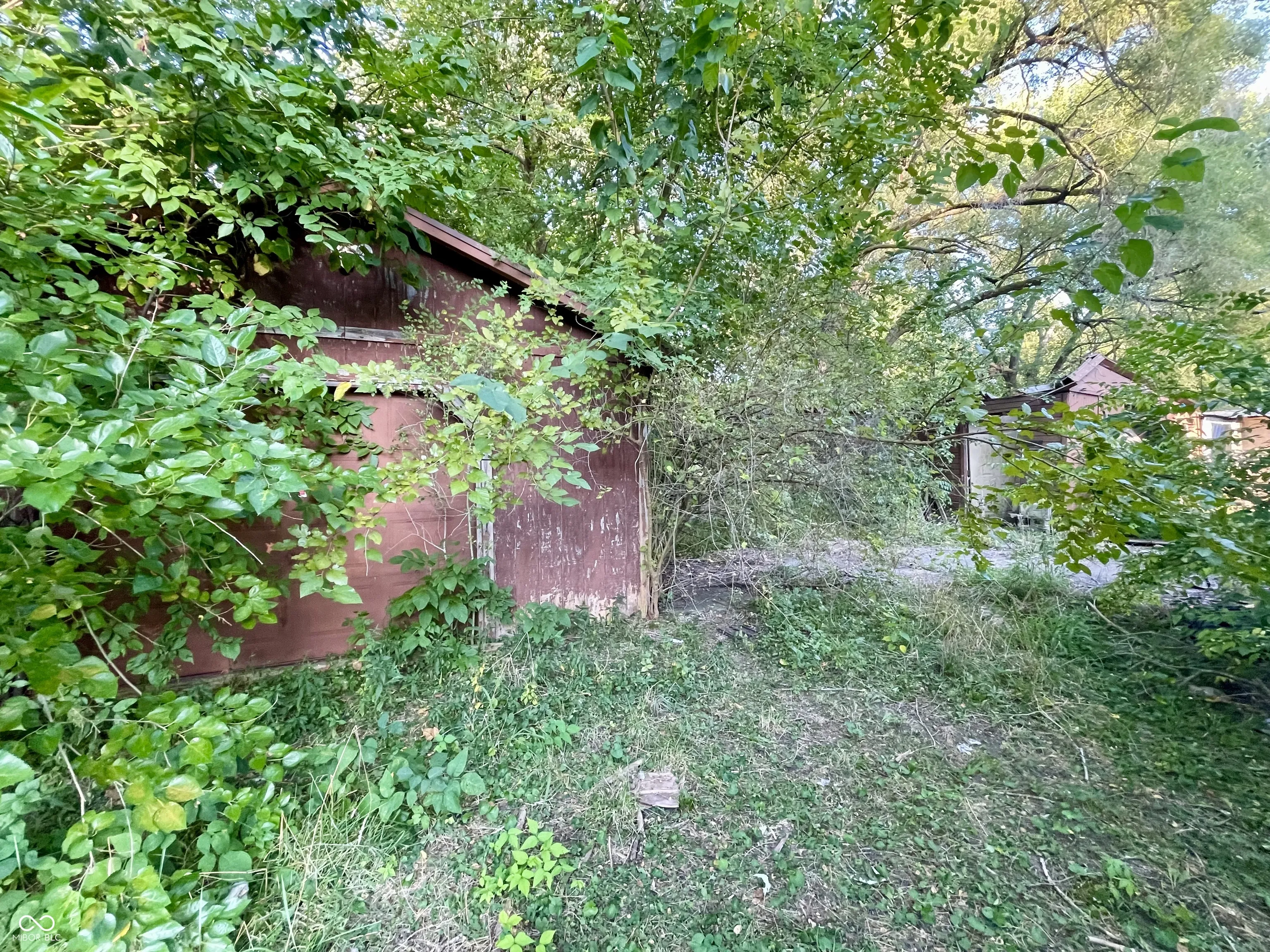 Large wooded Lot with 2-car detached Garage, 1-car detached Garage/Workshop, Shed, enclosed Porch, and open Patio. Property needs full renovation but creates huge upside. 2 story home with large Rooms. Spacious Great Room has Dining Area, brick wood-burning Fireplace. Unfinished Basement presents extra Storage Area. This is a must see! Double Lot