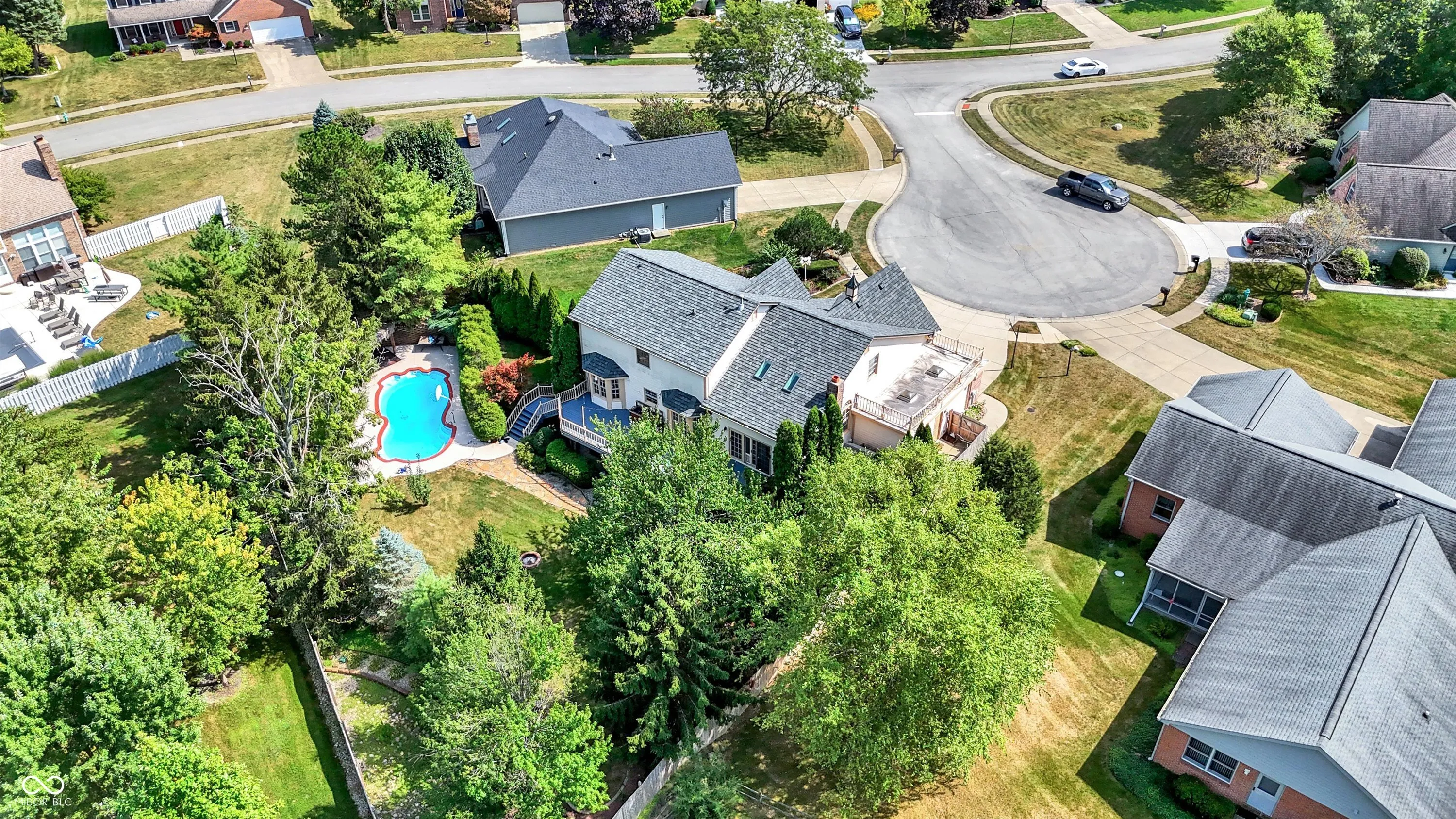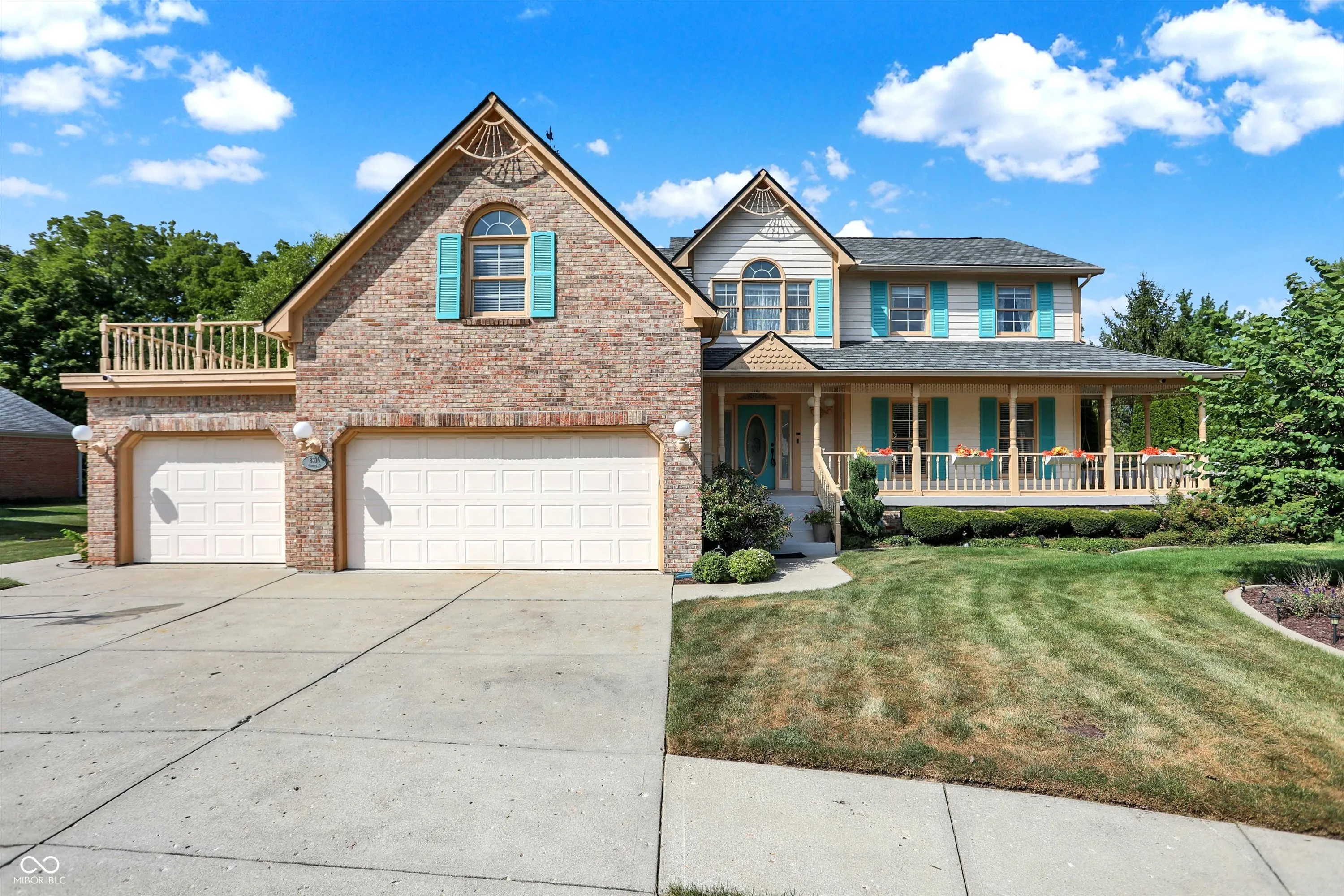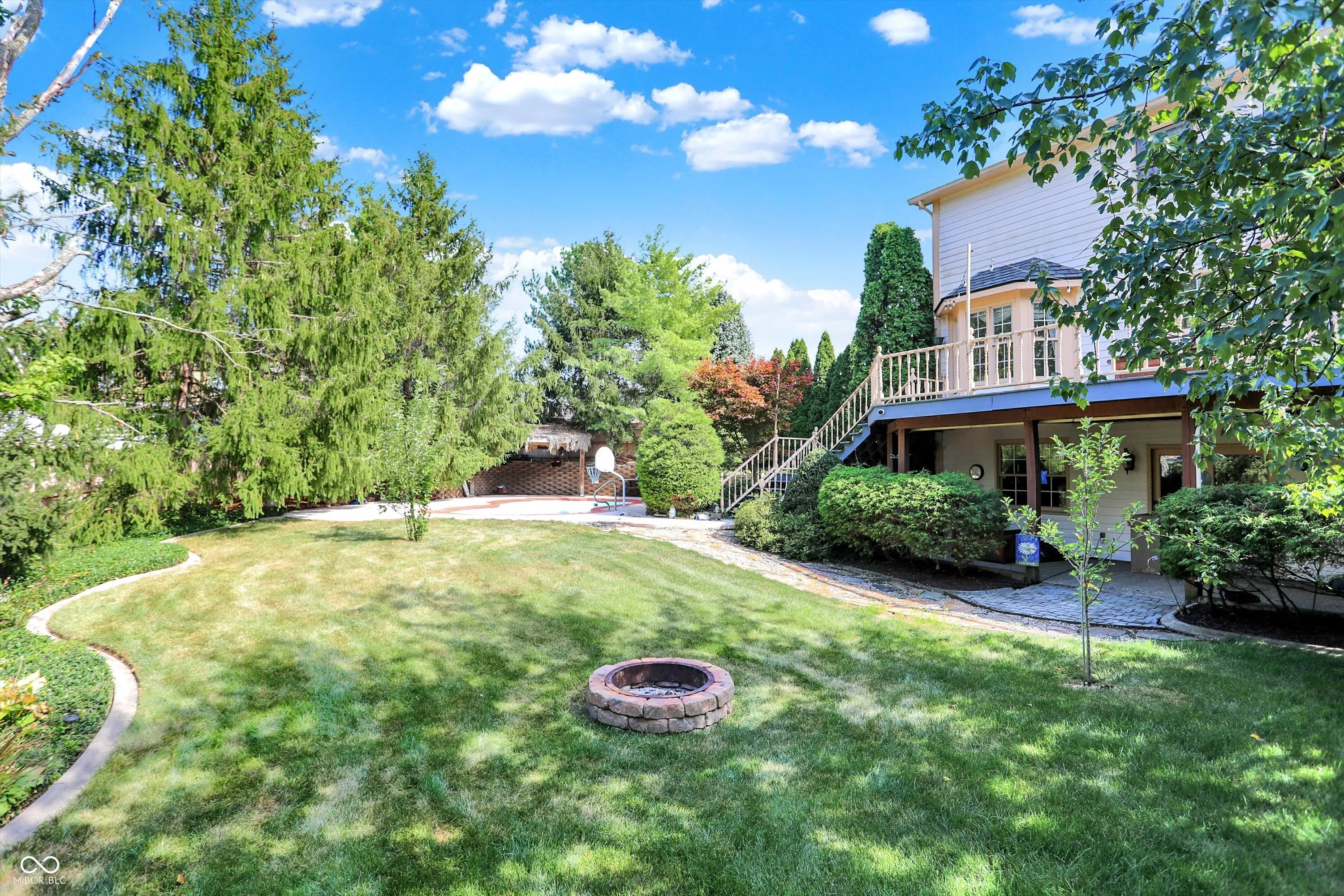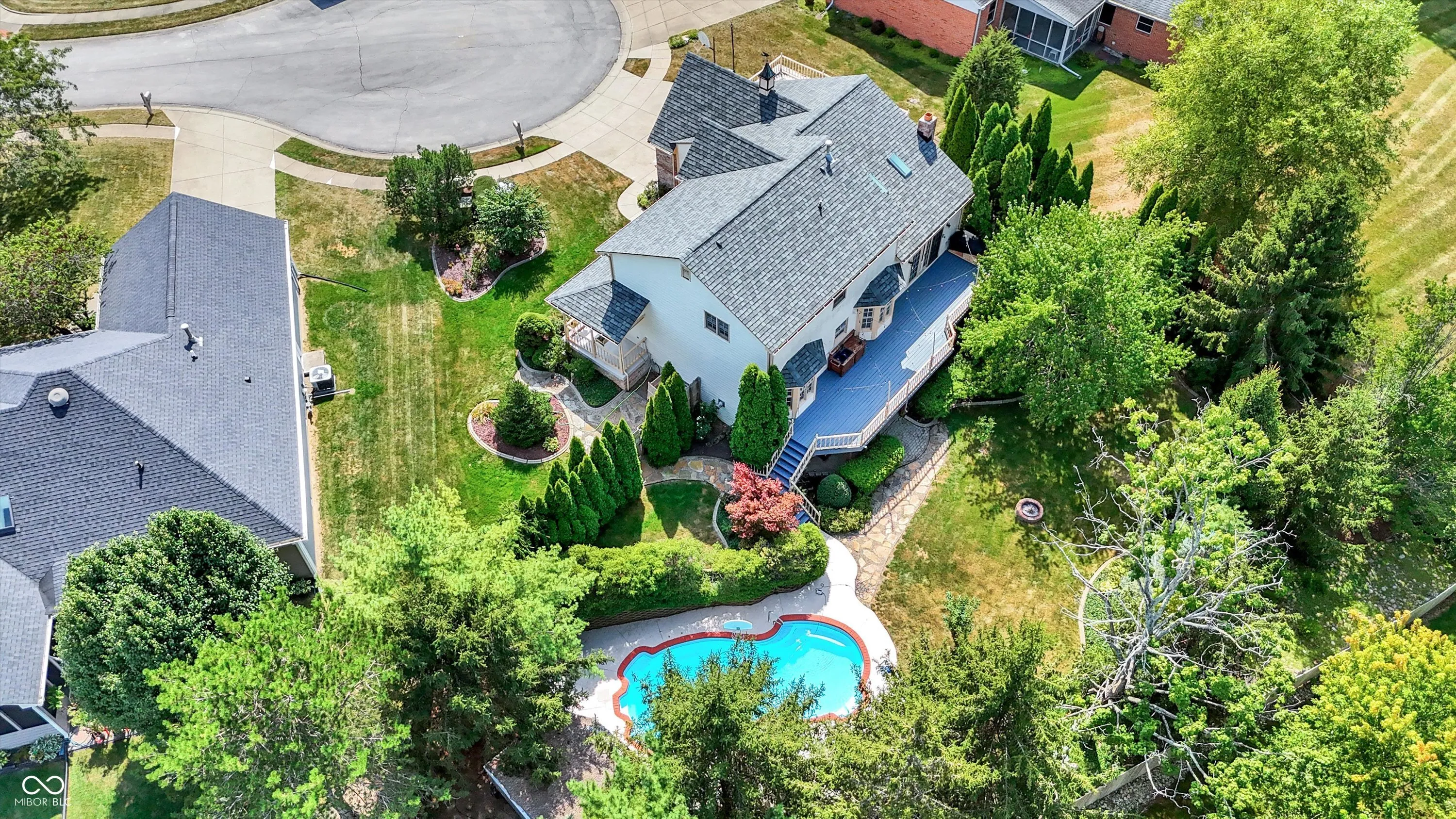 This stunning 3- story, 4/5 bedroom, 3.5 bath Victorian home is a true gem within the highly sought out Hamptons at Geist neighborhood. Mature landscaping abounds, with 35-year-old, 50 ft pine trees enclosing the expansive, fully fenced backyard, making into your own private oasis! The home boasts a gorgeous inground pool with a charming tiki hut for the ultimate in entertaining, as well as a 3-car garage with a 27 ft extended bay perfect for a boat or RV. The fully finished walk-out basement is a great space for hosting guests with a separate office/bedroom and bathroom with shower, a built-in pub-style bar, booth game table w/ built in benches, and direct access to the pool and backyard area. Situated on a quiet cul-de-sac, enjoy your cozy firepit out back, lounging on your huge upper deck, or have a peaceful read on your charming wrap-around front porch with swing. The interior features custom murals throughout the kitchen and separate formal dining room, as well as granite countertops, a built-in coffee bar, an oversized island great for family gatherings, and a wood-burning/gas fireplace in the living room. There is also a huge storage room in the basement, with built in shelves, perfect for holiday decorations. This gorgeous property has been twice featured in the IndyStar Magazine, Home & Garden section, as well as The Current, Christmas issue. Recent updates include a new roof in 2023, a new 96% efficient HVAC system with a UV light filter in 2018, and a remodeled master bathroom in 2016. Other updates include new carpet and paint in 2024, a new pool pump in 2024, and a new water heater with an expansion tank in 2024. Additionally, the home features a new cedar fence in 2023, a professionally sealed garage floor in 2023, a sump pump in 2022, and maintenance items such as creosote cleaning for the fireplace and a new over-range microwave in 2023. This unique property truly offers luxurious living with modern amenities and thoughtful details throughout