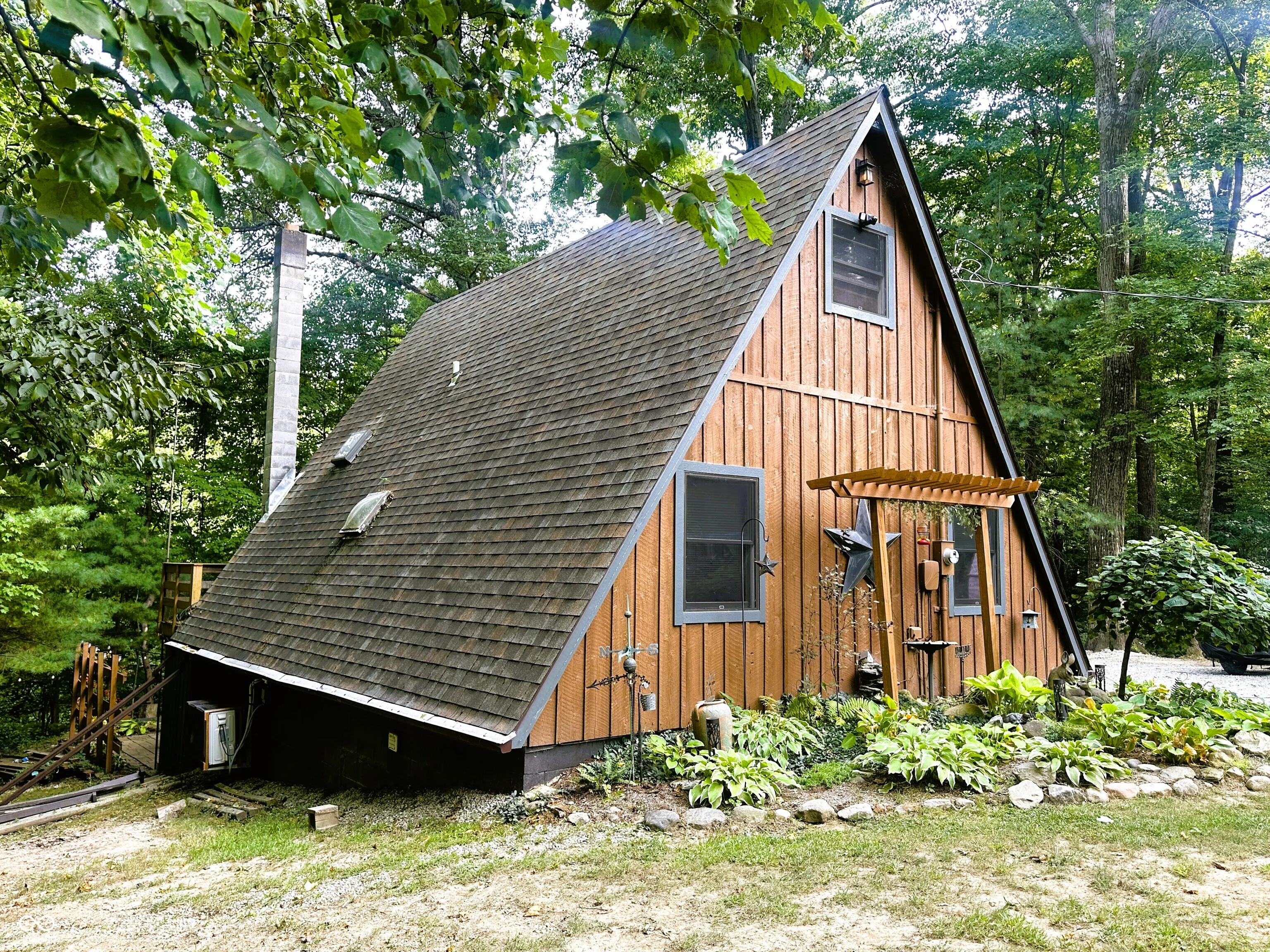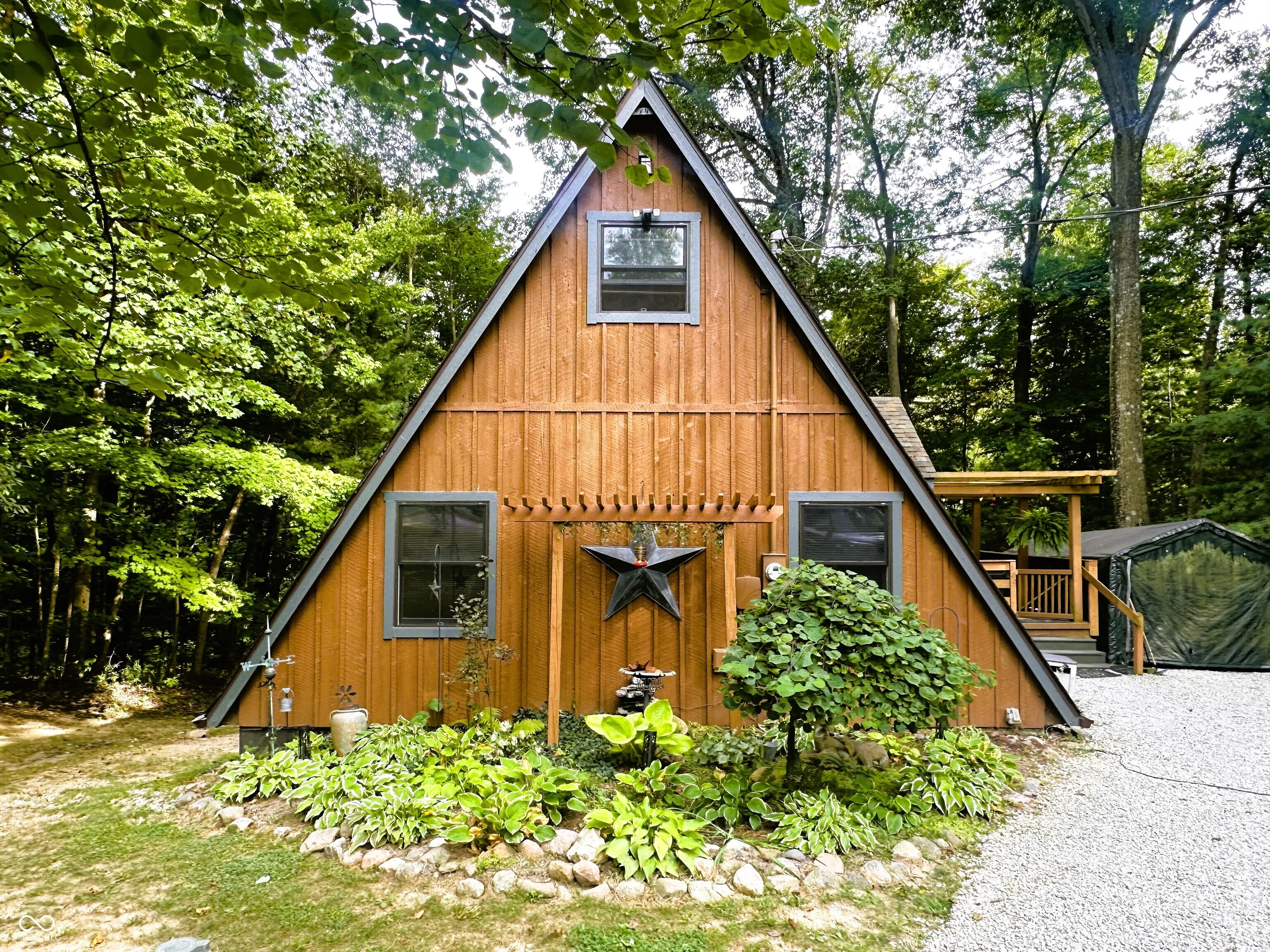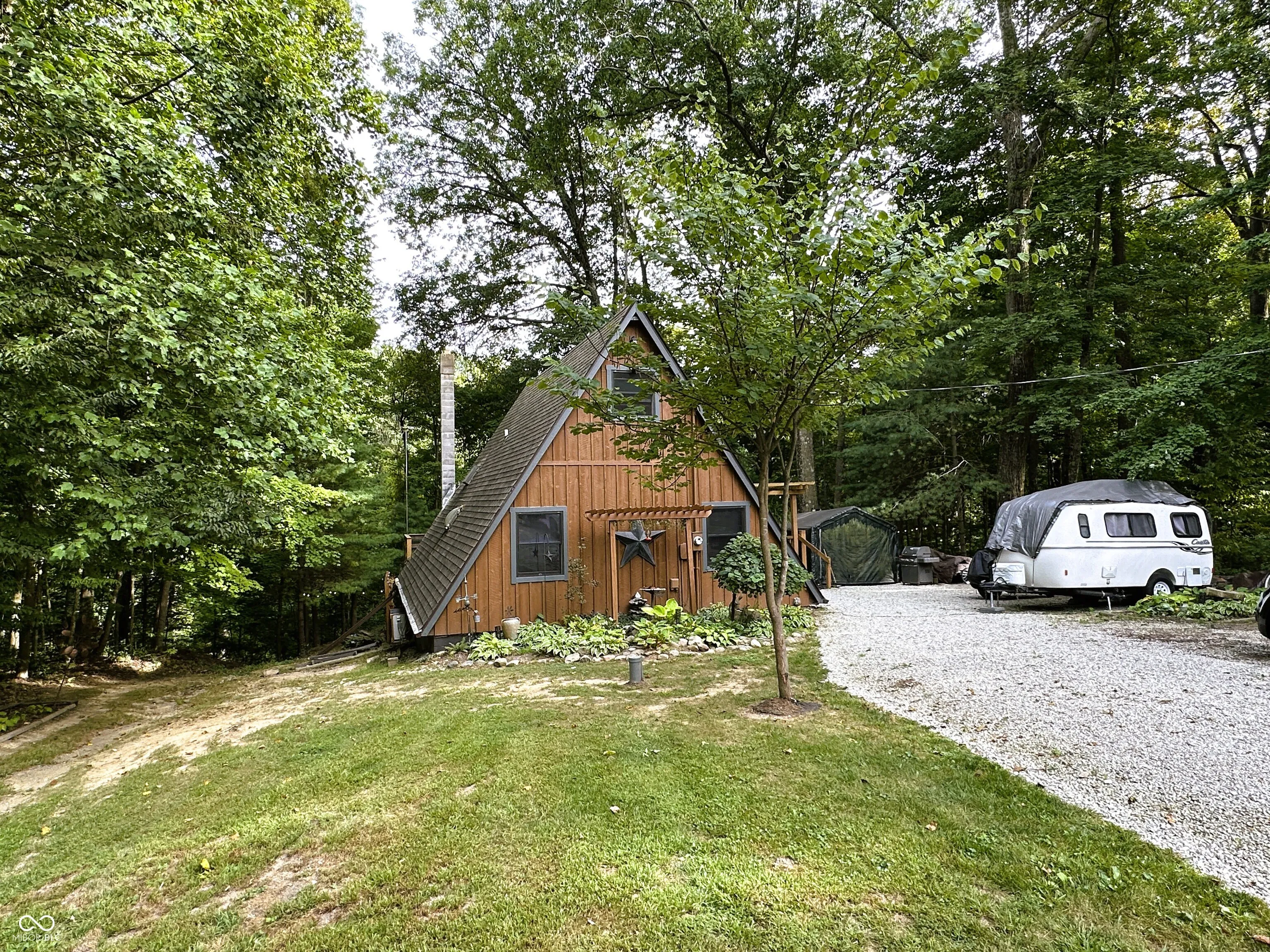 You will fall in love with this well-maintained, rustic, cedar A-frame tucked away on a private lot in the woods at Heritage Lake! Spacious at 3 BRs, 1 Full BA and 1,872 SF of living space in the main level, upstairs Loft area and finished Basement, this home is much larger than it appears. Situated on a .41 acre wooded lot and featuring an expansive 328 SF wrap-a-round deck, screened-in back porch, add’l. deck & 208 SF back paver patio, the property is also perfect for entertaining w/ its multitude of outdoor living spaces. Inside you’ll find a combined LR/DR/Kitchen w/ soaring cathedral ceiling & lots of natural light. The Kitchen is updated w/ modern cabinets, granite countertops & stainless steel appliances that are all included. (The dishwasher is only 6 mos. old and the oven & microwave are both convection.) BRs #2 & #3 are both located downstairs w/ the Full BA, while the Primary BR is located upstairs w/ double closets and Loft space. The finished Basement has a Family Room, Laundry/Utility Room, plenty of storage space and walks out to the back patio. Double pane, vinyl, thermal, tilt-in Pella windows throughout, plus massive Pella sliding glass doors leading from the LR to the Sun Room/Screened-in Porch. Well pump & well pressure tank only 3 yrs. old. Tankless water heater & water softener only 5 yrs. old. Roof only 7 yrs. old. A home this unique doesn’t come around often…don’t delay!