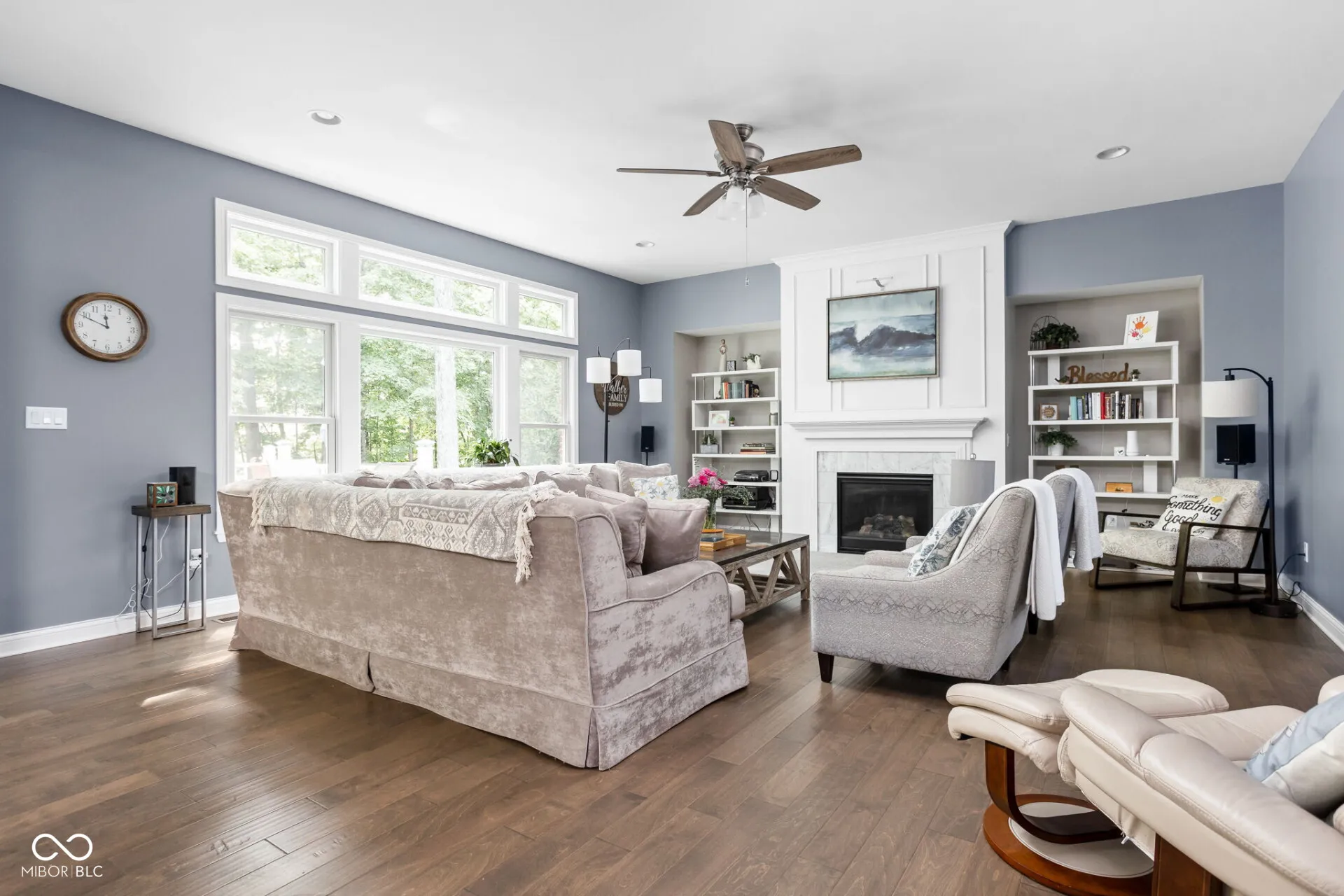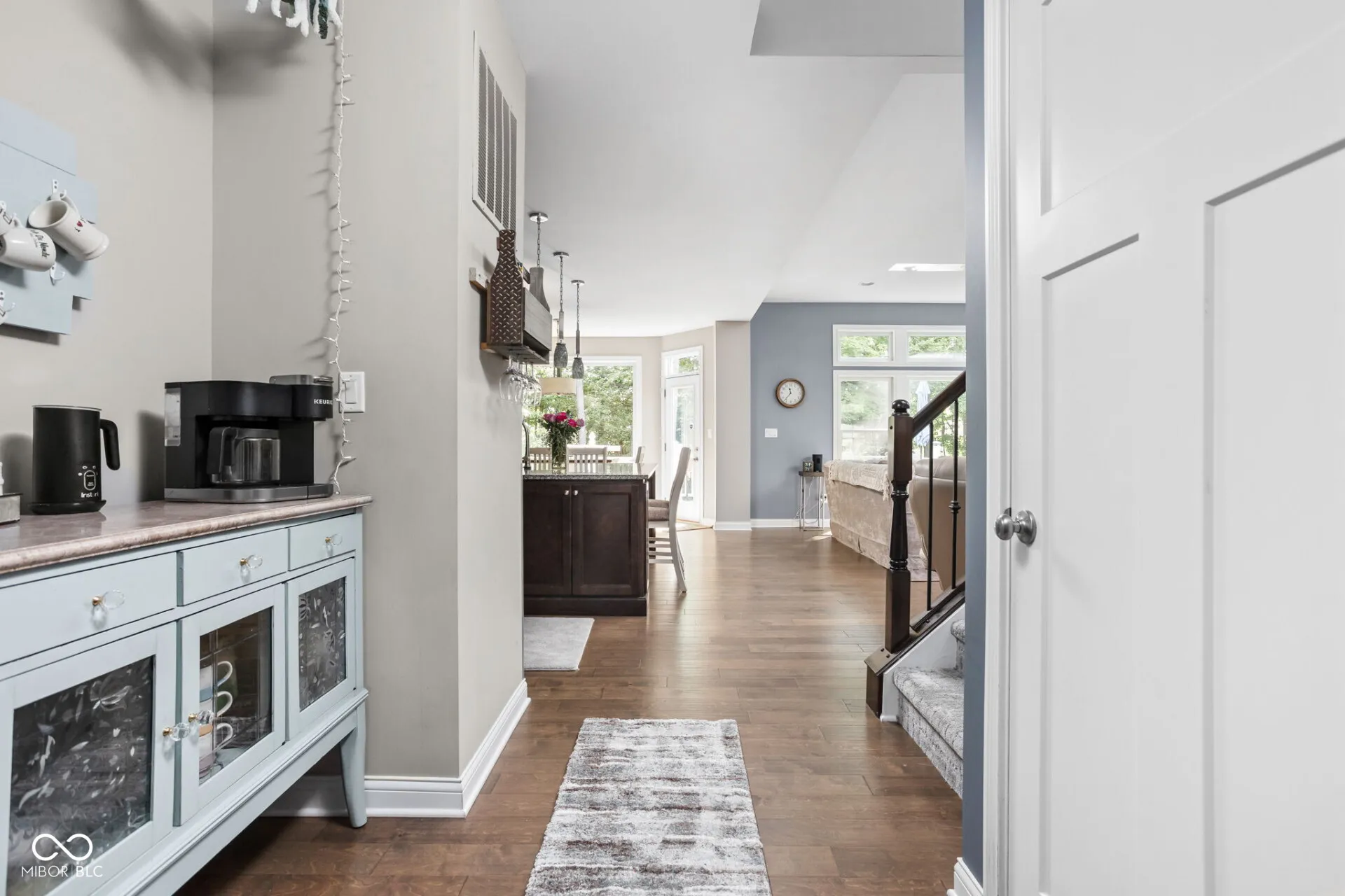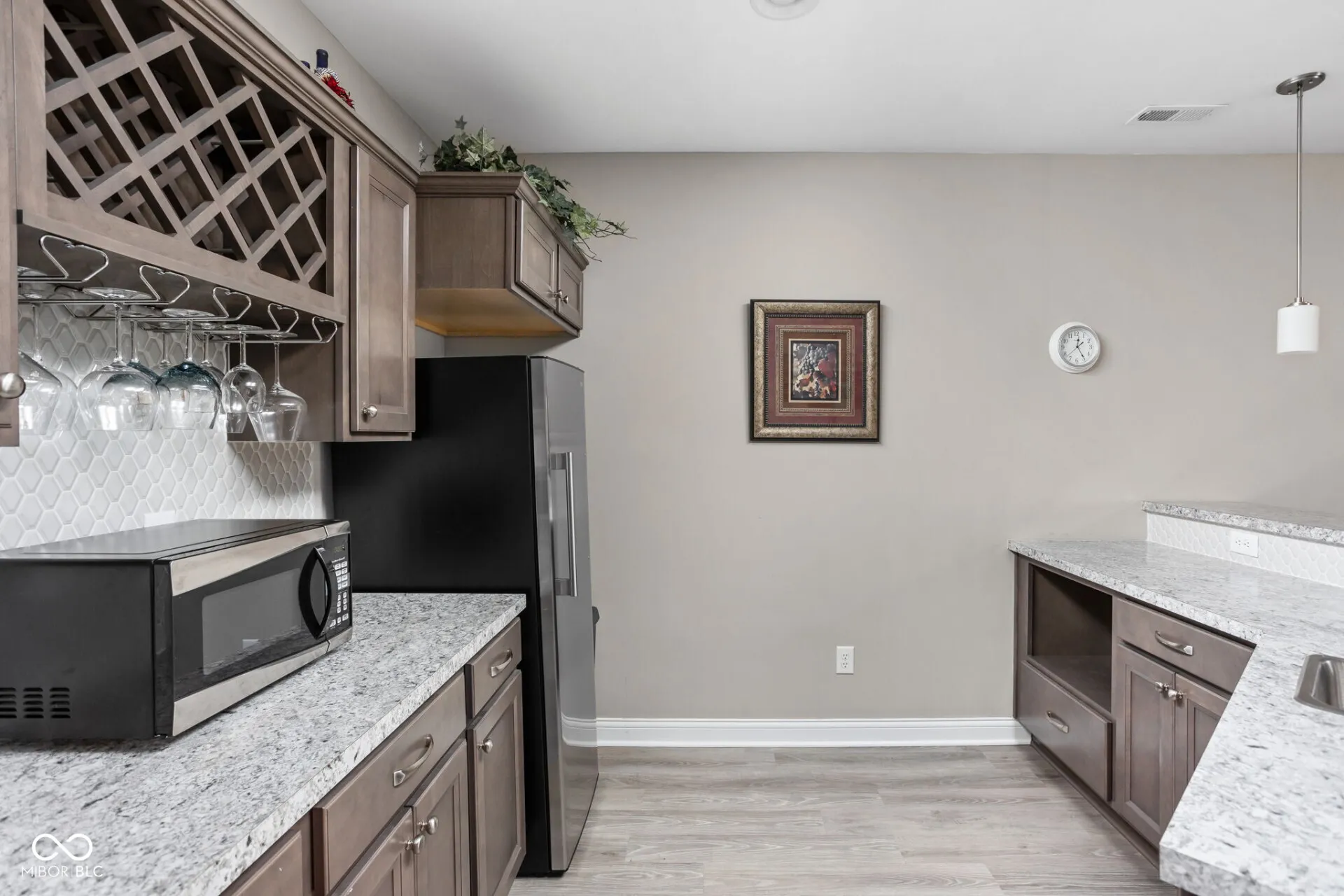 This elegant and unique 4 BR/4.5 bath, move-in ready home in Geist Woods Estates was built in 2017 and is located near Geist in Hancock County in the Mt Vernon school district. It is nestled on a back-wooded parcel with views of a winding creek enjoying pleasant privacy. A cozy firepit area with tiki torches and a pathway through the woods complement the backyard. The parcel is bounded on one side by a wooded area for additional privacy. This home has a spacious main level with hand-scraped hickory wood flooring, recessed ceilings, arches, and elegant millwork. A New England-style paint scheme, all new major appliances (negotiable) and new matching carpeting in the upstairs bedrooms / stairs and hallway make for a worry-free transition to your new home. Andersen double-hung windows make cleaning a breeze. The gourmet kitchen with a gas range, espresso finished cabinets and expansive granite topped island opens to a high ceiling-ed gathering room with a gas fireplace. This area enjoys ample morning sunshine from oversized panoramic windows with beautiful views of the woods beyond. Off the main kitchen is a useful craft room – butler’s pantry with plenty of storage and additional stainless-steel refrigerator. The 3-car side load garage opens onto a mud room and bright laundry room with sink, cabinets and plenty of hanging space. A bright morning room, guest bath and formal dining room with wainscoting round out the main level. The upstairs features four bedrooms, two with private baths, three with walk-in closets, accent walls and an elegant and expansive owner’s suite with retreat room and a primary bath with expressive white and grey tile accenting the shower and spa-style tub. The basement is partially finished and includes a full kitchenette, cabinetry and a new convertible fridge/freezer. A potential fifth bedroom is styled as a yoga/fitness studio. The other half of the basement has storage shelves and a workshop area.