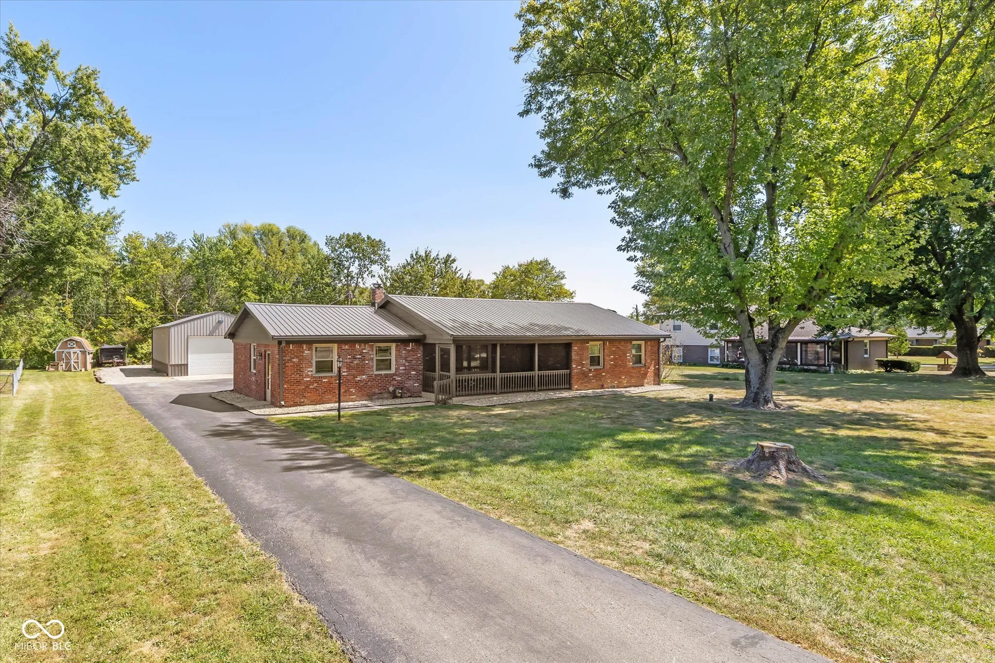 Impressive 3BR/2BA brick ranch with your opportunity to also have a 40×24 pole barn (2021) and 24×16 shed in the New Palestine area. Enjoy the 22×8 screened-in porch on the front and the 25×19 deck (2019) on the back. New vinyl plank flooring in the the last 2 years. New metal roof in 2022. Nice sized foyer. Roomy 17×12 separate Living Room. Updated Kitchen with double built in ovens, electric cooktop, microwave, and refrigerator all staying. Also there is a pantry and b-bar. Breakfast Area/Dining Area right off of the Kitchen. Open floorplan between the Dining Area -Kitchen – and Family Room. The 24×15 Family Room features: brick front fireplace with electric log insert; partial tile and carpet flooring; and two different doors that go outside. Primary Bedroom with full BA. Oversized rear loading 2 car garage. Partially fenced-in backyard. Lots of parking area. Quiet cul-de-sac street. All you have to do in move -in and ENJOY!