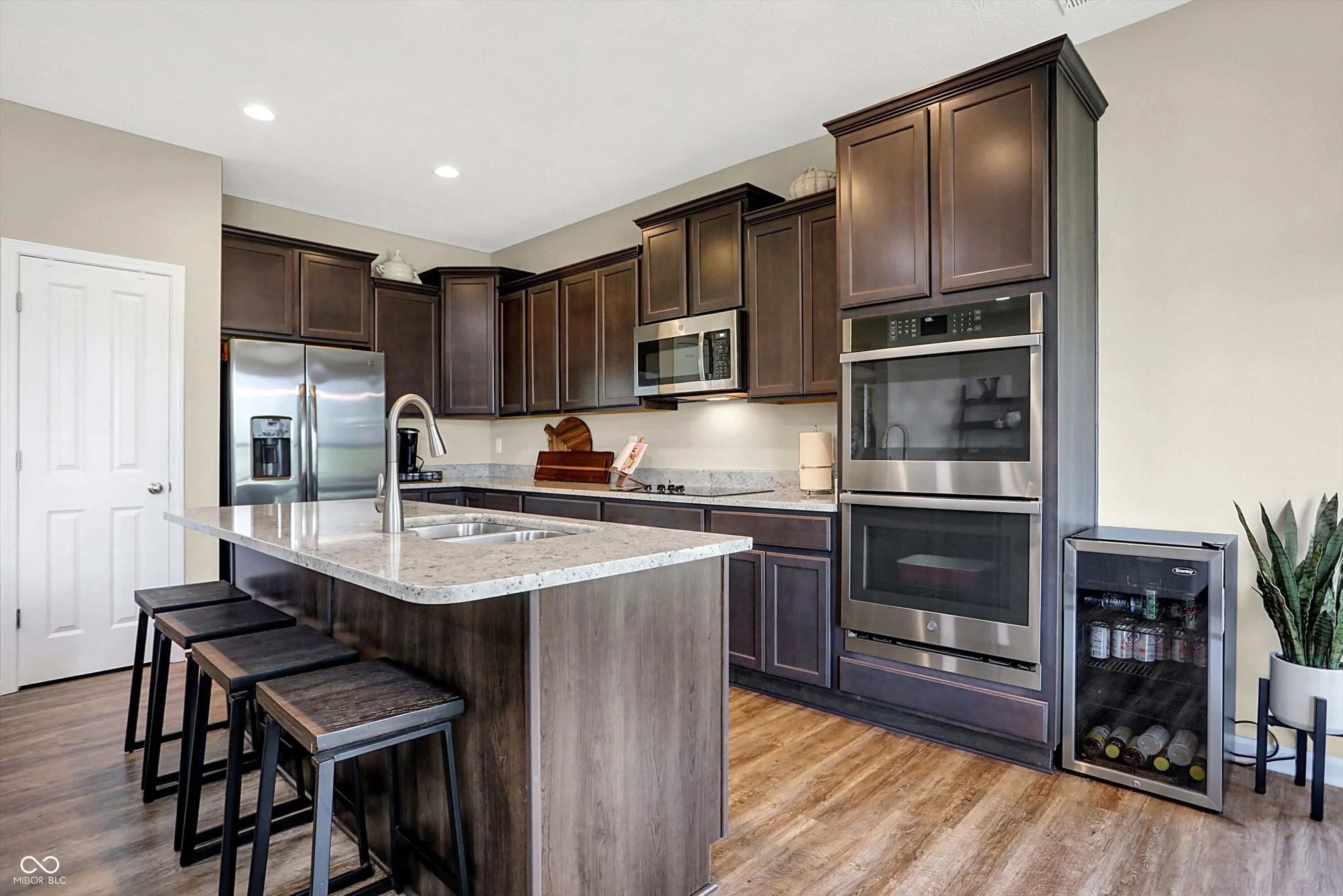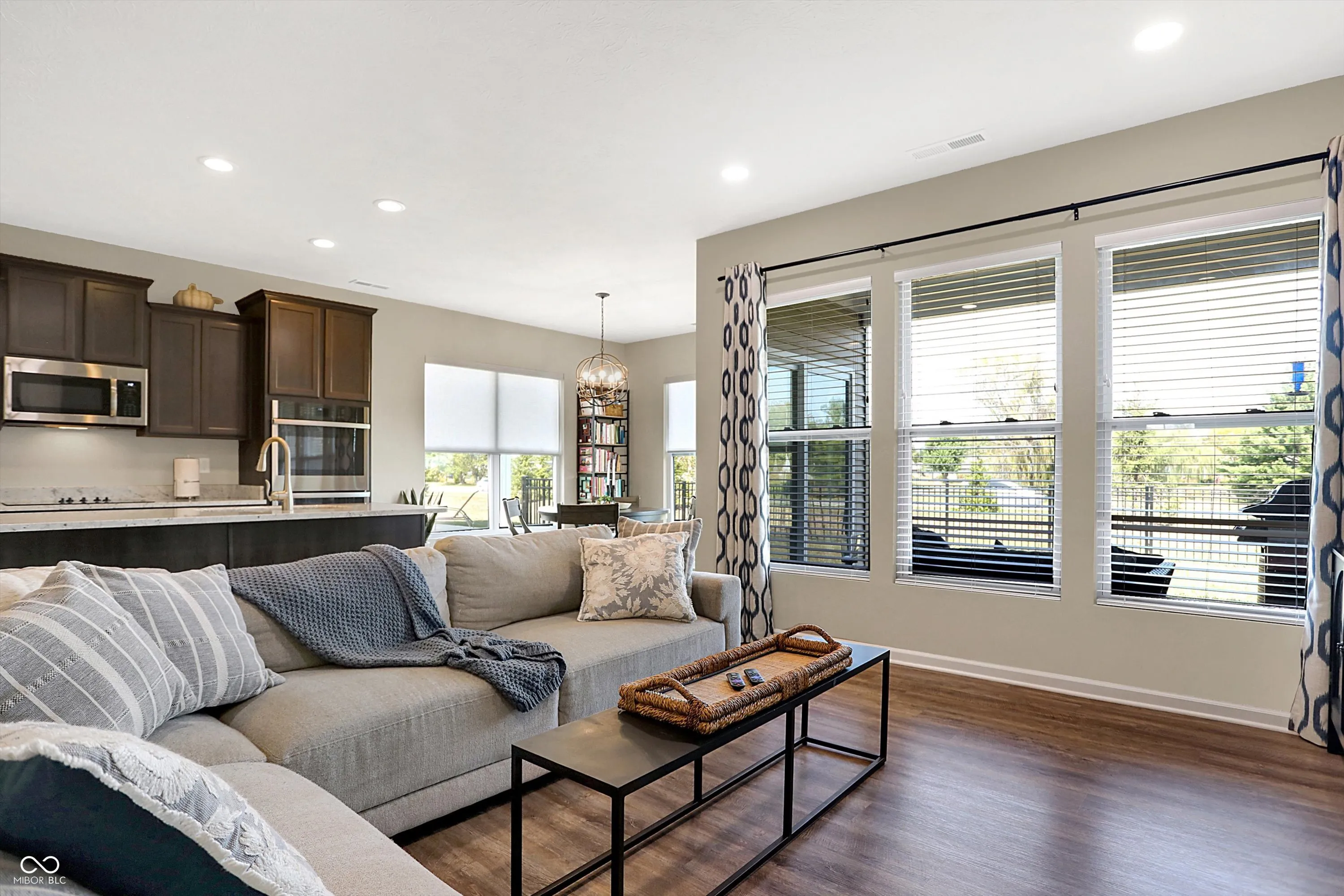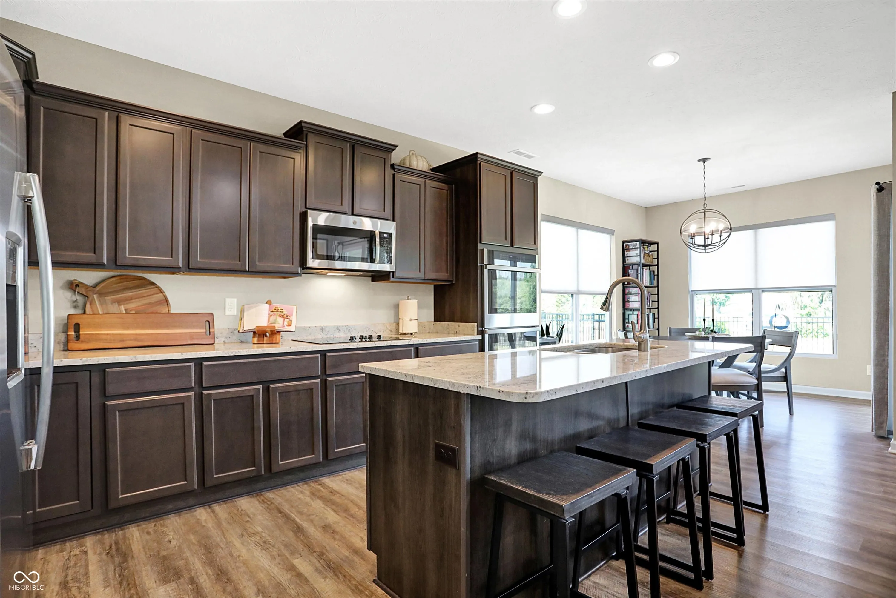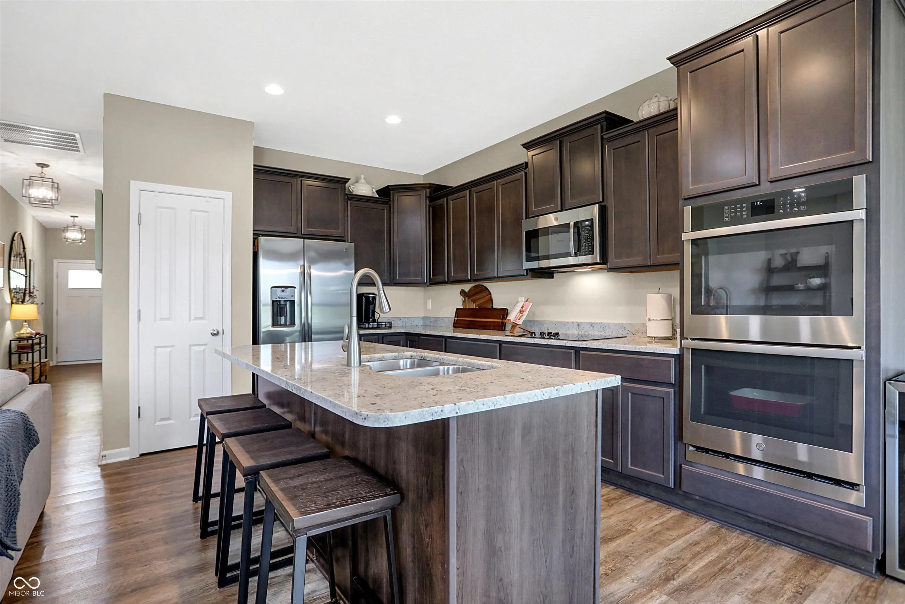Experience the effortless charm of low-maintenance living at Abbington, featuring the stunning Bella Vista floorplan. As you step onto the welcoming covered front porch, you’ll instantly feel at home, with plenty of space to relax and get to know your neighbors. Inside, the open layout invites you into a spacious great room, highlighted by a cozy linear fireplace, seamlessly flowing into a gourmet kitchen and a sunlit breakfast nook. The kitchen truly serves as the heart of the home, boasting a large island with quartz countertops and seating, elegant staggered cabinets with crown molding, and top-of-the-line stainless steel GE appliances, including a refrigerator, electric cooktop, double oven with wireless controls, micro/hood, and dishwasher. Imagine yourself retreating to the primary suite, your personal sanctuary, featuring a generous walk-in closet with custom built-ins and a luxurious private bathroom complete with an upgraded tiled shower with glass doors and double sinks. The conveniently located laundry room off the primary suite and a huge utility/storage space add to the home’s functionality. The split floor plan ensures ultimate privacy, with a second bedroom and full bathroom near the entrance, making it ideal for guests or a home office. Step outside to your backyard oasis, complete with a covered porch and a newly installed full rear fence, perfect for outdoor entertaining or quiet relaxation. Additional highlights include a spacious two-car garage, more flush mount lighting, new light fixtures, and other thoughtful upgrades. The Abbington community offers fantastic amenities, including a playground and walking trails, and is conveniently located just 25 minutes from Downtown Indy, with easy access to local restaurants and shopping. Envision yourself enjoying this perfect blend of comfort, convenience, and modern luxury, making it the perfect place to call home.