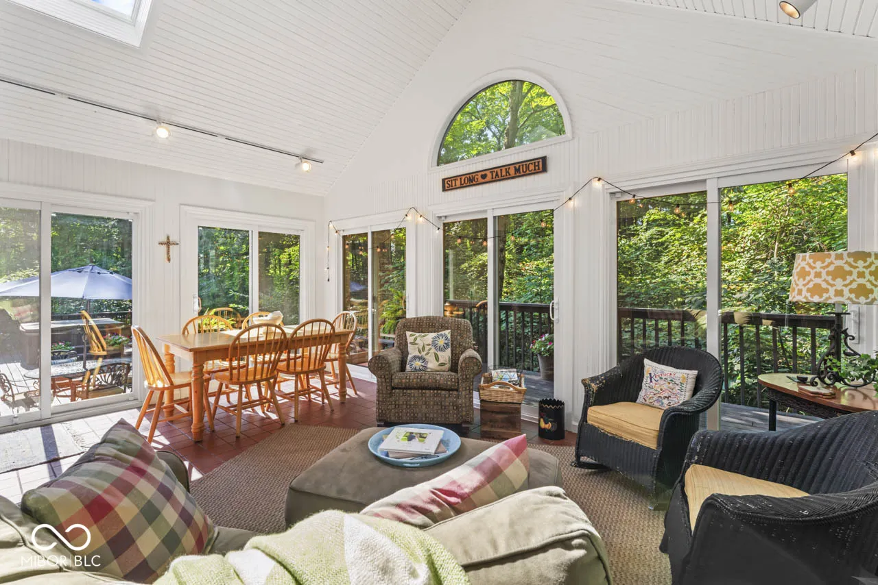 Charming Home on a Private Wooded Lot Near Hillcrest Country Club. Nestled on a nearly acre wooded lot via a private lane, this inviting home offers a blend of tranquility and convenience, just a short walk from Hillcrest Country Club. Start your mornings on the scenic covered front porch, or unwind in the evenings on the expansive back deck, both perfect for soaking in the natural surroundings and outdoor grilling. Inside, a cozy country kitchen awaits, featuring a center island, granite countertops, ceramic tile backsplash, and stainless steel appliances. The spacious sunroom with cathedral ceilings provides a stunning view and is ideal for gatherings and meals throughout the spring, summer, and fall. Adjacent to the kitchen, the formal dining room flows seamlessly into the large living room, which boasts built-in bookshelves and a welcoming wood-burning fireplace. The den/family room, complete with a gas fireplace, offers a comfortable retreat, while a large playroom bonus room off the garage is perfect for children. The home includes four bedrooms and two and a half bathrooms including a primary suite. The generously sized fourth bedroom is located upstairs, providing additional privacy and space. The basement is a versatile area with a laundry room, refrigerator, wash sink, and ample room for storage, an exercise space, or a hobby room. The two-car garage, with a convenient bump-out, ensures ample parking. Walk in attic is perfect for additional storage. This charming home harmoniously combines rustic charm with modern amenities, making it a perfect retreat for any family.