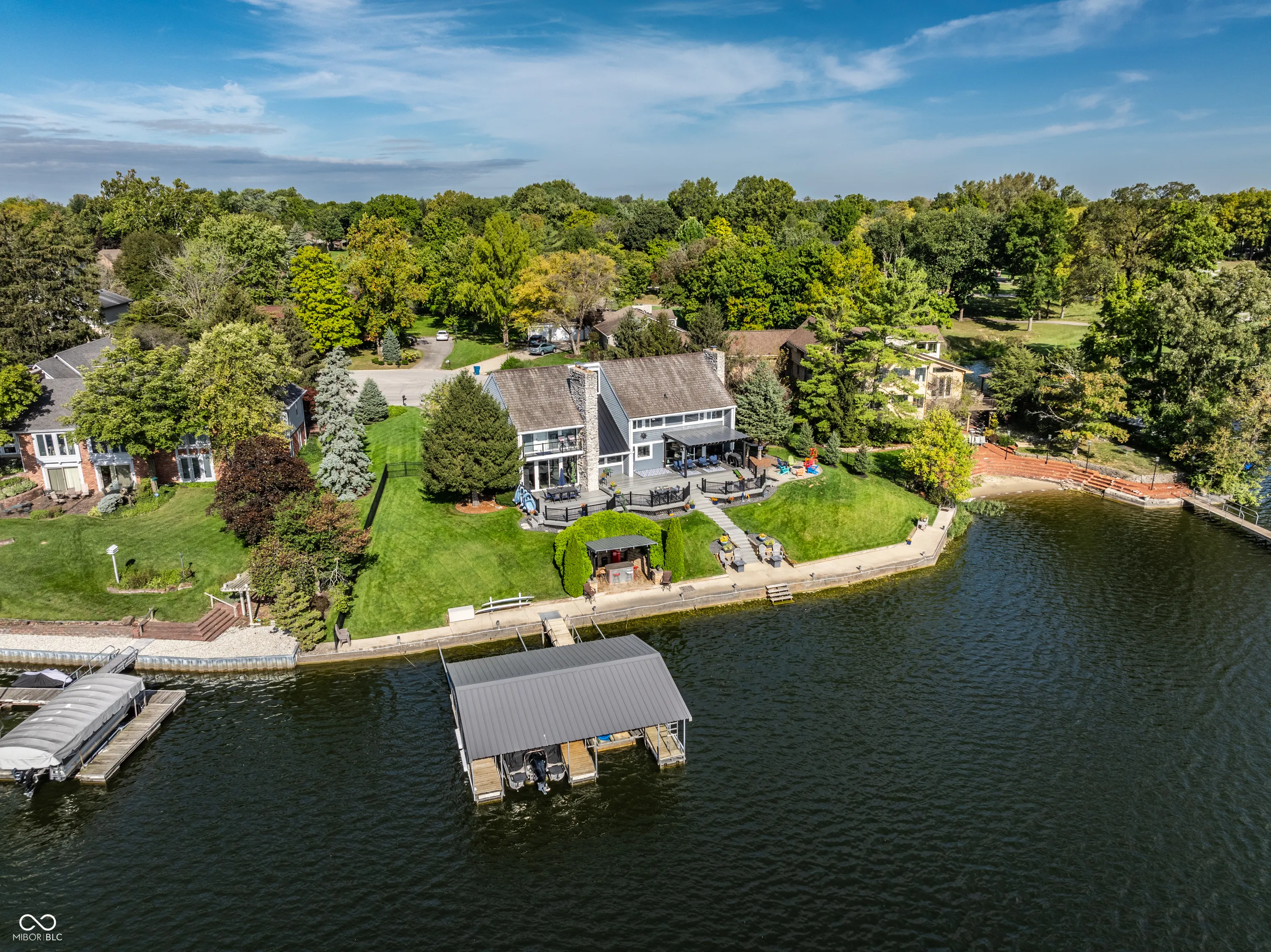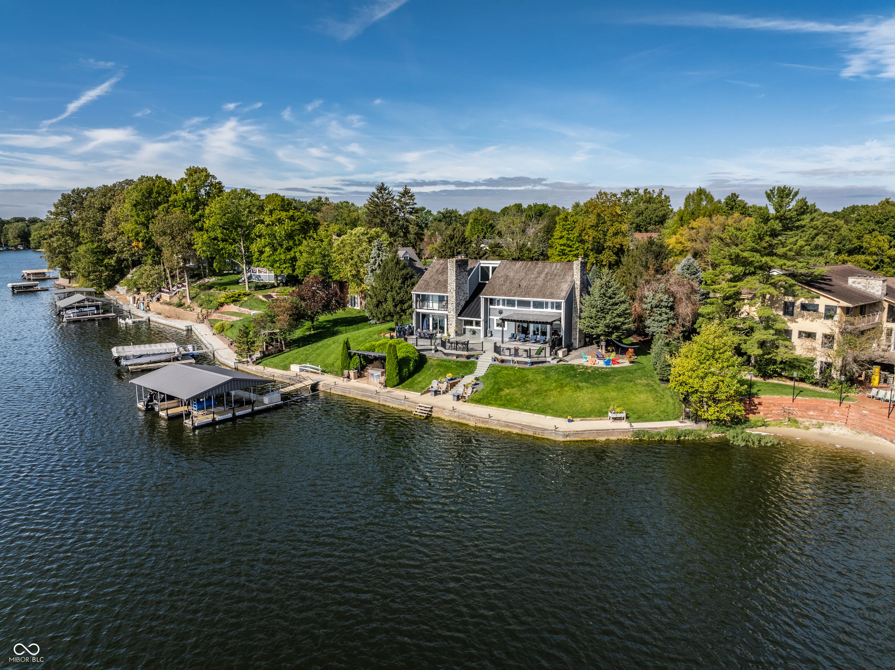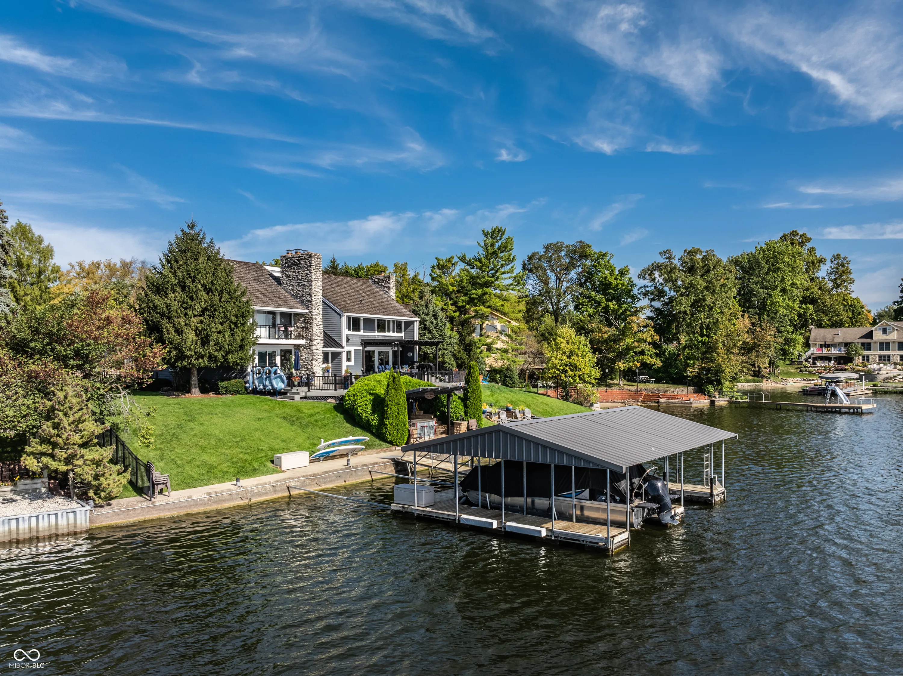 Welcome to the crown jewel of North Harbour-a stunning waterfront retreat nestled in a secluded cul-de-sac. This exclusive property boasts 170 feet of pristine water frontage, offering amazing views from every room in the home. With four spacious bedrooms and four full baths, this residence offers an abundance of space, light, and updates throughout. The heart of this home is a beautifully designed chef’s kitchen, complete with a Viking gas cooktop, stainless steel appliances, double granite countertops, and a large walk-in pantry. Three stone fireplaces add to the ambiance of lakefront living. The primary suite is a luxurious retreat featuring a private balcony to enjoy a peaceful morning sunrise or nightfall. The coffee bar with mini-fridge and sink will provide your beverage of choice. It is completed by an updated bathroom and amazing California custom closet. The secondary bedrooms are equally spacious and all offer mesmerizing water views. Ample storage is available, including a large, easily accessible floored attic space. The lower level offers endless flexibility-perfect for an office, workout area, or home theater. The heated garage with an epoxy floor and a full bath makes it easy to refresh after a day on the water. Expansive Trex deck is partially covered for all-weather enjoyment. The gas firepit and amazing lakeside bar create an ideal setting for gathering and making memories. The revamped double dock with a steel roof, two lifts (one rated for 10,000 lbs), and two water bubblers ensures your watercraft is well accommodated. Fenced side yards with four access gates complete this one-of-a-kind lakefront masterpiece. Enjoy the best of lakeside living in this extraordinary home that is truly the envy of North Harbour.