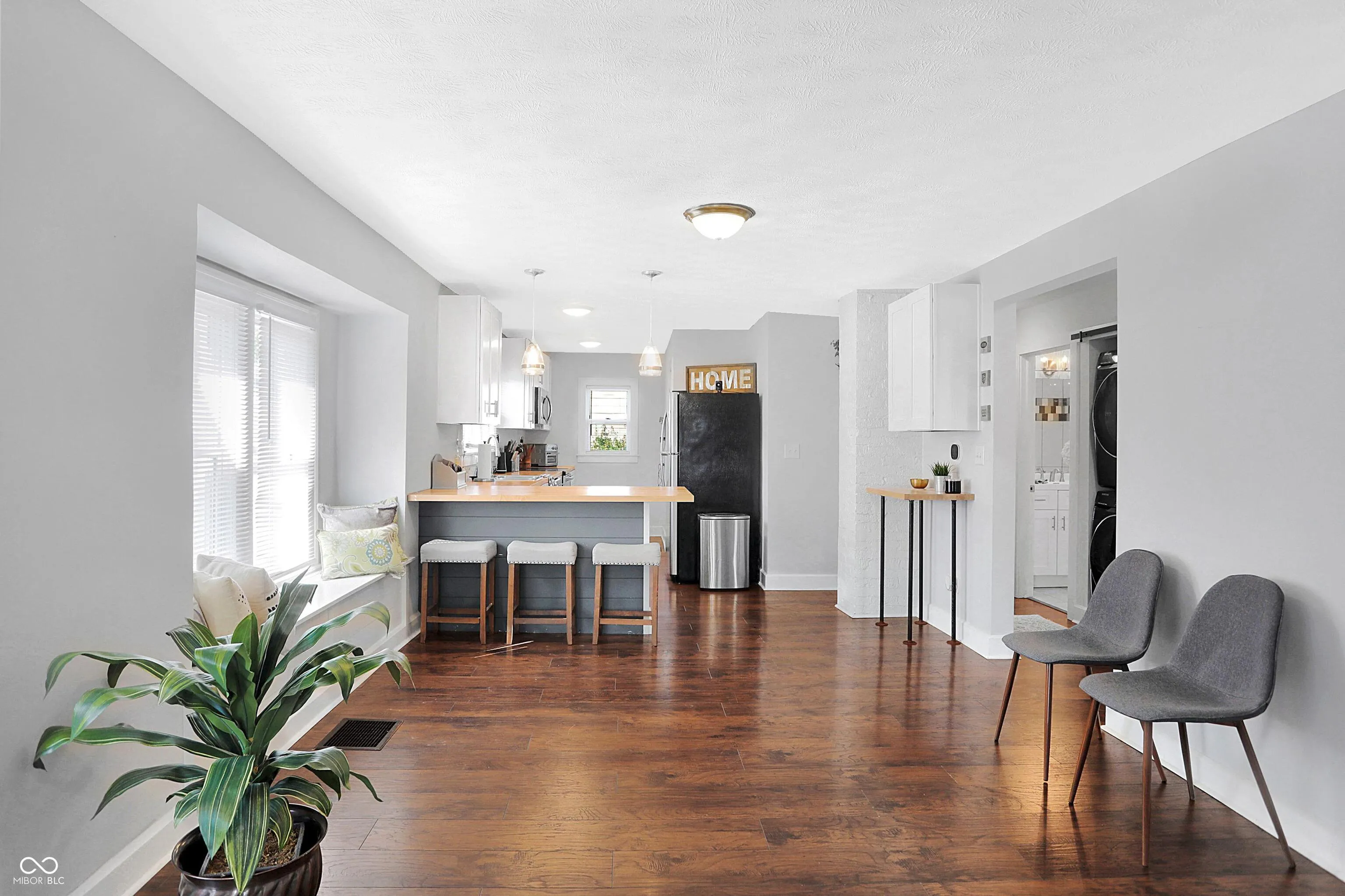 Charming renovated bungalow nestled in the heart of the Emerson Heights Neighborhood! Enjoy relaxing on your covered front porch with a cup of coffee in the morning. As you step inside this delightful home, you’ll immediately notice its fresh, modern updates and thoughtful upgrades. The living spaces feature durable luxury vinyl plank flooring throughout the living room, dining room, kitchen and hallway. Entertaining is a breeze in the open-concept living and dining areas, which flow seamlessly into the updated kitchen. Butcher block counter tops, fresh white cabinetry, stainless appliances and built in shelving. Each bedroom is carpeted with large walk in closets. The laundry features stackable washer/dryer in the hallway hiding behind a quaint barn door. The main full bath features a tub/shower combination and large vanity with plenty of storage. There is also a half bath in the hall for guests. The basement offers the convenience of spacious storage and potential to finish. Step outside to your quaint privacy-fenced back paver patio. Nice private driveway with side bump out and a 1 car garage with automatic opener. This home’s prime location provides easy access to all the best of Indy: Irvington, Ellenberger Park, Downtown/Mass Ave, Community Hospital, and I-70. This move-in ready gem is the epitome of easy living. Don’t miss out on the opportunity to make it yours!