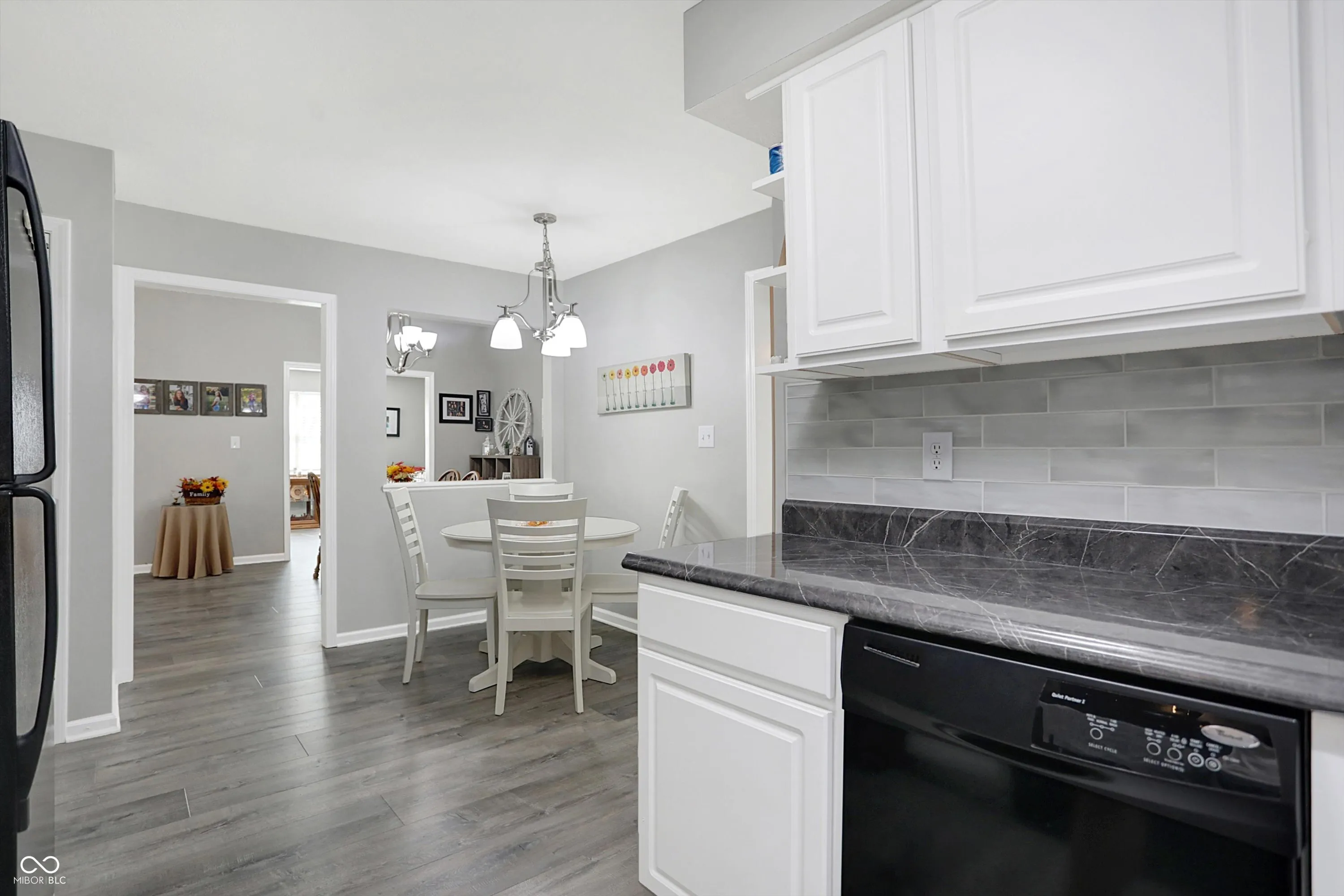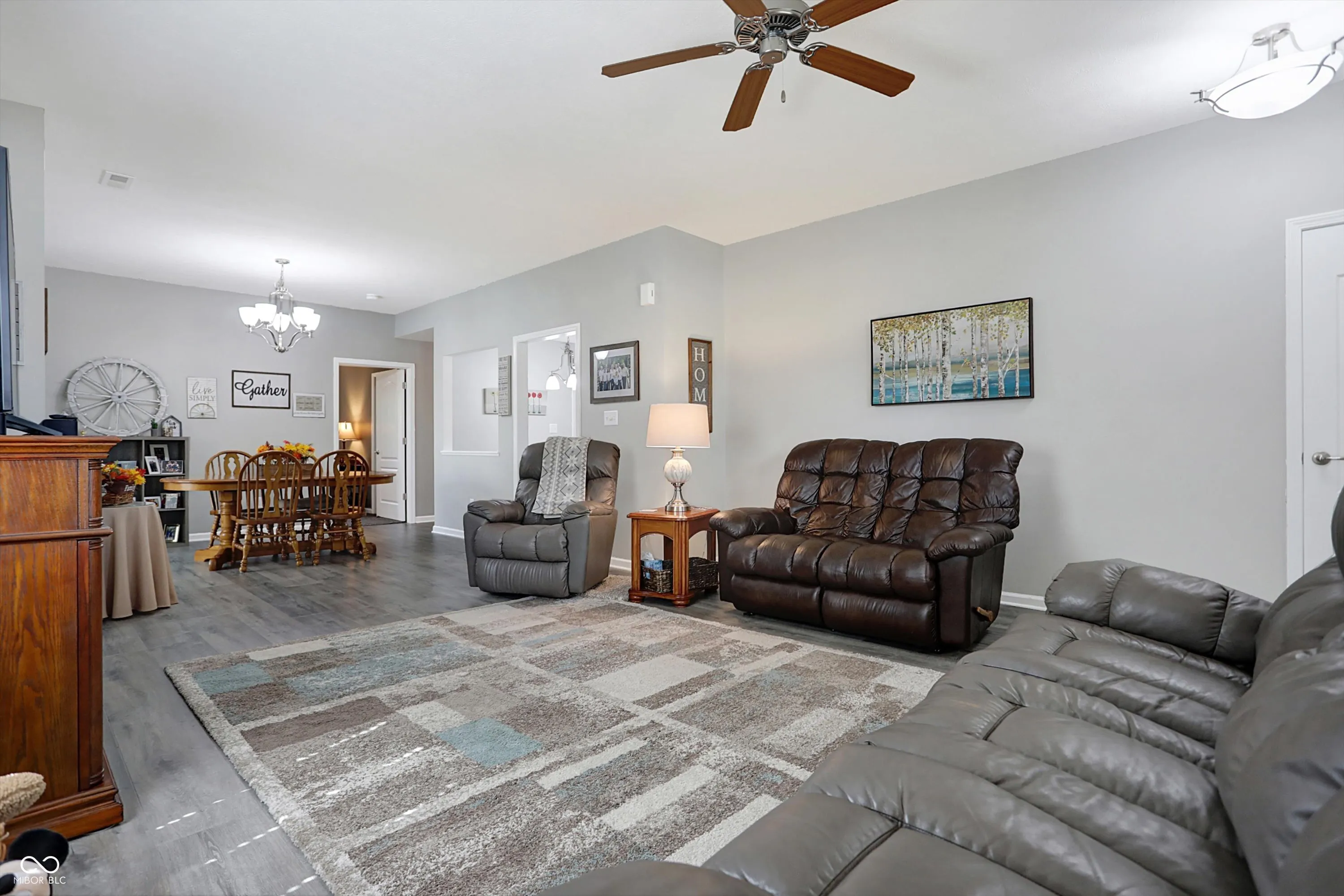 Welcome to this charming 2-bedroom home boasting an inviting open floor plan connecting the living room to the dining room. The home has easy mobility with upgraded laminate floors throughout except carpets in the bedrooms. The kitchen appliances, refrigerator, range, microwave and dishwasher feature reverse osmosis water system on the kitchen sink and also has a water softener. The master bedroom features a spacious walk-in closet and a private master bath for added convenience. The home features a rear fenced yard with pet access through the sun and three season room, also new paint on the exterior and new garage door (2 years). Home is beautifully landscaped with mature trees and bushes offering privacy on the side and back of the home.
