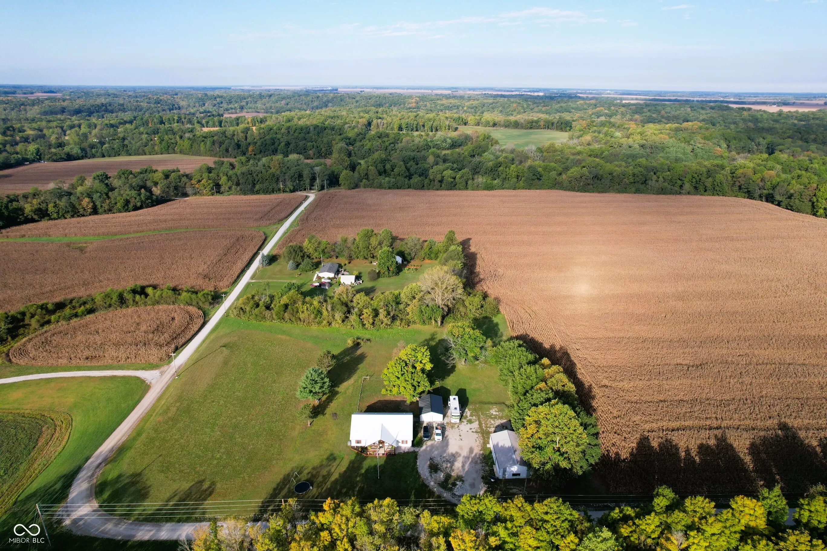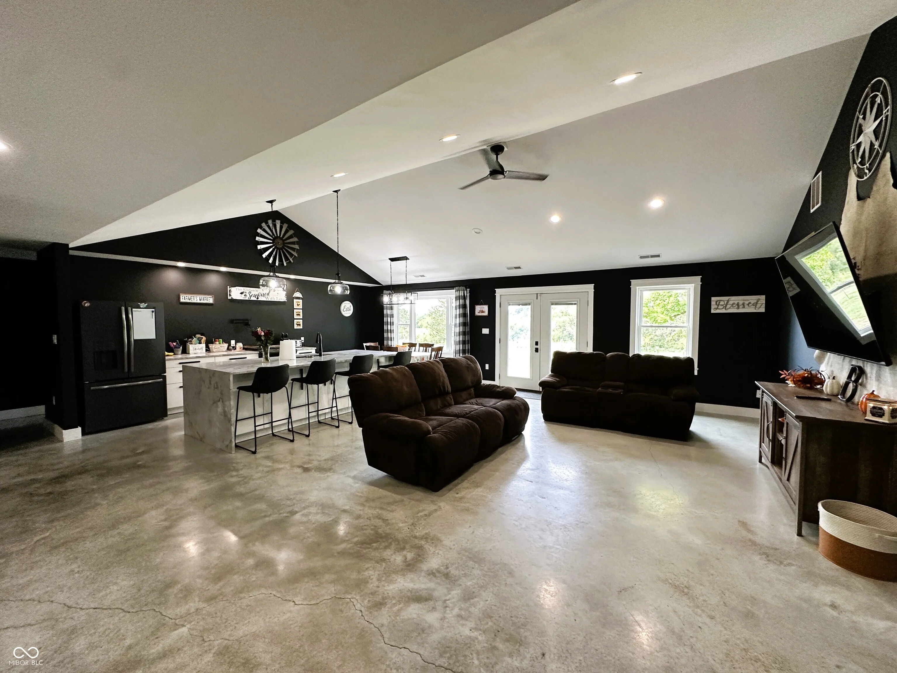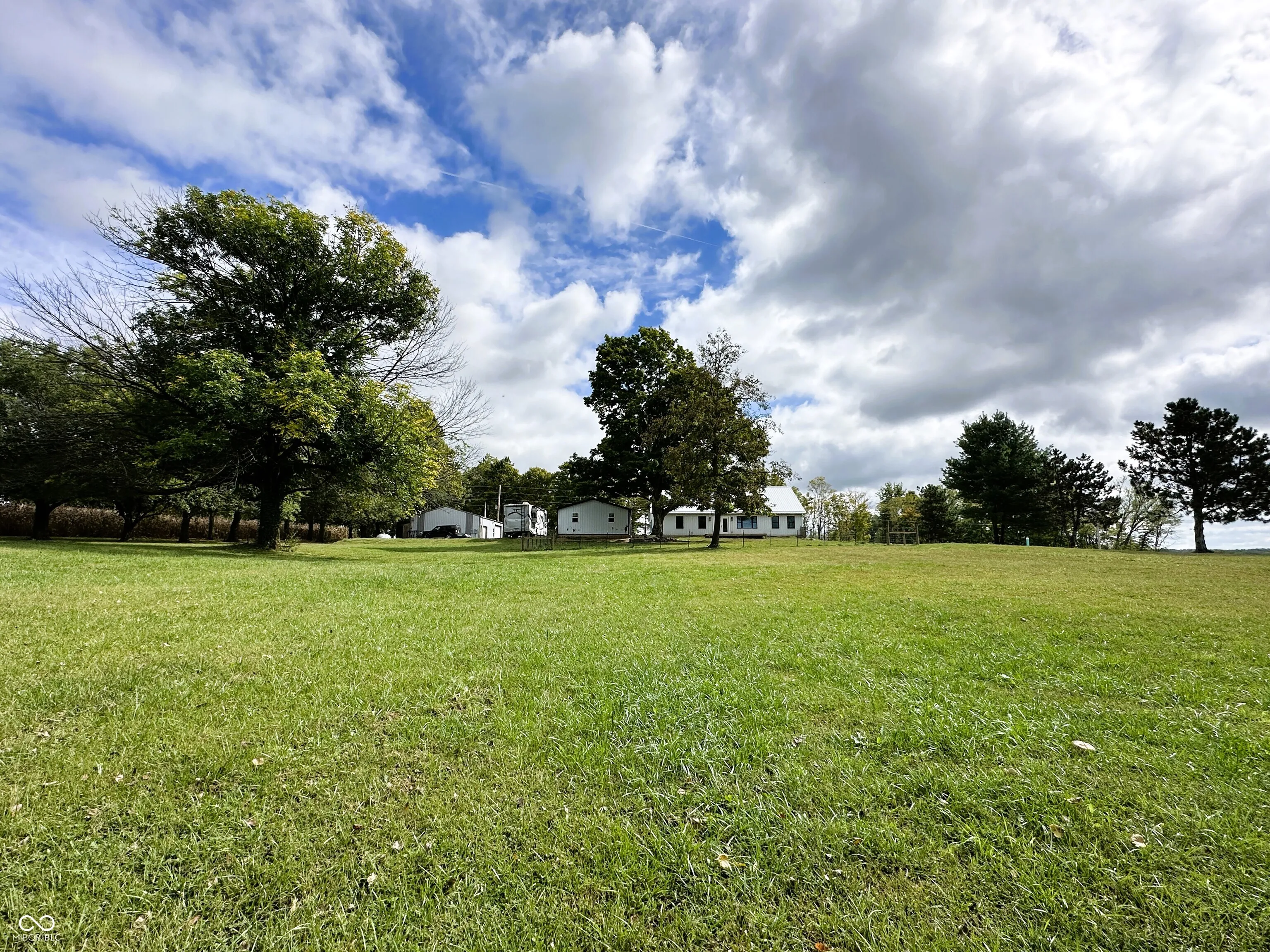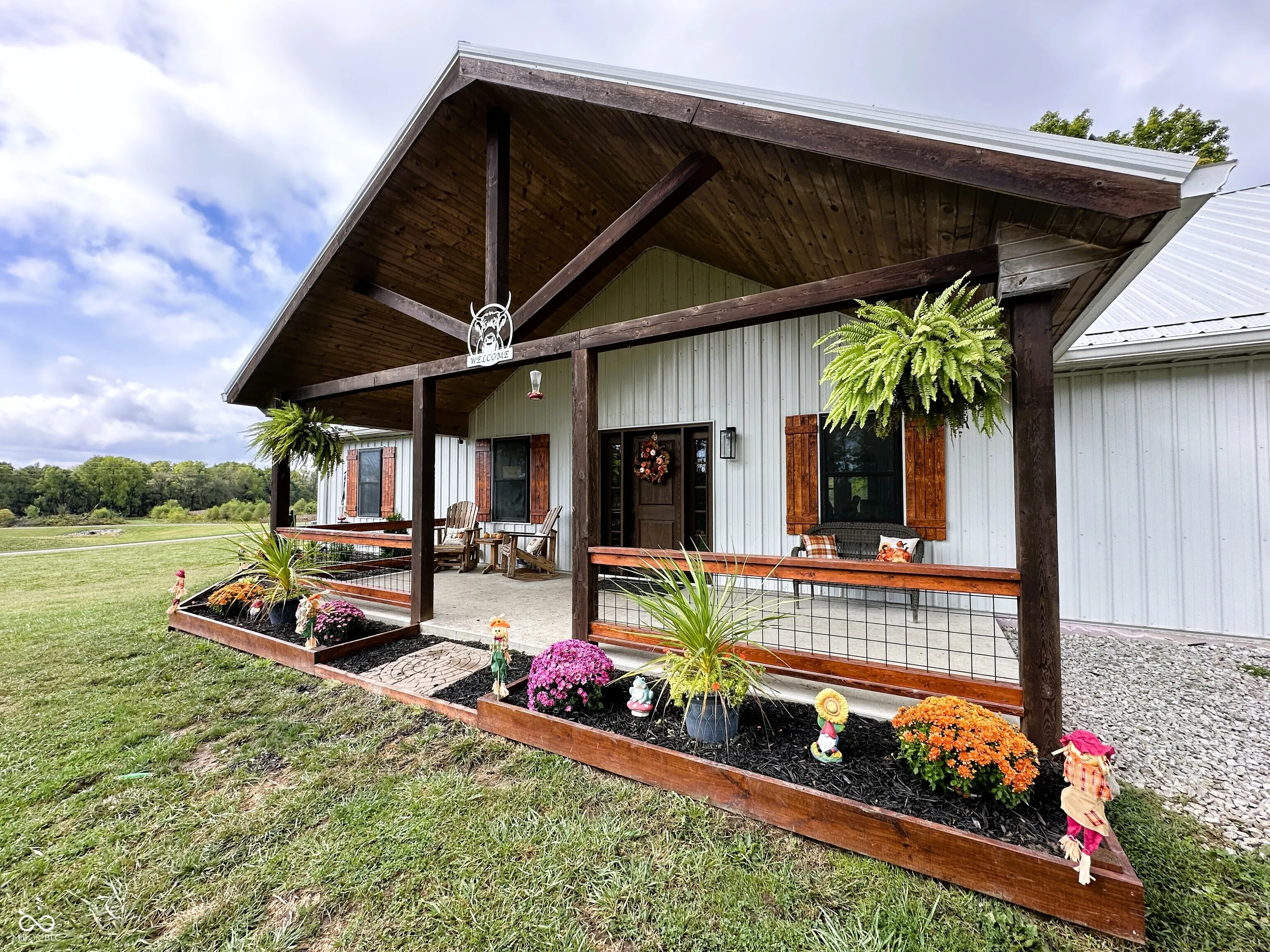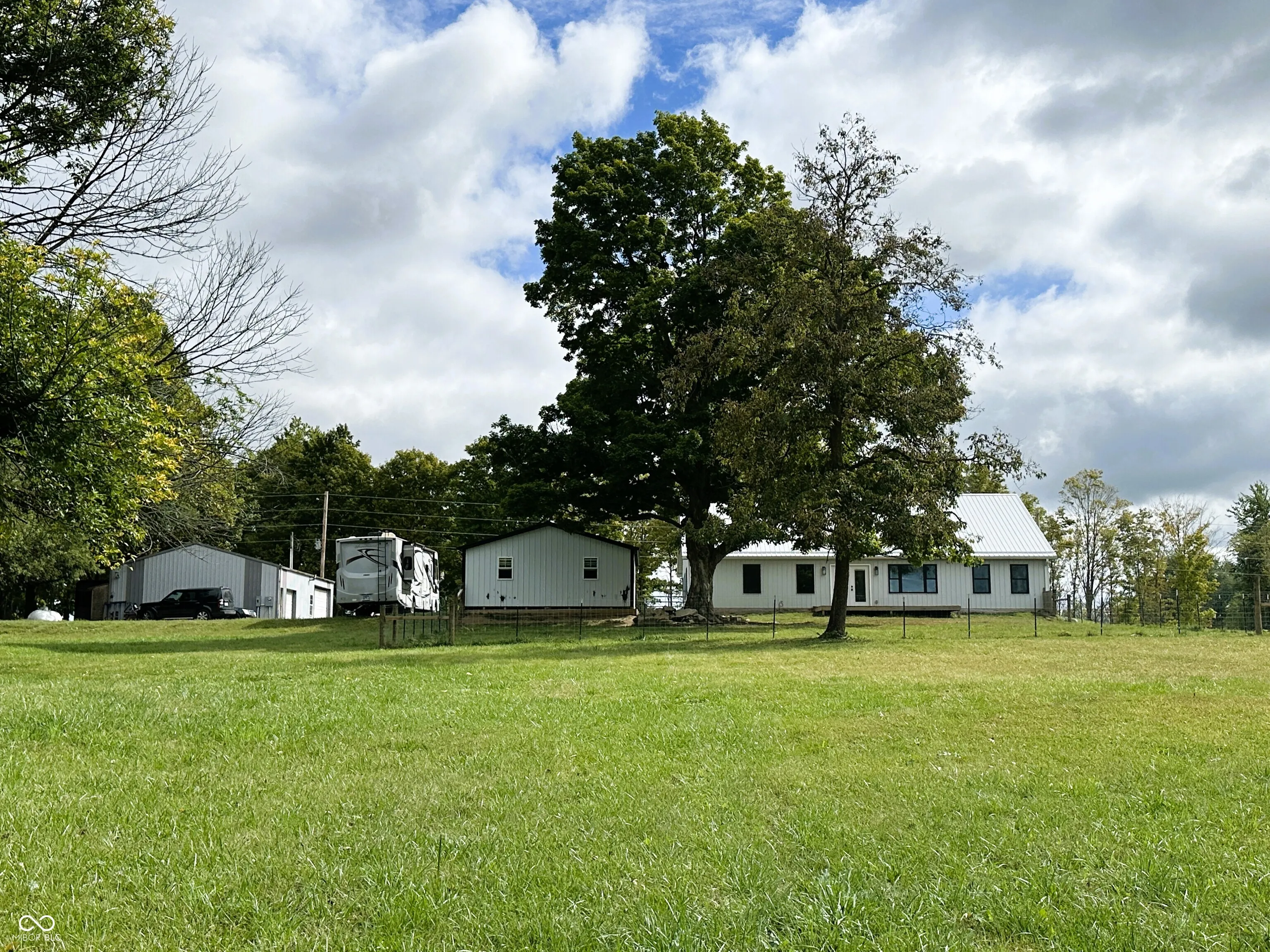 This custom-built 2,240 SF, 4 BR, 2 Full BA Barndominium on 4 country acres is the stuff that dreams are made of! Wide open spaces all around, plus a MASSIVE 1,440 SF heated Pole Barn/Workshop AND an 864 SF detached 2-car Garage added in 2022 that combined provide parking for 6+ vehicles! Built in 2019, this Barndo features an expansive open concept central living space w/ soaring cathedral ceilings & Great Room/Kitchen/Dining Room combined. Tons of natural light, matte black walls, bright white ceilings & shiny concrete floors add to the modern feel of this space. The Kitchen is anchored by a Dolomite stone waterfall island/breakfast bar w/ an amazing amount of cabinet space. Black SS gas stove, refrigerator, dishwasher & microwave all included. (Don’t overlook the awesome pot filler over the gas stove!) The 9×6 Walk-in Pantry w/ black granite countertop & custom storage cabinets will blow you away! (All cabinets & drawers in the Kitchen AND Pantry are soft close!) Split BR Floorplan w/ private Master BR Suite on the opposite side of the home from the other 3 BRs. There is SO much natural light in the Master BR overlooking the scenic backyard, plus a HUGE 13×10 spa-like Master BA w/ double vanities & quartz vanity tops, soaker tub, custom tile walk-in wet shower w/ rainforest showerhead, private toilet room, overhead wifi light w/ changing colors & speaker & 10×10 W/IN closet! JUST WOW. BRs 2, 3 & 4 share the 2nd full BA w/ black octagon ceramic tile flooring & quartz vanity top. The spacious Laundry Room/Utility Room is 14×9 & located next to the Master BR W/IN Closet. The attic pulldown stairs in the Laundry Room/Utility Room provide convenient add’l. storage. Double pane, vinyl tilt-in windows throughout. Outside you’ll find a covered front porch w/ cathedral ceiling, open back deck, fenced-in backyard, 3 apple trees, a persimmon tree & expansive country views for miles. 200 amp. electric in house, 100 amp. in Pole Barn & 50 amp. plus RV hook-up in Garage.