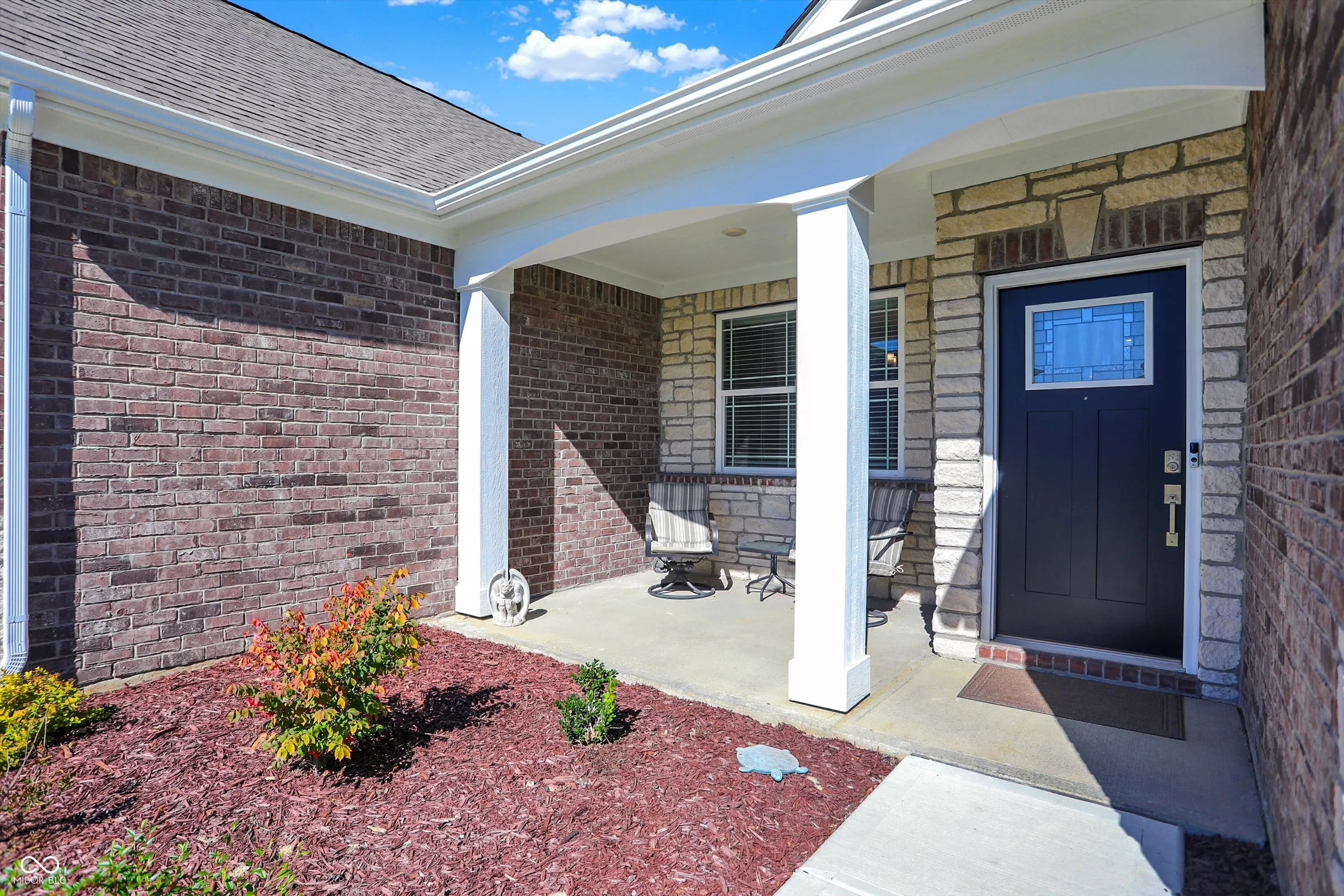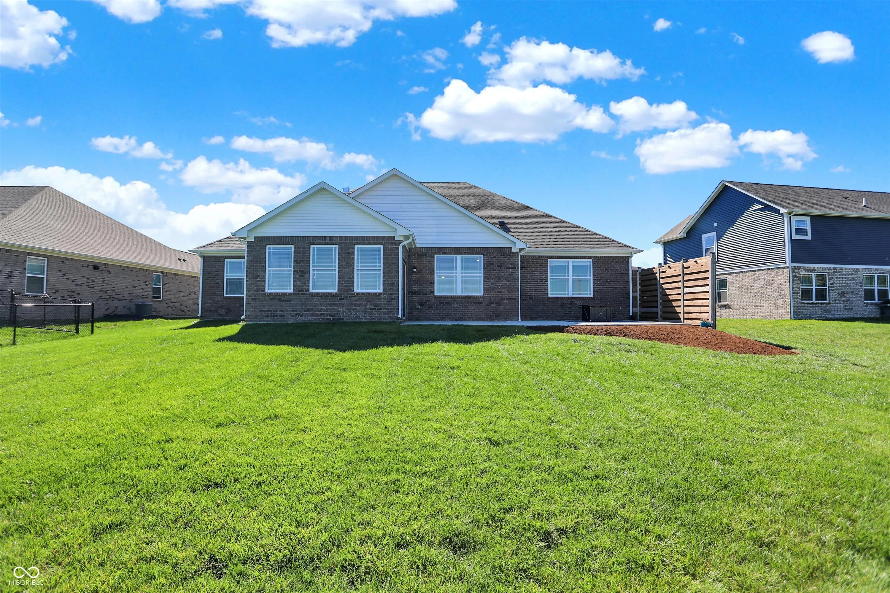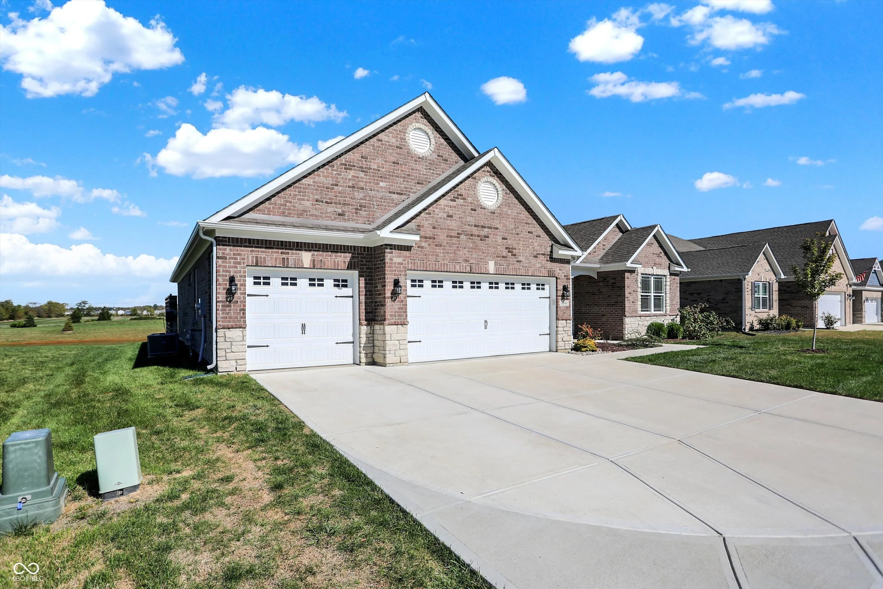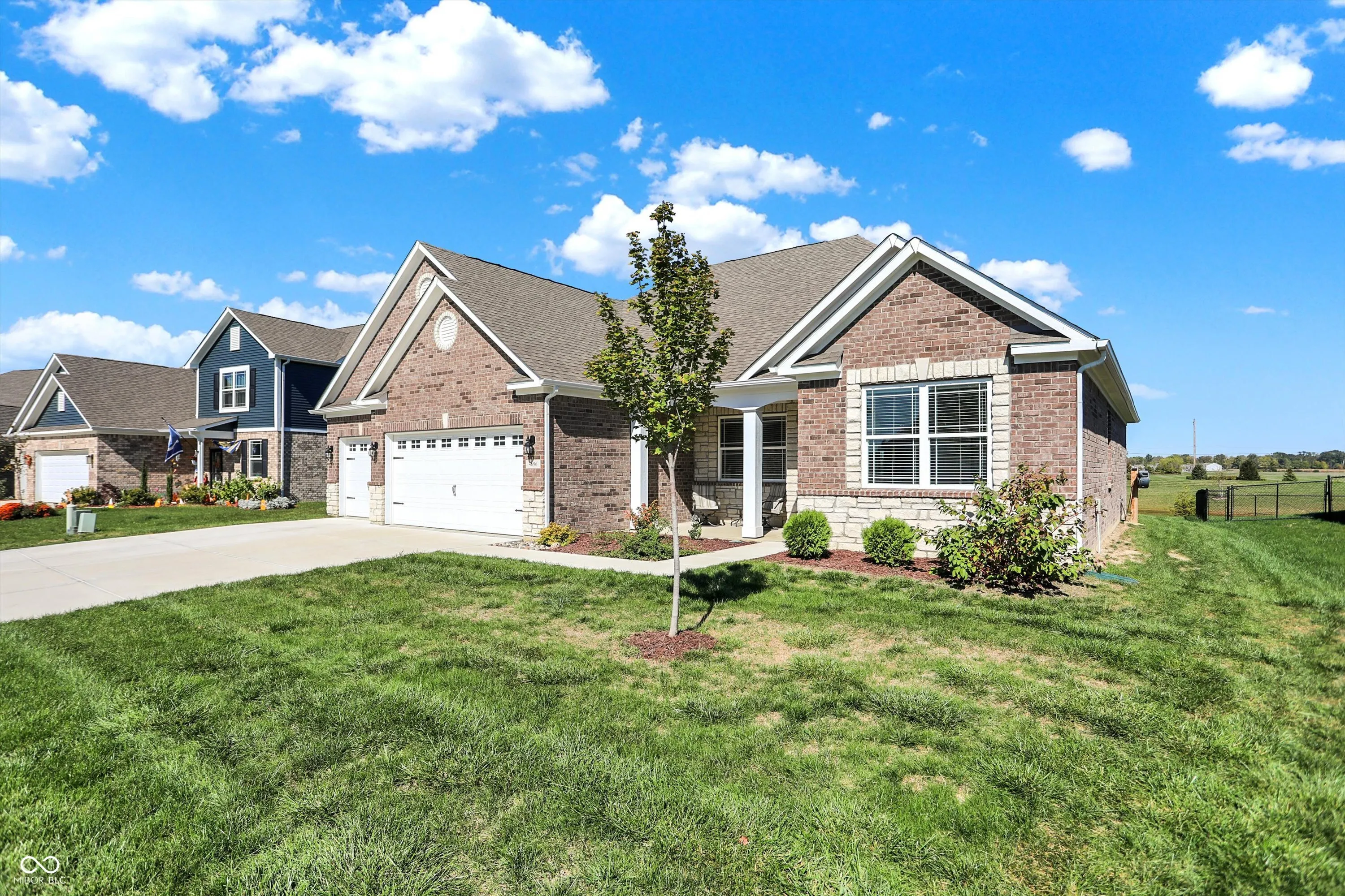 Beautiful like new 2 year old brick ranch with serene pond view and 3-car garage. Enjoy the pond view from the Primary bedroom, 2nd bedroom, Breakfast room, Sunroom with fireplace, and gourmet kitchen featuring built-in double oven, gas cooktop, convection microwave/hood, French door refrigerator, dishwasher, and reverse osmosis faucet at the sink. Additional cabinetry was added after purchase to provide desk space in Kitchen/Breakfast area with file drawer and more cabinetry for storage, as well as cabinetry added in laundry room. Enjoy the view of the pond on the added 28’x16′ rear patio along with custom cedar privacy panel with lights, and the just added patio landscaped area awaiting your plantings. Aqua Systems on-demand water softener. Two inch faux wood blinds on all windows. Primary bath features large double sink vanity & large tiled walk-in shower, as well as large walk-in closet. Bedrooms 2 & 3 also have walk-in closets. Concrete driveway extended for 3rd bay garage. Peace of mind with security sensors on all windows & doors and integrated smoke & carbon monoxide detection, as well as remotely controlled myQ garage doors, video doorbell, and automated door lock. Ceiling fans with lights added in Primary bedroom and Great room. Home currently connected to AT&T fiber for internet.