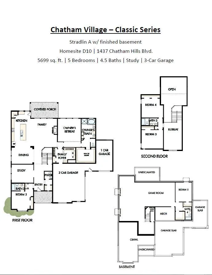 The Stradlin by David Weekley Homes, located in the Chatham Village community, combines luxury and comfort in a spacious, open-concept design. The bright living area features large windows, soaring ceilings, and a cozy shiplap fireplace. The kitchen boasts an expansive 11′ center island, perfect for meal prep, casual dining, and entertaining. The owner’s bedroom offers a peaceful retreat with a spa-like en-suite, including a soaking tub and glass-enclosed shower. The finished basement with a wet bar is ideal for entertaining. Additional features include a study with French doors, an upstairs retreat, and a peaceful back patio. Residents enjoy access to the Chatham Hills clubhouse and amenities, enhancing this exceptional living experience.