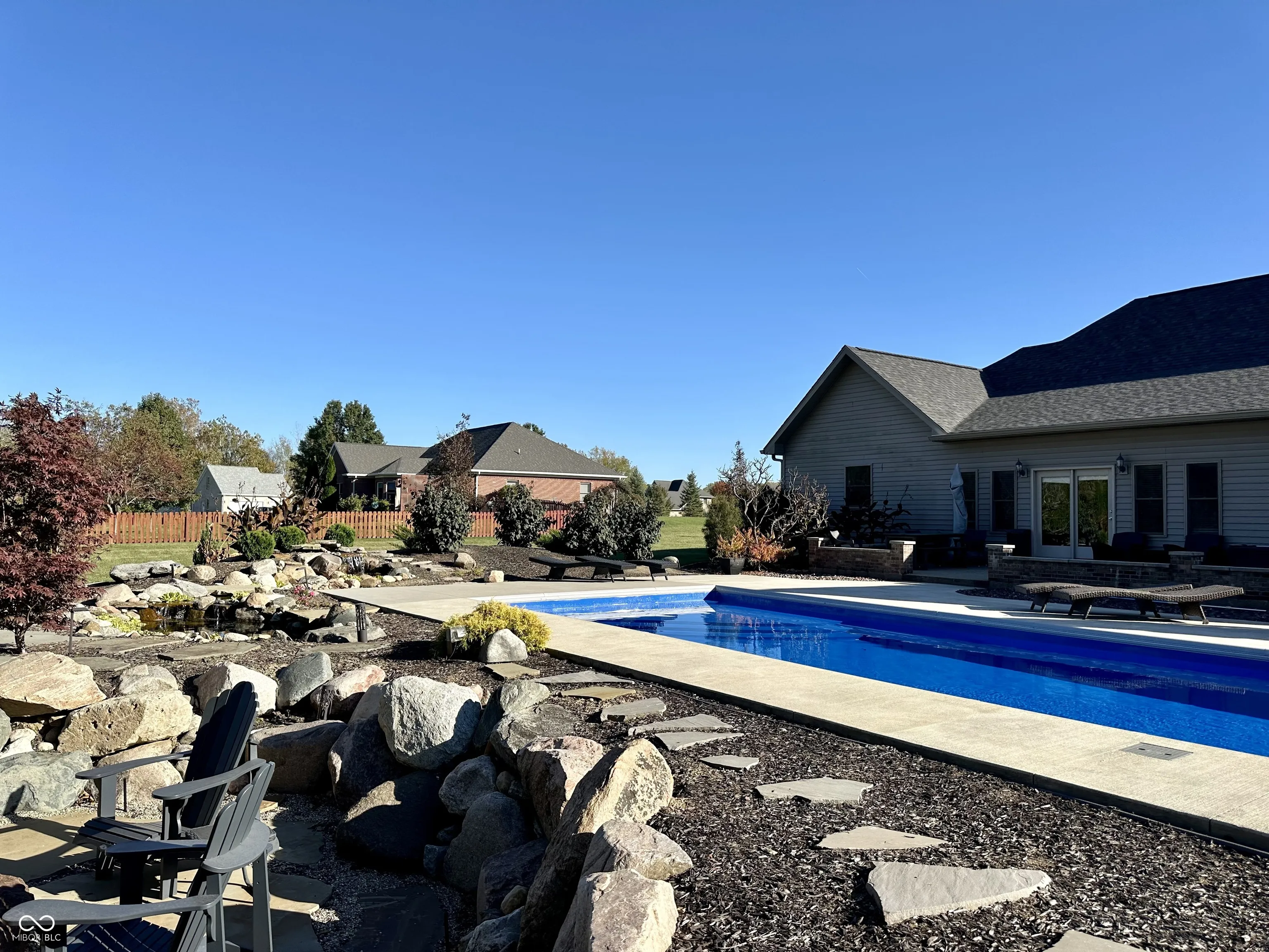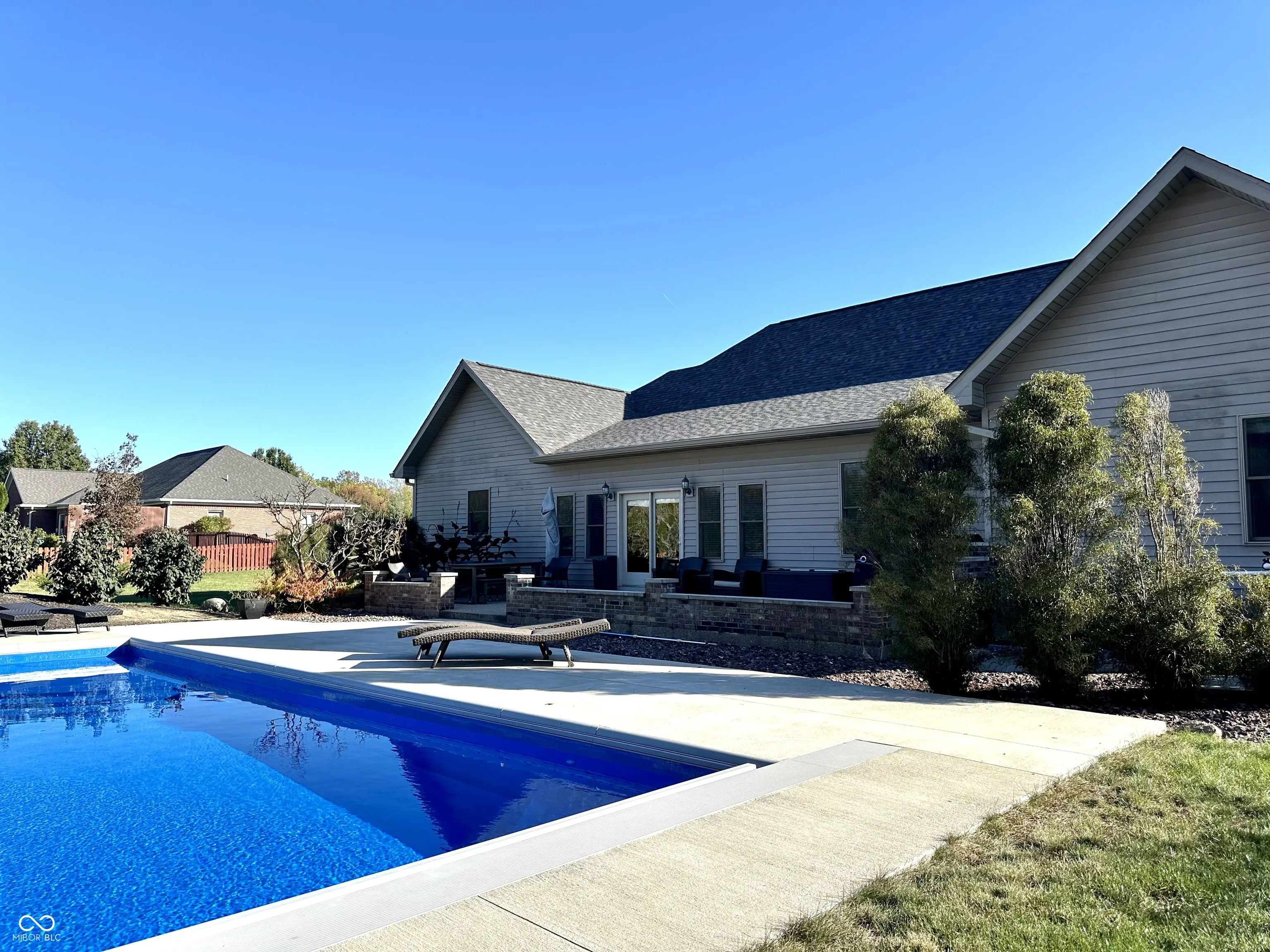 Embrace the epitome of luxury living with this sprawling 3200 sq ft ranch! Step outside to the expansive aggregate patio, where you will find the highlight of this home – an inground salt water, fiberglass pool. Imagine spending your days lounging by the pool, soaking up the sun and enjoying the peaceful sounds of the water. Heated to extend your use and featuring an automatic cover for extra safety. Not only will the pool delight you, but this outdoor oasis also boasts a koi pond with a babbling waterfall. Top it all off with a natural gas fire boulder that creates the perfect ambiance for relaxing at the end of a long workday. But the luxury doesn’t stop there! 4 bedrooms and 3 1/2 baths in a split bedroom floor plan. A large foyer leads into the formal dining area and family room. A corner gas log fireplace with a tile hearth is the focal point of this room. The master suite boasts a sitting area, dual vanities, a jetted air tub, and walk in shower. Two walk-in closets. And when the Indiana winter doesn’t allow you to enjoy the outdoors, this home has a 4 season sunroom that allows you views of the back yard and wooded land behind the home. Recent additions include the following: 2021-pond and pool, 2022- refrigerator, dishwasher, water softener, furnace, and a/c, 2023- roof. Don’t miss the opportunity to own one of the finest homes in the area!