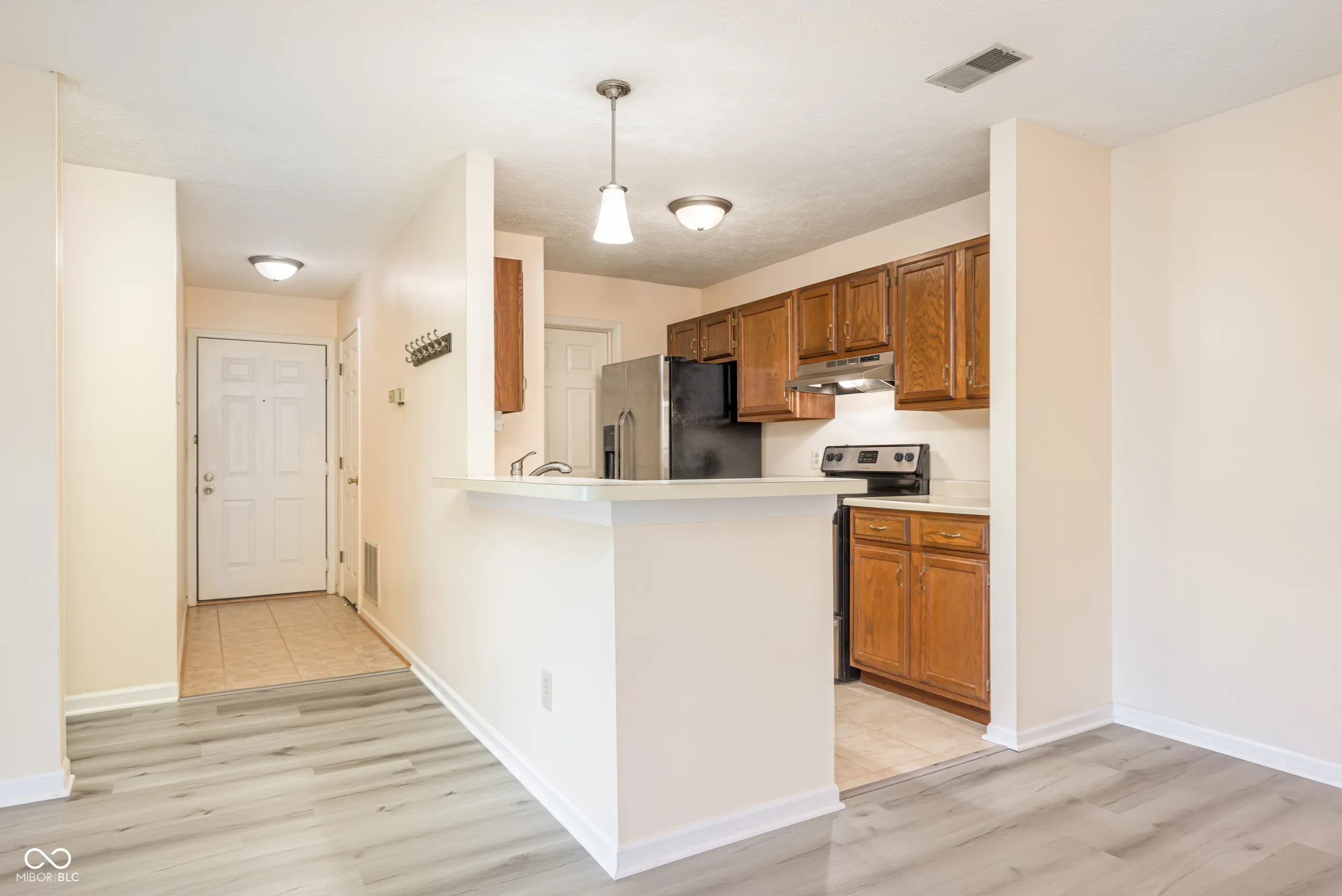 Enjoy this well maintained, 2 bedroom/2 bathroom first floor condominium located in Carmel’s City Center. The galley kitchen has stainless steel appliances, great cabinet space and a convenient breakfast bar. On one end of the kitchen, find plenty of room for a dining table. The other side opens to the laundry/utility room (washer and dryer included and newer HVAC). The open great room has a large sliding door out to the covered back patio. New LVP flooring throughout the great room and bedrooms. The primary bedroom has an ensuite bathroom and walk-in closet. Both bedrooms overlook the back green space with mature trees and landscaping. One designated parking space located close to the entrance is included along with a locked storage closet in the hall. Community clubhouse with amenities including a fitness area, pool, sauna and tennis courts. Close proximity to the Carmel Arts and Design District and easy access to US-31 and Keystone Pkwy.