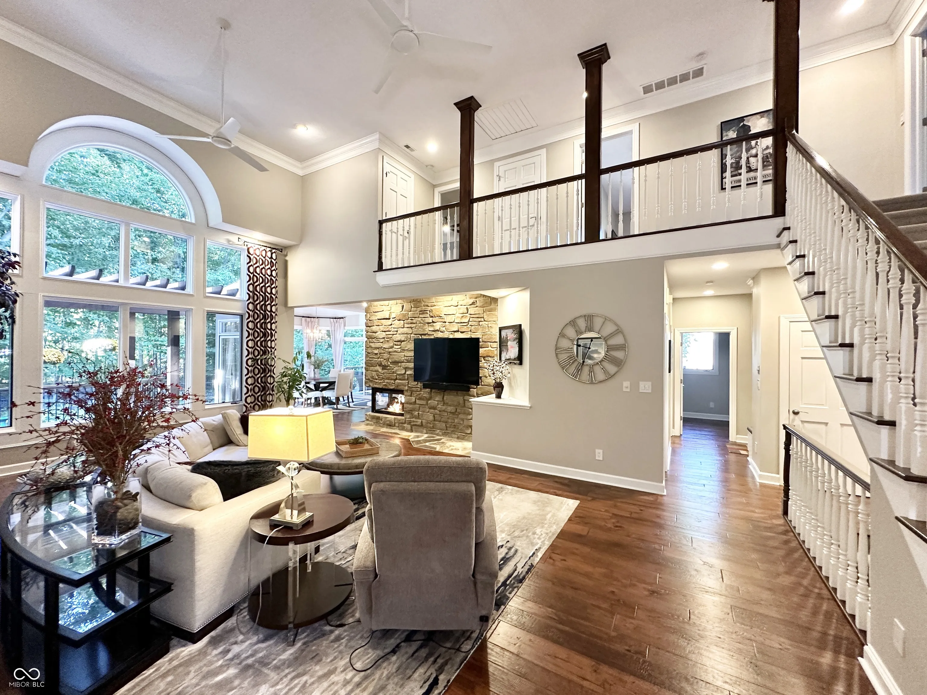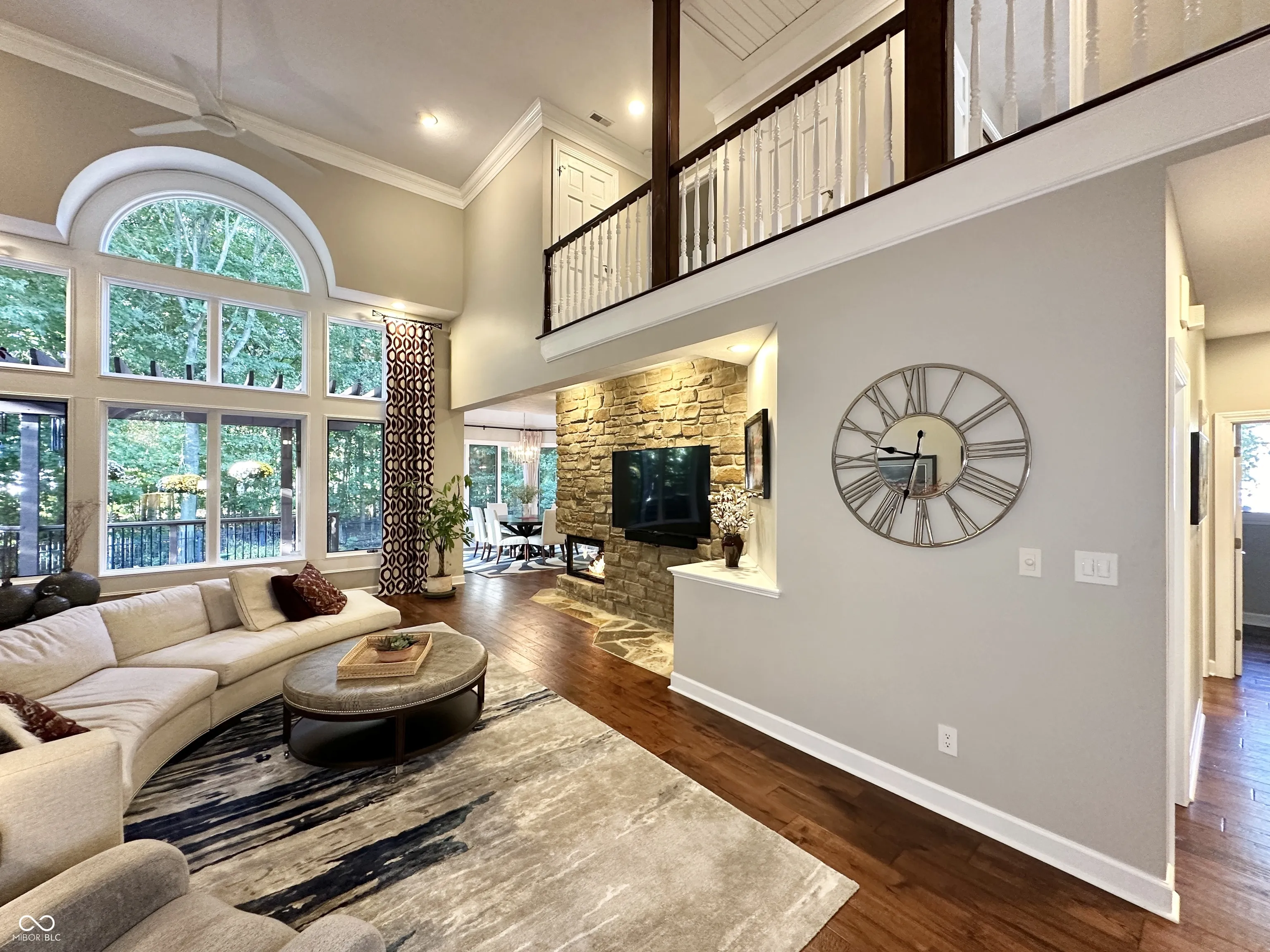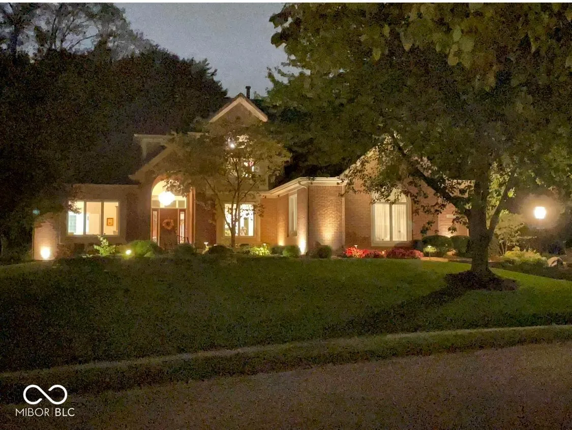 One-of-a-kind, 5 Bedroom, 4.5 Bath, 3-Car garage, custom-built, fully updated home, on half an acre, with elegant design touches and luxurious upgrades throughout. Outstanding great room with 2-story custom glass wall, private wooded view, three-sided gas fireplace that has views from three rooms, sunroom, gourmet kitchen with island, double ovens, stainless steel appliances, engineered hardwood floors, full of upscale finishes and amenities. Start your day sipping coffee on the large screened-in porch, in the gorgeous sunroom, or by the three-sided gas fireplace with custom Indiana limestone mantle. The primary bedroom is on the main and has a beautifully designed, hand-crafted accent wall that makes a bold statement, as does the completely updated primary en-suite with skylights, walk-in closet with sitting area, a full freestanding bathtub, and a full walk-in shower. Then, just outside the primary ensuite, step out to the full back deck and enjoy your private oasis with a jacuzzi spa and room to relax or entertain. The upstairs bedrooms connect via a full bathroom. Home has tons of storage, every bedroom has a walk-in closet, and there is additional storage in the walk-in attic. The finished basement features large egress windows that bring in tons of light, a bedroom with a full bath featuring a backlit marble countertop, a seamless granite bar, a state-of-the-art home entertainment theater with a wall-sized movie viewing screen, projector, sound system, and leather reclining seats, a sitting room with an electric fireplace and a TV, a cellar/storage room with built-in shelving, and a dedicated utility room with a workshop. The laundry room is on the main level and is conveniently located by the mudroom and the garage entry. The large 3-car garage has more storage space and an added RV Plug-In. Located in one of Carmel’s most sought-after communities Bayhill at Waterside, welcome home!