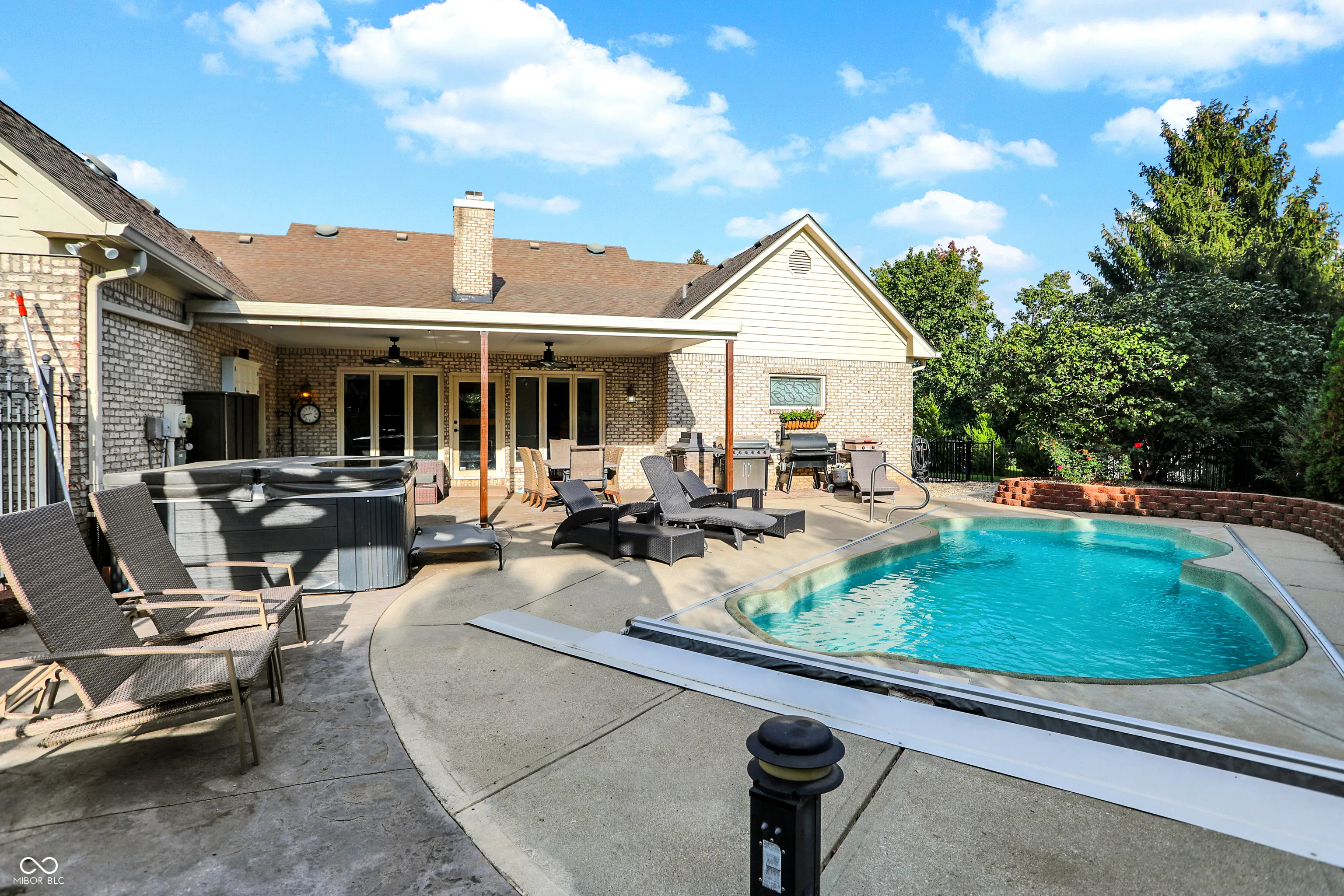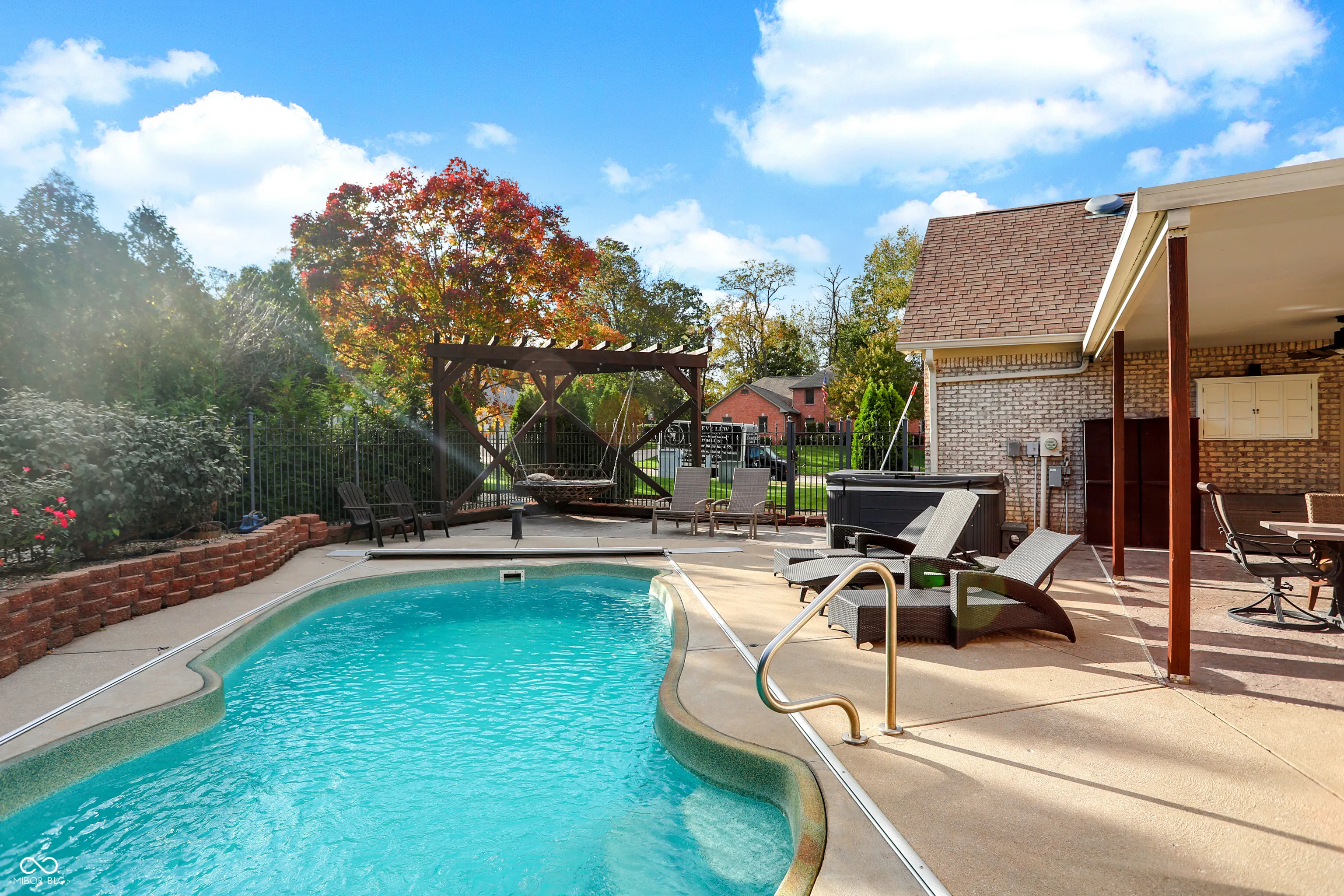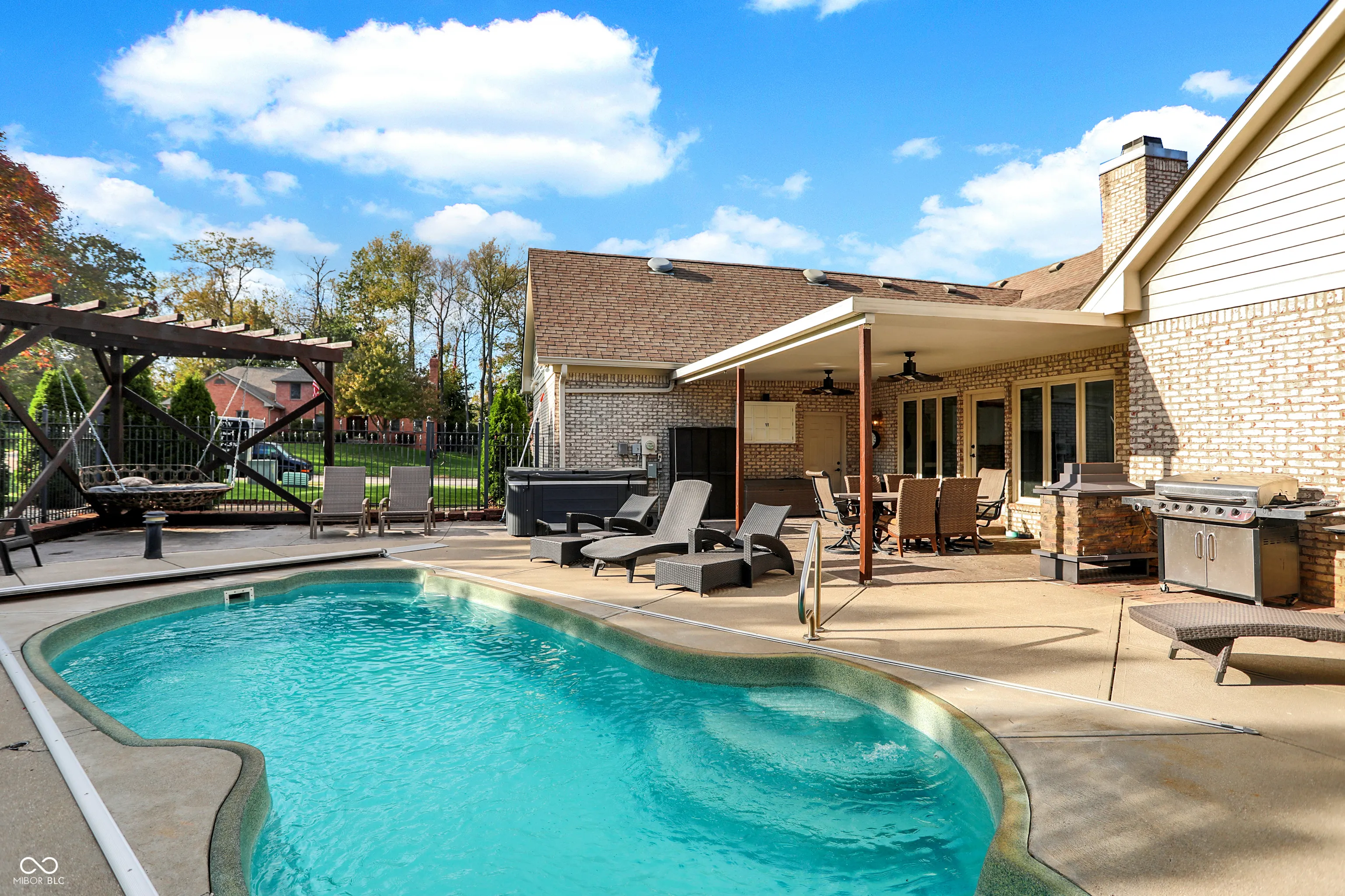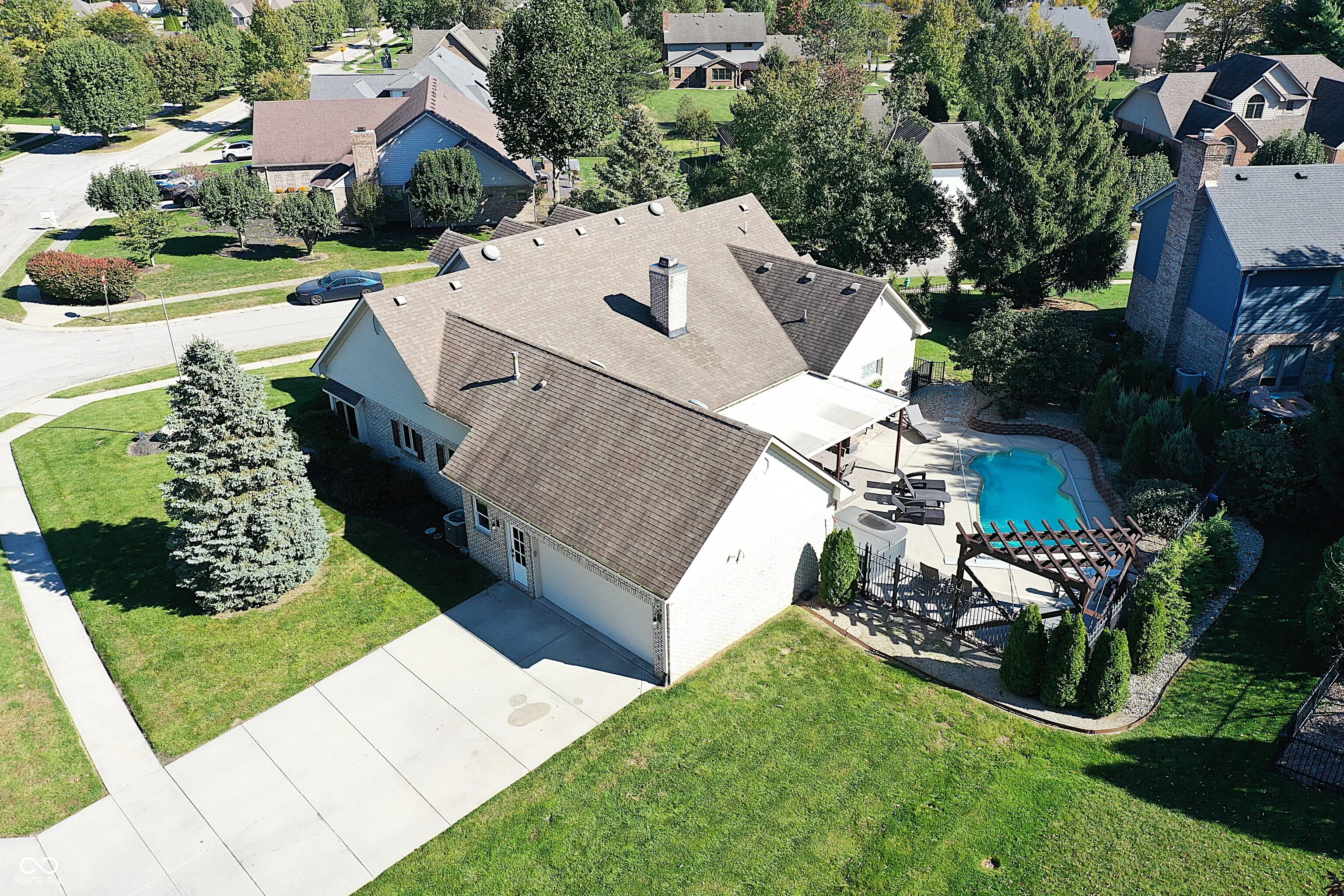 This stunning custom Cape Cod home, situated on an expansive elevated corner lot, offers an impressive in-ground pool and a wealth of high-end features. The charming covered porch welcomes you as you approach, setting the tone for the attention to detail found throughout. Upon entry, you’ll be captivated by the craftsmanship, with custom woodwork and crown molding adorning the main level. The spacious family room, featuring a gas fireplace, provides a cozy retreat for cool Indiana evenings. The kitchen is a chef’s dream, featuring custom cabinetry, high-end stainless steel appliances, a large center island, granite countertops, and an inviting breakfast nook. The main level also includes a stunning primary bedroom with a fully remodeled en-suite bathroom, a guest bedroom, a 13×24 living room with a second fireplace, a formal dining room, and a private office. Upstairs, you’ll find two additional well-appointed bedrooms and a full bath, providing ample space for family or guests. Step outside to your private outdoor oasis, complete with a beautiful in-ground pool, a covered patio, a hot tub, and a custom-built swing-perfect for relaxation and entertainment. Conveniently located near shopping, dining, and major highways, this exceptional home combines luxury and convenience. Don’t miss the opportunity to own this one-of-a-kind property!