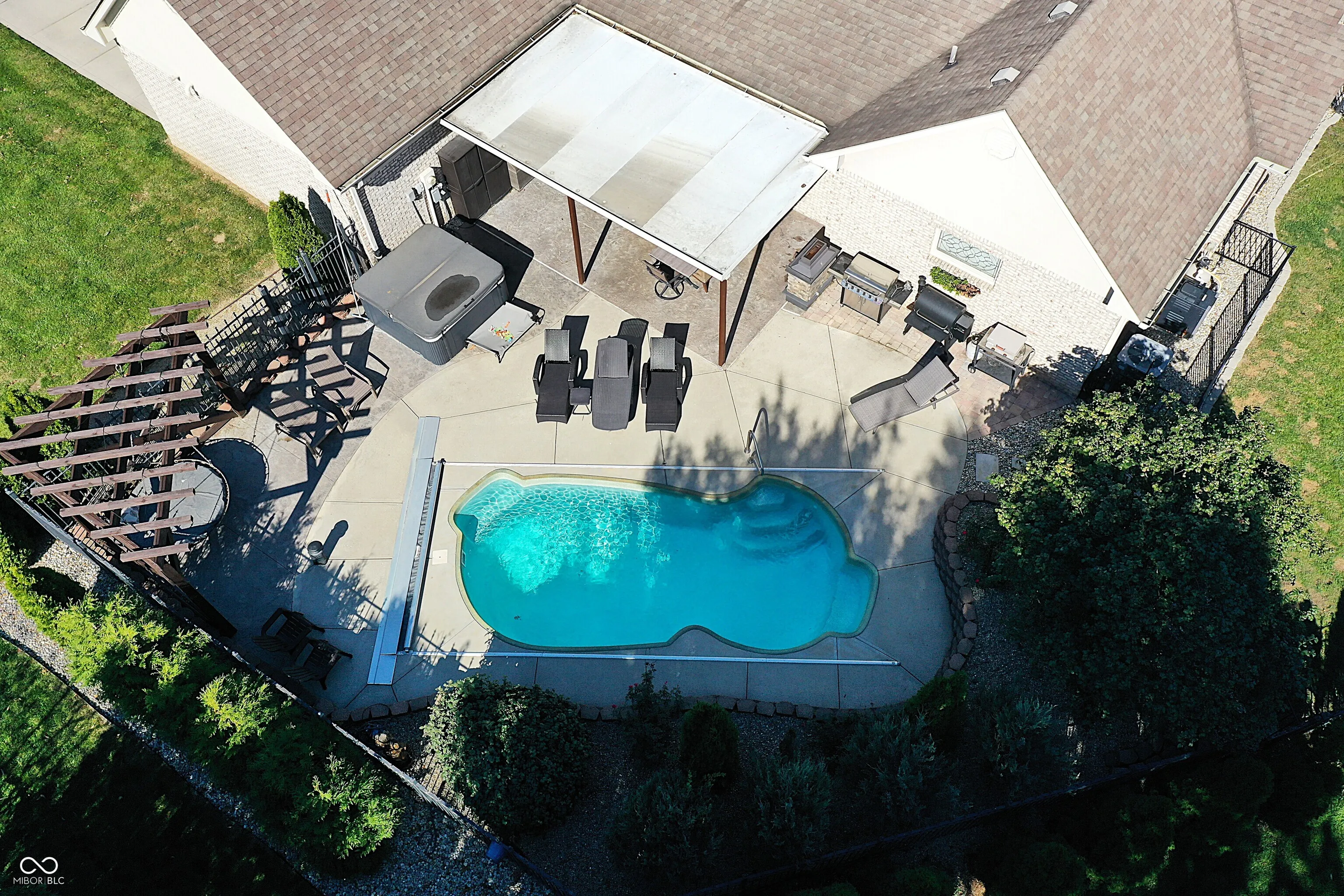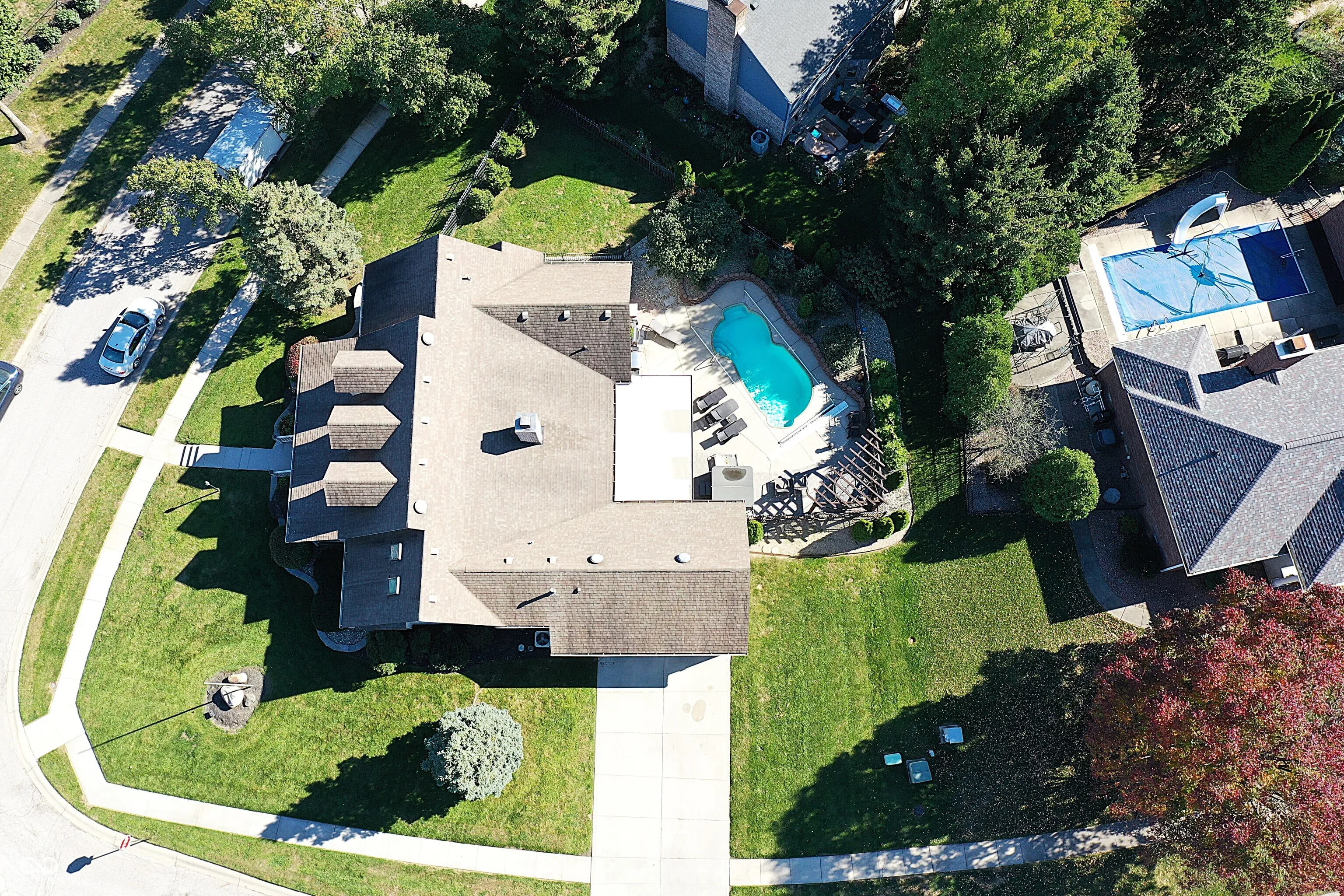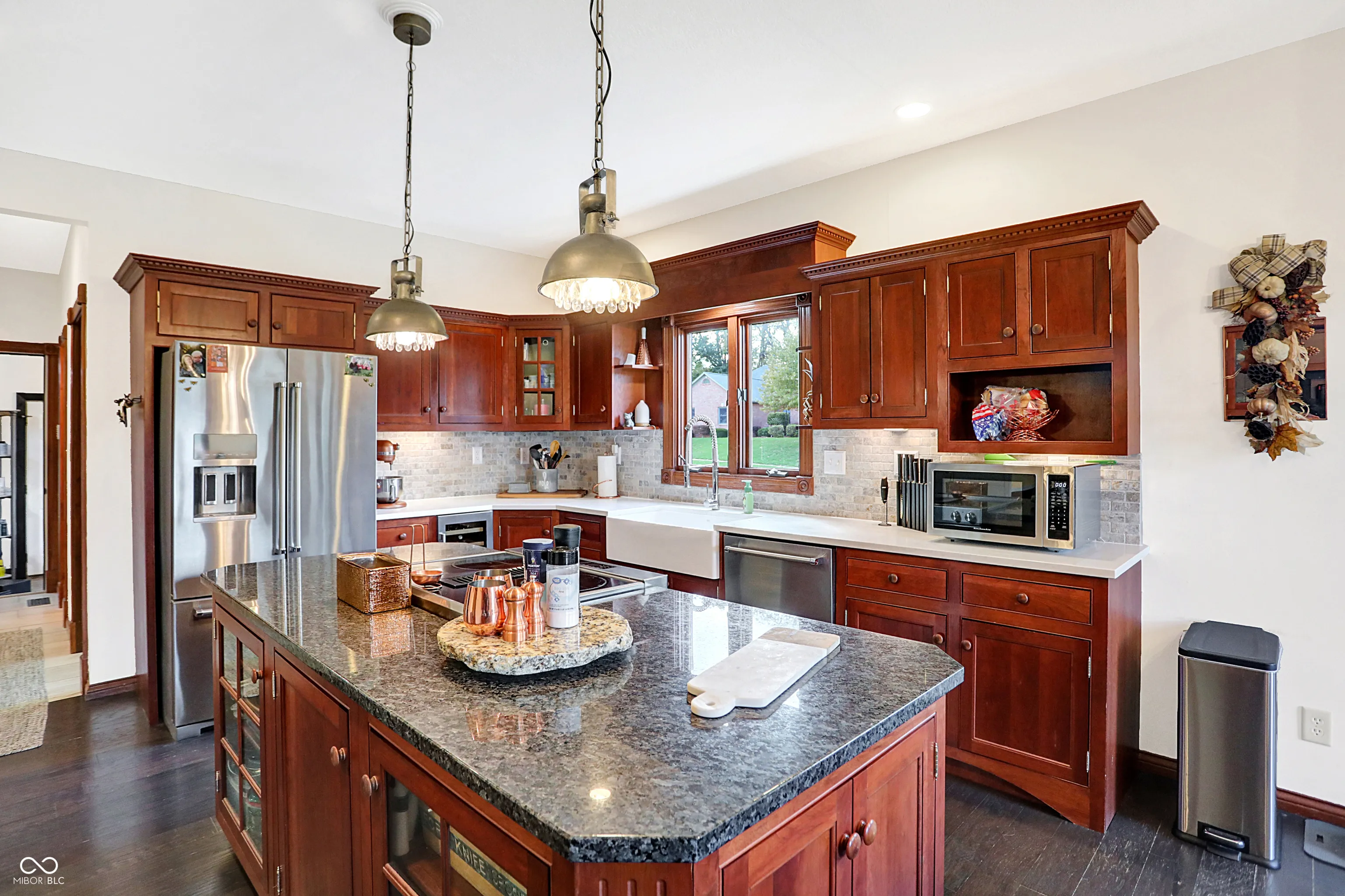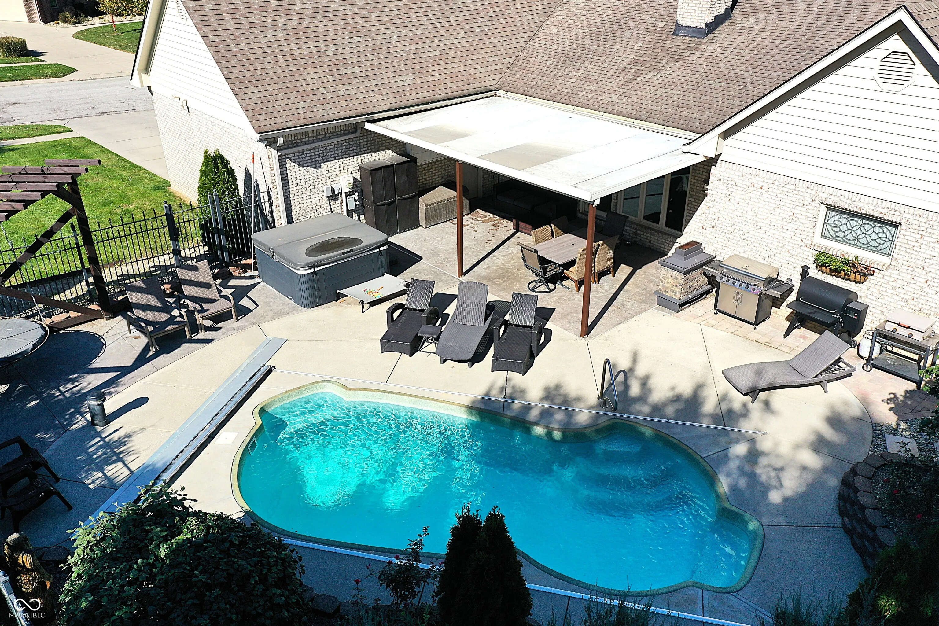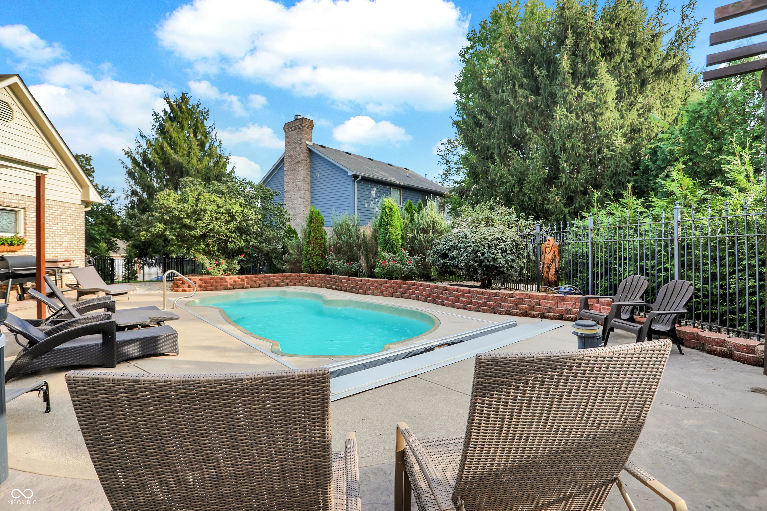This stunning custom Cape Cod home, situated on an expansive elevated corner lot, offers an impressive in-ground pool and a wealth of high-end features. The charming covered porch welcomes you as you approach, setting the tone for the attention to detail found throughout. Upon entry, you’ll be captivated by the craftsmanship, with custom woodwork and crown molding adorning the main level. The spacious family room, featuring a gas fireplace, provides a cozy retreat for cool Indiana evenings. The kitchen is a chef’s dream, featuring custom cabinetry, high-end stainless steel appliances, a large center island, granite countertops, and an inviting breakfast nook. The main level also includes a stunning primary bedroom with a fully remodeled en-suite bathroom, a guest bedroom, a 13×24 living room with a second fireplace, a formal dining room, and a private office. Upstairs, you’ll find two additional well-appointed bedrooms and a full bath, providing ample space for family or guests. Step outside to your private outdoor oasis, complete with a beautiful in-ground pool, a covered patio, a hot tub, and a custom-built swing-perfect for relaxation and entertainment. Conveniently located near shopping, dining, and major highways, this exceptional home combines luxury and convenience. Don’t miss the opportunity to own this one-of-a-kind property!