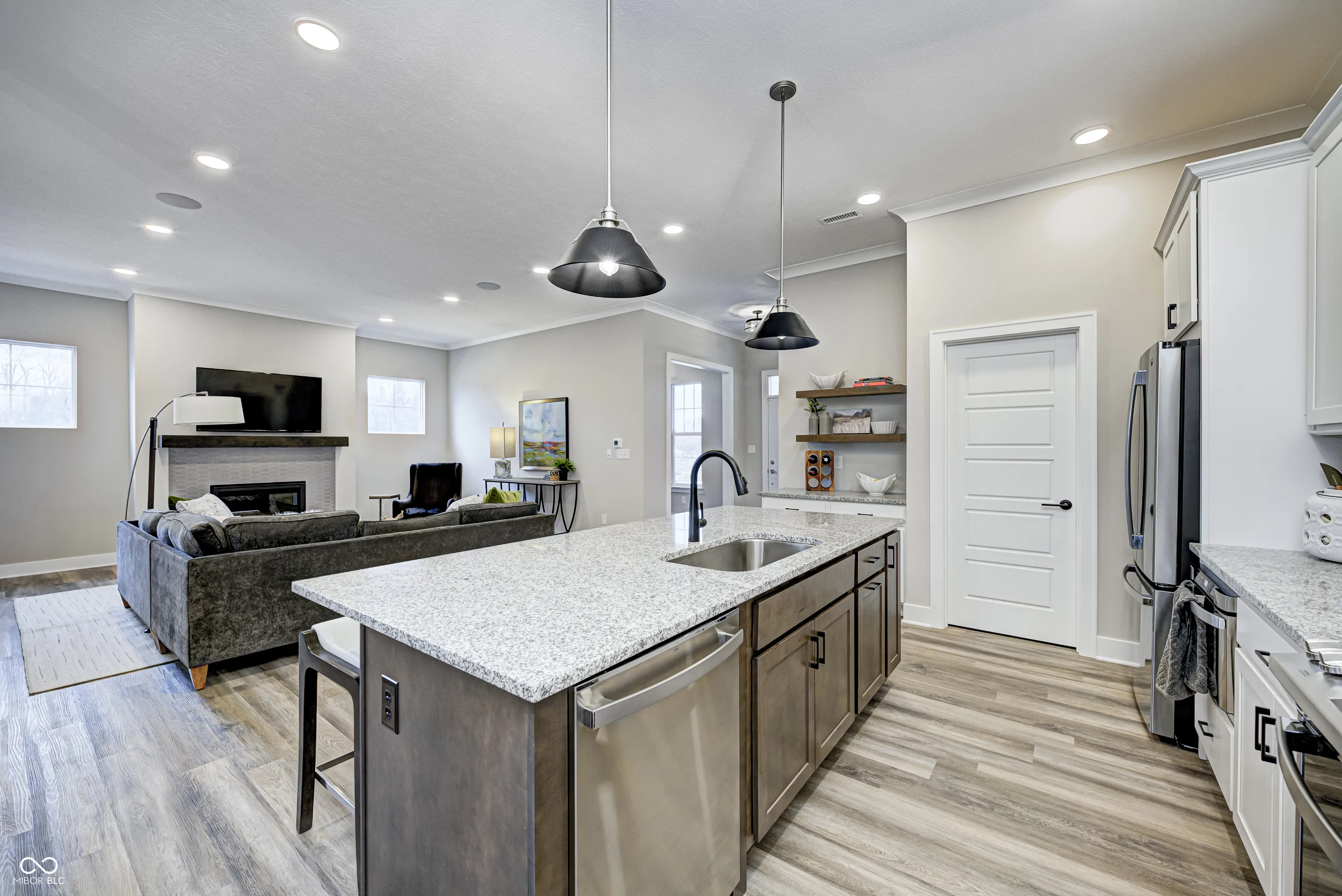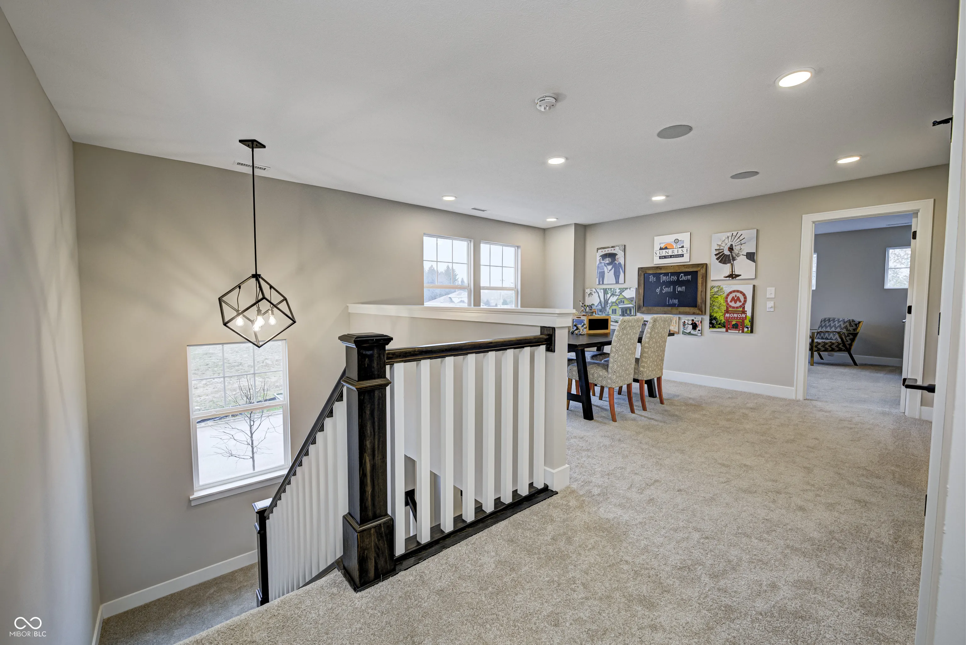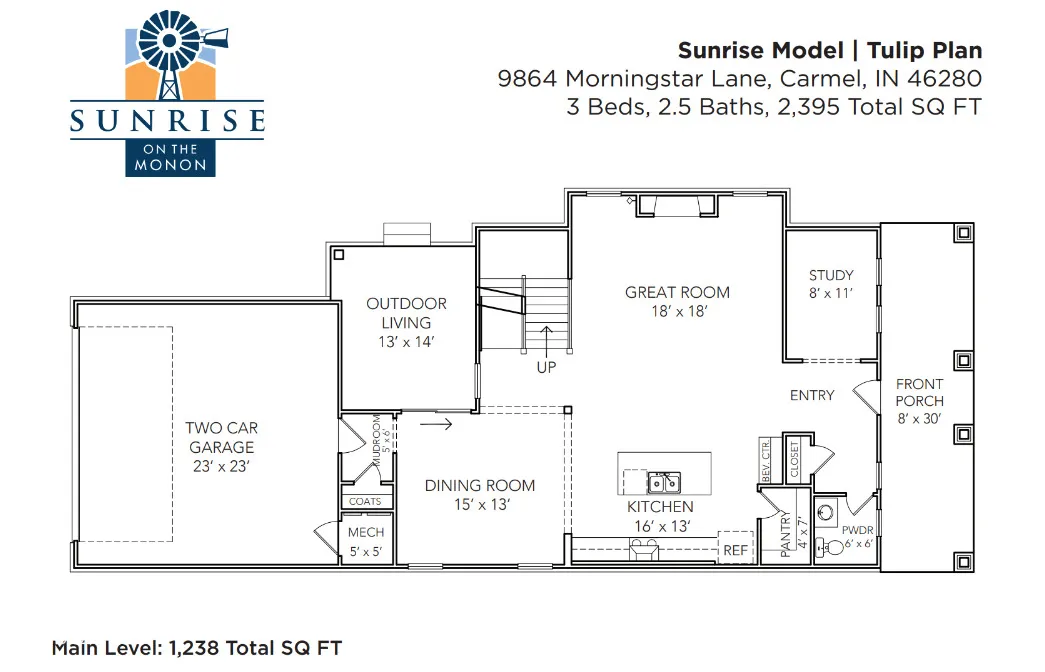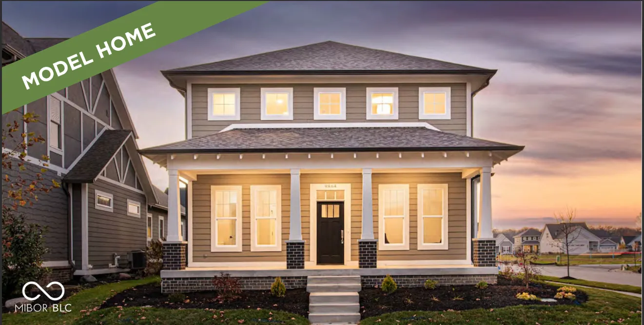 MODEL HOME FOR SALE – The Tulip, now available! This Craftsman home, nestled in the heart of Sunrise on the Monon, is an inviting 3-bedroom, 2.5-bathroom residence offering a perfect blend of traditional charm and modern comfort. The 10′ ceilings paired with an abundance of windows on the main level allow for tons of natural light and an open feel. The oversized pocket office provides a dedicated workspace with a tranquil pond view off the front porch. An inviting great room with cozy gas fireplace opens up to a well appointed kitchen area. Cooking enthusiasts will appreciate the oversized granite island, tile backsplash, stainless steel appliances, painted cabinets, beverage center with floating shelves and walk-in corner pantry with custom shelving. Unwind on the large 30×8 covered front porch, or enjoy al fresco dining under the covered outdoor living space – complete with built-in outdoor speakers. Upstairs, the loft area offers a versatile second living space, ideal for a family room, game room, or flex space. Additionally, you’ll find a large upper level laundry room as well as all three bedrooms, each with generous walk-in closets. The primary suite showcases double sinks with ample under-sink storage and a generous tiled-to-the-ceiling shower, plus plenty of room for oversized furniture. Professionally landscaped yard and irrigation system. The finished 2-car alley-load garage provides ample storage space for all your needs. Sunrise on the Monon is an established community with in a central location with a direct connection to the Monon Trail and easy access to Keystone, US-31, and I-465. Also included with the purchase of this home: a complimentary 1-year household membership to the Monon Community Center.