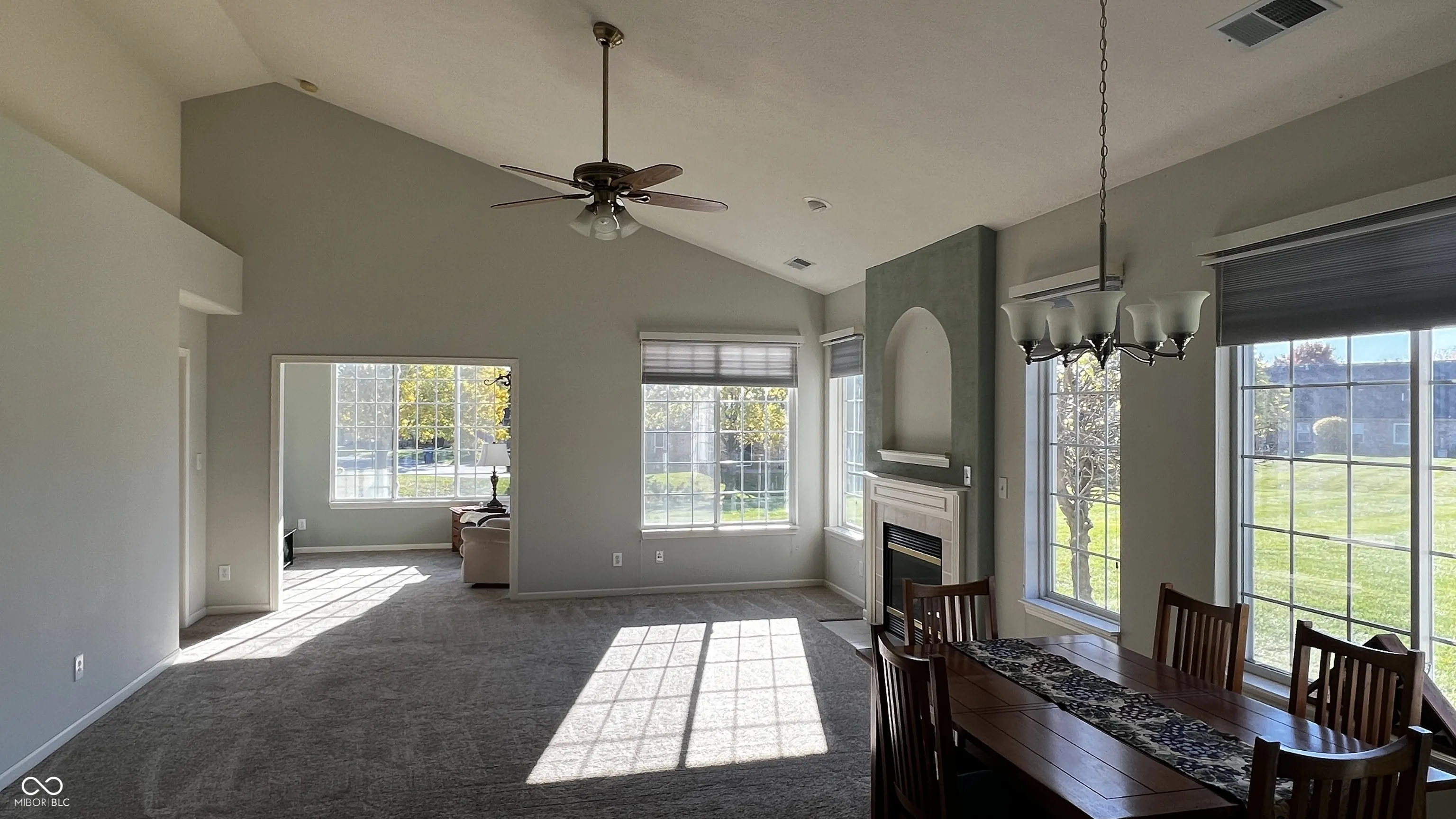 Height and drama of spacious cathedral ceiling great room with the cozy gas fireplace. Oversized windows provide plenty of sunlight. Main level primary bedroom suite with walk-in closet and private bathroom. 9′ ceiling in all main level bedrooms. Enjoy your morning coffee or book in the all season sunroom. Kitchen has an eat-in area or the great room has room for dining. HOA does the lawncare, snow removal, and maintains the irrigation systems all for only $85/month.