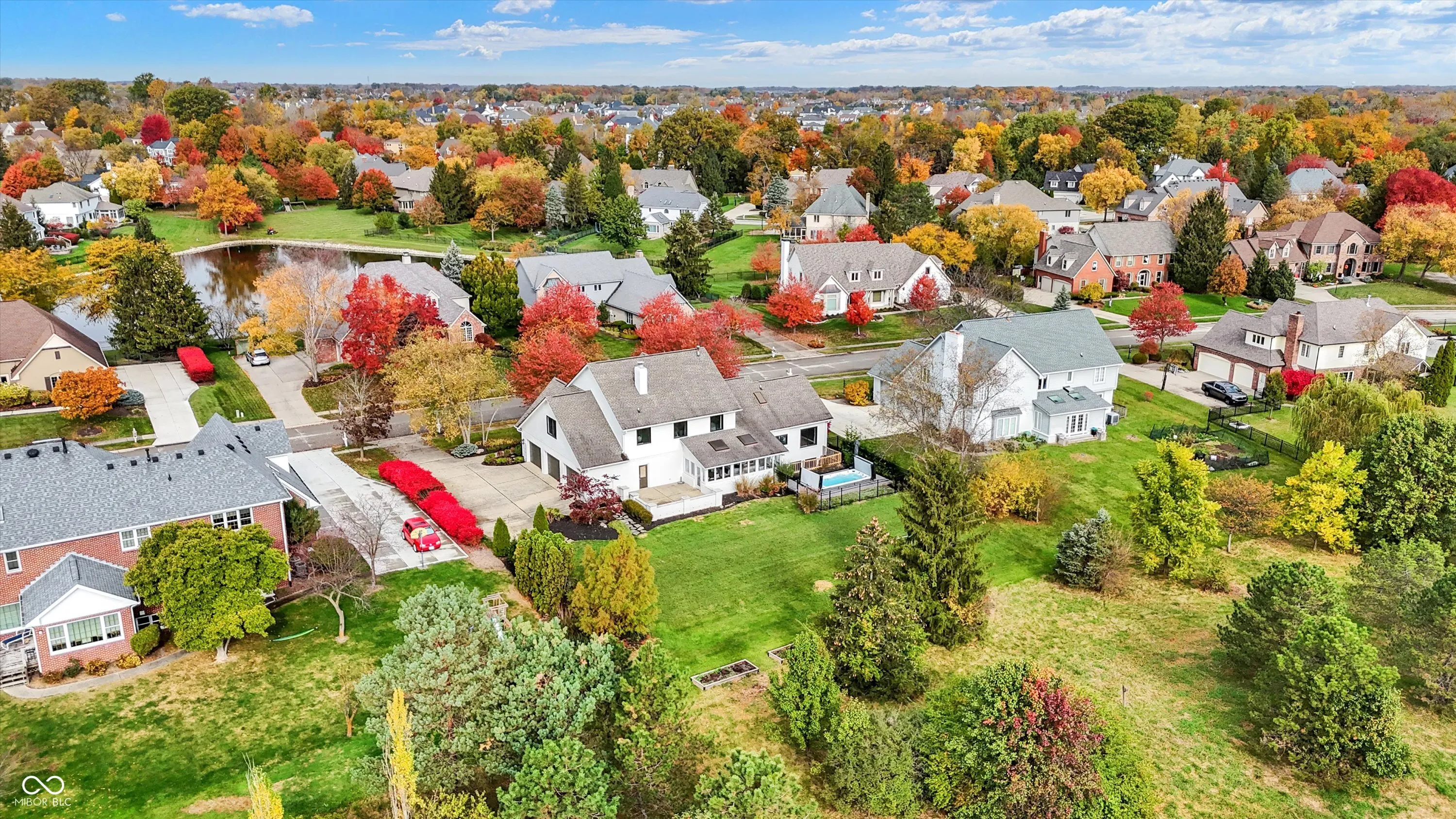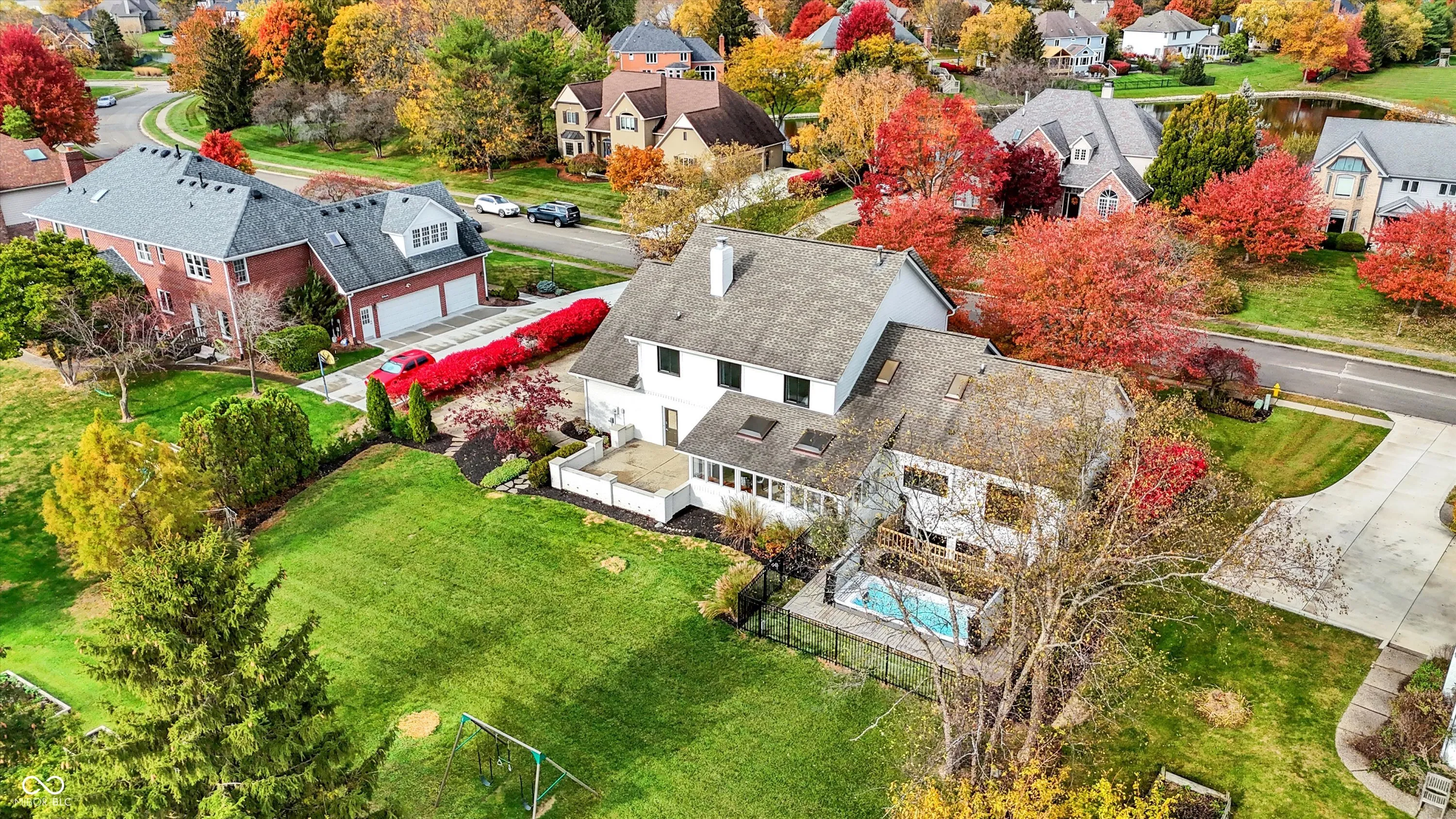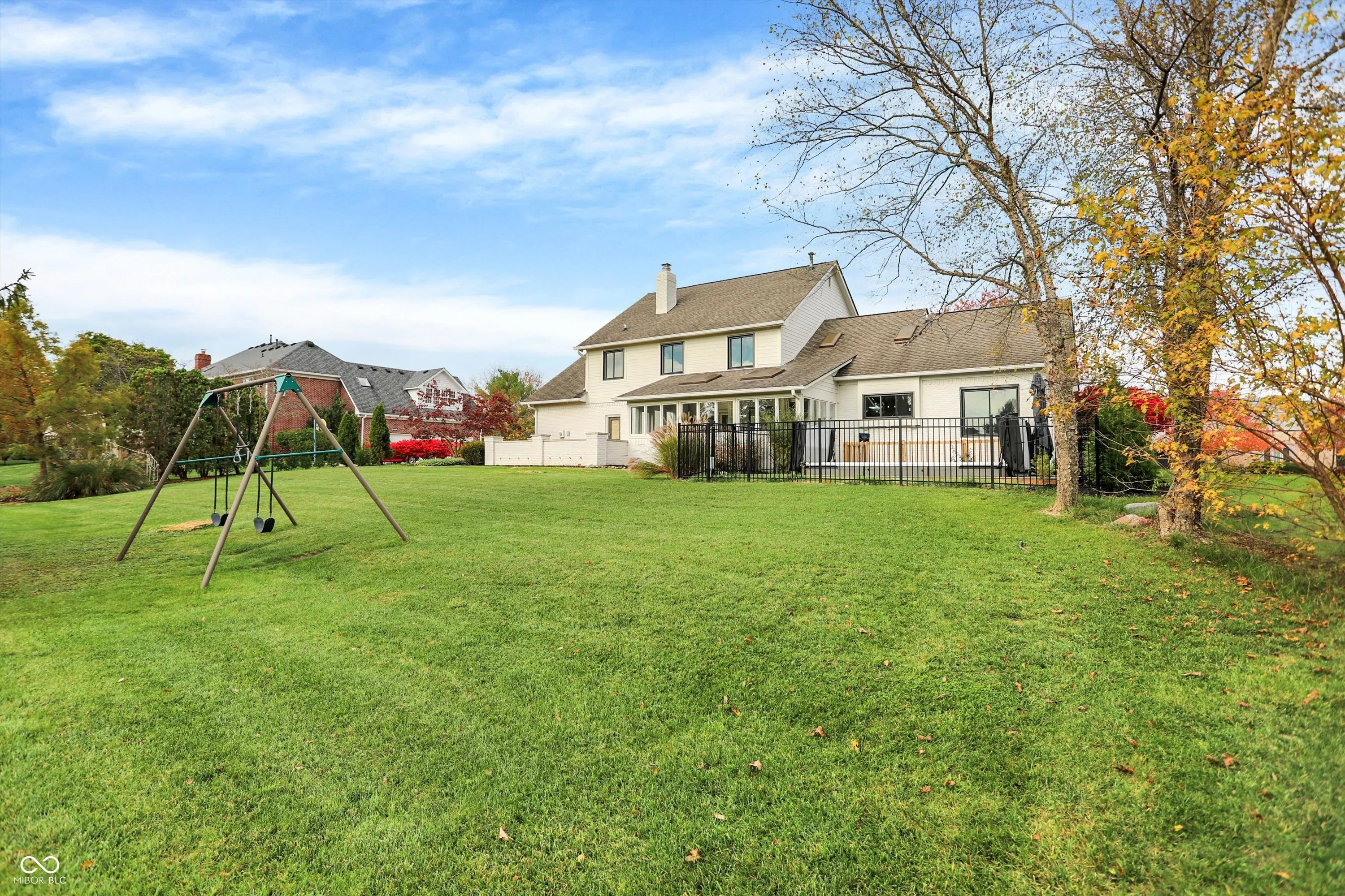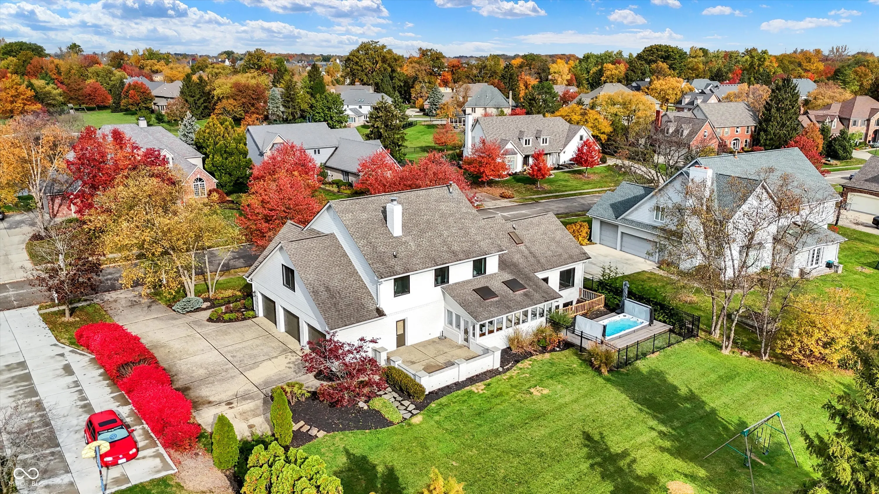 This spacious 5-bedroom home in the desirable Claridge Farms neighborhood in Carmel welcomes you with a grand entrance. Step into a versatile living room, ideal as an office, which flows into a formal dining room, perfect for entertaining. The eat-in kitchen has been updated with new appliances, fresh paint, a stylish backsplash, and modern lighting, creating a fresh, welcoming space. The great room boasts a new fireplace with a stunning waterfall granite hearth, a cantilevered mantel for stability, a single-hinge fireplace door, and elegant floating shelves, all contributing to a cozy yet upscale ambiance. The main floor also includes a guest suite and a sunroom, equipped with heating and air conditioning, for year-round enjoyment. Upstairs, four additional bedrooms await, including the owner’s suite, which offers a luxurious bathroom with a soaking tub, tiled shower, double sinks, and a spacious walk-in closet with washer/dryer hookups for added convenience. The finished lower level provides extra space for gatherings, complete with a wet bar and half bath. Outdoors, relax on the open patio or take a dip in the MasterSpa H2X 18D swim spa, all while enjoying the privacy of the backyard. A 3-car side-load garage and extended driveway complete this exceptional home.