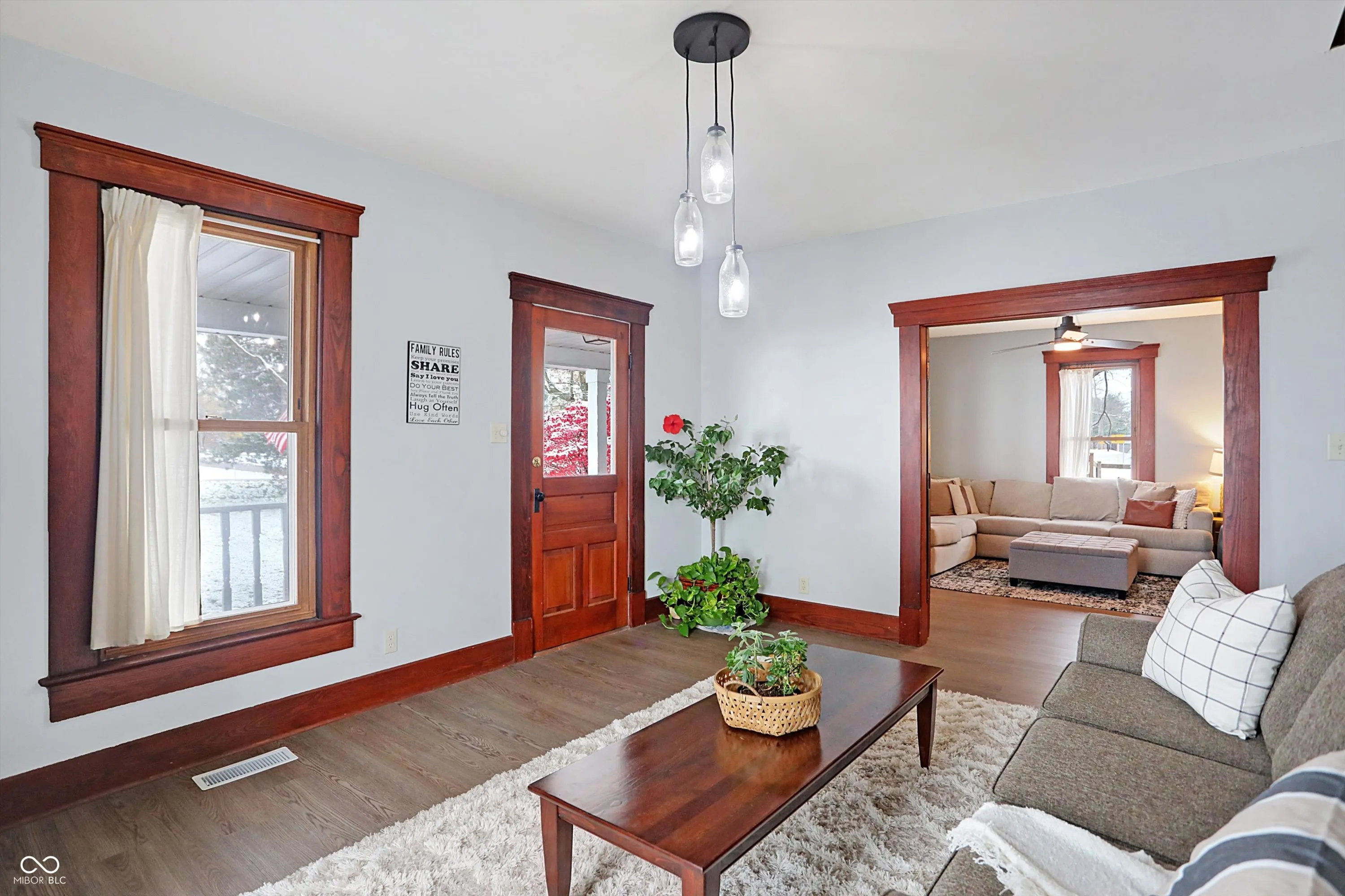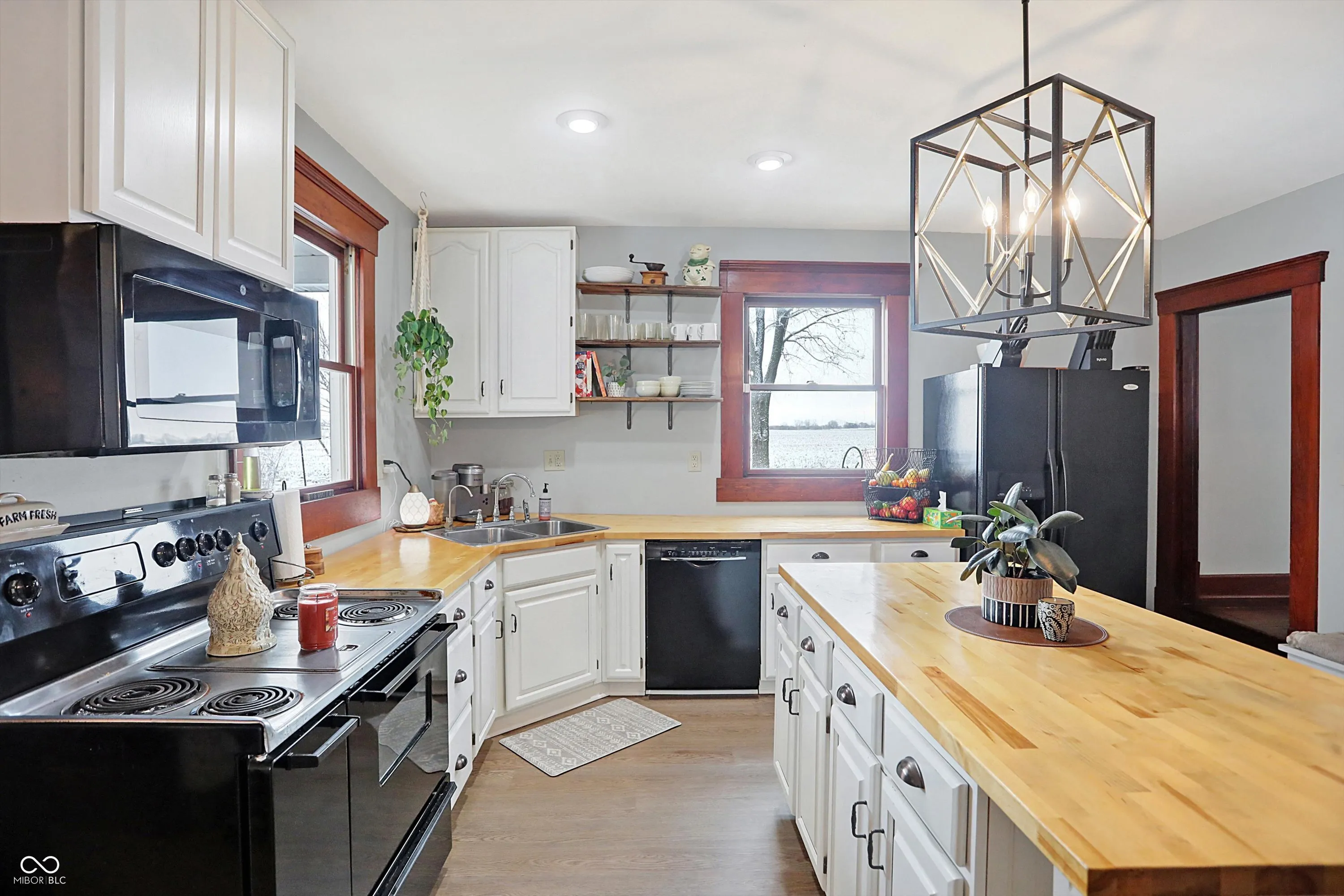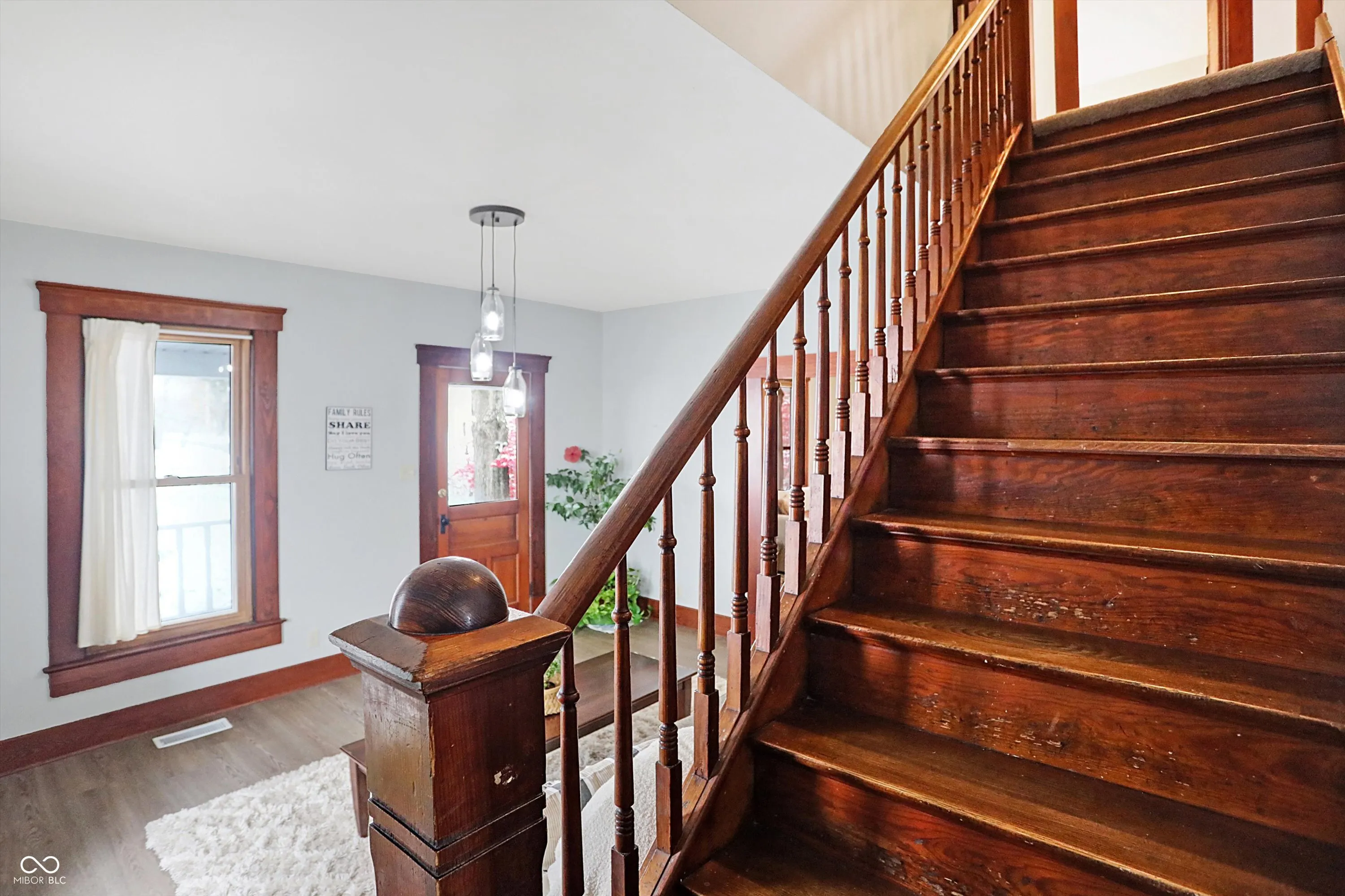 Charming hobby farm close to everything while having that small-town feel! This beautifully restored 1800s farmhouse rests on over 5+ acres in the desirable Pendleton School District. This 3-story, 5 bedroom, 4 bath home has many updates; including brand-new flooring throughout the entire house. This rare find offers endless potential. The property includes 3 vintage barns, chicken coop, and fire pit with shed at the back of the property. The home maintains its historical charm with original woodwork throughout, including a stunning staircase and French doors dividing the expansive living and family rooms. The farmhouse kitchen has a large island and butcher block countertops. Dining area just off kitchen opens onto a spacious deck; perfect for entertaining. The upper level features four generous sized bedrooms and two full bathrooms. The Third floor has the fifth bedroom and additional full bath; ideal for use as a bedroom or flex space. The primary suite offers fresh paint and a spacious ensuite with clawfoot tub, shower stall, and dual sinks. Enjoy the timeless beauty of the property’s iconic vintage barn, which showcases rustic wooden beams and traditional wood peg construction. The oversized 30×60 garage accommodates farm equipment, boats, or larger vehicles, while the workshop provides ample space for tools, woodworking, or storage. This property is a unique opportunity to enjoy open space and tranquility just minutes from all the conveniences of Hamilton Town Center, Noblesville, Fishers, Muncie, and Anderson.
