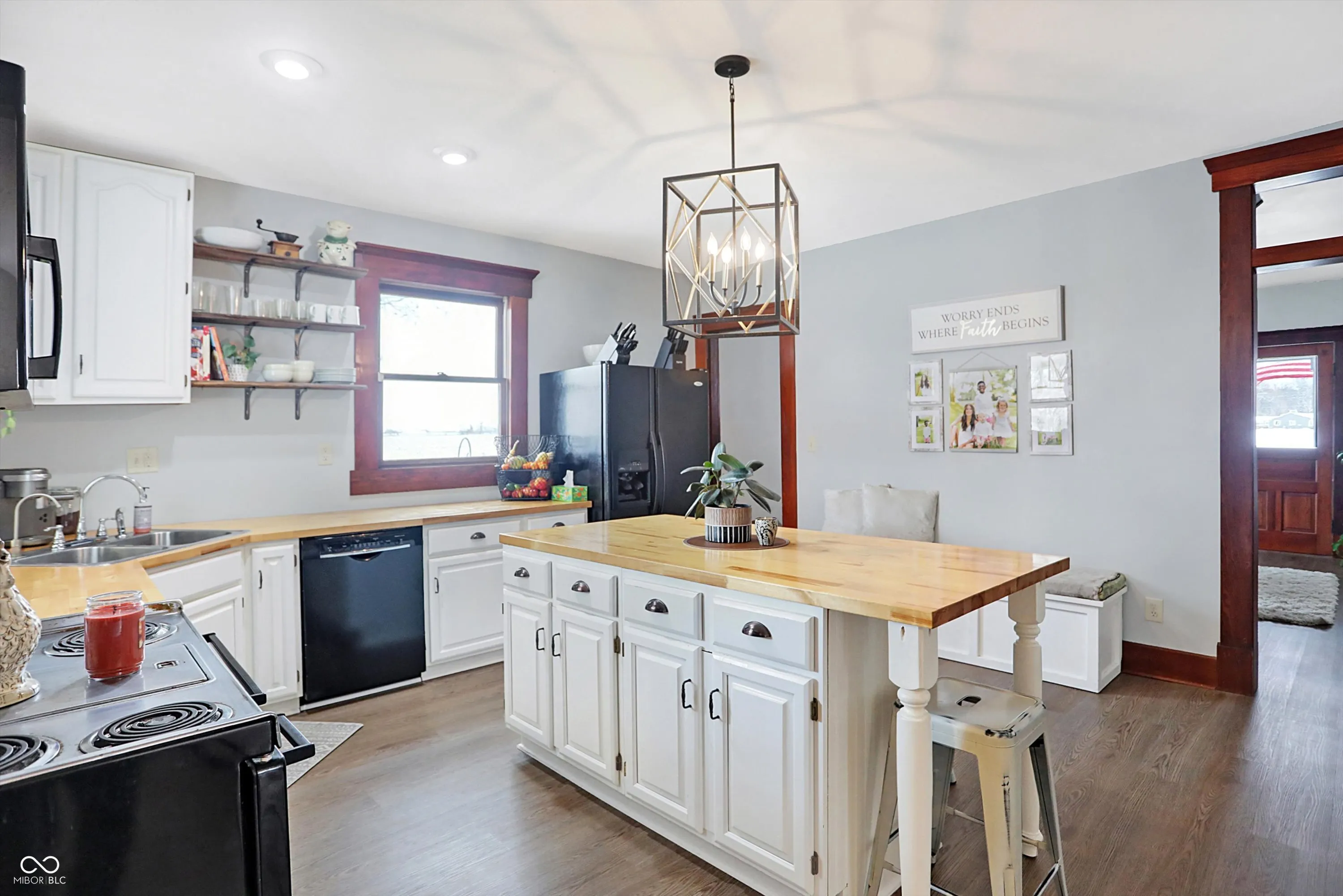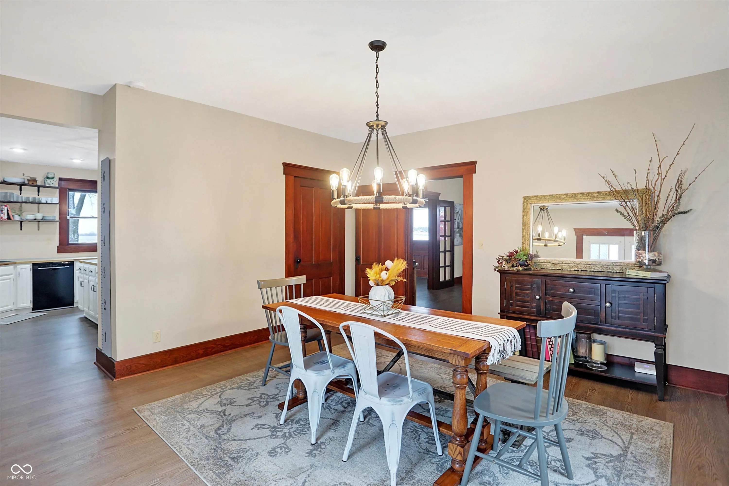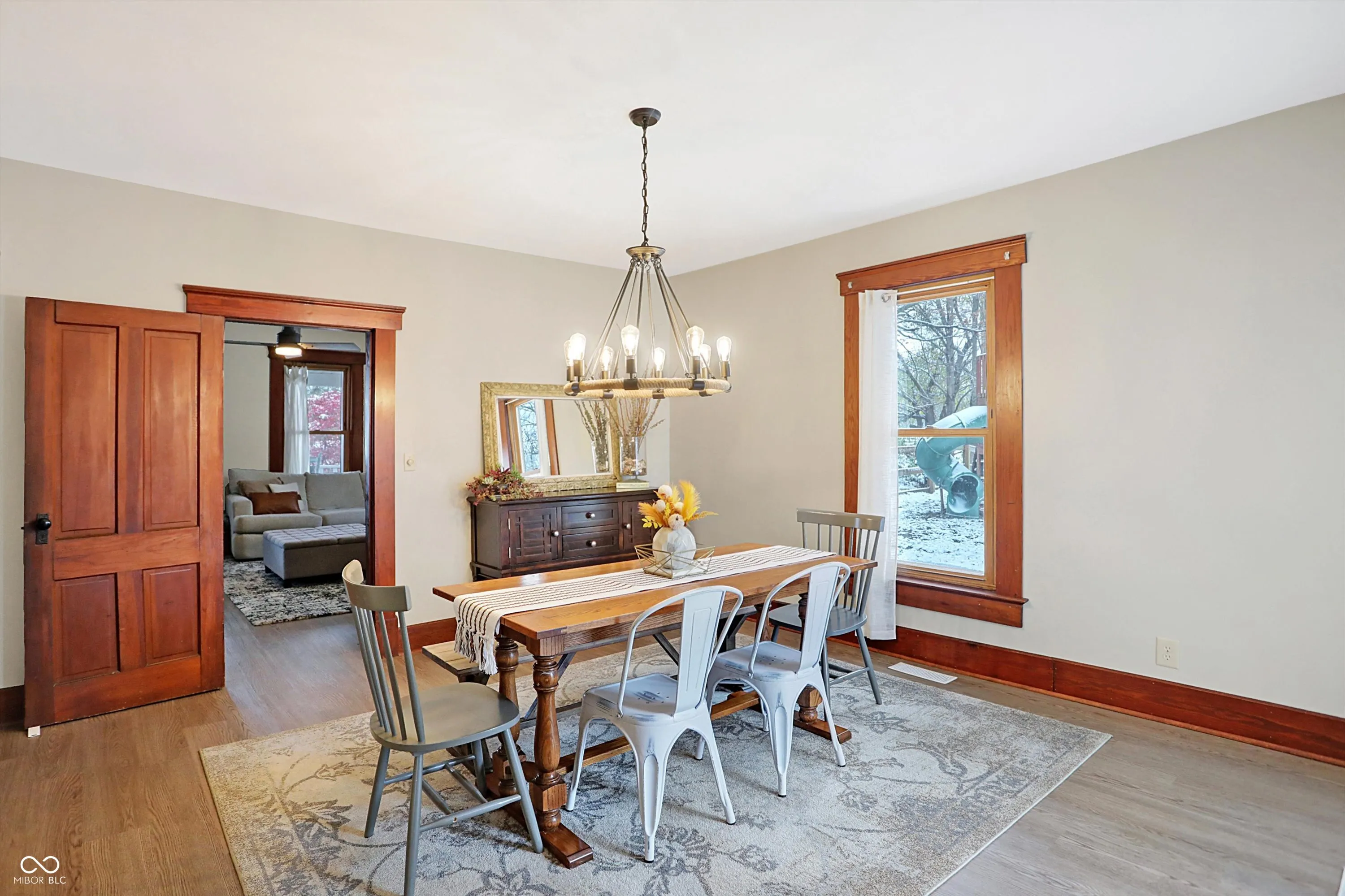Charming hobby farm close to everything while having that small-town feel! This beautifully restored 1800s farmhouse rests on over 5+ acres in the desirable Pendleton School District. This 3-story, 5 bedroom, 4 bath home has many updates; including brand-new flooring throughout the entire house. This rare find offers endless potential. The property includes 3 vintage barns, chicken coop, and fire pit with shed at the back of the property. The home maintains its historical charm with original woodwork throughout, including a stunning staircase and French doors dividing the expansive living and family rooms. The farmhouse kitchen has a large island and butcher block countertops. Dining area just off kitchen opens onto a spacious deck; perfect for entertaining. The upper level features four generous sized bedrooms and two full bathrooms. The Third floor has the fifth bedroom and additional full bath; ideal for use as a bedroom or flex space. The primary suite offers fresh paint and a spacious ensuite with clawfoot tub, shower stall, and dual sinks. Enjoy the timeless beauty of the property’s iconic vintage barn, which showcases rustic wooden beams and traditional wood peg construction. The oversized 30×60 garage accommodates farm equipment, boats, or larger vehicles, while the workshop provides ample space for tools, woodworking, or storage. This property is a unique opportunity to enjoy open space and tranquility just minutes from all the conveniences of Hamilton Town Center, Noblesville, Fishers, Muncie, and Anderson.