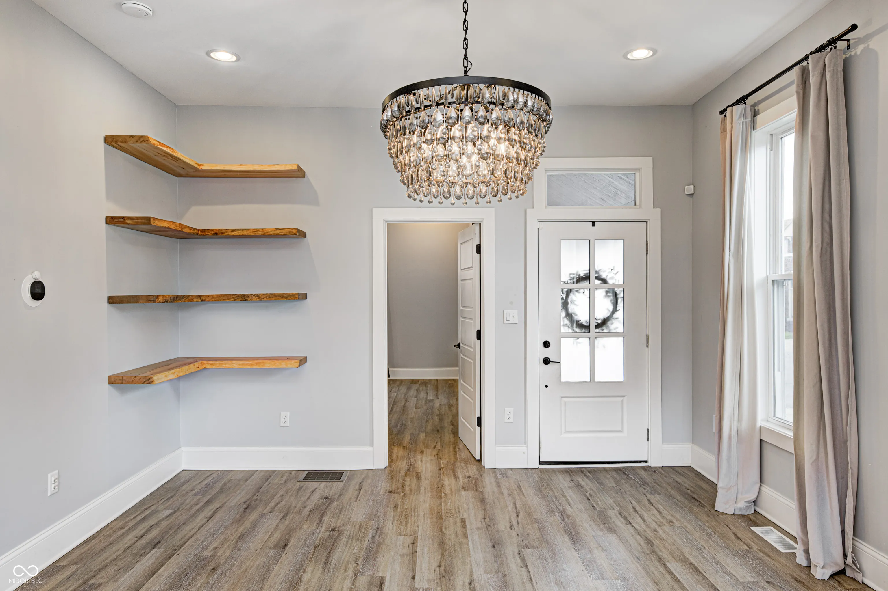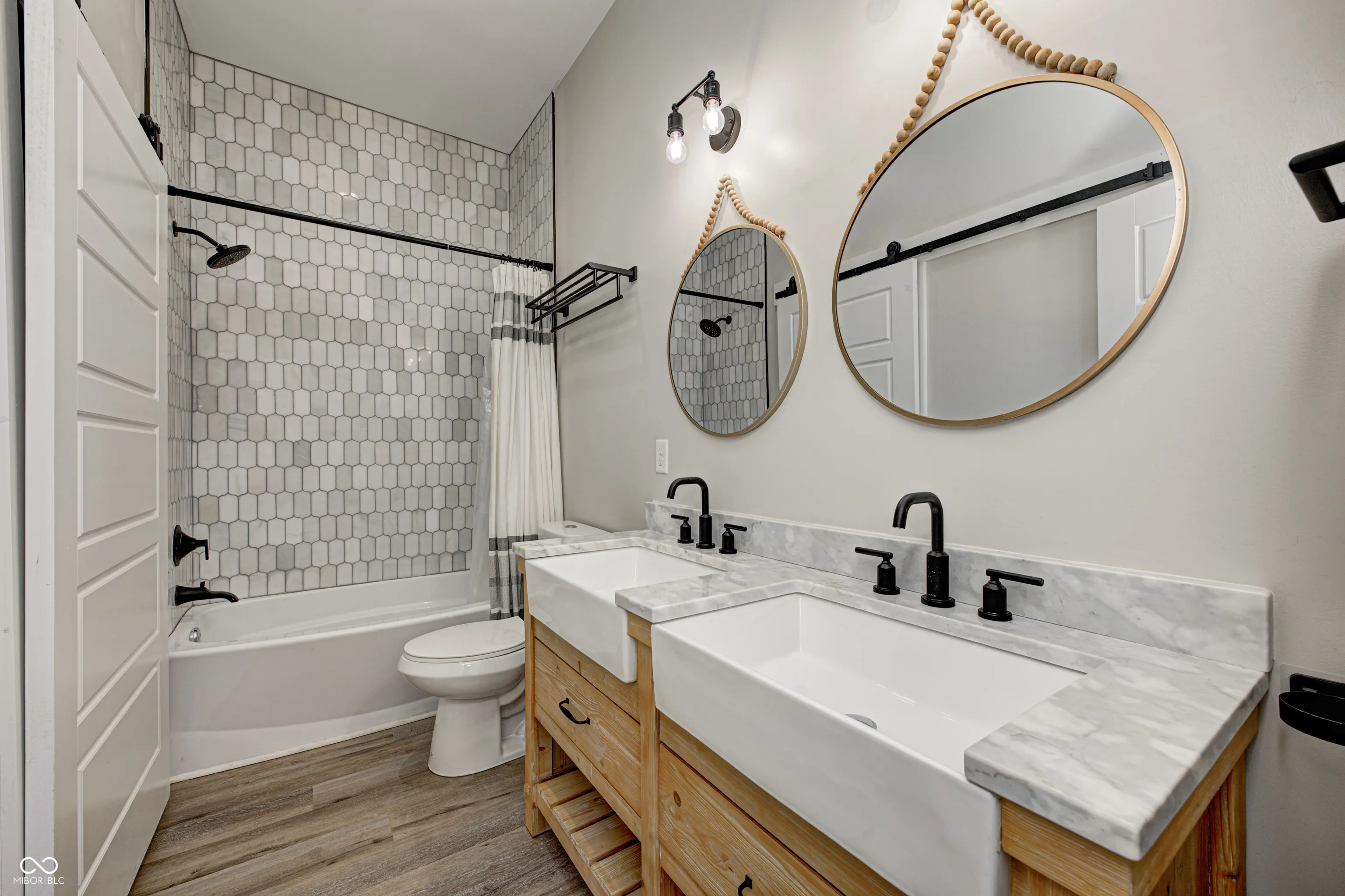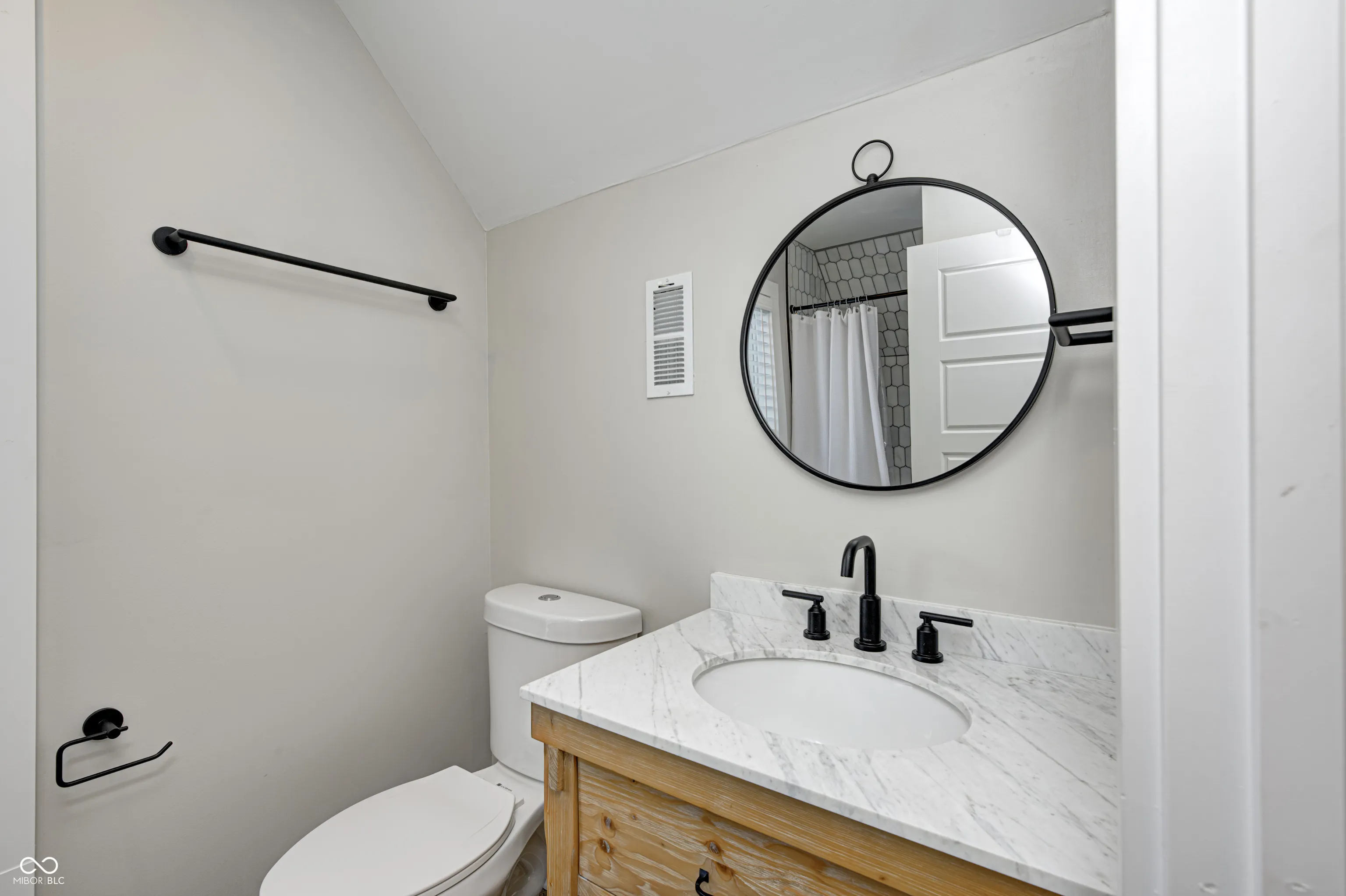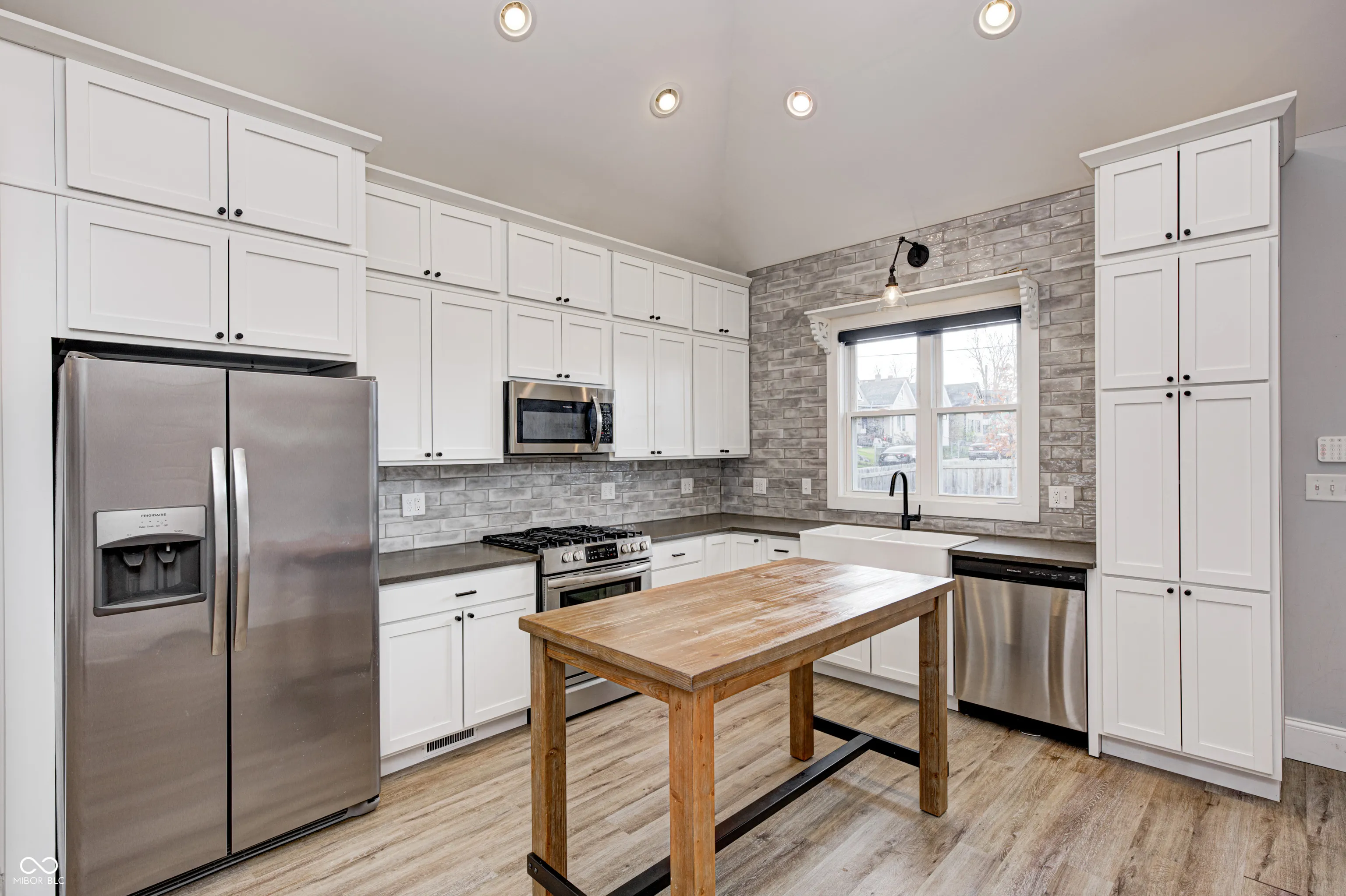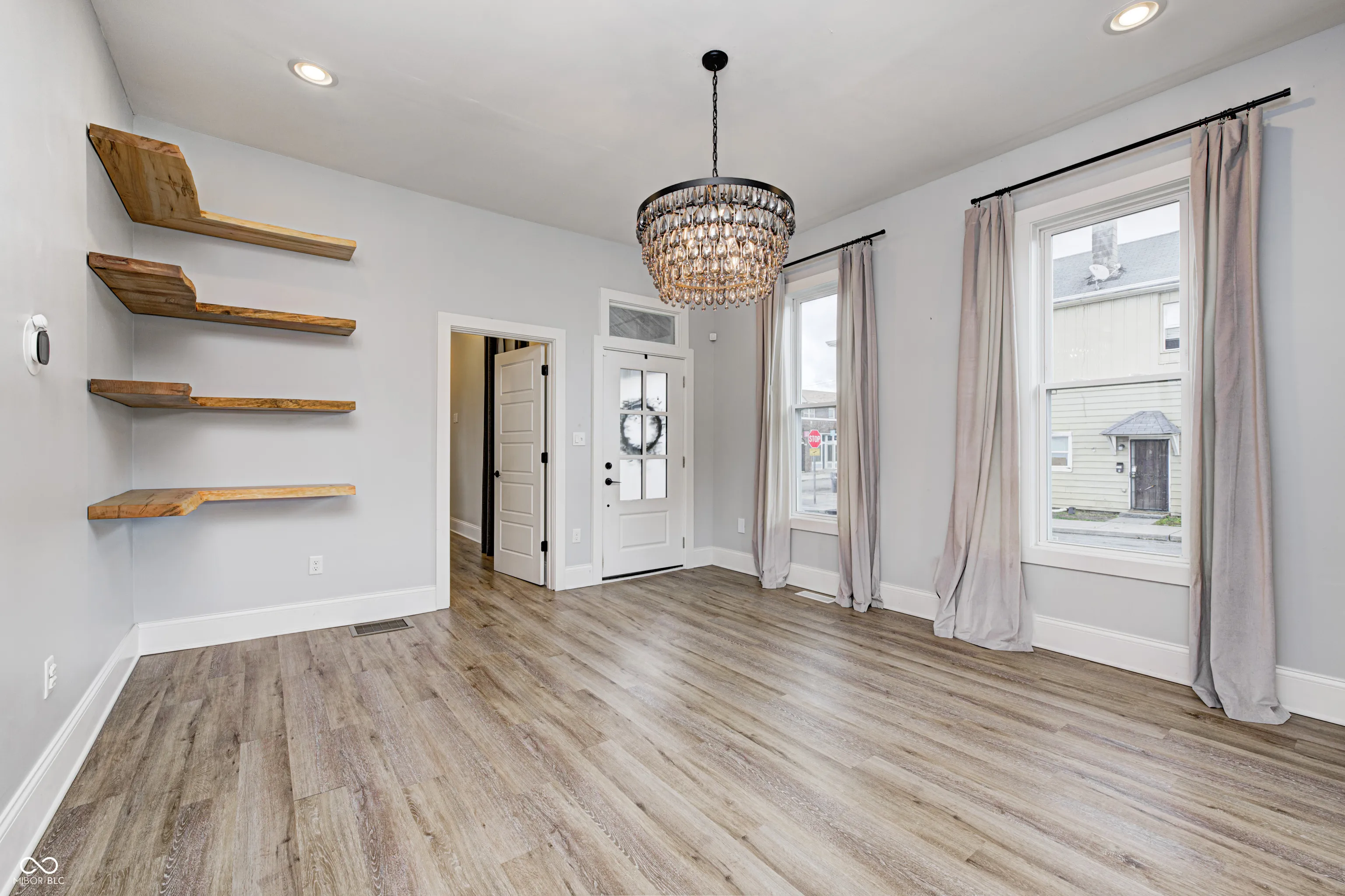 Welcome to this beautiful house in Near Southside. This is a charming house with a tasteful modern style completed by 2 Chicks and A Hammer. The primary bedroom with en suite on the main floor has a double vanity, beautiful marble tile and matte black fixtures. You’ll love the seamless flow from living room to kitchen perfect for entertaining. You’ll have no trouble communicating with your guests while preparing a meal or drinks in this gorgeous kitchen outfitted with quartz countertops, excellent stainless steel appliances and high vaulted ceiling. Enjoy the spacious fenced in backyard that is a blank slate for whatever your imagination can dream up. Plenty of private parking in the back for you and your guests. This house offers so many opportunities. You’re sure to instantly notice the custom corner shelves in the living room, done by local woodworker Iron Timbers. You can see the history of this house on HGTV’s Good Bones season 6 episode 1.