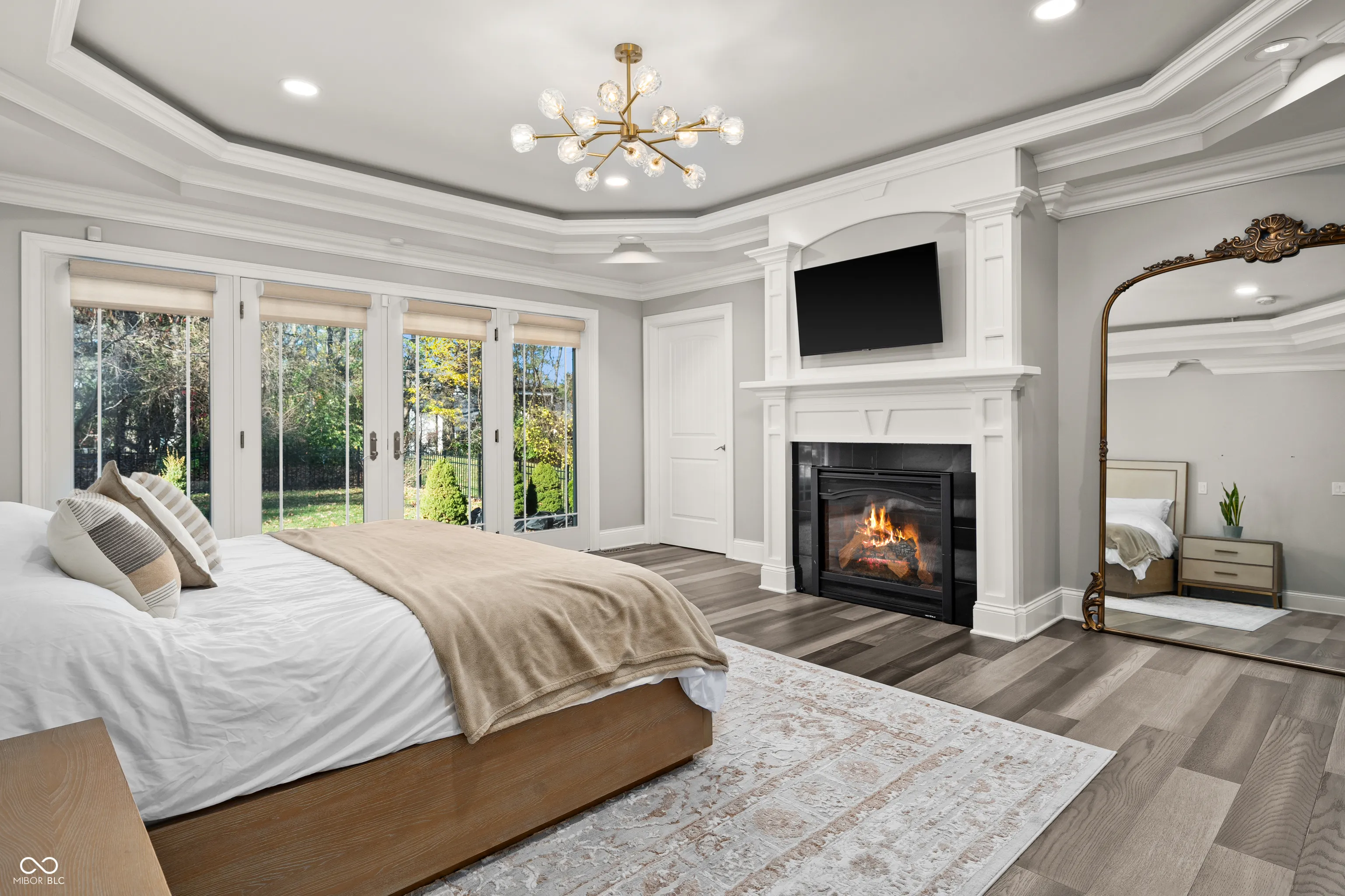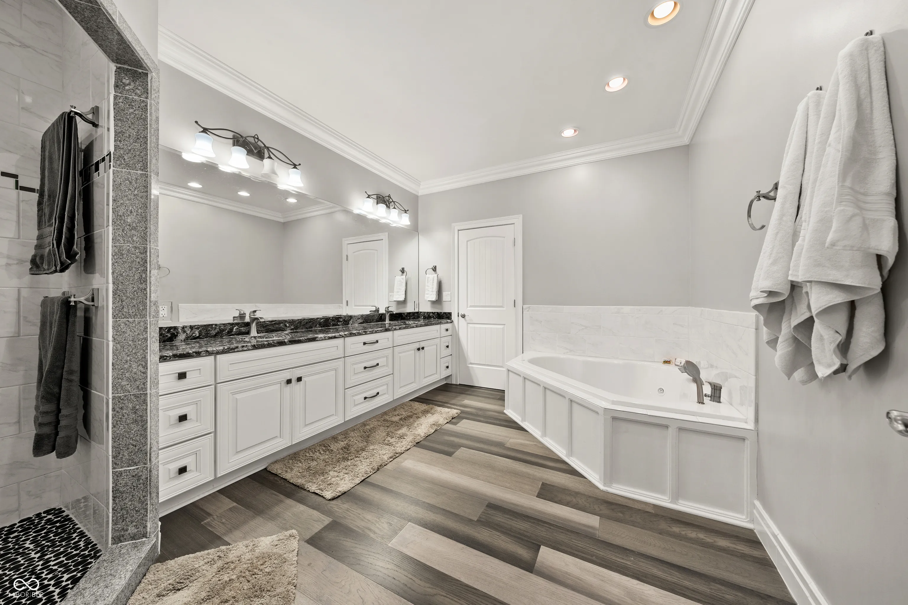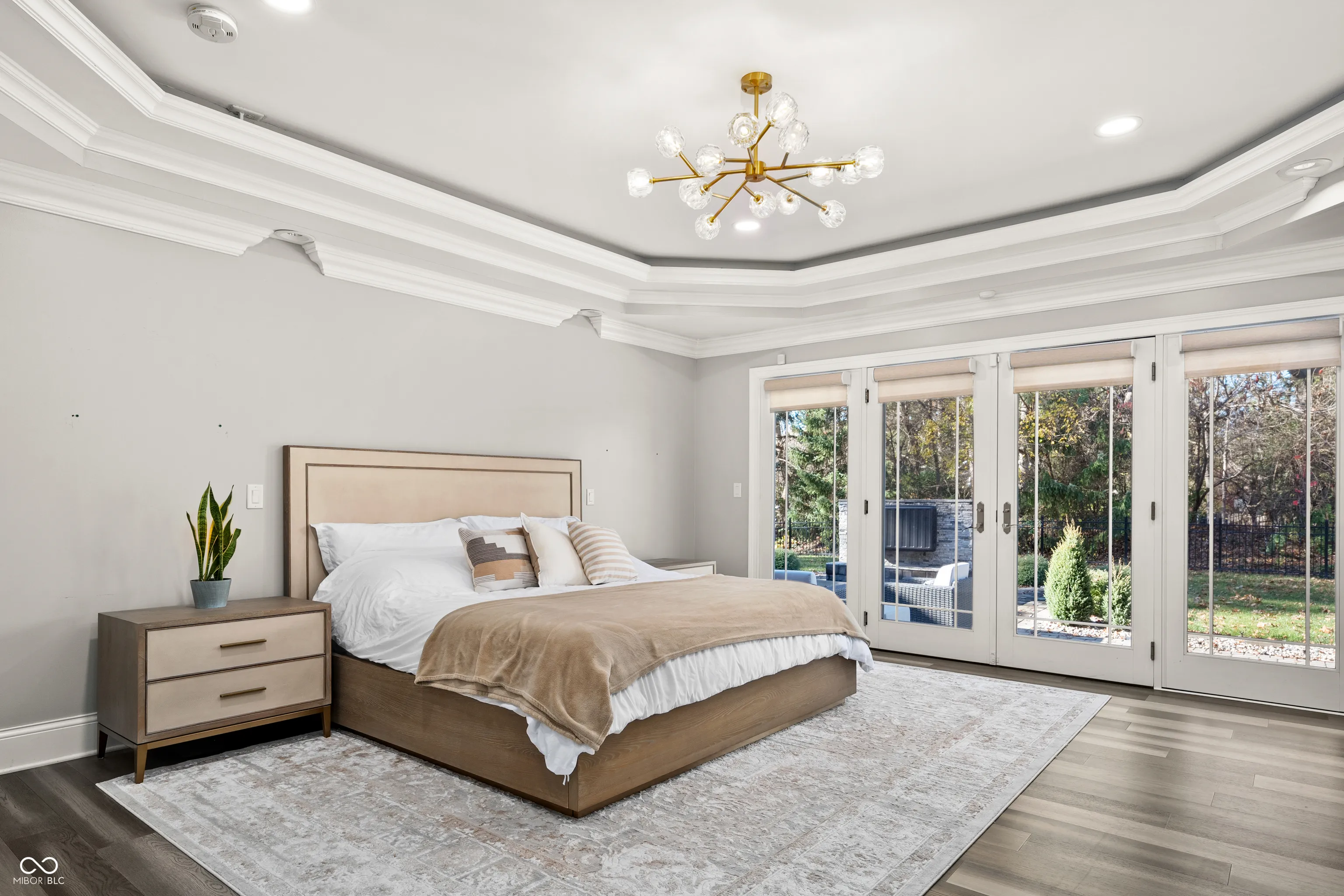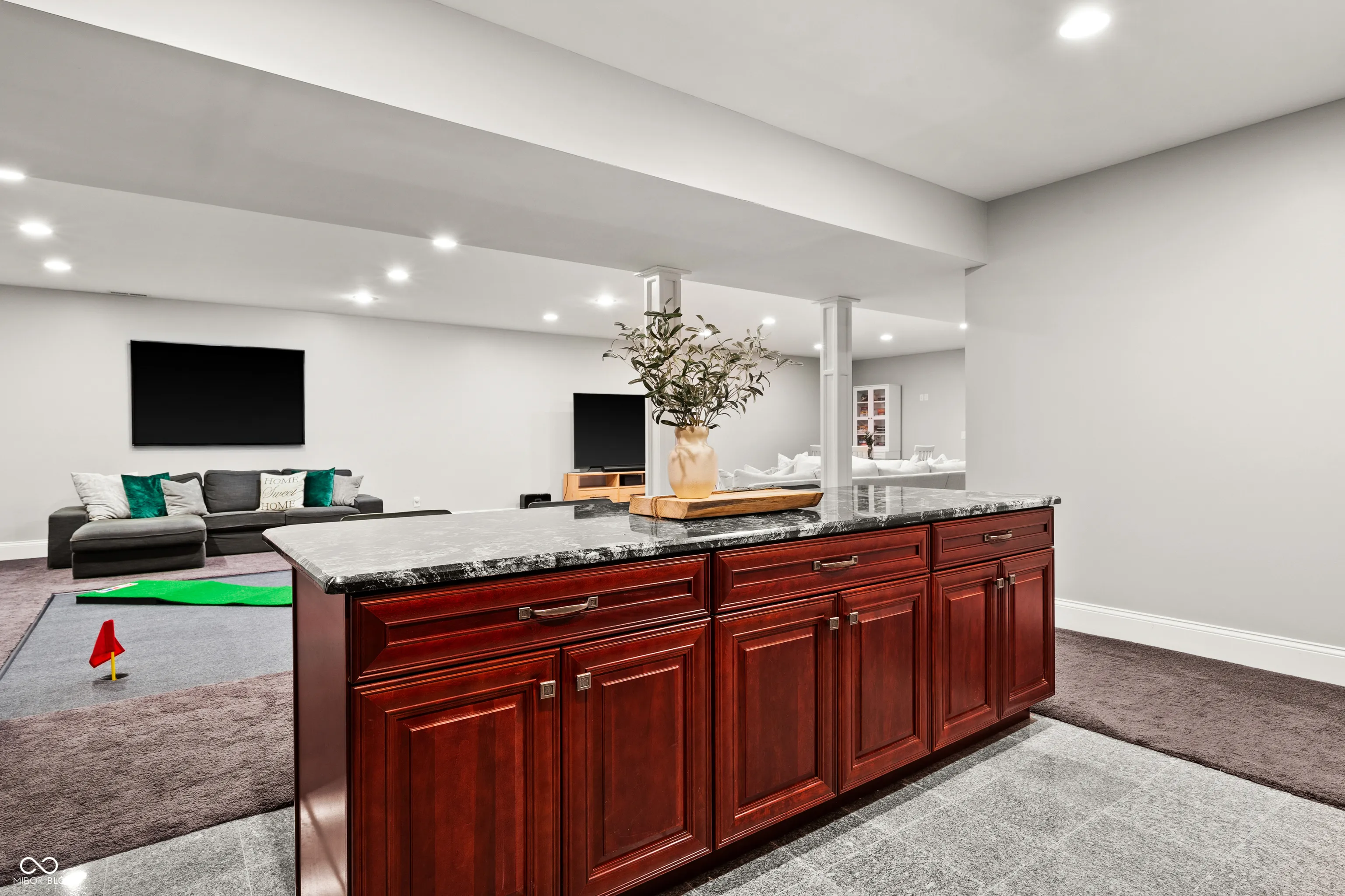 Luxury meets function in this STUNNING CUSTOM ranch floorplan, truly one of a kind and hard to find in Carmel! The moment you arrive you are greeted with a stone and brick exterior, and a charming covered porch. Open the door to an open floorplan and towering ceilings with an inviting entry. Open to the great room featuring coffered ceilings, engineered hardwood flooring running seamlessly throughout the main, and a wall of windows, floor to ceilings drenching the room in natural light. Enjoy your cozy gas fireplace encased with built-in bookcases. Open to the kitchen making this is an entertainer’s dream, with crisp white cabinets, granite counters, and an island that’s fit for the gatherings this season! Don’t be fooled by it being one level, this home offers 5 bedrooms, 3.5 baths, and a fully finished basement! The Owner’s suite with double stage crown/tray ceiling tucked away from the secondary bedrooms for privacy. Offers luxury with the ensuite bath featuring dual sink vanity, WI shower with dual heads, soaking tub, two exceptional WI closets with custom built-ins! Secondary bedrooms also with engineered hardwood flooring, crown molding trim to finish off the space! Fully finished lower-level features 2nd full kitchen/wet-bar, family/media room, additional bedroom/ putting green/exercise room/full bath. Backyard is fully fenced, spacious with a paver patio, stone feature wall, set up for an outdoor TV! Enjoy Sunday football outdoors while the lushly landscaped backyard changes colors this Fall! Spacious 4 car garage, and the basement has a separate entrance from garage is perfect for in-law suite. Don’t miss this opportunity to be within one of the best locations in Carmel!
