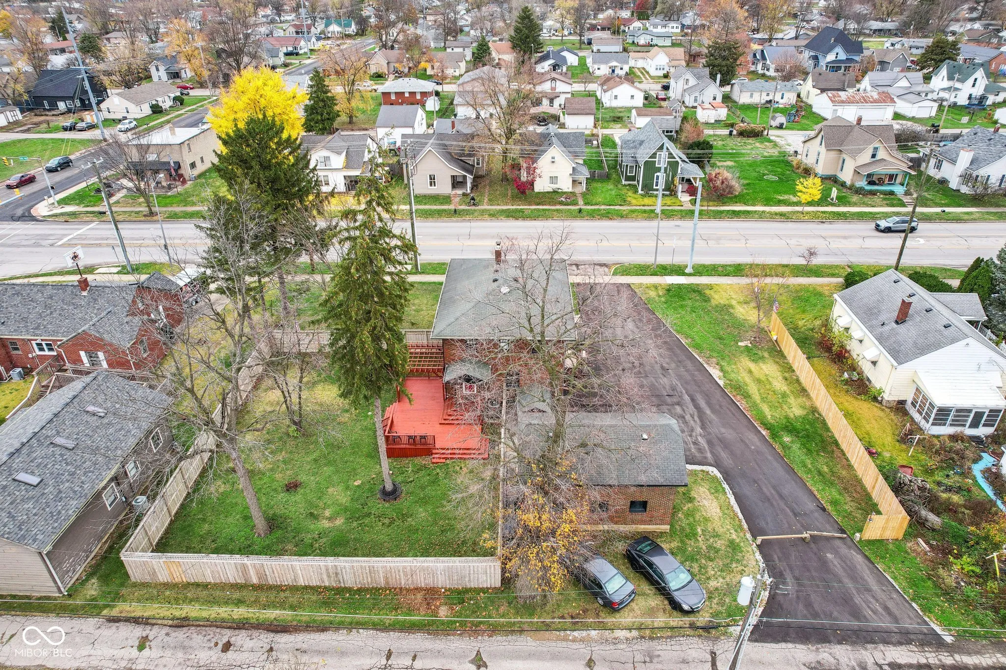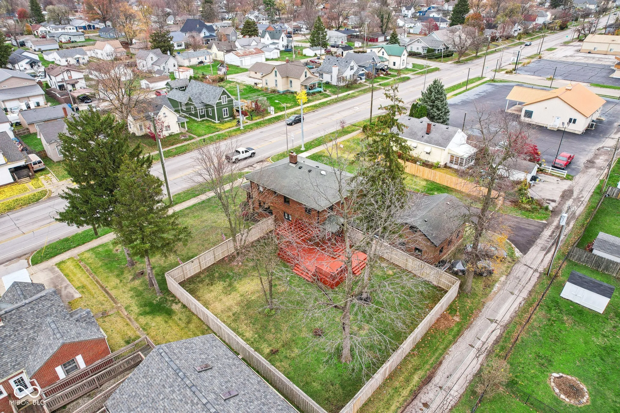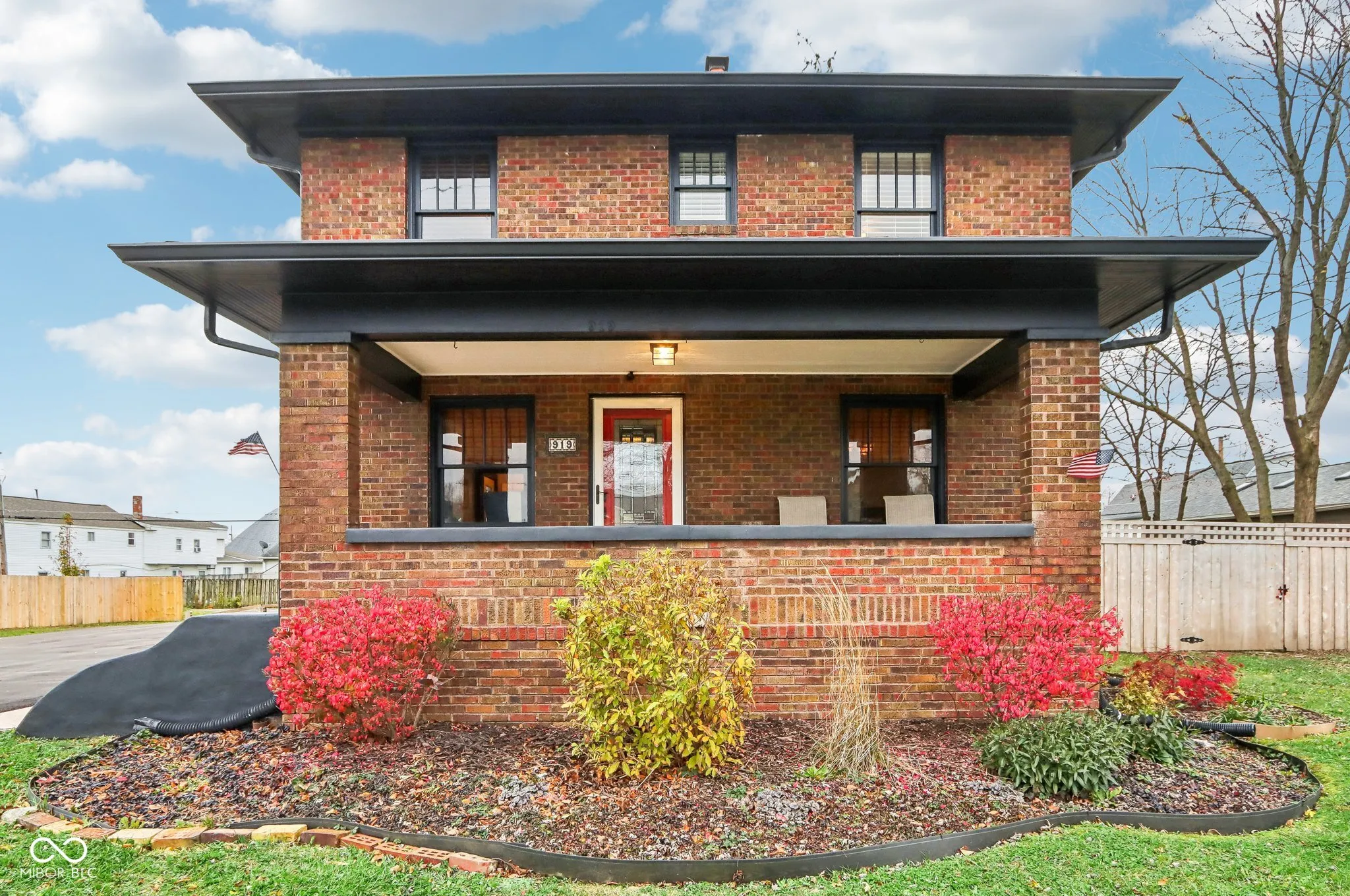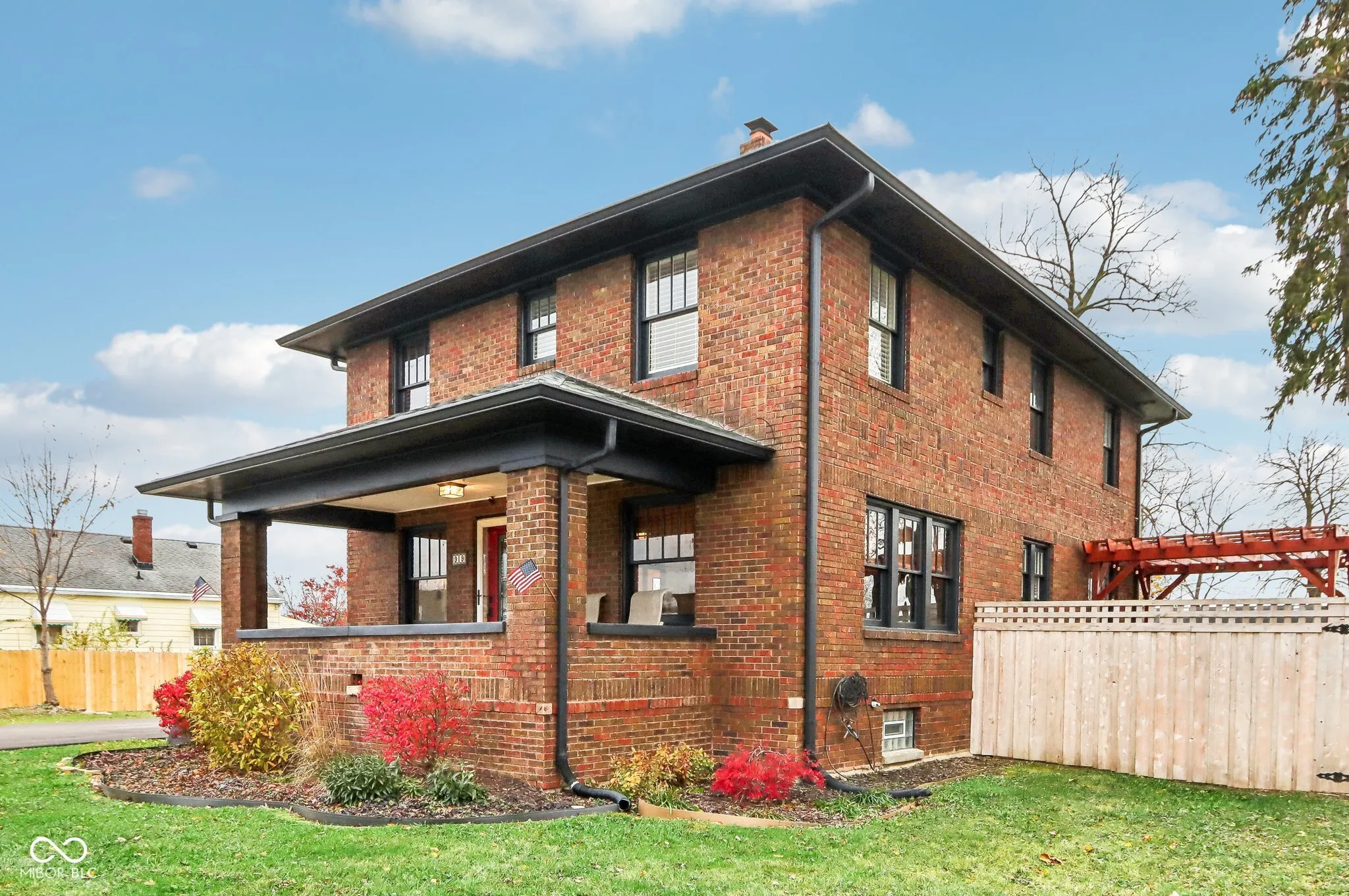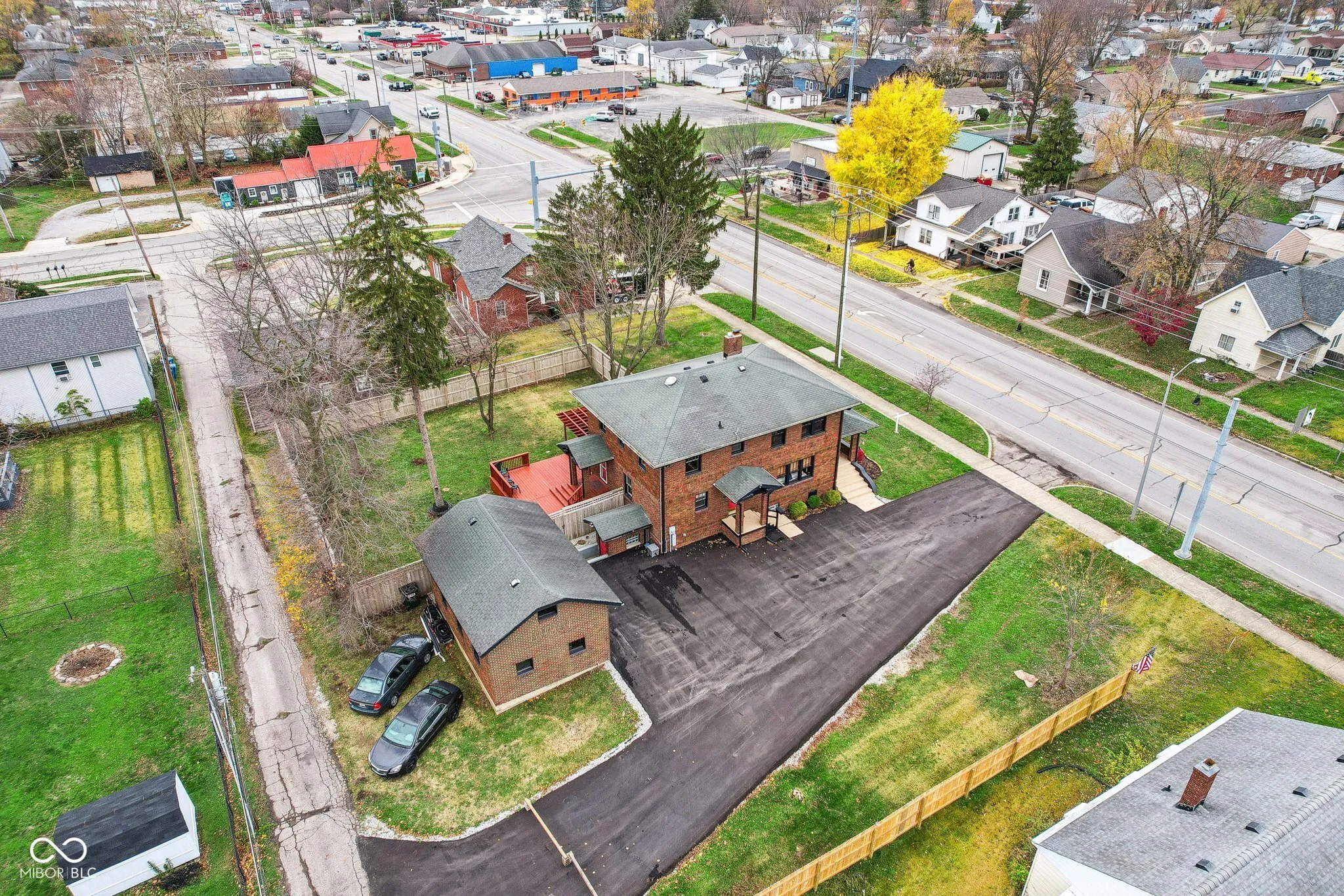 Step into a beautifully updated 1920s home on a half acre lot in the heart of Greenfield, spanning 3,192 square feet with five inviting bedrooms and two bathrooms. The full brick exterior, black trim paint and traditional front porch create a warm welcome. Inside, all original doors throughout and original hardwood floors enhance the secondary bedrooms while the kitchen dazzles with staggered cabinets and natural light. Enjoy cozy evenings in the family room beside the electric fireplace. The private backyard features a deck perfect for entertaining under the pergola and a new privacy fence w/ solar lighting. A finished detached two-car garage serves as a versatile man cave/she shed w/ a loft above for storage. Significant updates include: new ductwork, waterproofed basement with extra washer/dryer hookups, 200 amp electrical service, HVAC 2 years old, new daylight windows. This home elegantly combines charm with practicality and sits on an amazing lot in a great location. Zoned residential can go commercial. Have a work/live space right on Main St! Perfect for a store front office, lawyer, medical, or most small businesses. Schools just blocks away, short walk to downtown with access to the city bike trails.