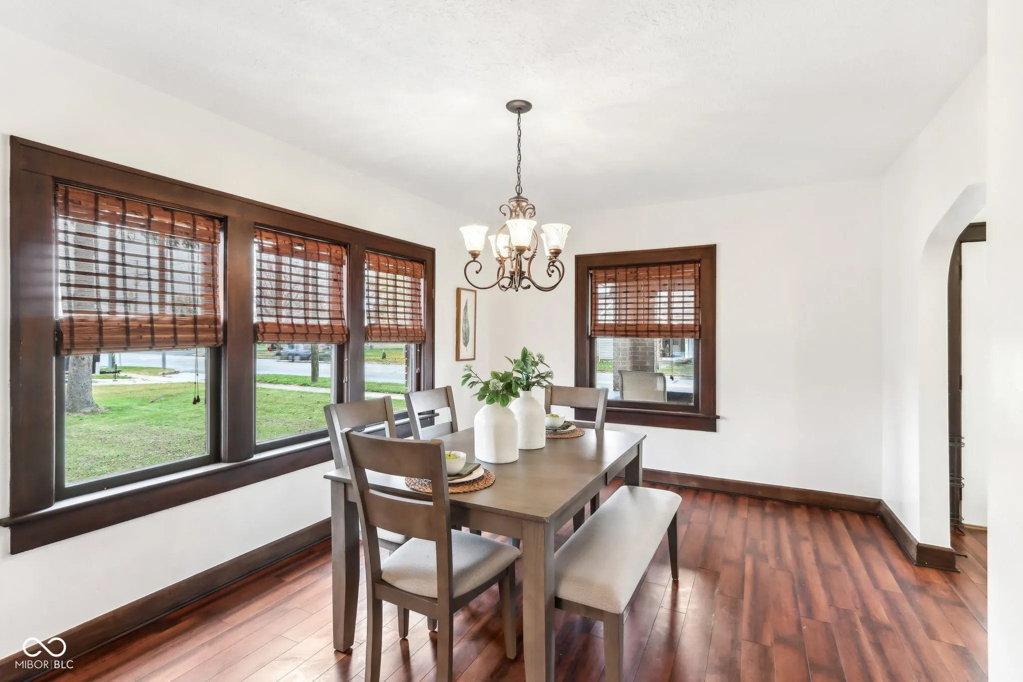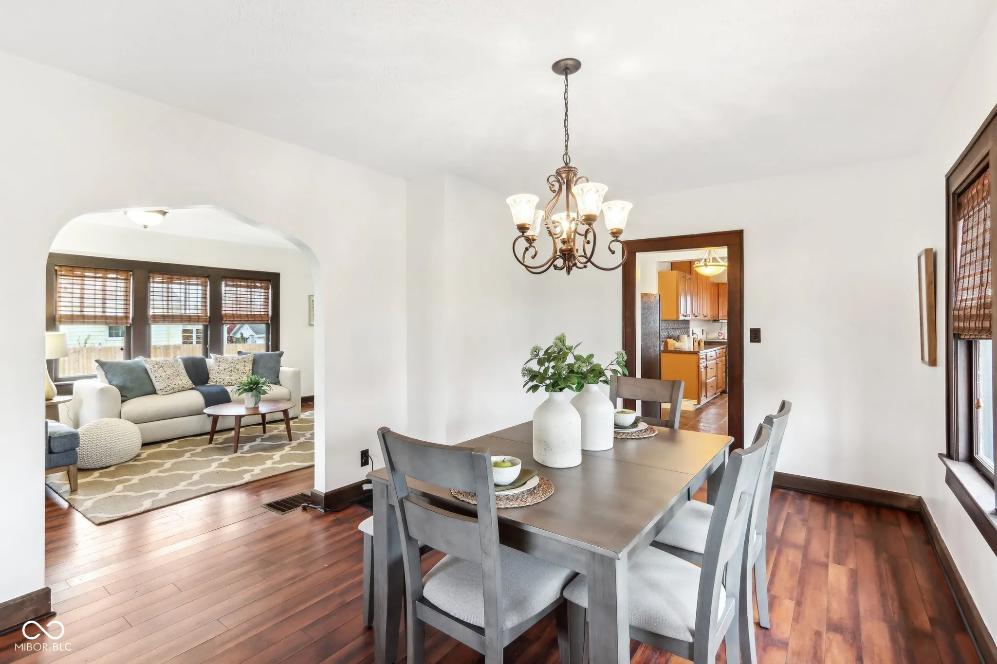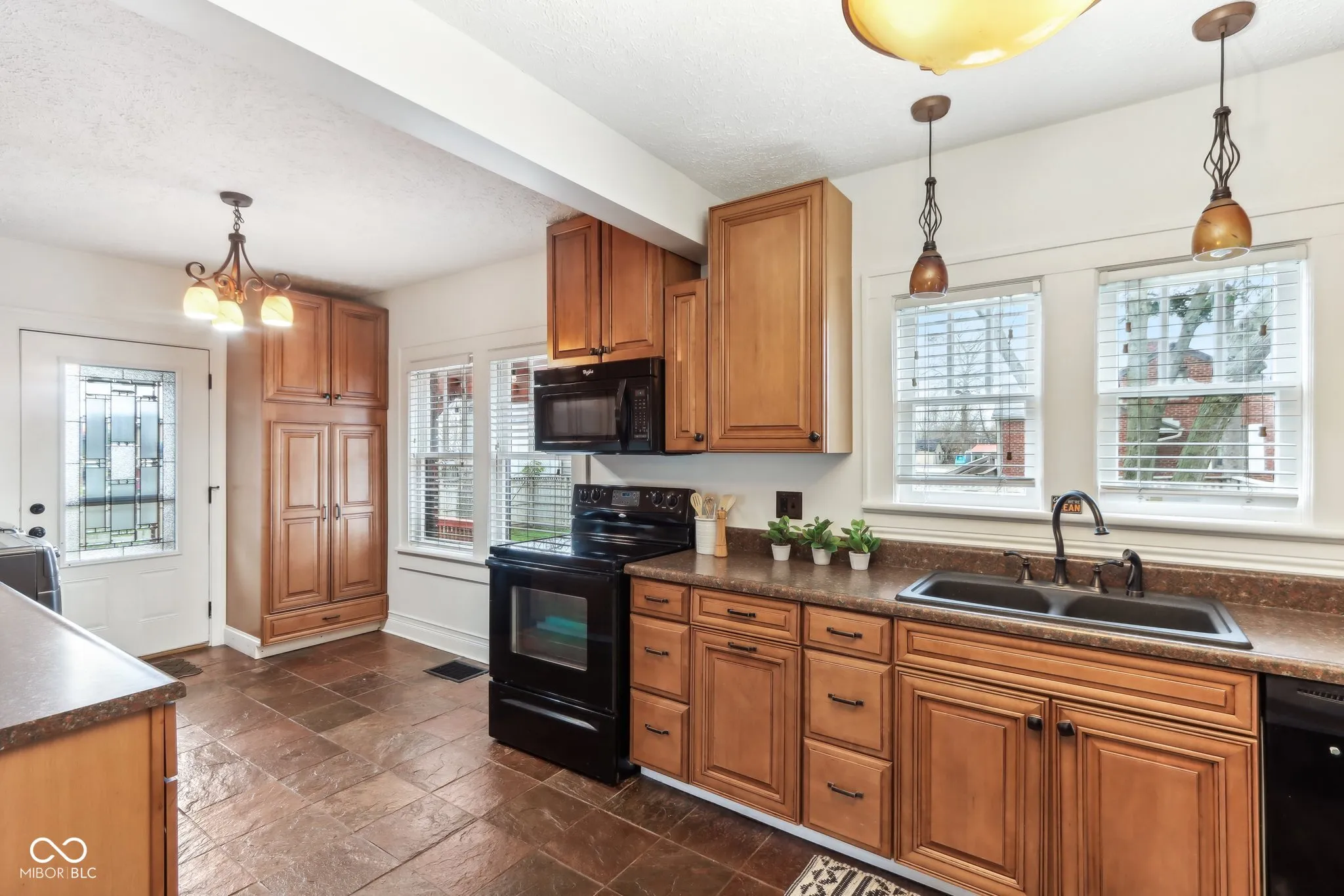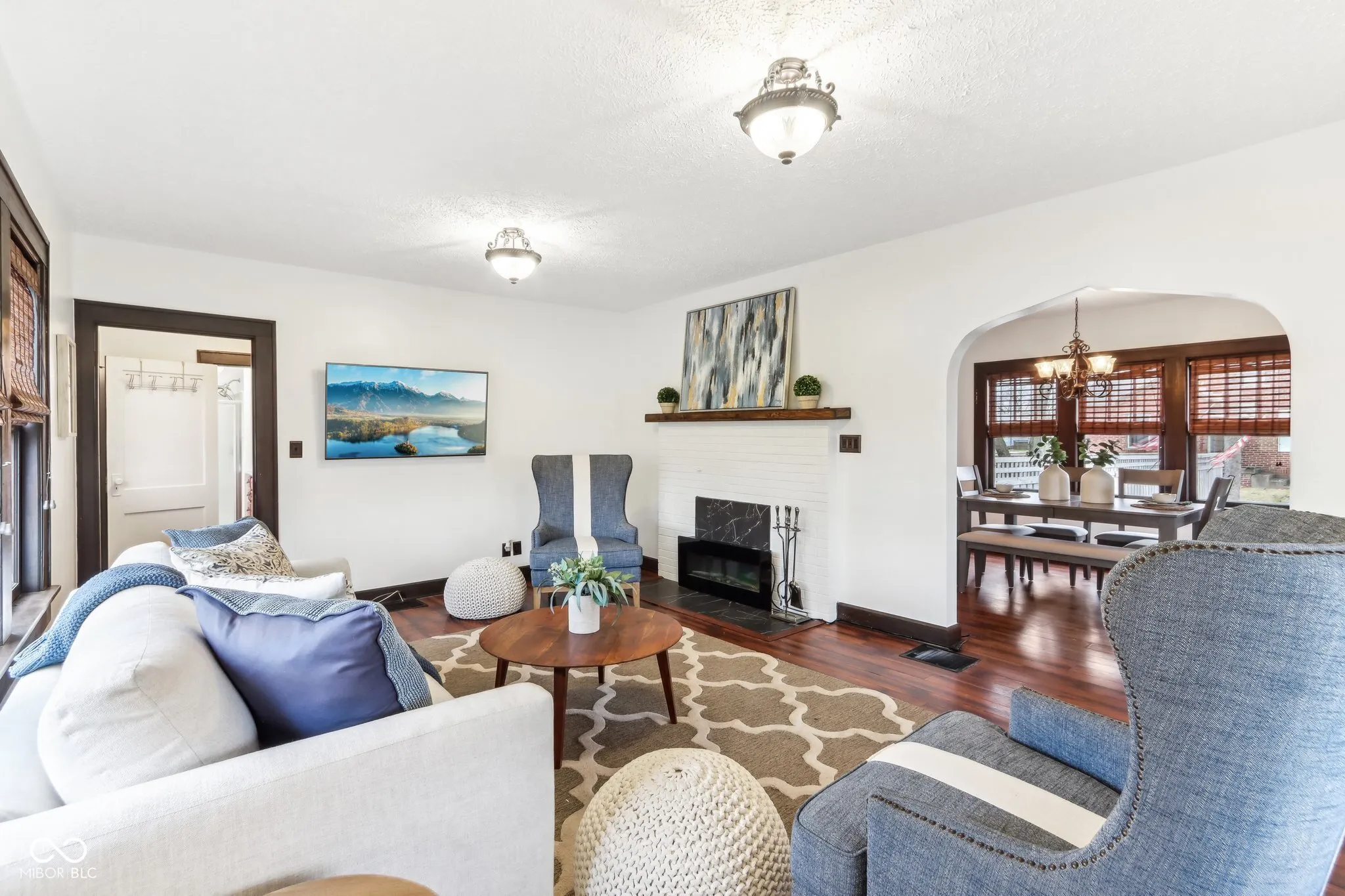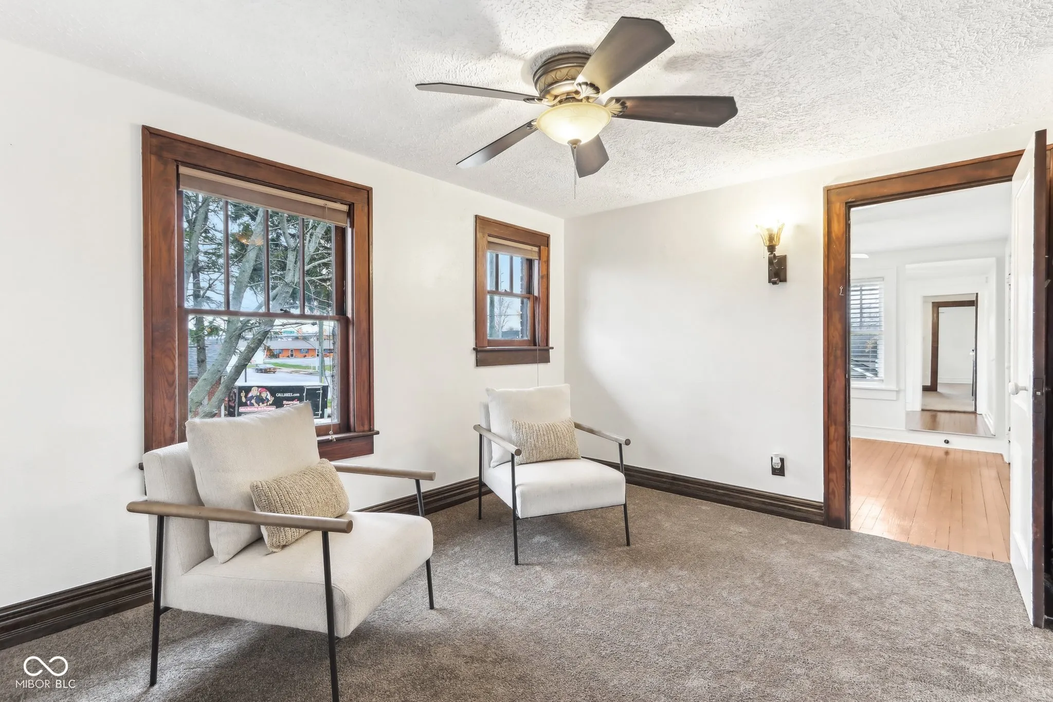 Step into a beautifully updated 1920s home on a half acre lot in the heart of Greenfield, spanning 3,192 square feet with five inviting bedrooms and two bathrooms. The full brick exterior, black trim paint and traditional front porch create a warm welcome. Inside, all original doors throughout and original hardwood floors enhance the secondary bedrooms while the kitchen dazzles with staggered cabinets and natural light. Enjoy cozy evenings in the family room beside the electric fireplace. The private backyard features a deck perfect for entertaining under the pergola and a new privacy fence w/ solar lighting. A finished detached two-car garage serves as a versatile man cave/she shed w/ a loft above for storage. Significant updates include: new ductwork, waterproofed basement with extra washer/dryer hookups, 200 amp electrical service, HVAC 2 years old, new daylight windows. This home elegantly combines charm with practicality and sits on an amazing lot in a great location. Zoned residential can go commercial. Have a work/live space right on Main St! Perfect for a store front office, lawyer, medical, or most small businesses. Schools just blocks away, short walk to downtown with access to the city bike trails.